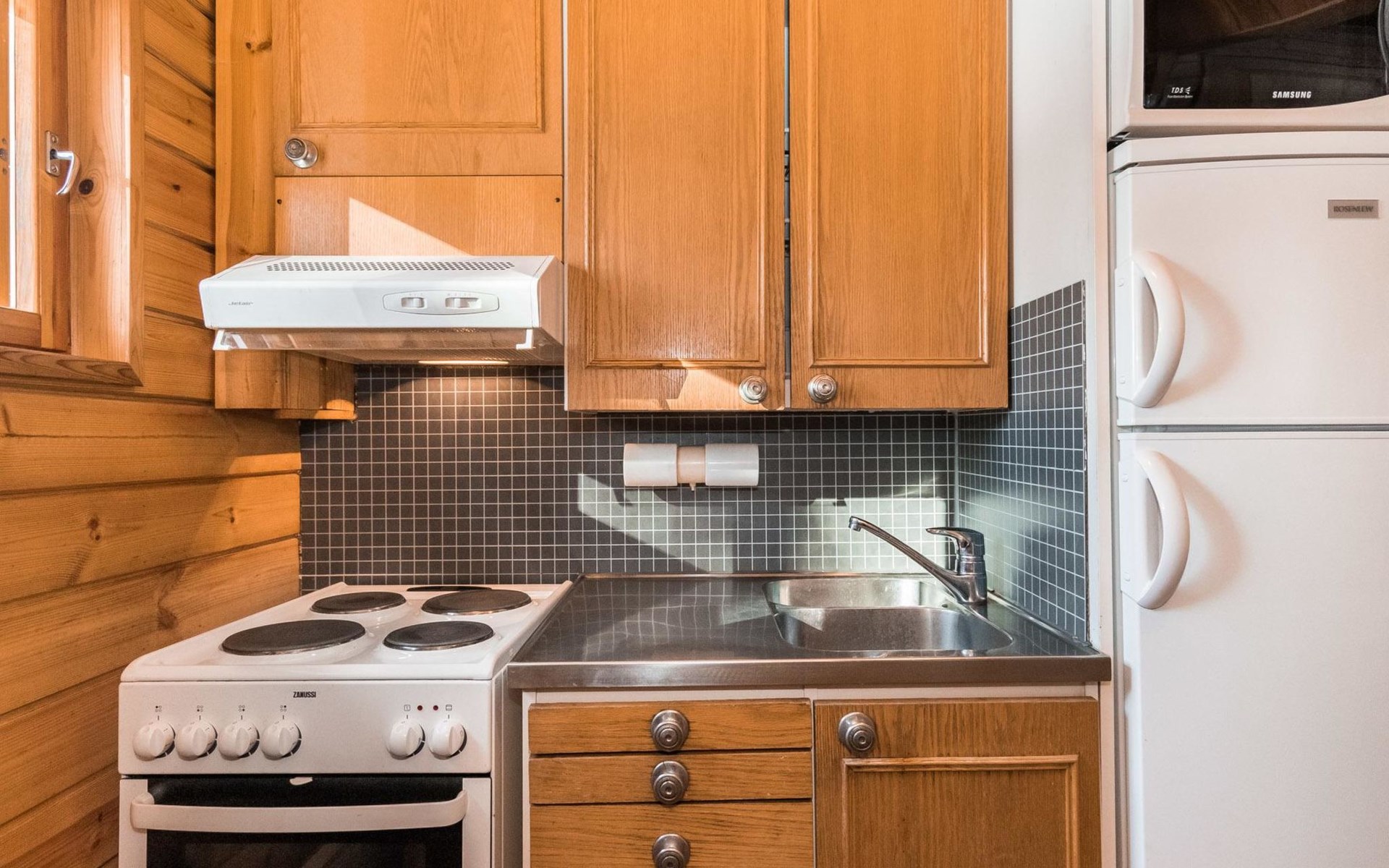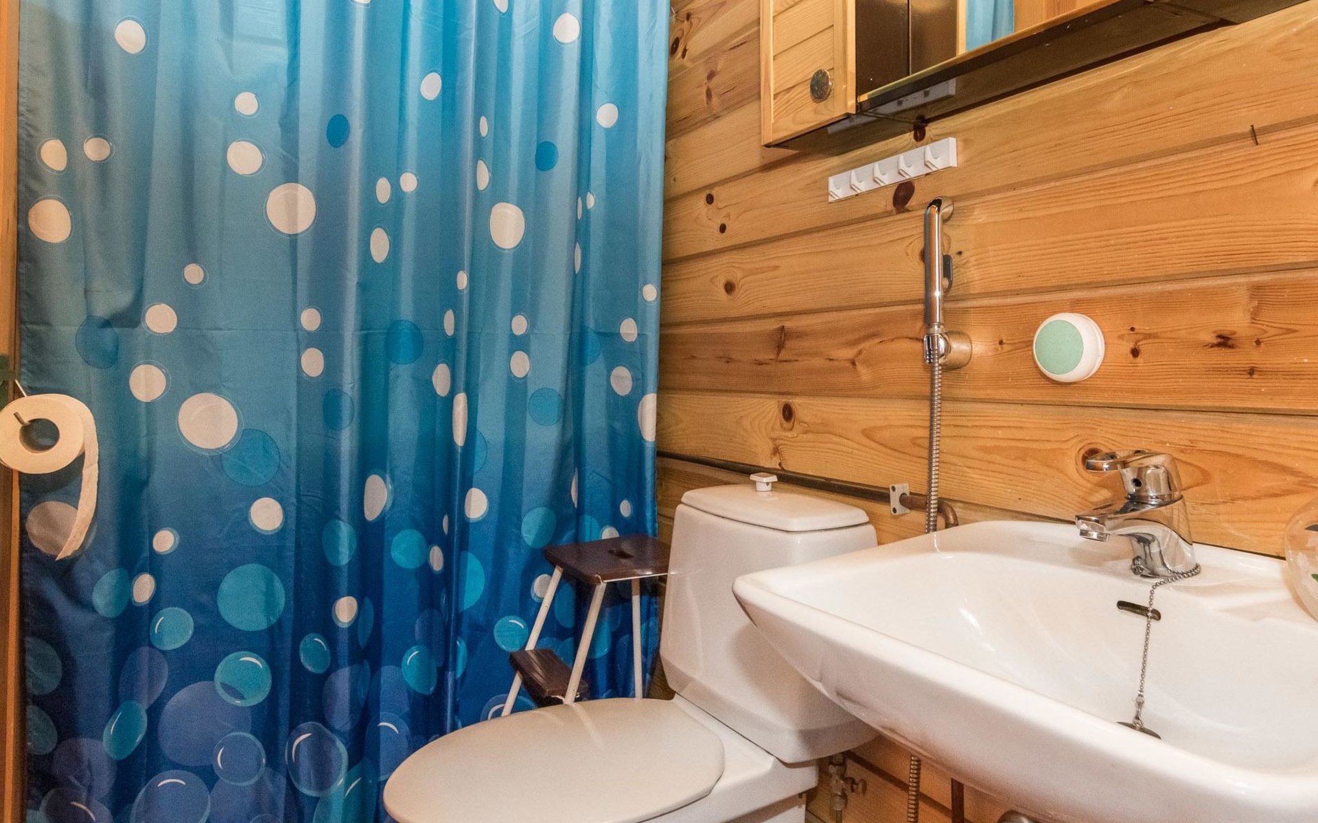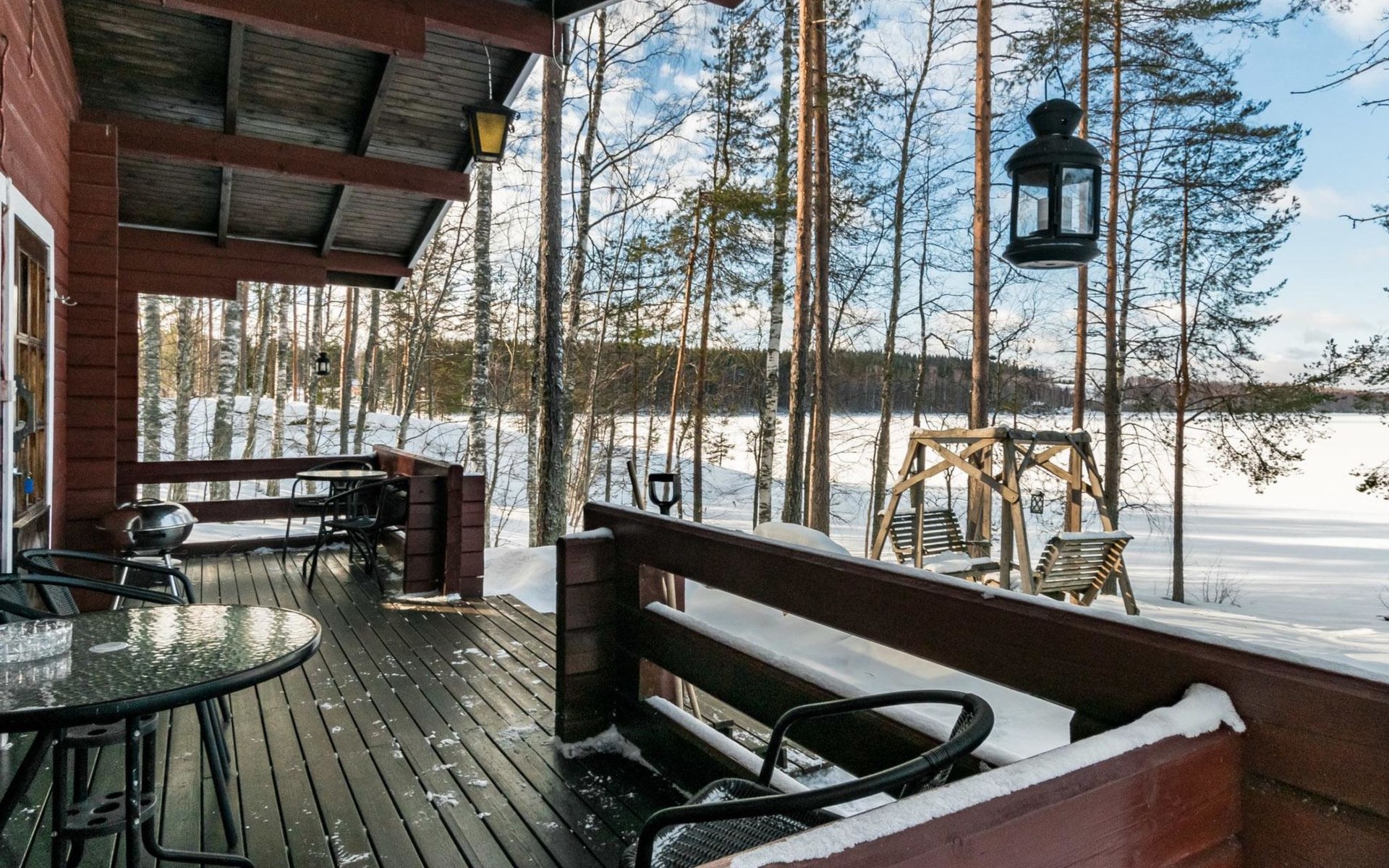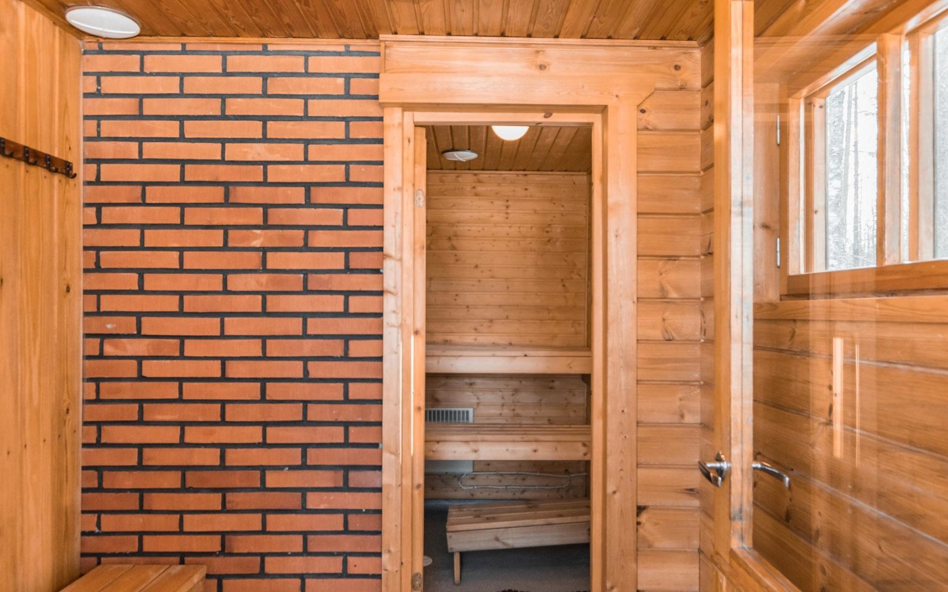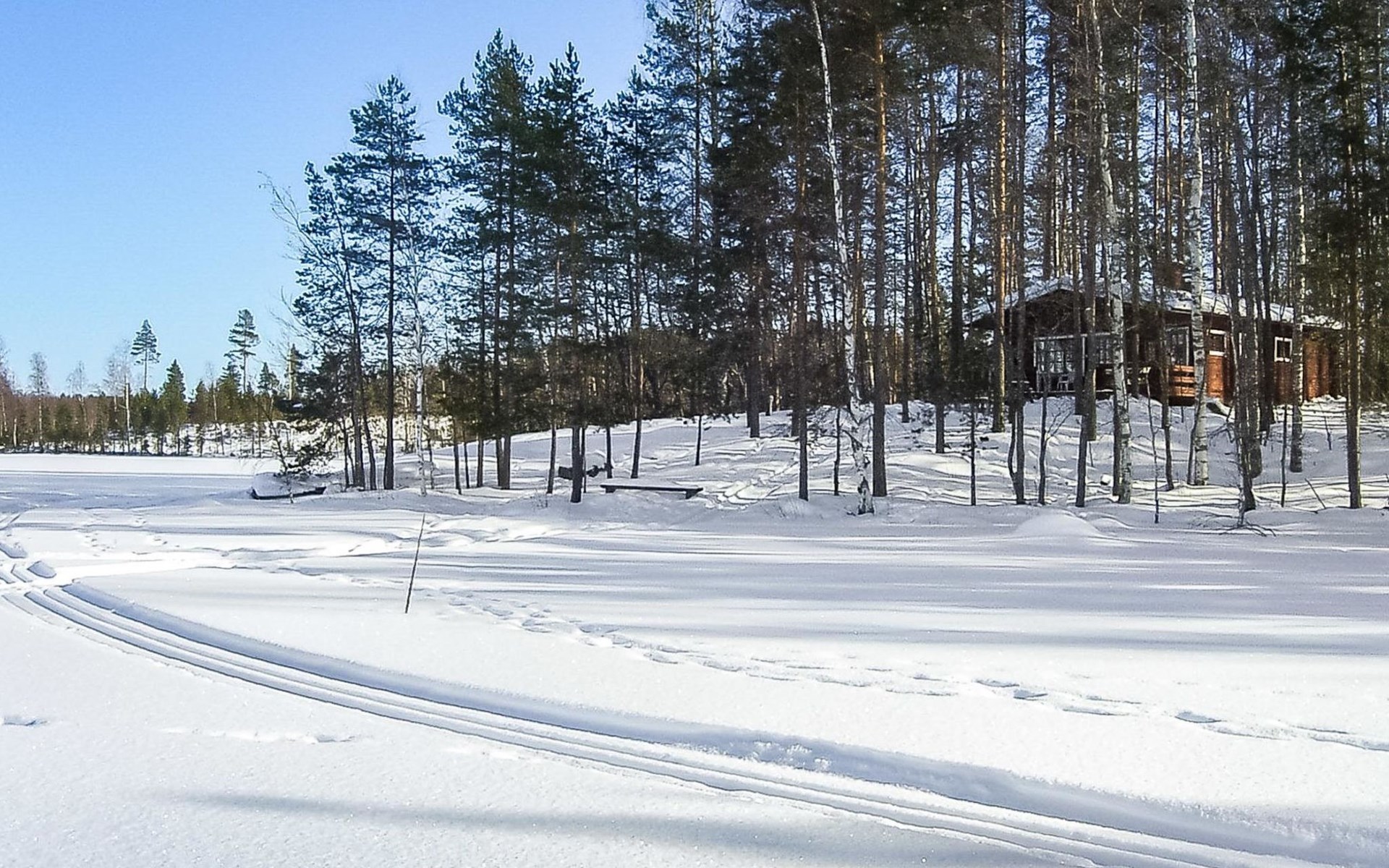 Log cabin, renovated 1992, kitchen, 2 bedrooms with 2 beds in each, living room with 2 extra beds (couch), sauna (electric sauna stove), dressing room, open veranda. Drinking water will be fetched from owner.