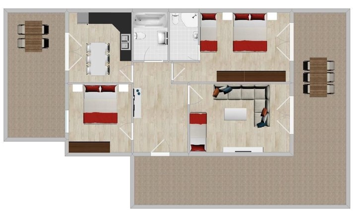 The interior of the 62 m² bungalow on the ground floor is modern and tastefully furnished and can accommodate 2 to 5 people. Facilities include a living/dining room with a sofa, satellite TV, air conditioning and access to the garden and terrace, two bedrooms - one with a double bed and one with two single beds, a fully equipped kitchen with microwave, filter coffee machine, toaster, kettle, dishwasher and a bathroom with shower and WC, plus a separate WC. The covered terrace is equipped with cosy patio furniture, ideal for relaxing hours outdoors.