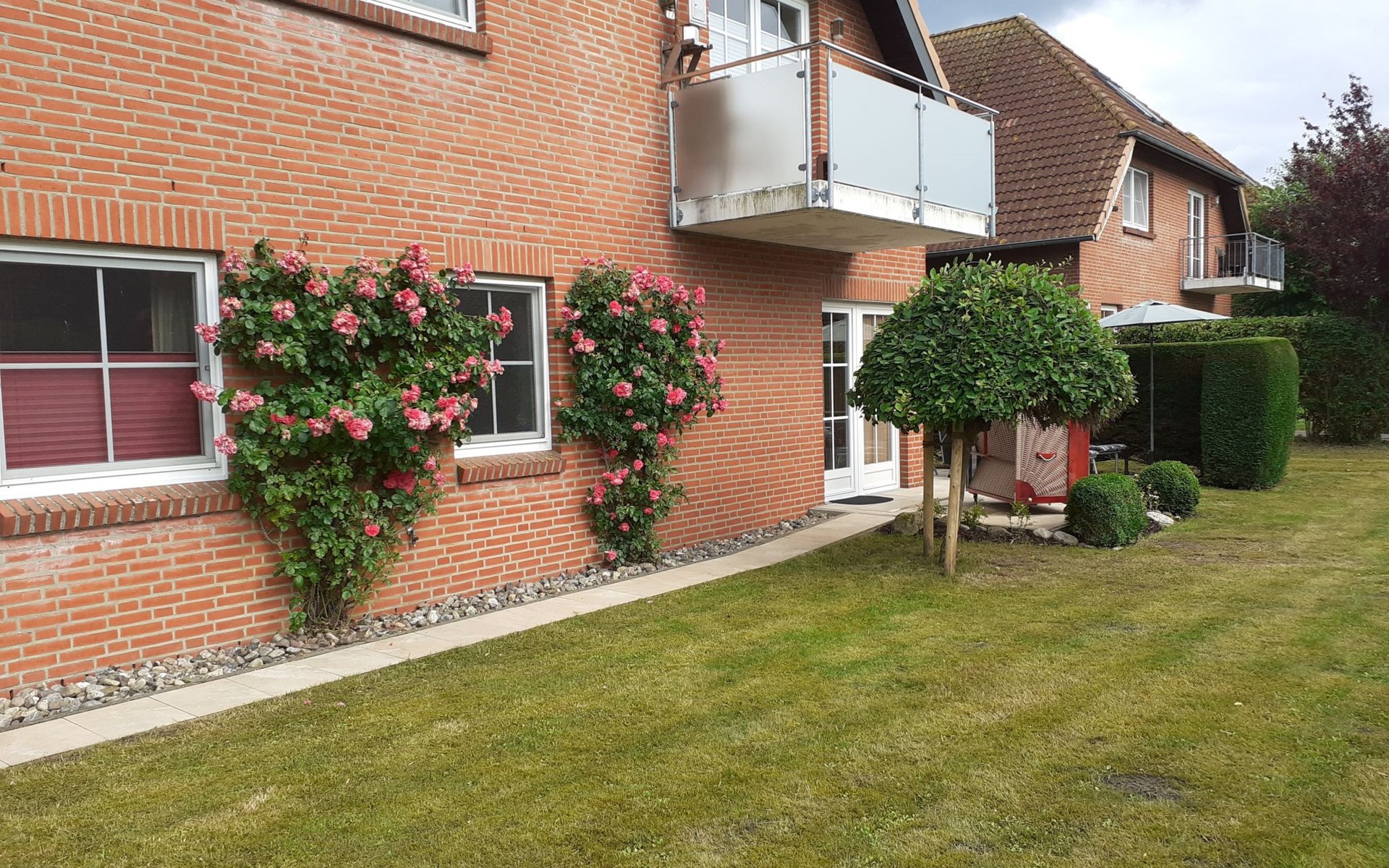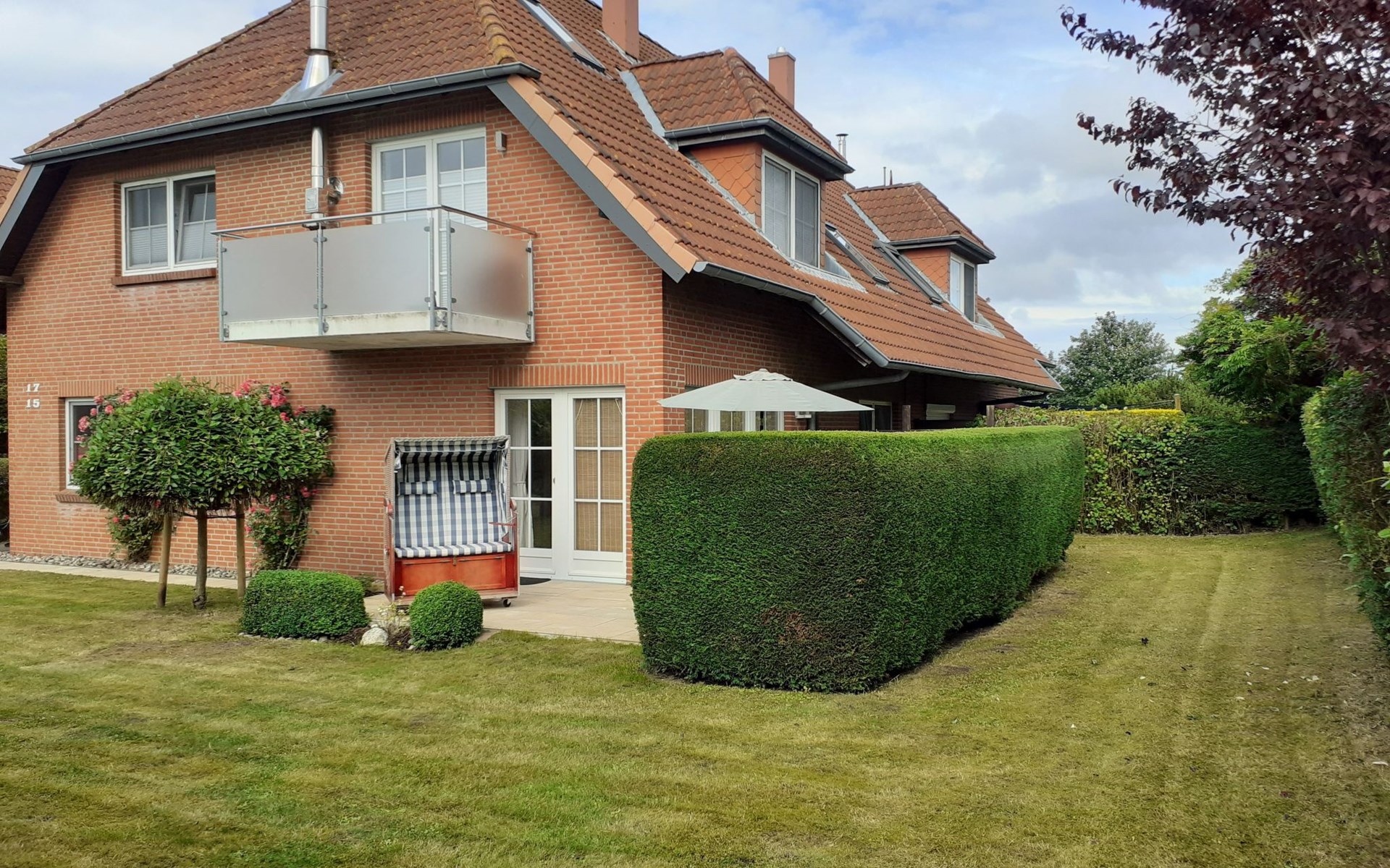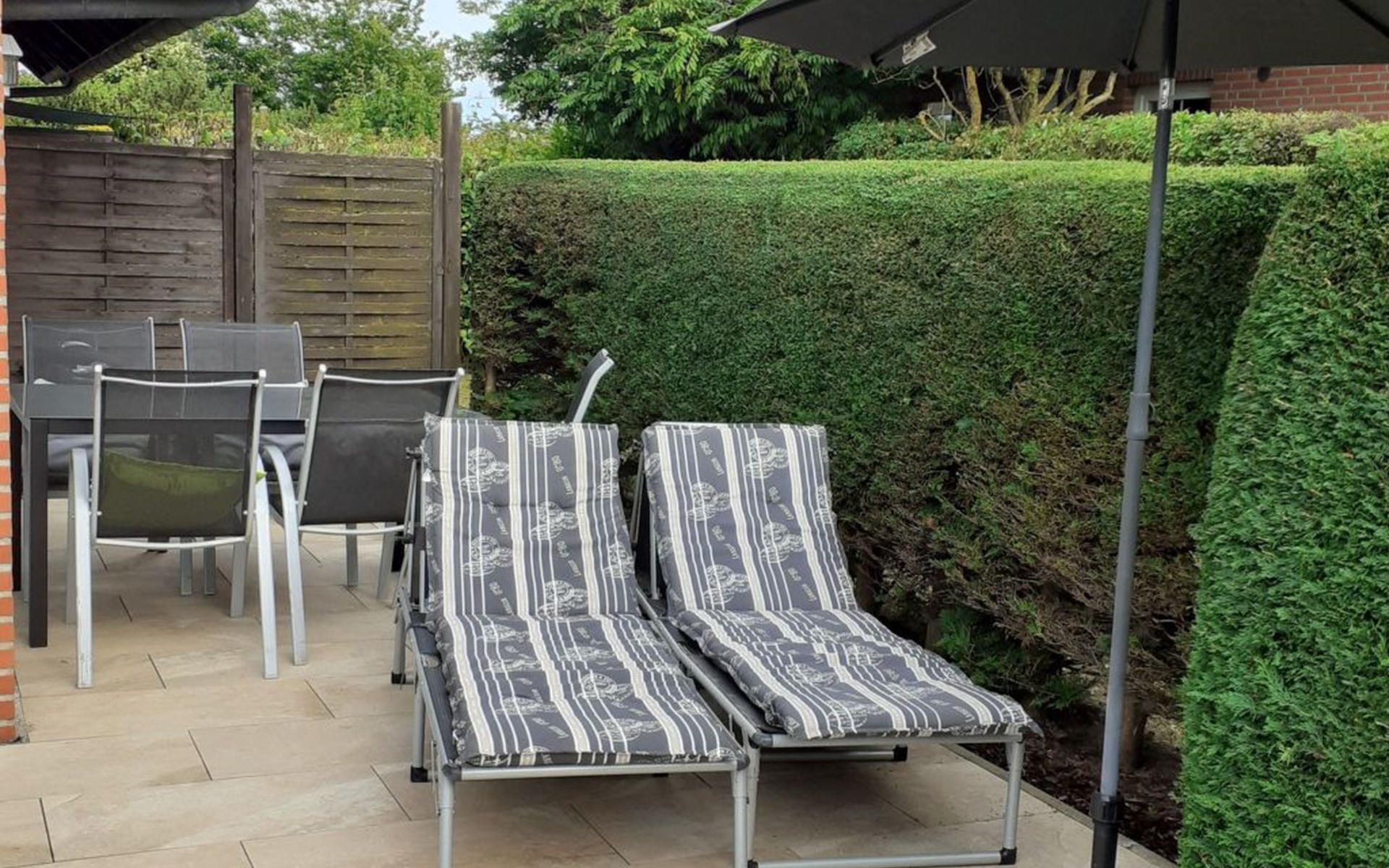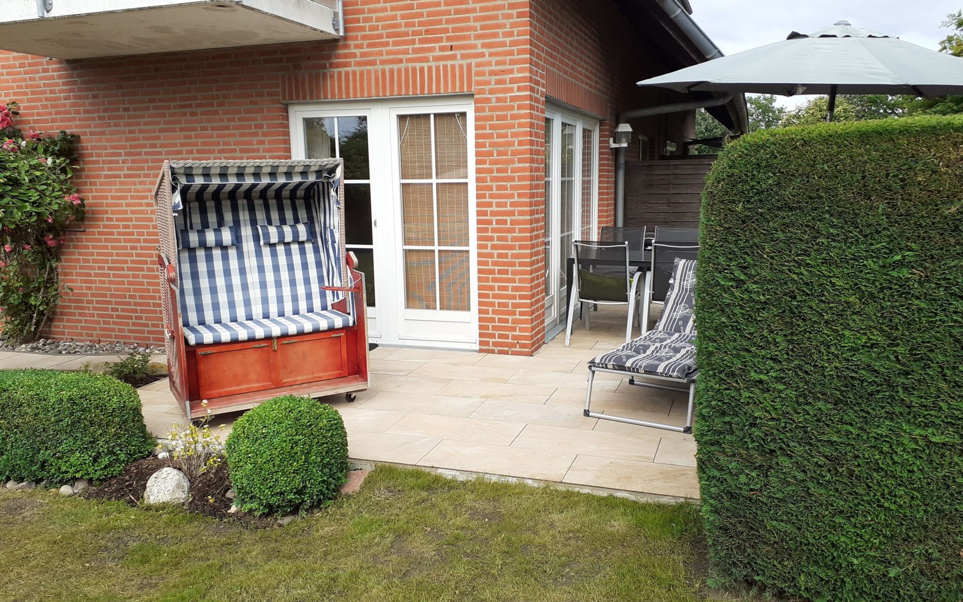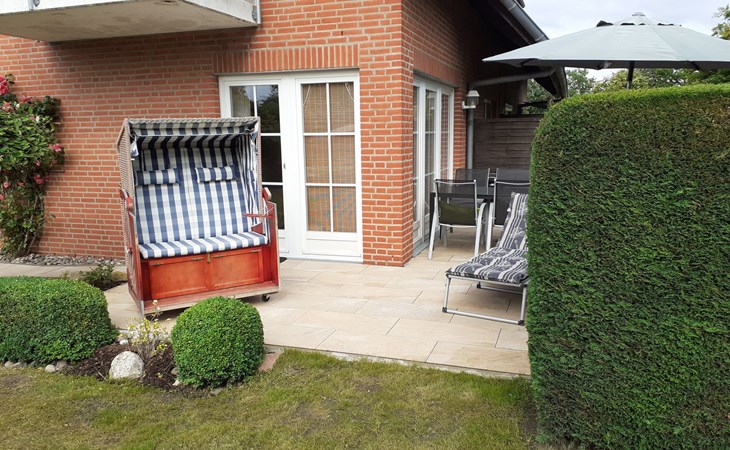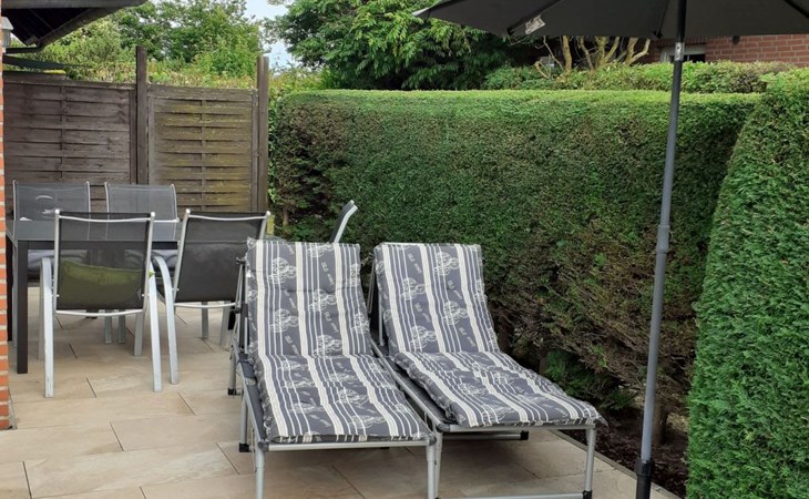 The terrace has garden furniture, sun loungers and a parasol. A grill is available. You can relax in the canopy beach chair and share use of the garden. You can park your car in the car port in front of the house. Behind it there is a lockable storage room for bicycles or other items.