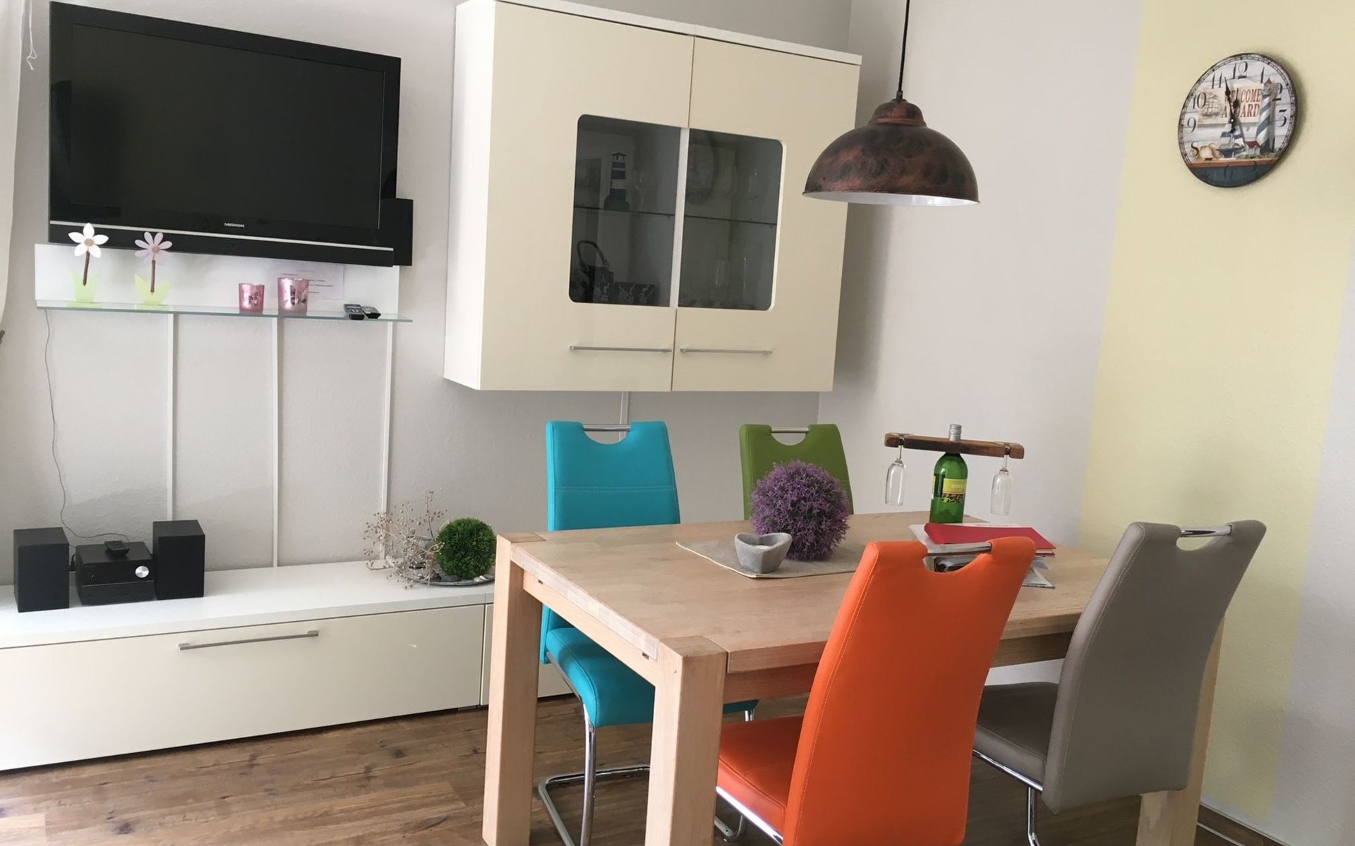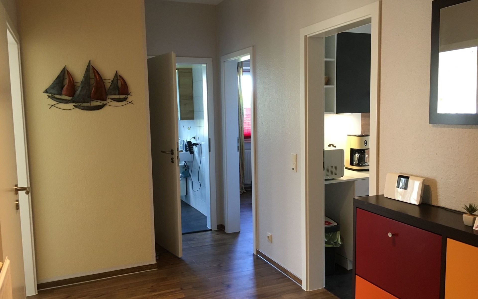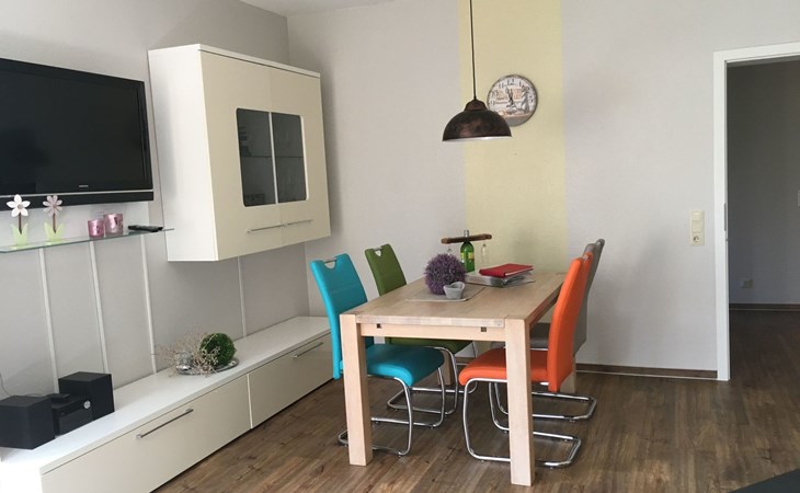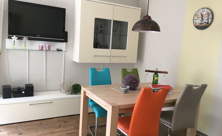 The apartment of around 75m² consists of a combined living and dining room with a comfortable sofa, a flatscreen TV, video, DVD and CD player, radio and a cupboard with children’s toys, along with a fully-equipped kitchen with a dishwasher, oven, four-ring ceramic hob, espresso and pads coffee machine, fridge with freezer compartment. There is a storage room with a washing machine, ironing board and rotary dryer. The bathroom is fitted with a new shower, a washbasin and a WC. You can use a child’s bed, a highchair and a travel bed. The spacious first bedroom is furnished with a double bed (180 x 200cm) and large cupboards. The second bedroom (or children’s room) has two single beds that can be pushed together.
