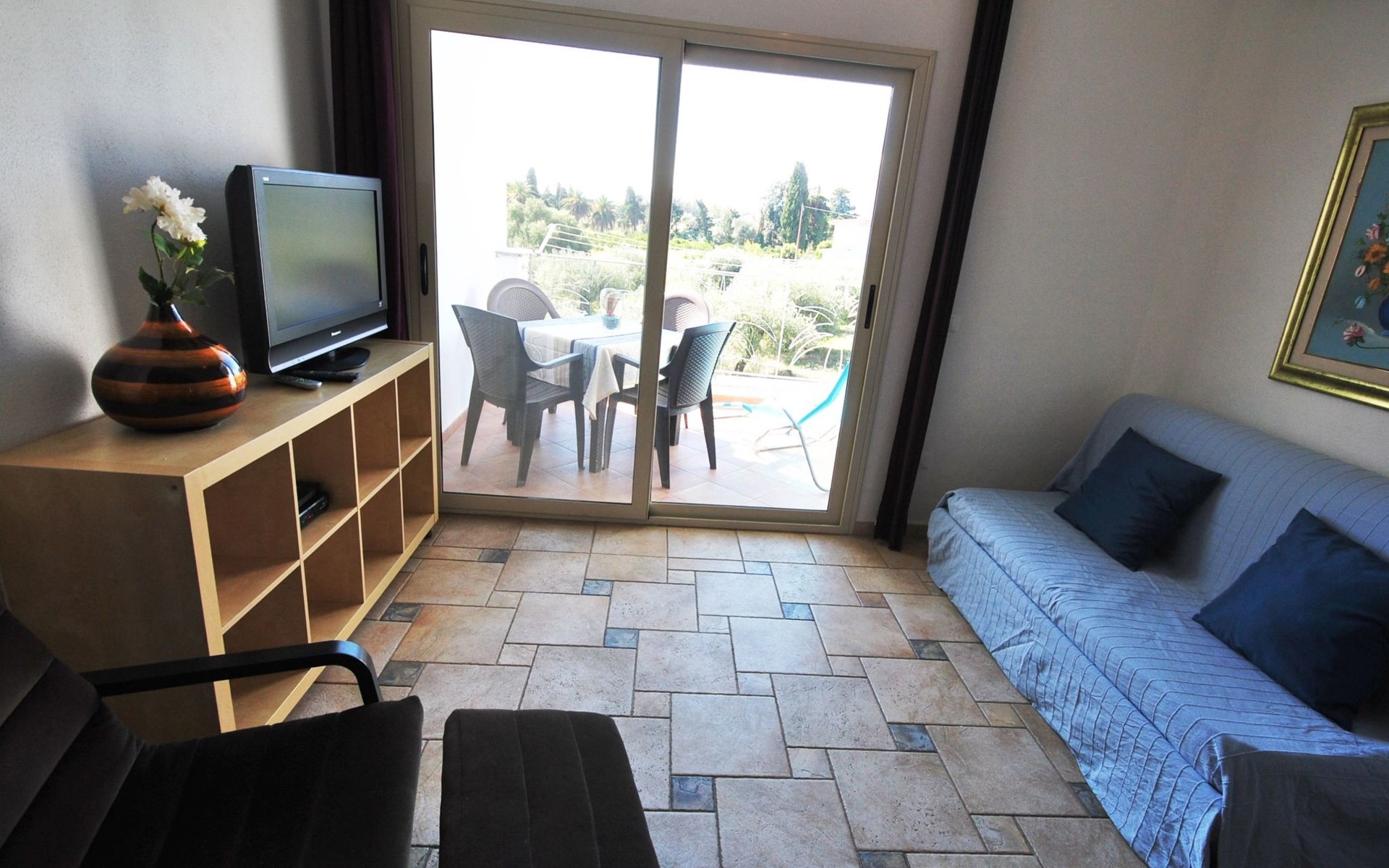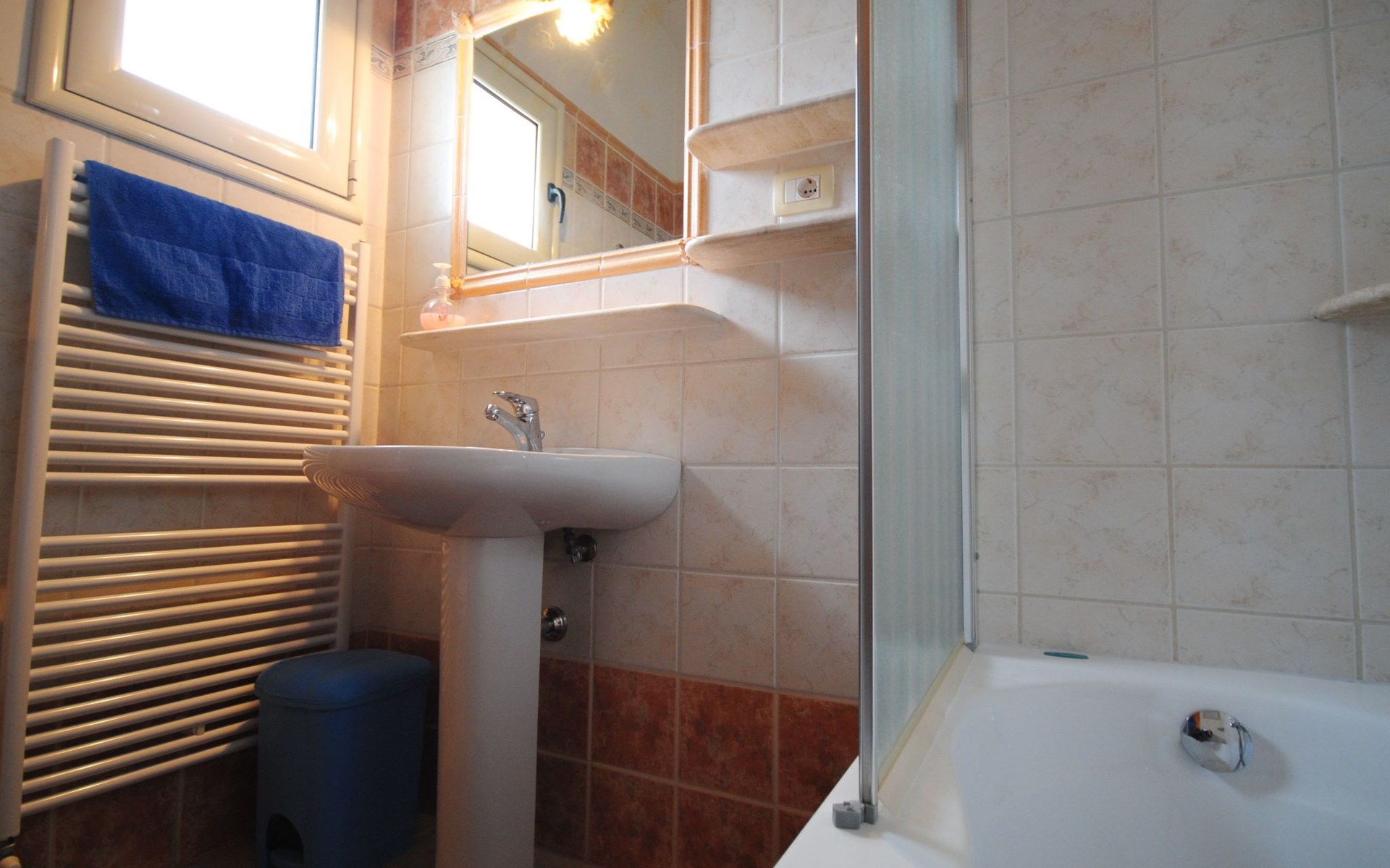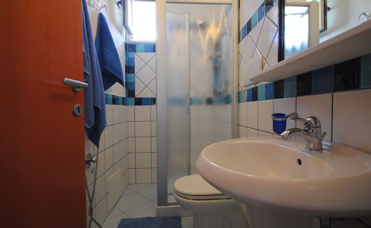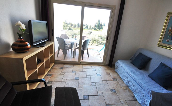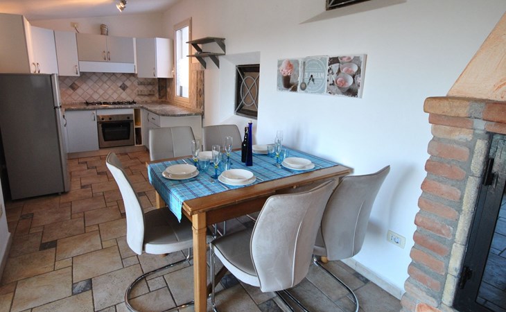3-room flat 55 m², for 4 persons, 1st floor with 10 m² terrace, 1 large and 1 small bedroom with double bed and private bathroom. Kitchen-living room with double sofa bed. Fireplace and veranda with marvellous view of olive grove and mountains. Air conditioning/heating, fully equipped kitchen, fridge, freezer, gas hob, oven, washing machine in common room, tastefully furnished rooms (see photos, subject to change), barbecue. INCLUDED IN THE PRICE: air conditioning/heating, car park in the courtyard, WIFI, TV and towels.