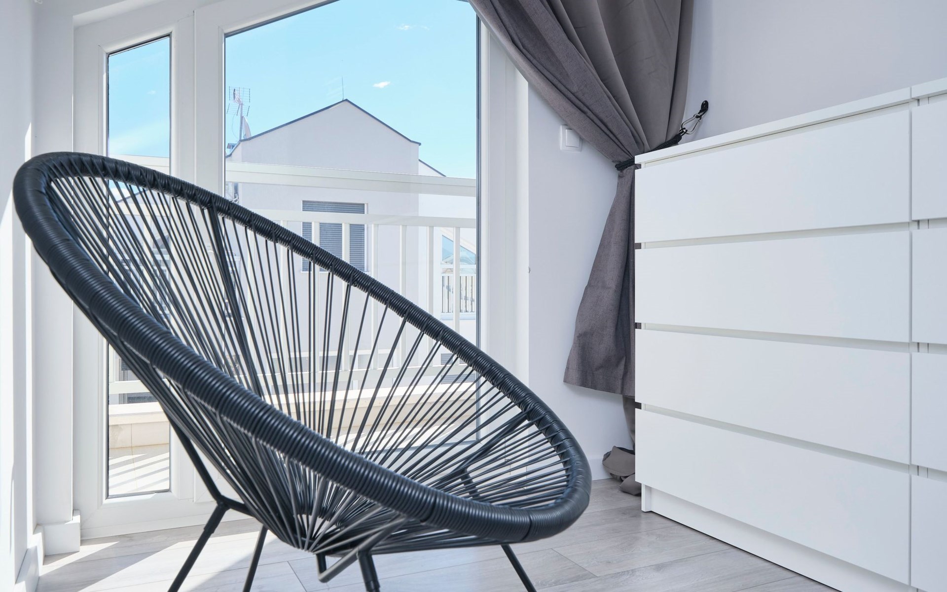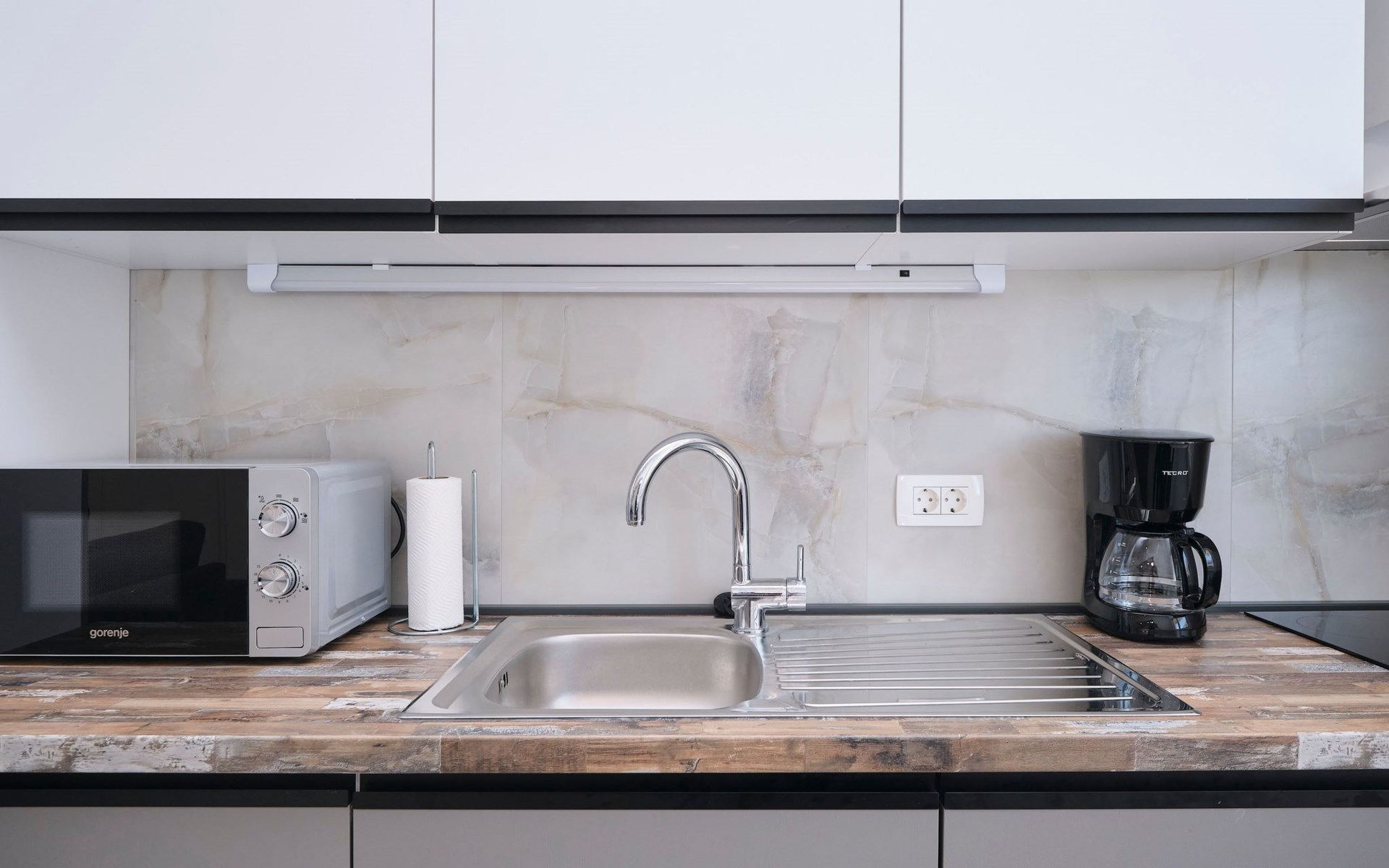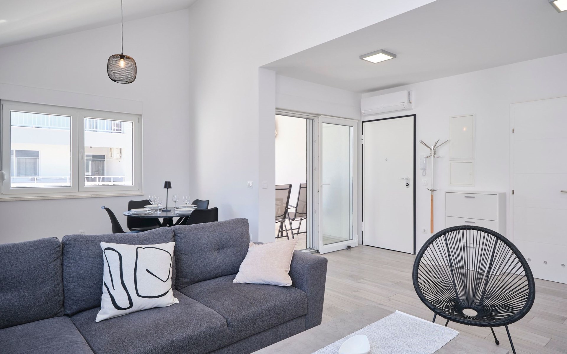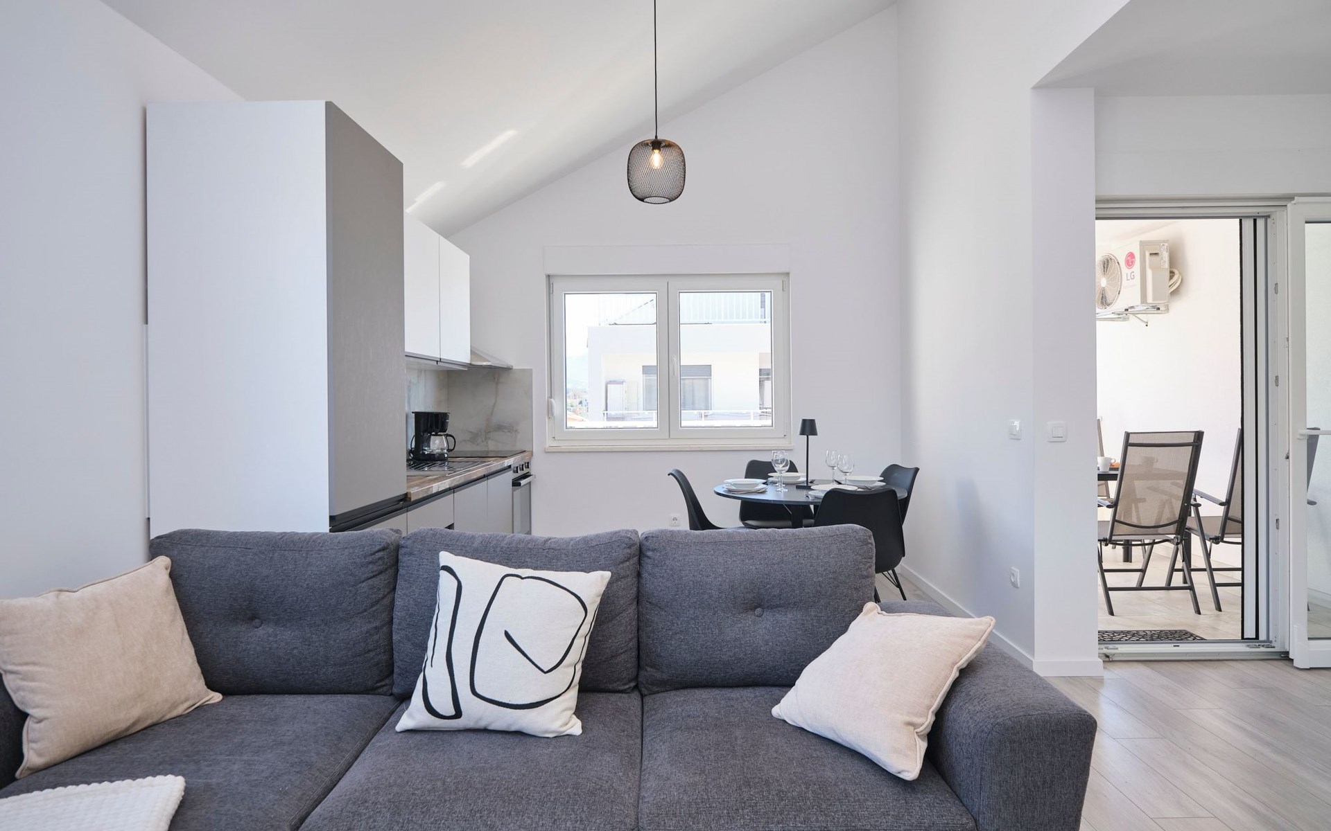 Inside, the apartment is thoughtfully equipped to ensure a comfortable stay. The cozy seating area, paired with a flat-screen smart TV, provides the perfect spot for unwinding after a day of adventure. The kitchen, furnished with stainless steel appliances including an induction hob, filter coffee machine, dishwasher, and electric kettle, caters to all your culinary needs with ample counter space for meal preparation. The spacious bedroom, bathed in natural light, features a luxurious queen-sized bed to ensure a restful night's sleep. For added comfort, the entire space is air-conditioned, and amenities such as free WiFi and a washing machine for personal use are included.