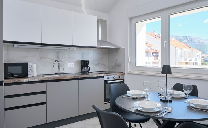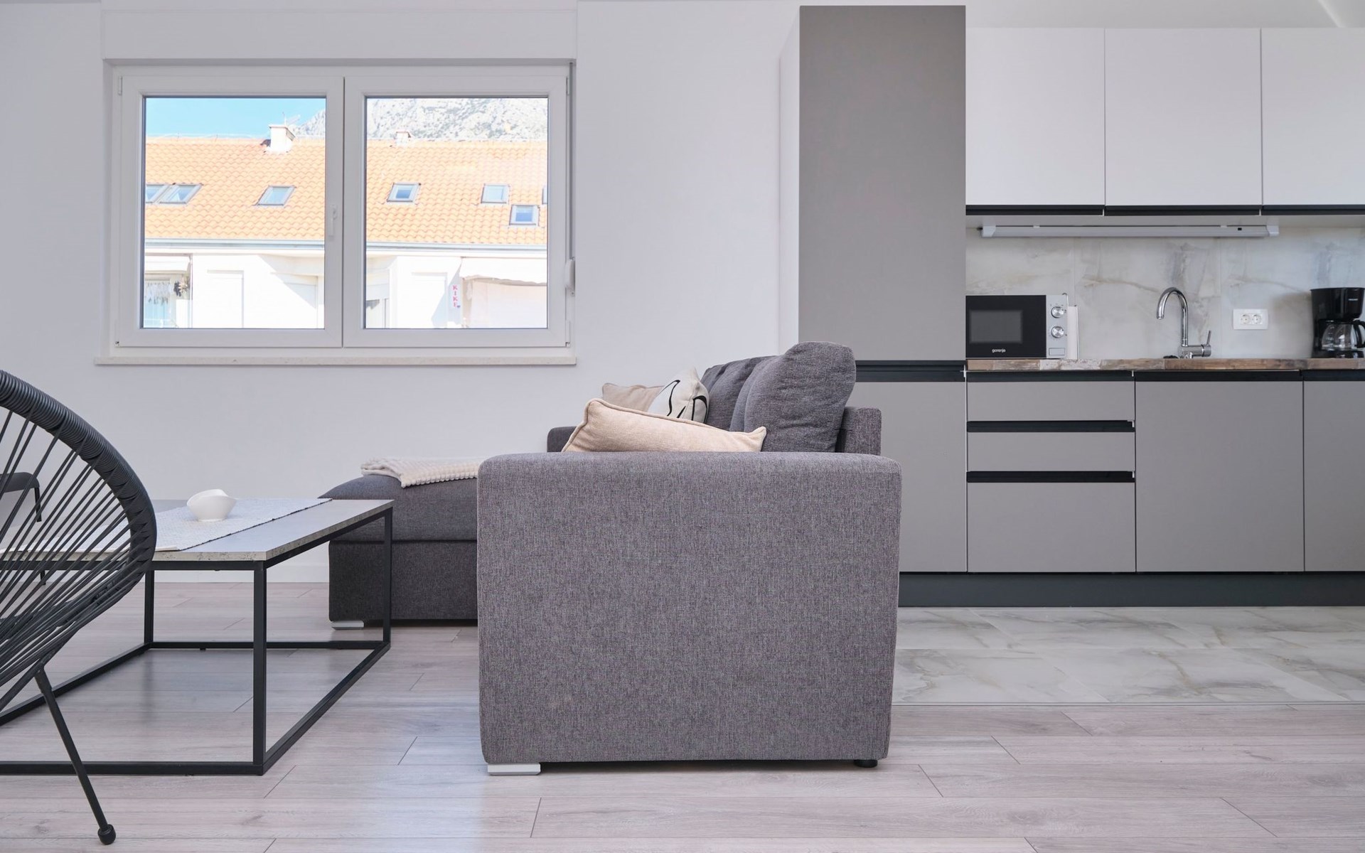 The apartment's location is truly enviable, situated just 850 meters from the beach and the sea, making it an ideal spot for water enthusiasts and beachgoers alike. Moreover, with a grocery store only 350 meters away, stocking up on essentials is both quick and convenient. The area is ripe for exploration, with the majestic backdrop of mountains and the soothing proximity of the sea creating a perfect blend for outdoor activities, cultural immersion, and leisurely strolls along the waterfront.