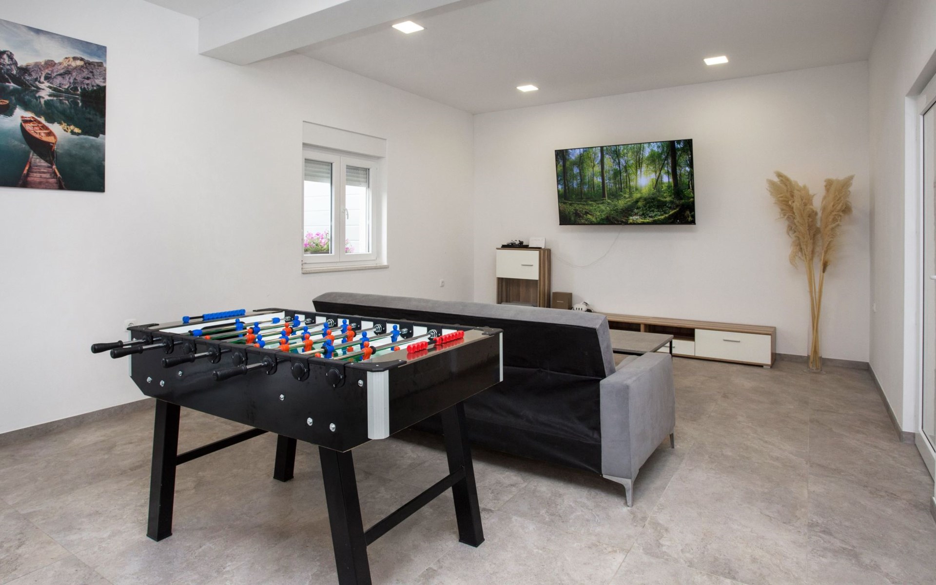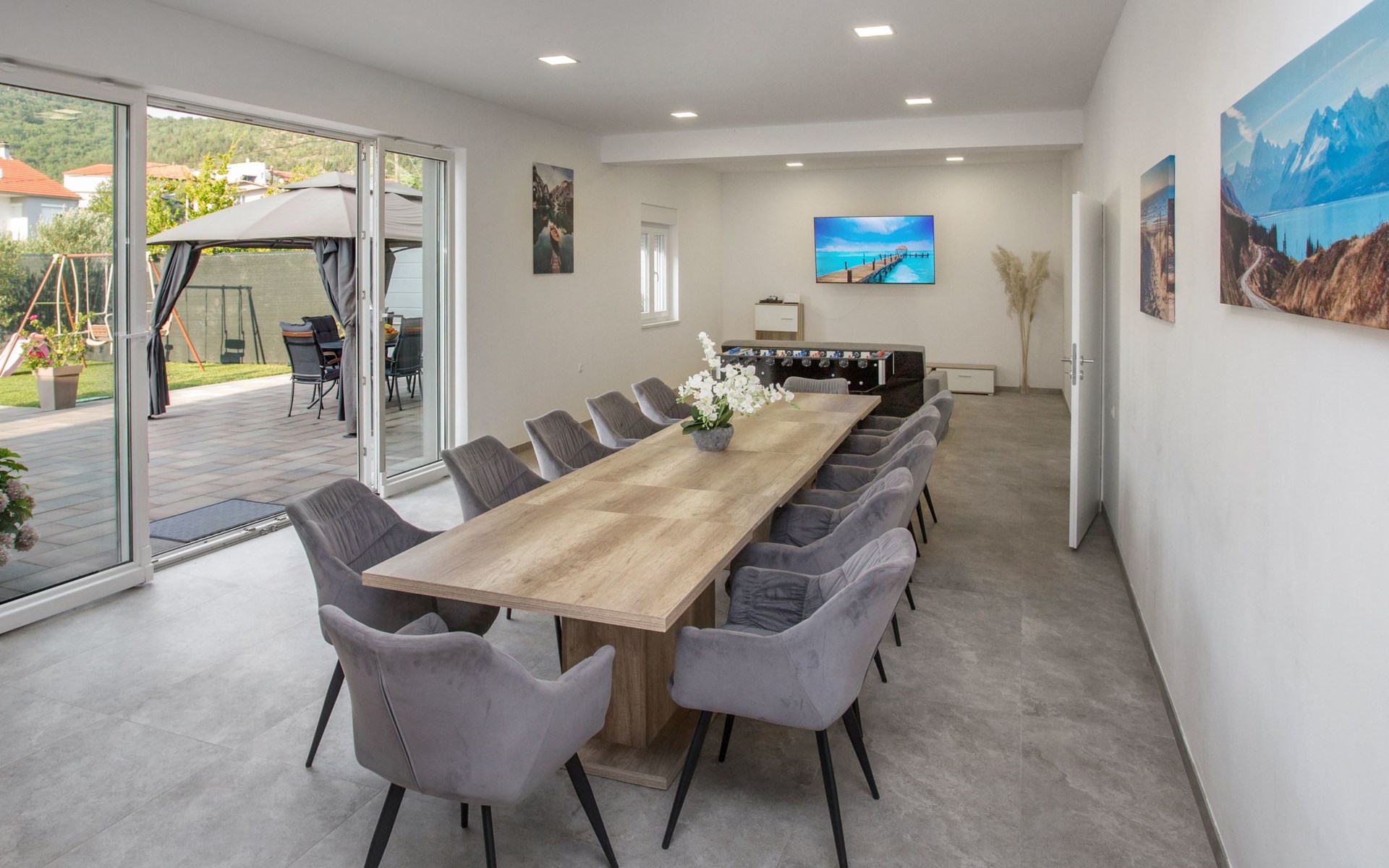 The outdoor area of this property is truly where it shines, offering exclusive use of a lush garden that invites guests to unwind and enjoy the outdoors. The highlight is undoubtedly the outdoor hot tub, perfect for relaxing evenings under the stars. For those who enjoy keeping active, the garden also features a playground for children, as well as facilities for billiards, table football, and table tennis, ensuring entertainment for all ages. The terrace and balcony offer additional spaces for relaxation and socializing, making every moment outside memorable.