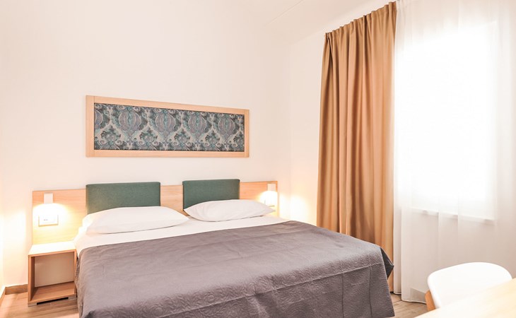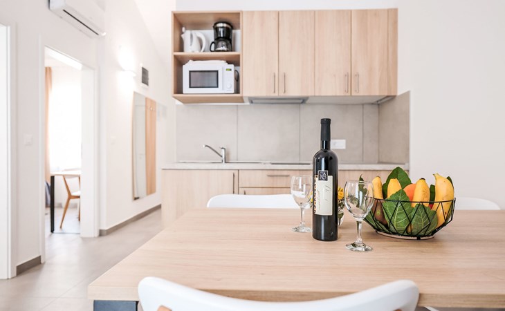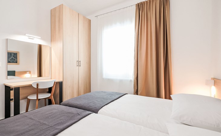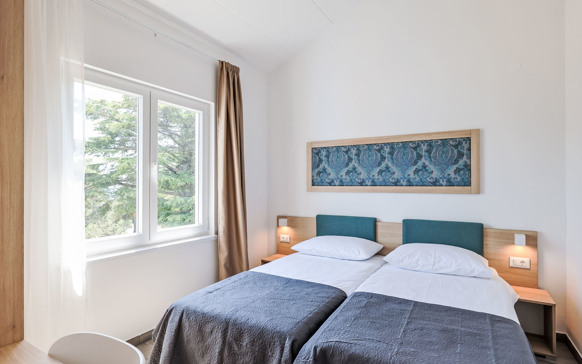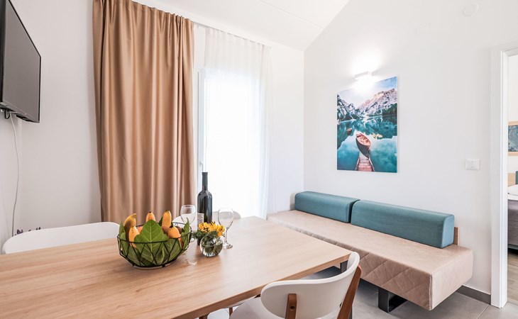 Resort "Medena". In the district of Seget Donji 3 km from the centre of Trogir, 30 km from the centre of Split, in a sunny position, at the seaside. For shared use: property with plants and trees, 3 swimming pools (31 m2, depth 140 cm, seasonal availability: 01.Apr. - 01.Nov.) with internal staircase. Children's pool, outdoor shower, tennis (extra), basketball (extra), children's playground. In the complex: reception, restaurant, internet access, laundry. Available: bicycles (extra). Breakfast full board half board possible on request (extra). Airport transfer (extra). Parking (extra) on the premises. Bus stop 650 m. Object suitable for 4 adults + 1 child. Please note: airfield 8 km from the property. The photograph shows a typical example. A sofa bed in the living/dining area is only suitable for 1 child up to 12 years old.
