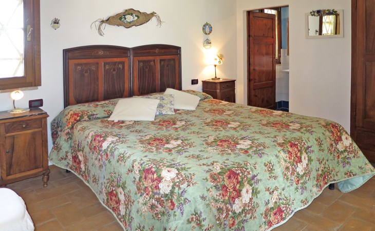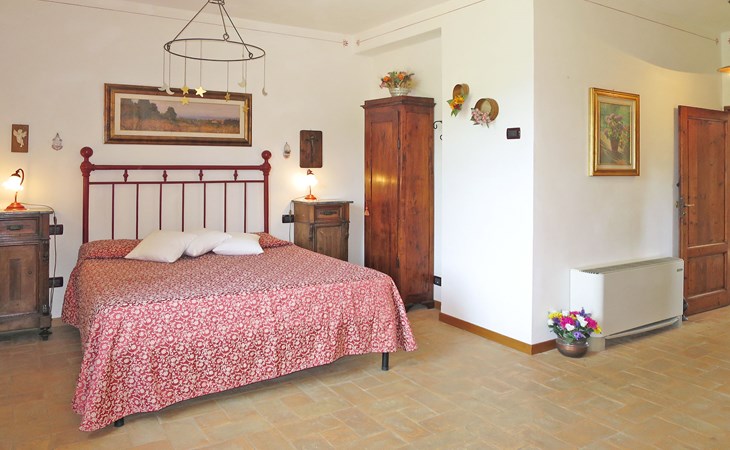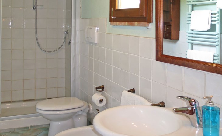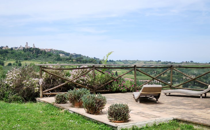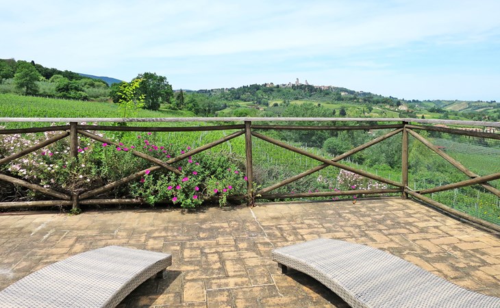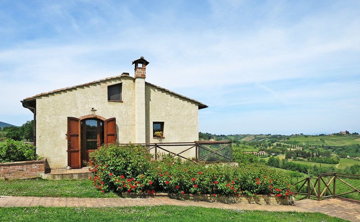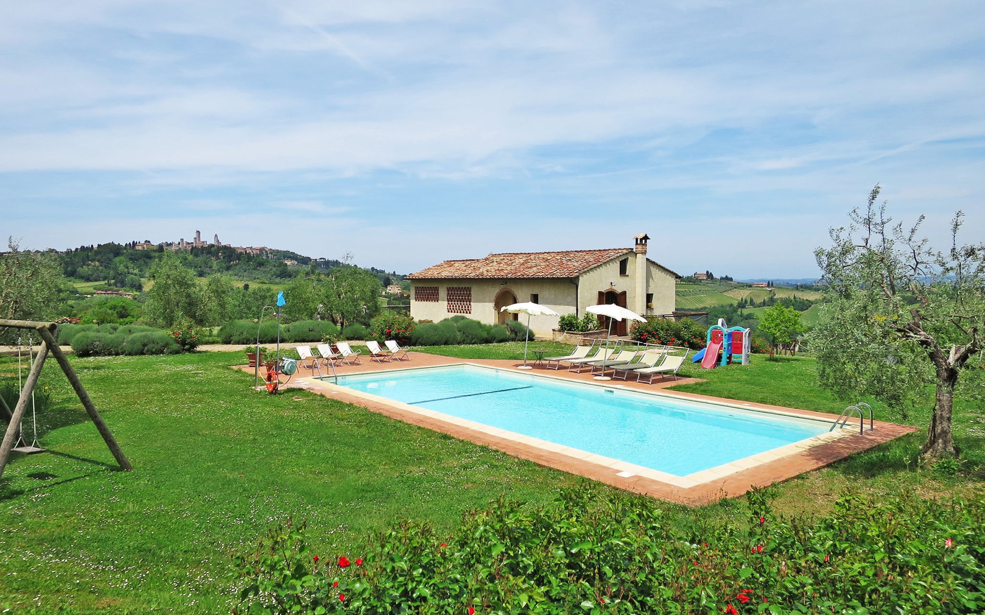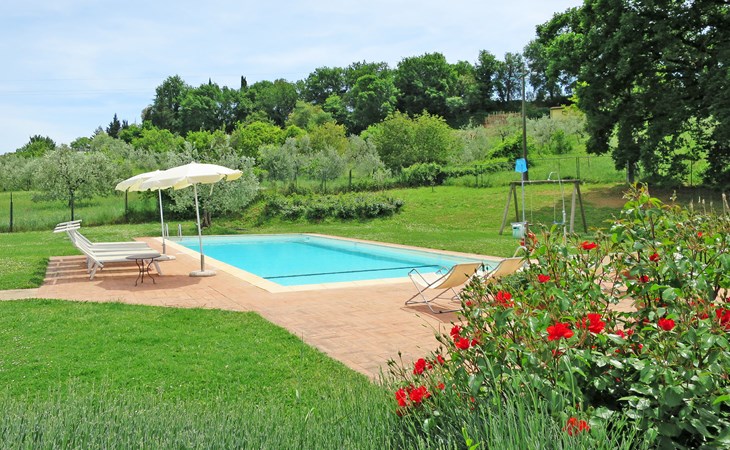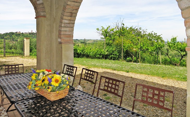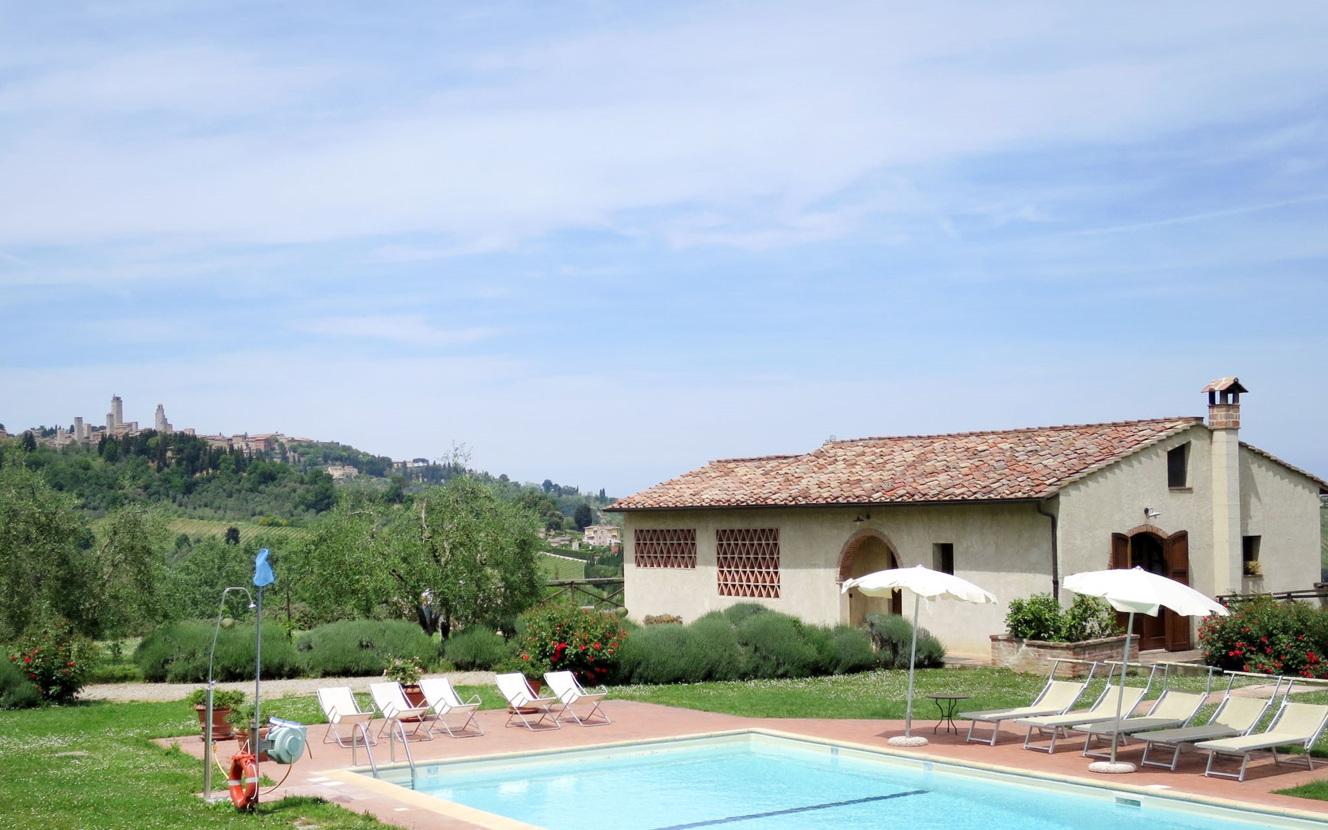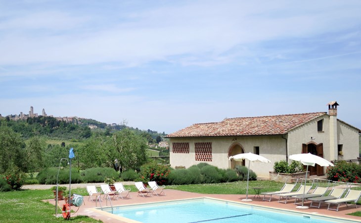 Very beautiful villa "Le Fonti di Santa Lucia", detached, surrounded by meadows and vineyards. In the district of Santa Lucia.(300 m) 2.5 km from the centre of San Gimignano, 10 km from the centre of Poggibonsi, outside the resort, 47 km from the centre of Siena. In a secluded, elevated position on a slope, 68 km from the sea, in the countryside. Private: garden 3'000 m2 (fenced) with flowers and trees, meadow, natural pond, swimming pool (14 x 6 m, depth 140 - 190 cm, seasonal availability: 25.Apr. - 10.Oct.). Outdoor shower, terrace, pool maintenance by the owner/gardener. Linen change weekly. 300 m long steep motor access (via unmade road). Roofed, parking (for 4 cars) at the house. Shop 2.5 km, supermarket 2.5 km, bus stop 2.5 km, railway station "Poggibonsi" 10 km, sandy beach "Cecina Mare" 68 km, indoor swimming pool 10 km.