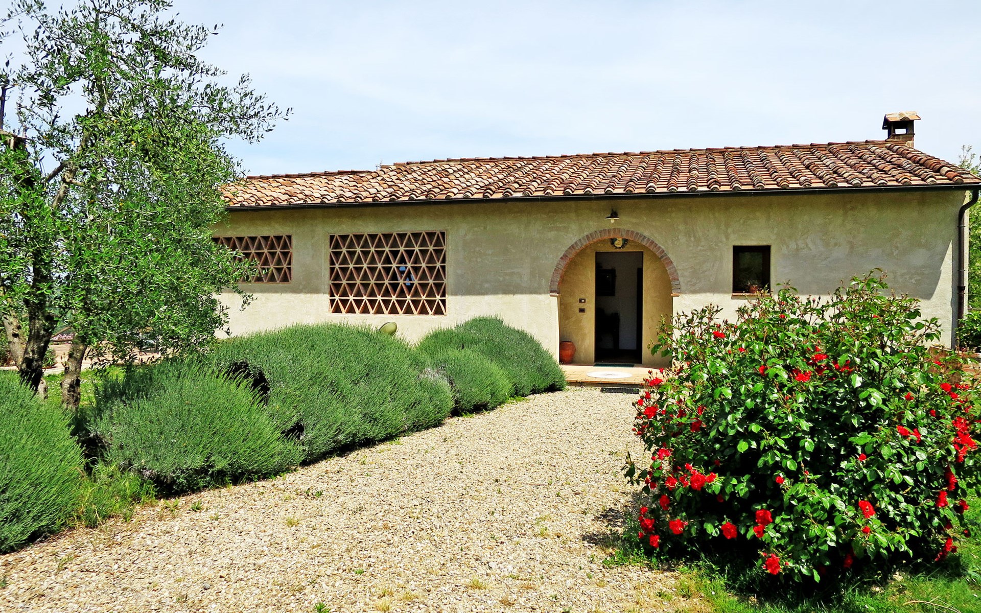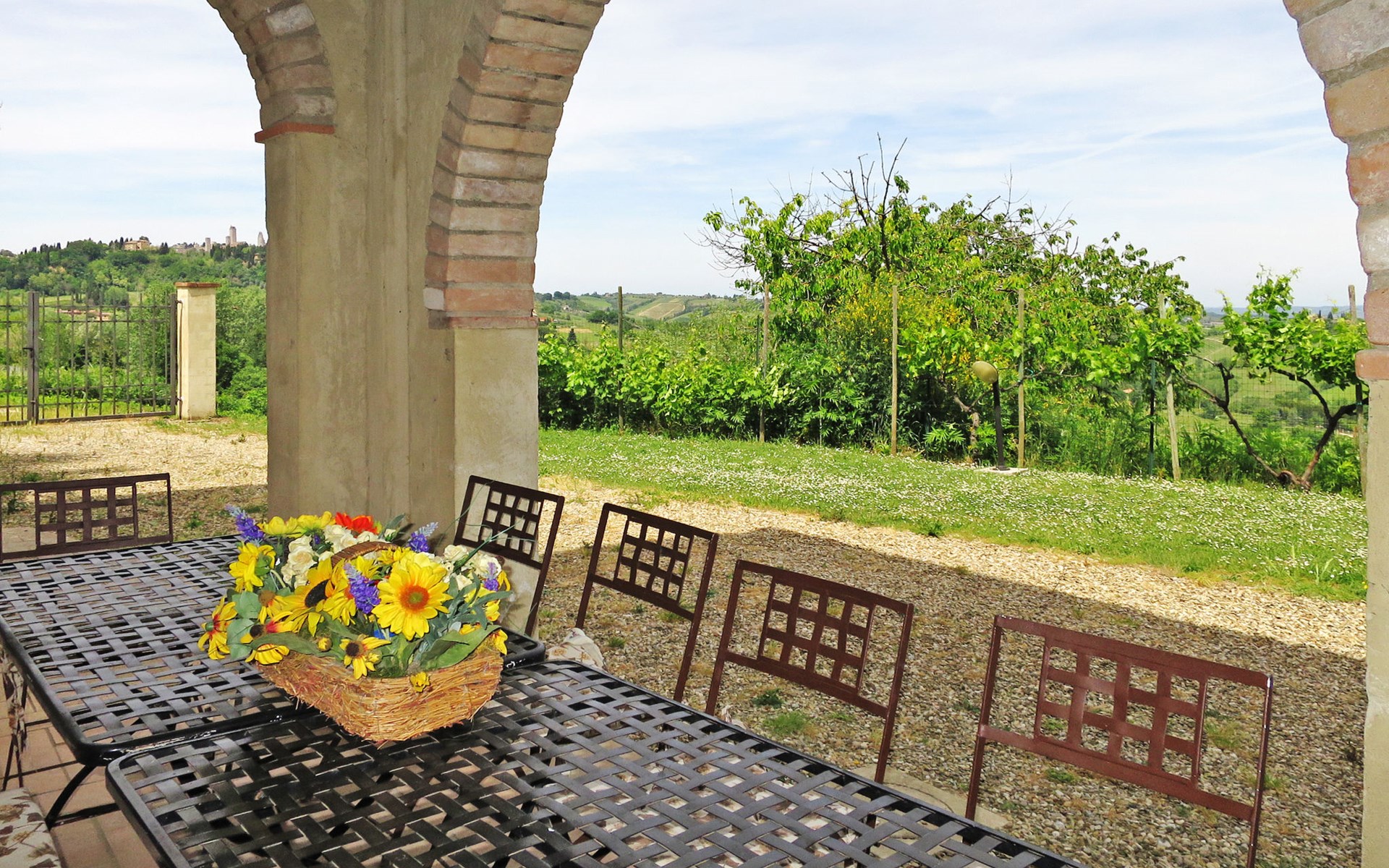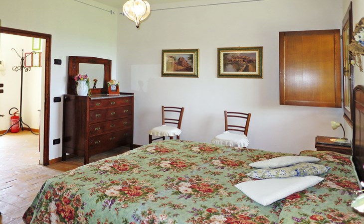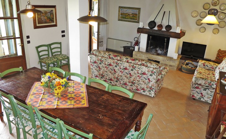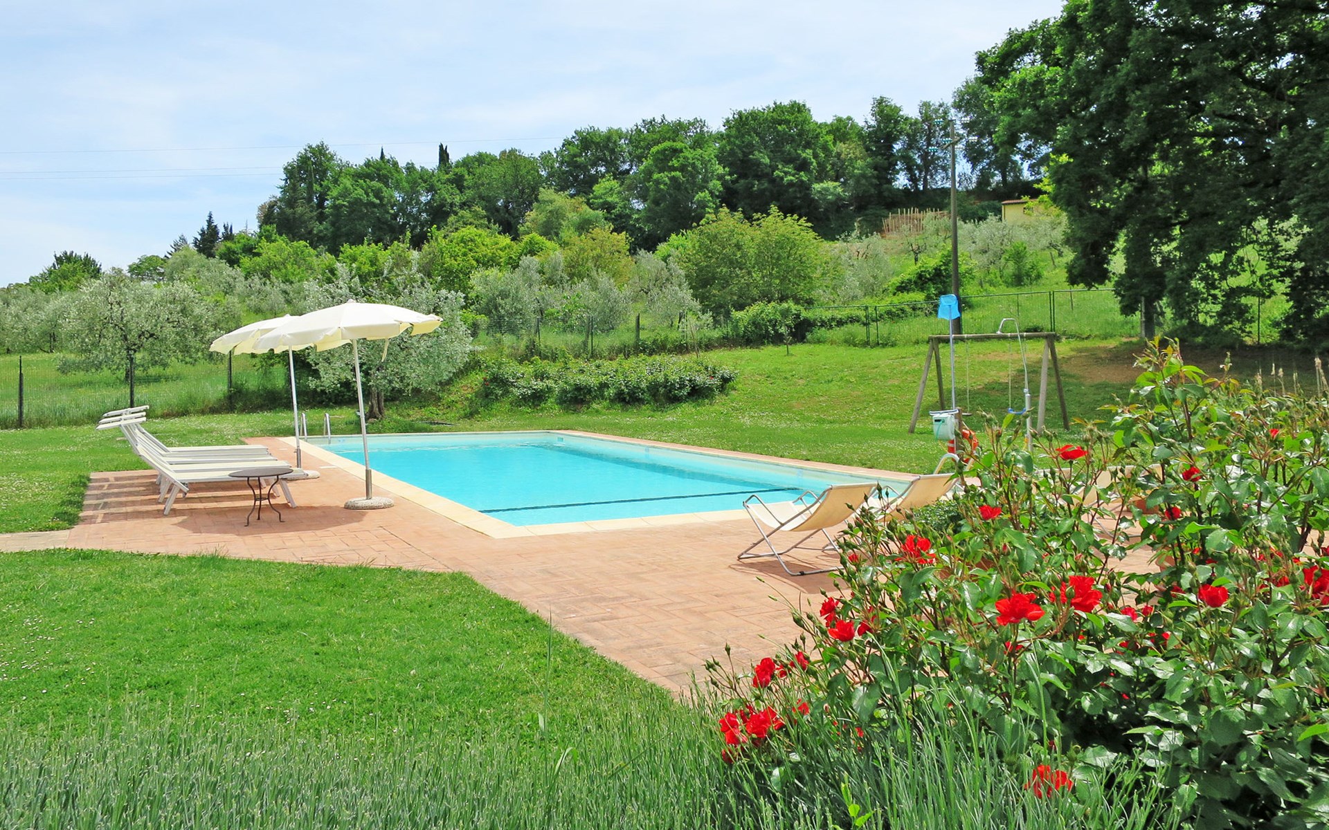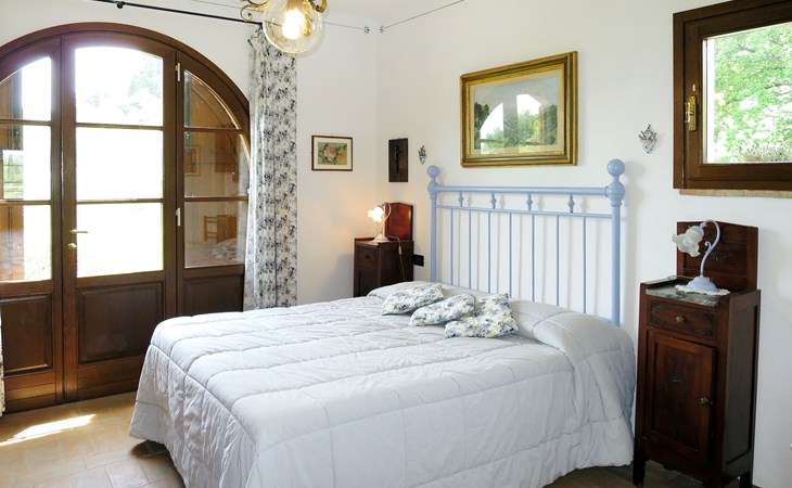 Very beautiful villa "Le Fonti di Santa Lucia", detached, surrounded by meadows and vineyards. In the district of Santa Lucia.(300 m) 2.5 km from the centre of San Gimignano, 10 km from the centre of Poggibonsi, outside the resort, 47 km from the centre of Siena. In a secluded, elevated position on a slope, 68 km from the sea, in the countryside. Private: garden 3'000 m2 (fenced) with flowers and trees, meadow, natural pond, swimming pool (14 x 6 m, depth 140 - 190 cm, seasonal availability: 25.Apr. - 10.Oct.). Outdoor shower, terrace, pool maintenance by the owner/gardener. Linen change weekly. 300 m long steep motor access (via unmade road). Roofed, parking (for 4 cars) at the house. Shop 2.5 km, supermarket 2.5 km, bus stop 2.5 km, railway station "Poggibonsi" 10 km, sandy beach "Cecina Mare" 68 km, indoor swimming pool 10 km.