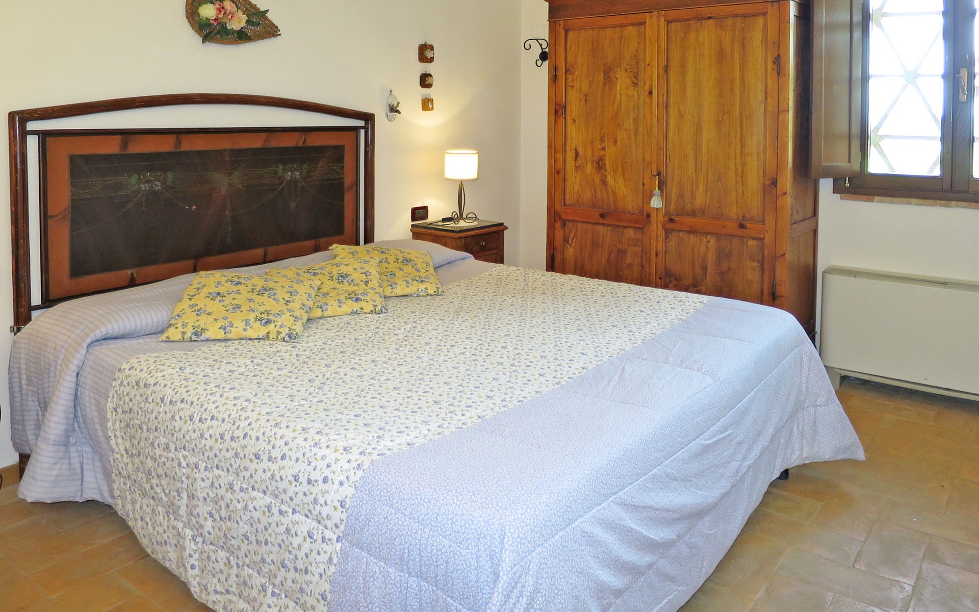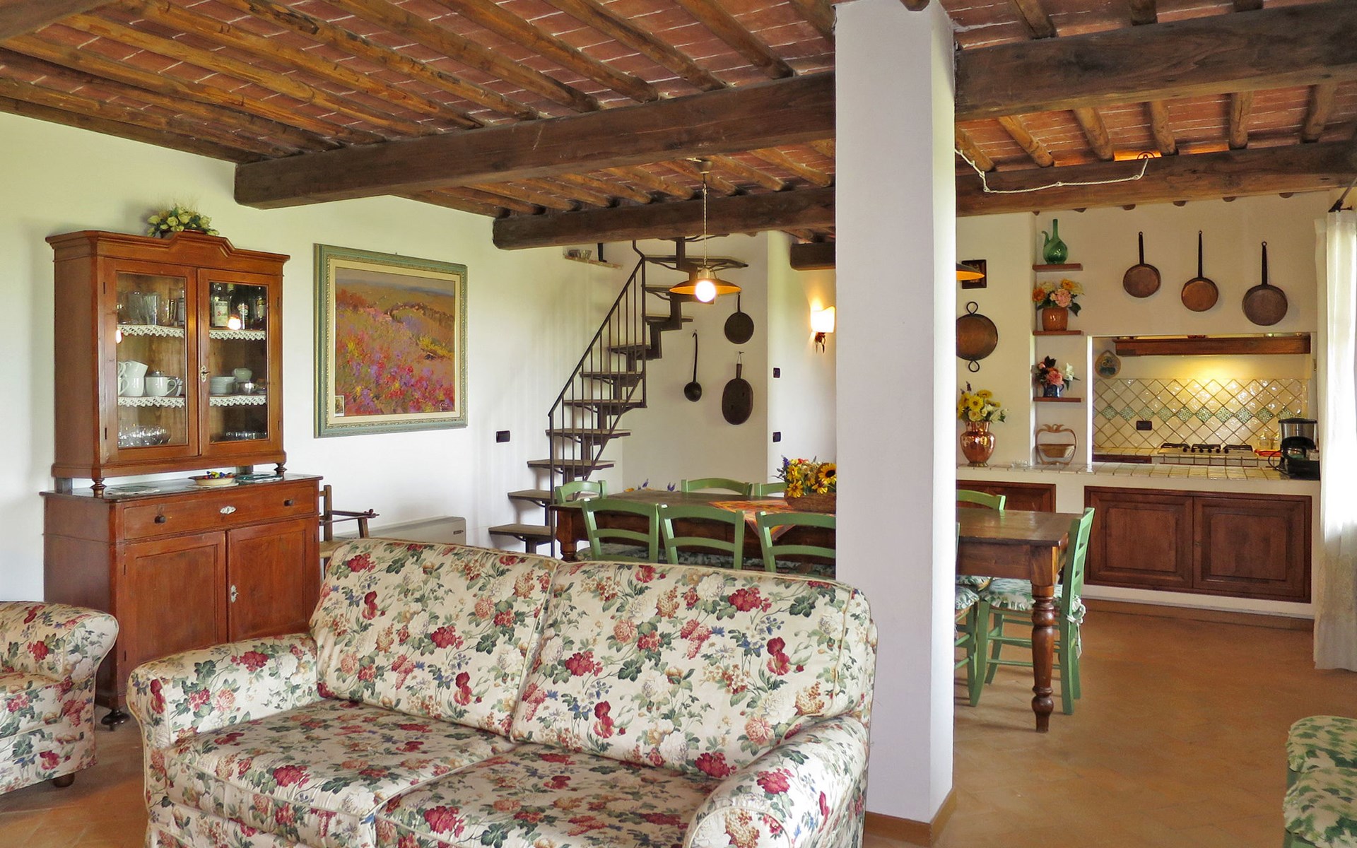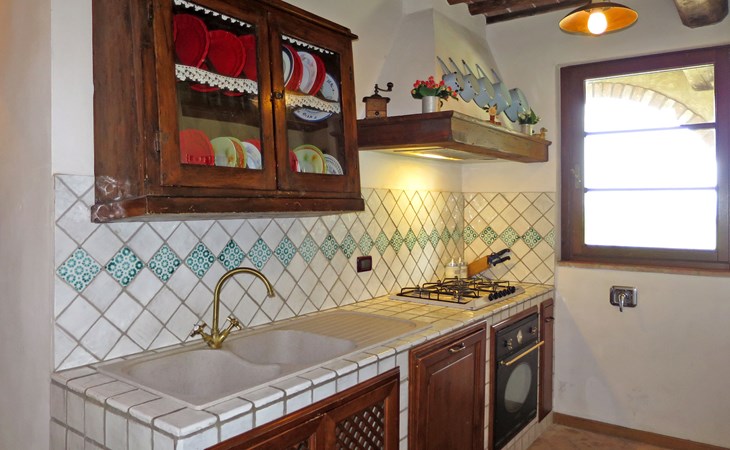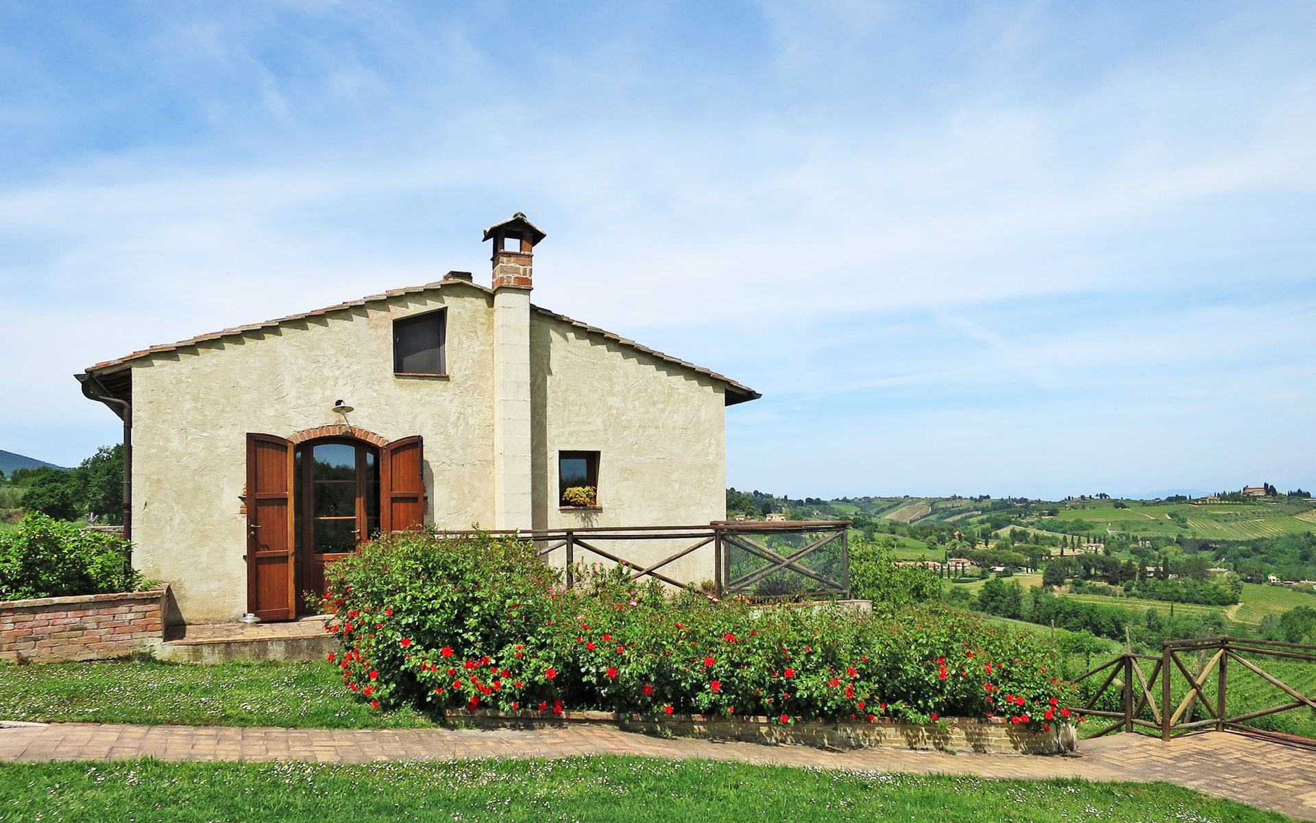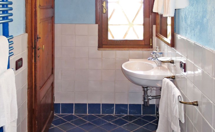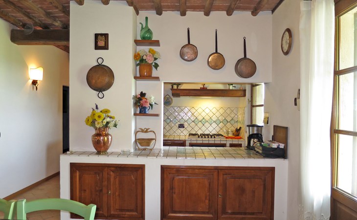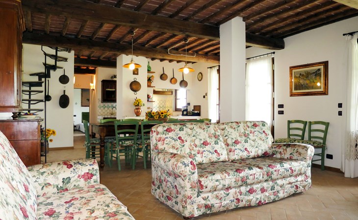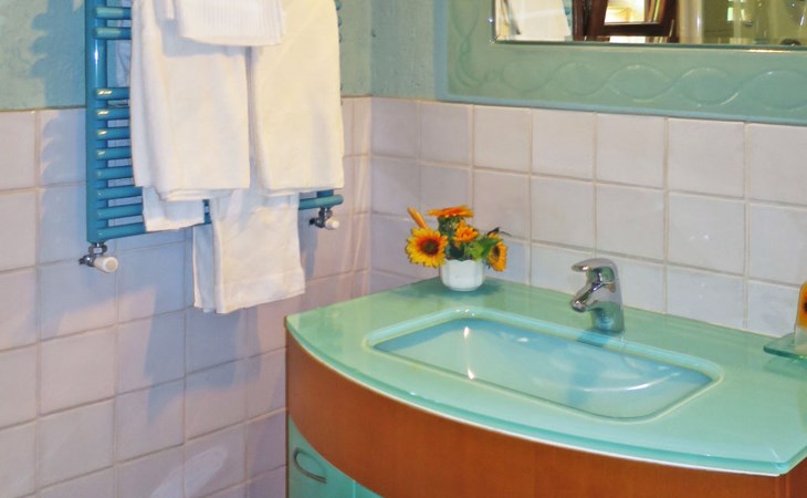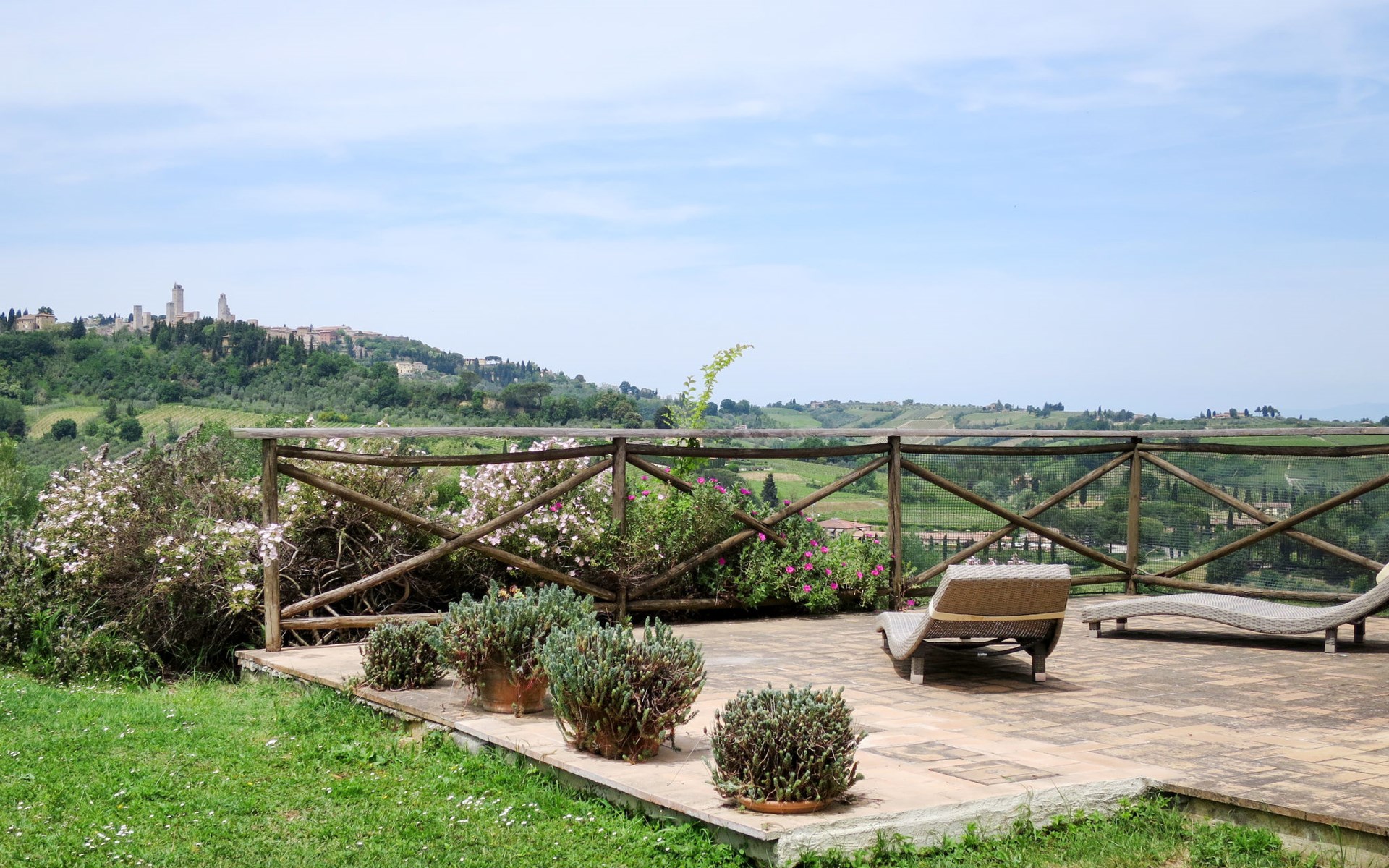 Very beautiful villa "Le Fonti di Santa Lucia", detached, surrounded by meadows and vineyards. In the district of Santa Lucia.(300 m) 2.5 km from the centre of San Gimignano, 10 km from the centre of Poggibonsi, outside the resort, 47 km from the centre of Siena. In a secluded, elevated position on a slope, 68 km from the sea, in the countryside. Private: garden 3'000 m2 (fenced) with flowers and trees, meadow, natural pond, swimming pool (14 x 6 m, depth 140 - 190 cm, seasonal availability: 25.Apr. - 10.Oct.). Outdoor shower, terrace, pool maintenance by the owner/gardener. Linen change weekly. 300 m long steep motor access (via unmade road). Roofed, parking (for 4 cars) at the house. Shop 2.5 km, supermarket 2.5 km, bus stop 2.5 km, railway station "Poggibonsi" 10 km, sandy beach "Cecina Mare" 68 km, indoor swimming pool 10 km.