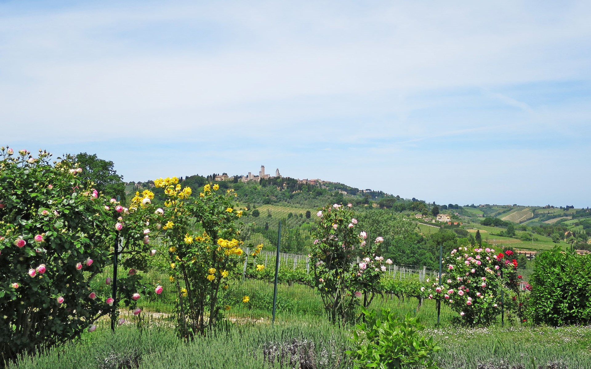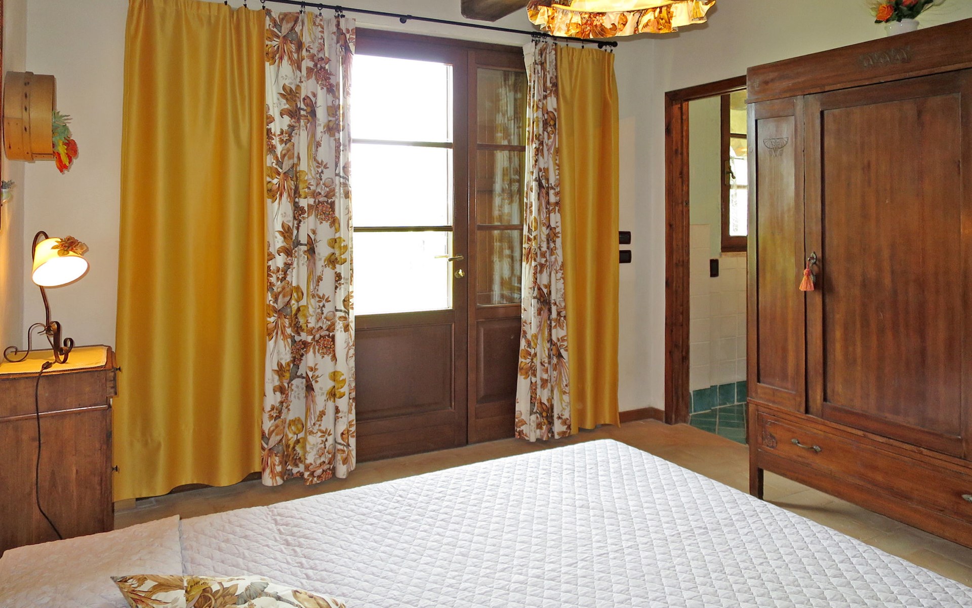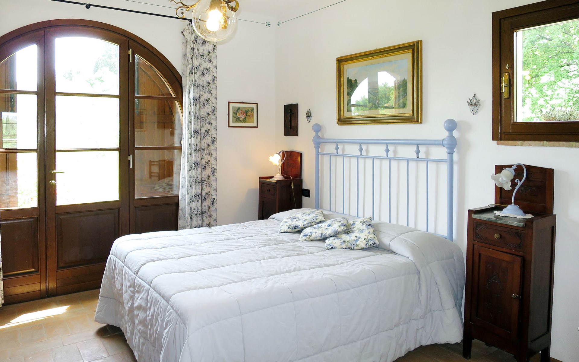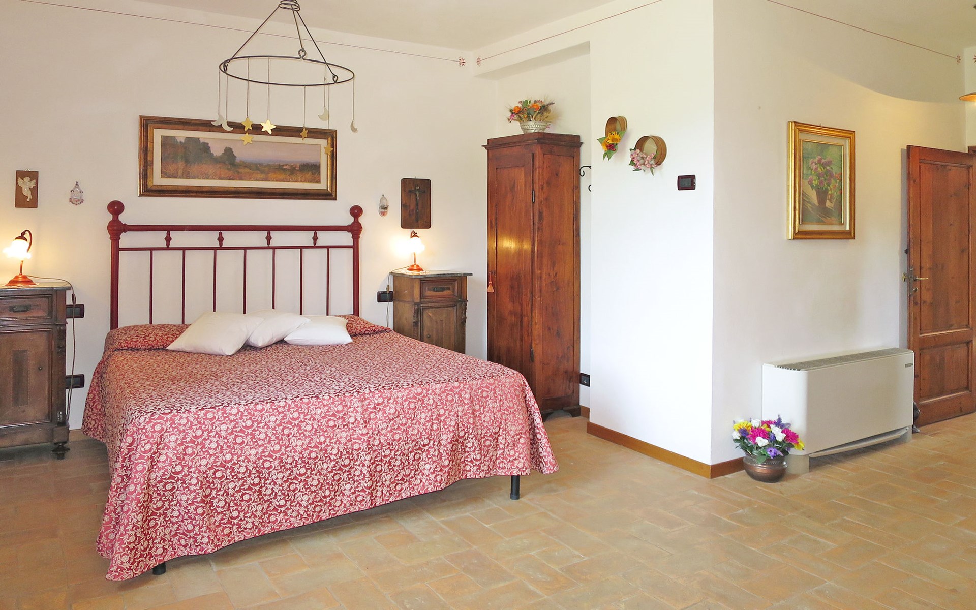 Very beautiful villa "Le Fonti di Santa Lucia", detached, surrounded by meadows and vineyards. In the district of Santa Lucia.(300 m) 2.5 km from the centre of San Gimignano, 10 km from the centre of Poggibonsi, outside the resort, 47 km from the centre of Siena. In a secluded, elevated position on a slope, 68 km from the sea, in the countryside. Private: garden 3'000 m2 (fenced) with flowers and trees, meadow, natural pond, swimming pool (14 x 6 m, depth 140 - 190 cm, seasonal availability: 25.Apr. - 10.Oct.). Outdoor shower, terrace, pool maintenance by the owner/gardener. Linen change weekly. 300 m long steep motor access (via unmade road). Roofed, parking (for 4 cars) at the house. Shop 2.5 km, supermarket 2.5 km, bus stop 2.5 km, railway station "Poggibonsi" 10 km, sandy beach "Cecina Mare" 68 km, indoor swimming pool 10 km.