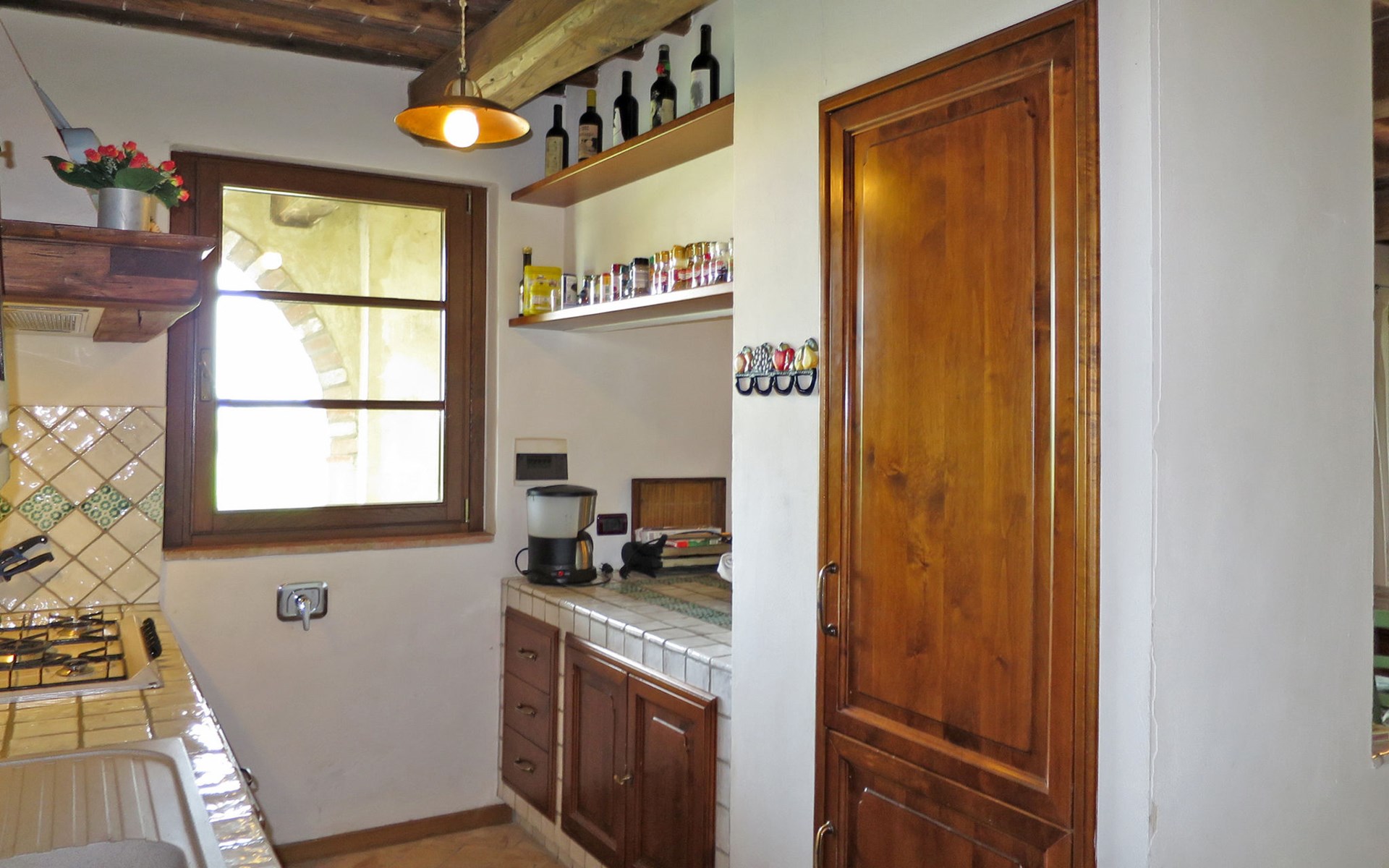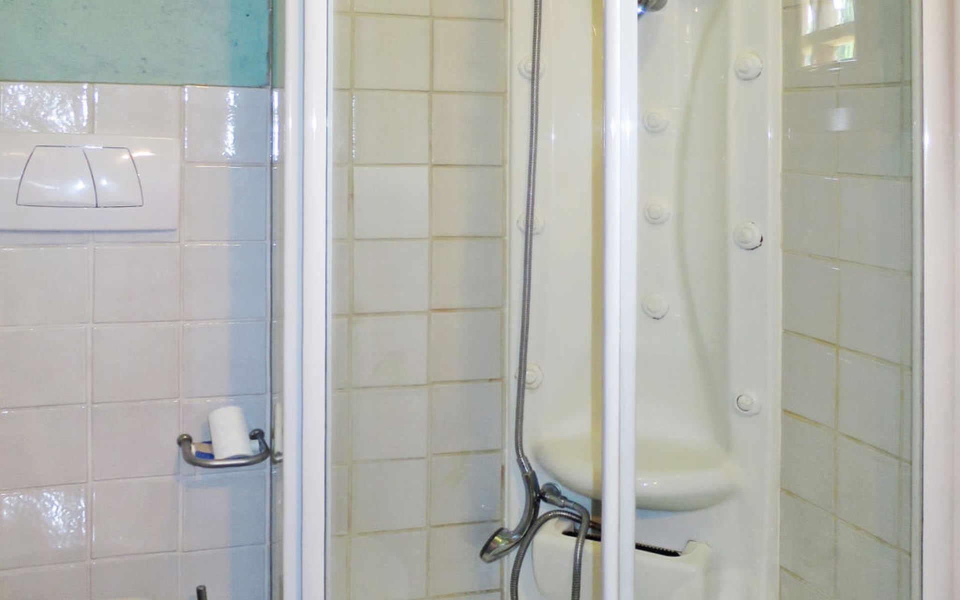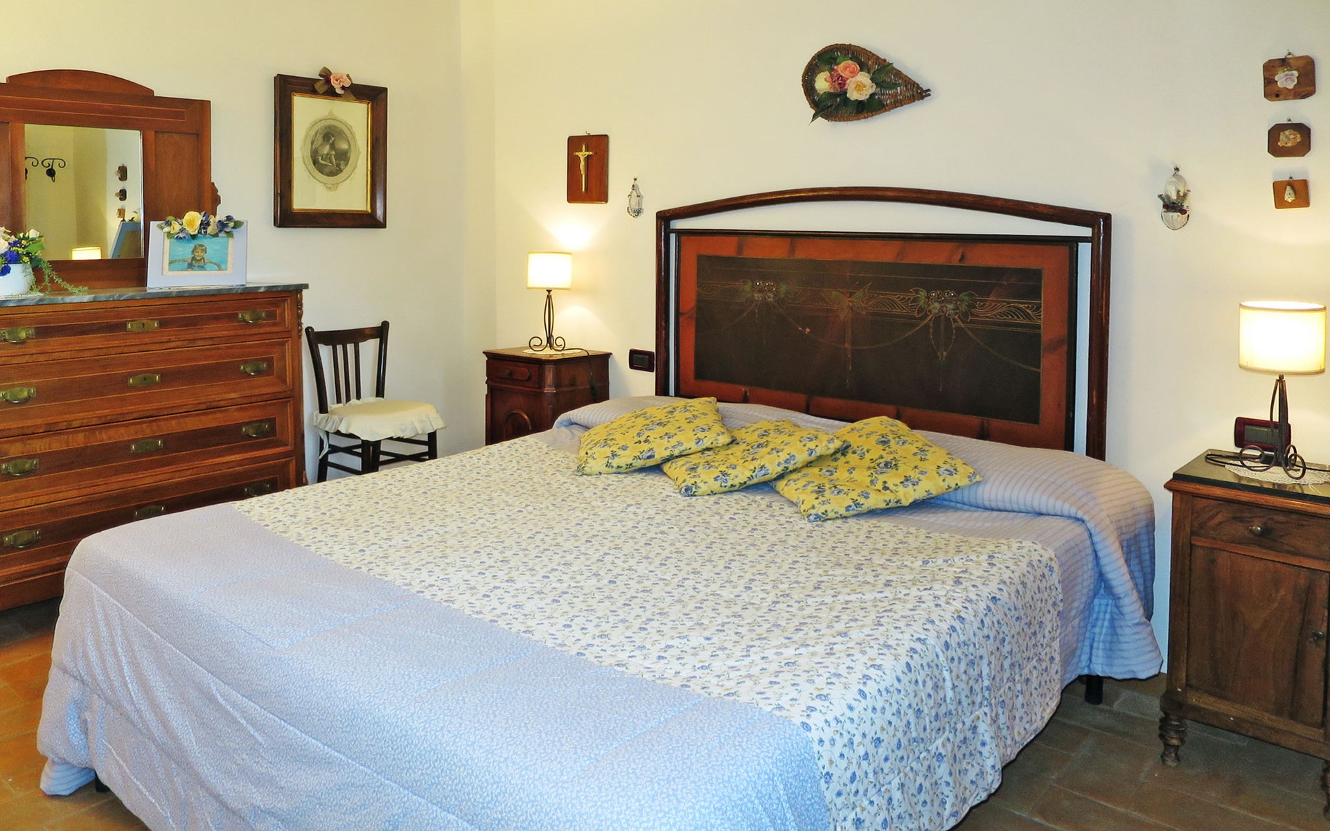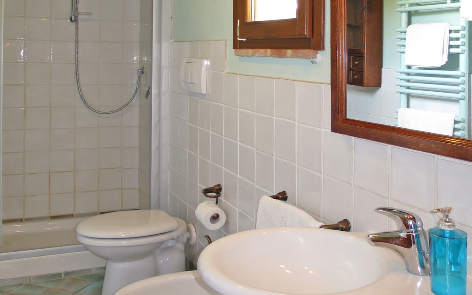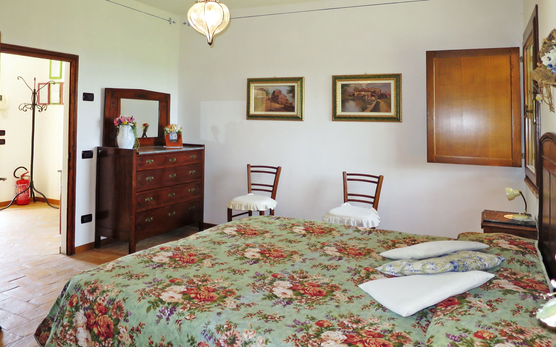Very beautiful villa "Le Fonti di Santa Lucia", detached, surrounded by meadows and vineyards. In the district of Santa Lucia.(300 m) 2.5 km from the centre of San Gimignano, 10 km from the centre of Poggibonsi, outside the resort, 47 km from the centre of Siena. In a secluded, elevated position on a slope, 68 km from the sea, in the countryside. Private: garden 3'000 m2 (fenced) with flowers and trees, meadow, natural pond, swimming pool (14 x 6 m, depth 140 - 190 cm, seasonal availability: 25.Apr. - 10.Oct.). Outdoor shower, terrace, pool maintenance by the owner/gardener. Linen change weekly. 300 m long steep motor access (via unmade road). Roofed, parking (for 4 cars) at the house. Shop 2.5 km, supermarket 2.5 km, bus stop 2.5 km, railway station "Poggibonsi" 10 km, sandy beach "Cecina Mare" 68 km, indoor swimming pool 10 km.