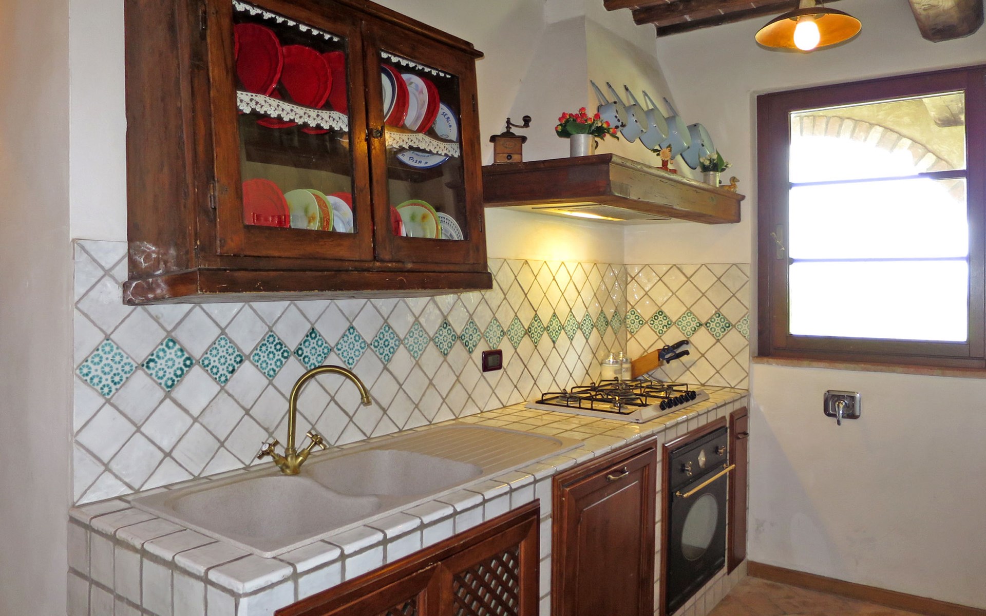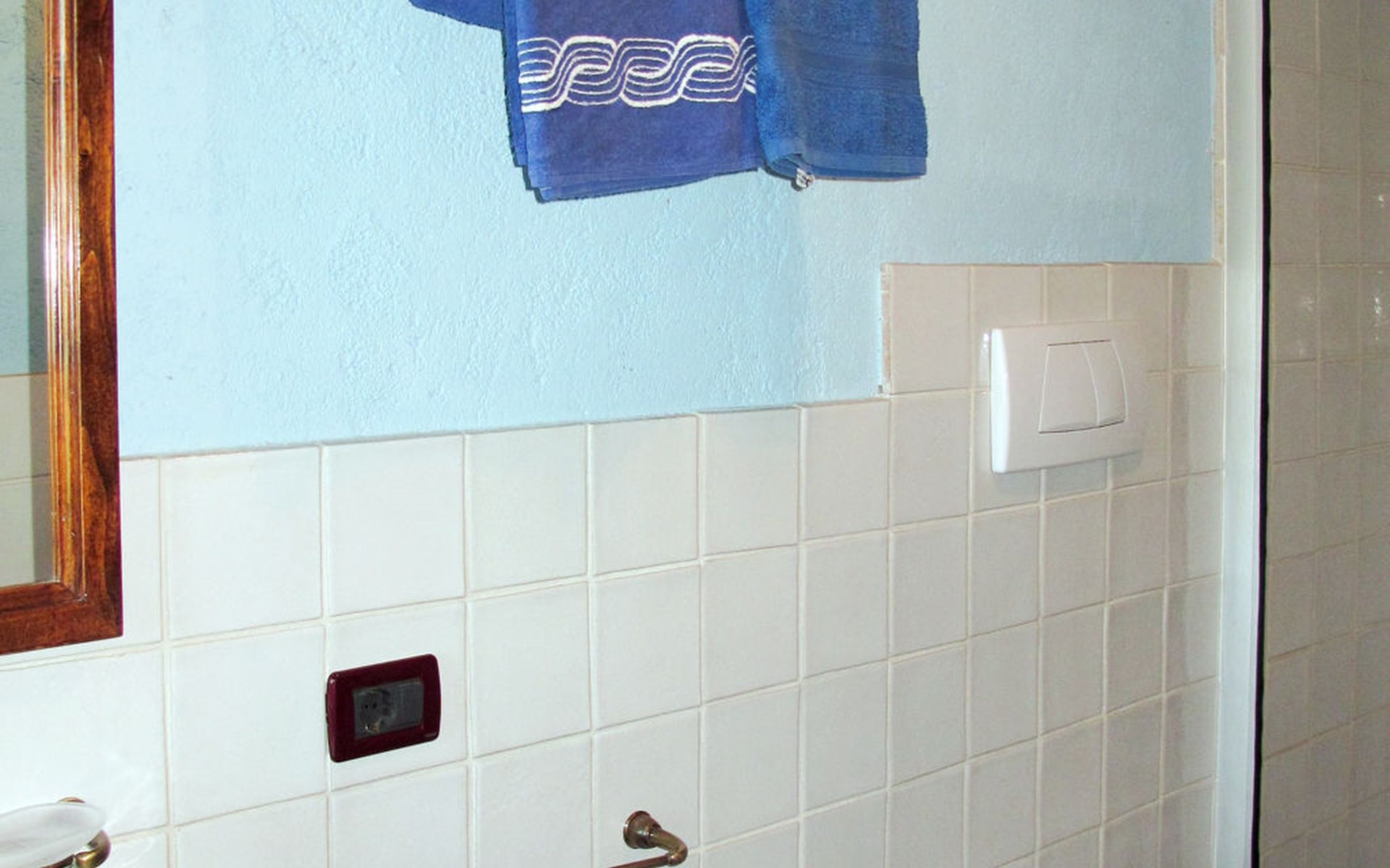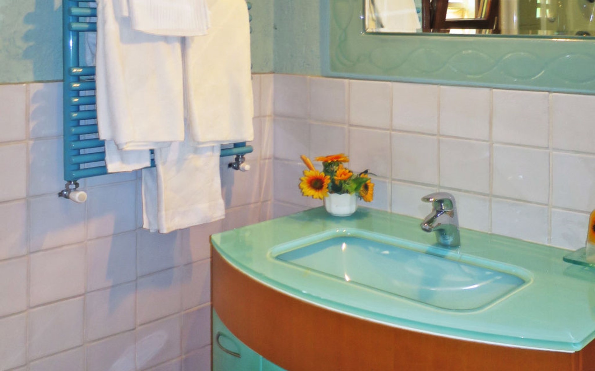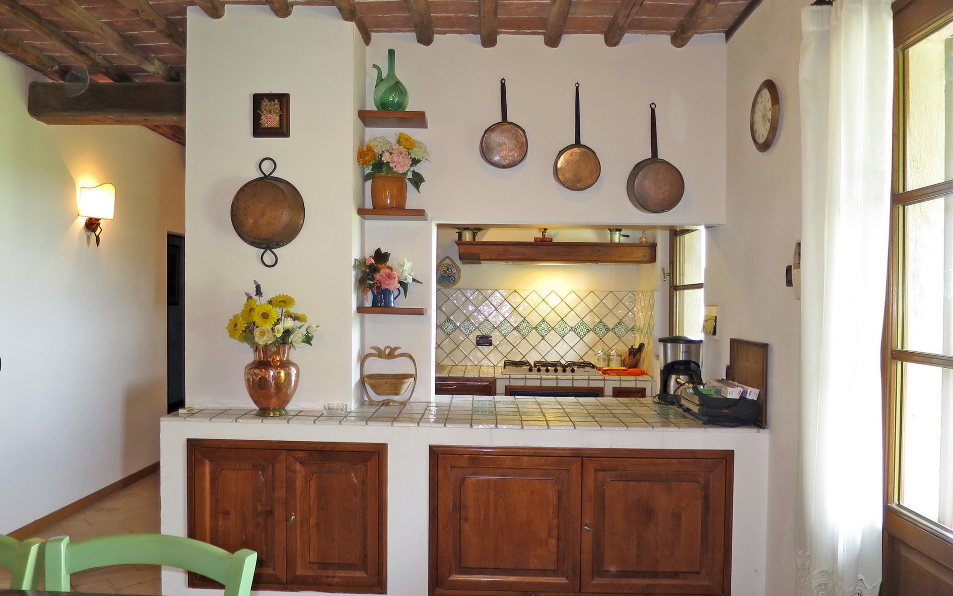 Very beautiful villa "Le Fonti di Santa Lucia", detached, surrounded by meadows and vineyards. In the district of Santa Lucia.(300 m) 2.5 km from the centre of San Gimignano, 10 km from the centre of Poggibonsi, outside the resort, 47 km from the centre of Siena. In a secluded, elevated position on a slope, 68 km from the sea, in the countryside. Private: garden 3'000 m2 (fenced) with flowers and trees, meadow, natural pond, swimming pool (14 x 6 m, depth 140 - 190 cm, seasonal availability: 25.Apr. - 10.Oct.). Outdoor shower, terrace, pool maintenance by the owner/gardener. Linen change weekly. 300 m long steep motor access (via unmade road). Roofed, parking (for 4 cars) at the house. Shop 2.5 km, supermarket 2.5 km, bus stop 2.5 km, railway station "Poggibonsi" 10 km, sandy beach "Cecina Mare" 68 km, indoor swimming pool 10 km.