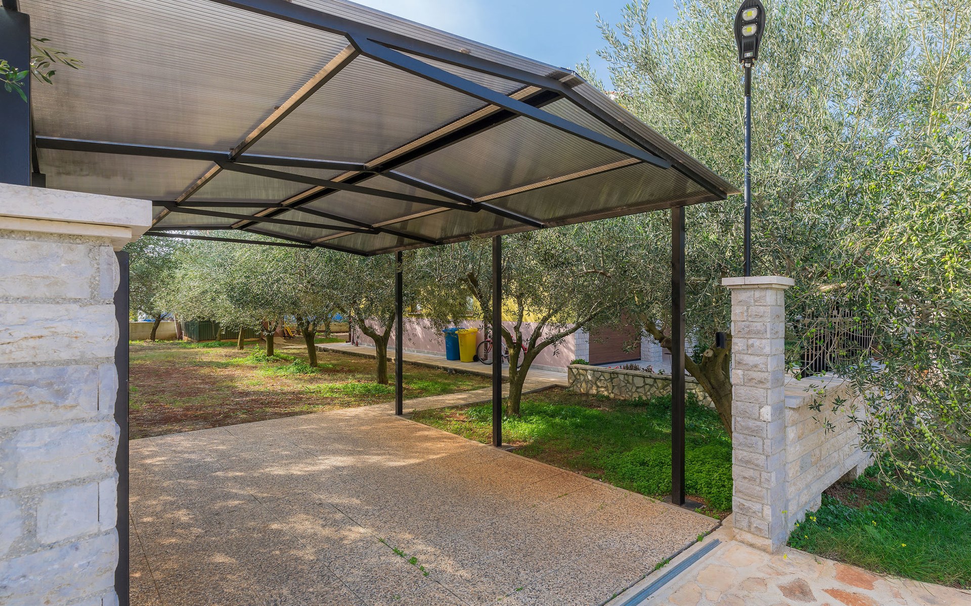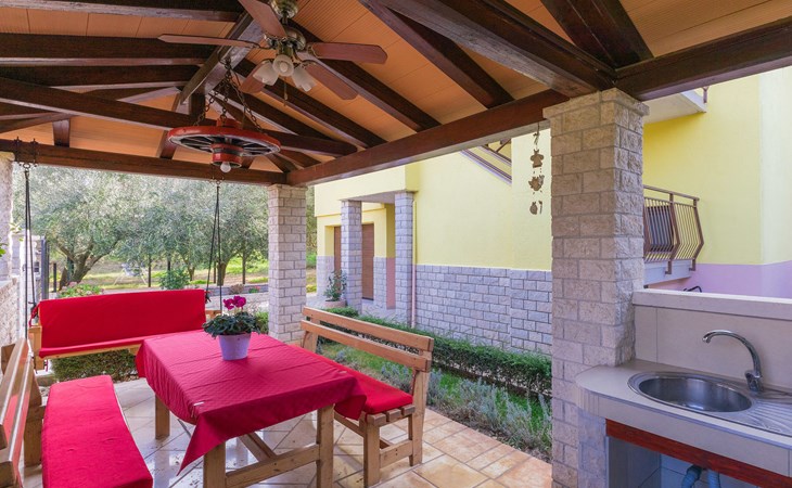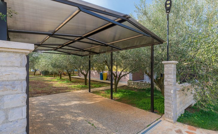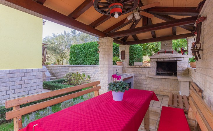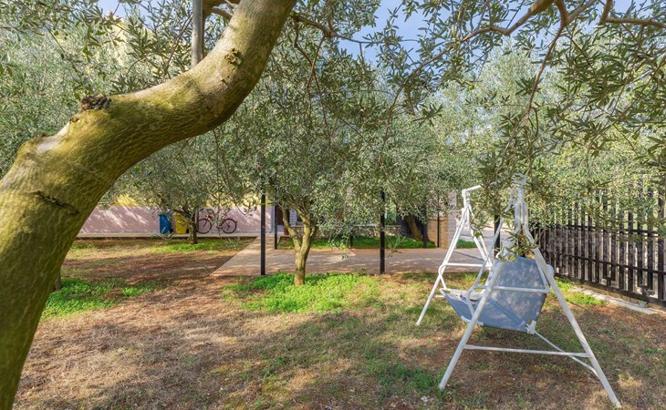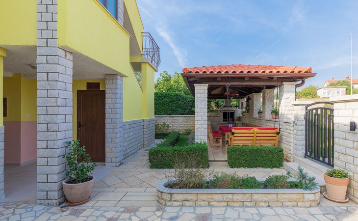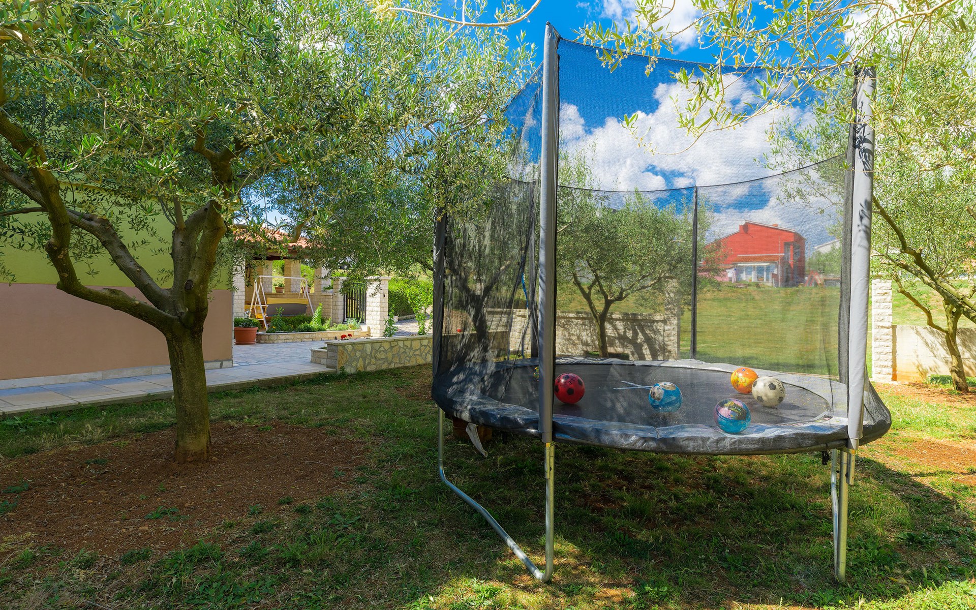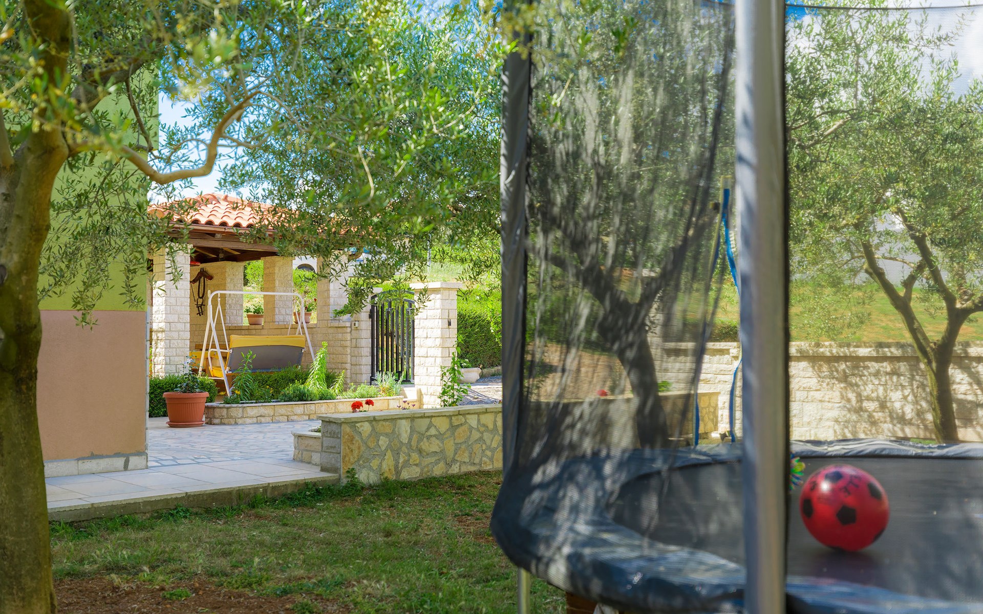 Galižana 5 km from Pula: Beautiful 2-family house "Meden". 500 m from the centre of Galižana, 5 km from the sea. For shared use: property 1'000 m2 (fenced), beautiful garden with lawn and plants. Terrace (20 m2), garden furniture, barbecue. In the house: internet access, trampoline. Parking at the house on the premises. Shop 400 m, supermarket 3 km, restaurant 3 km, bus stop 400 m, pebble beach 5 km, rocky beach 5 km.