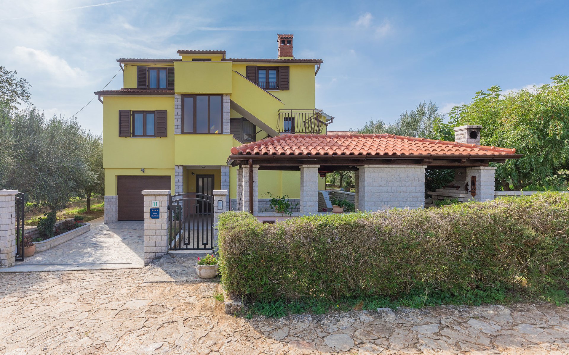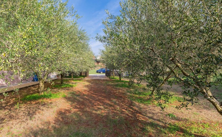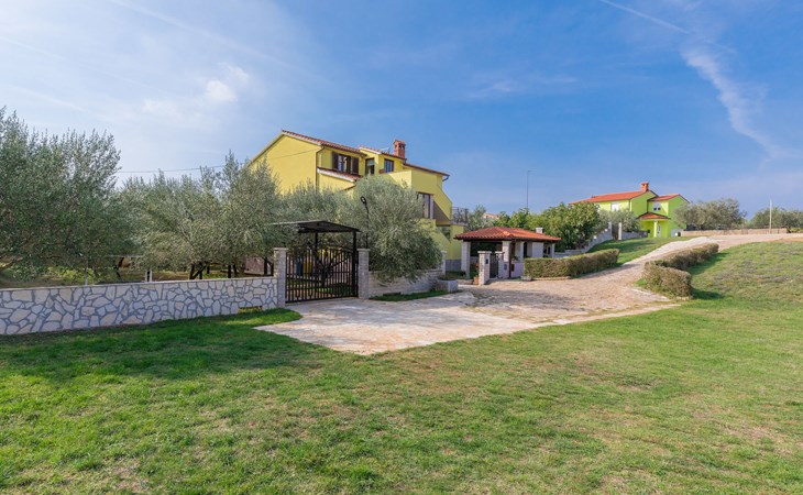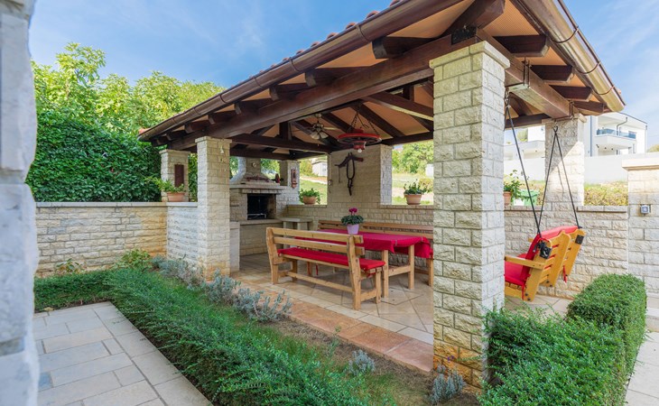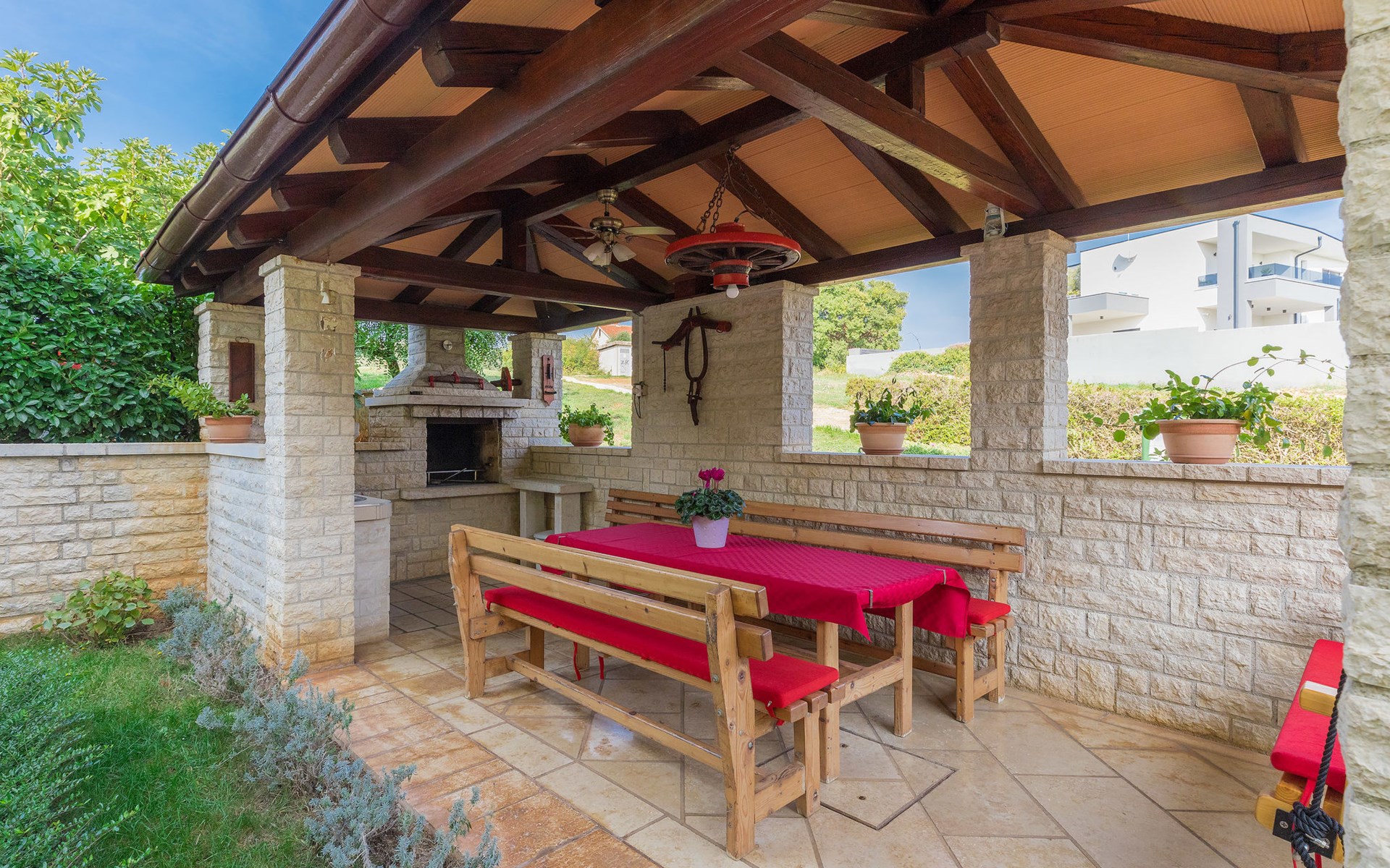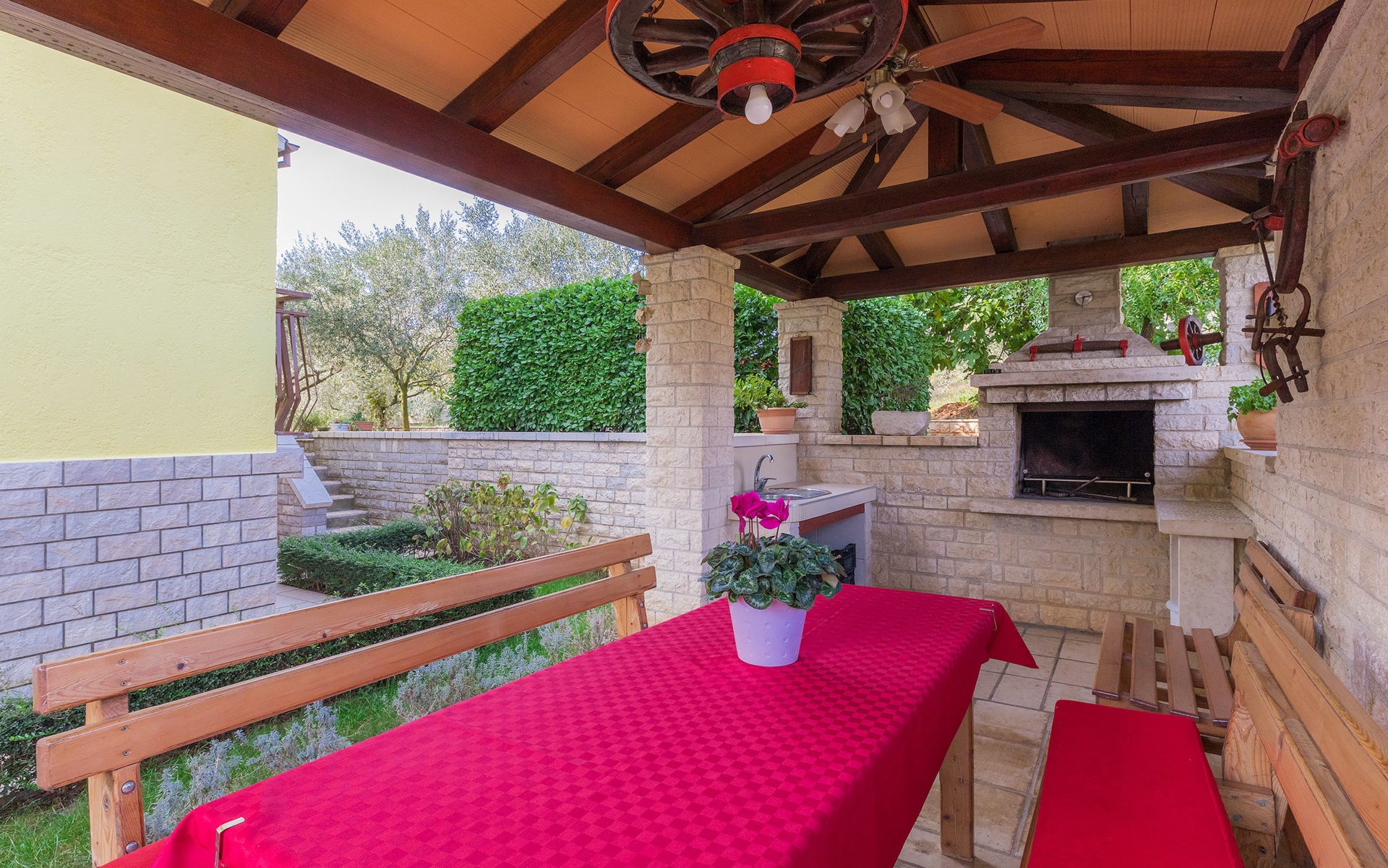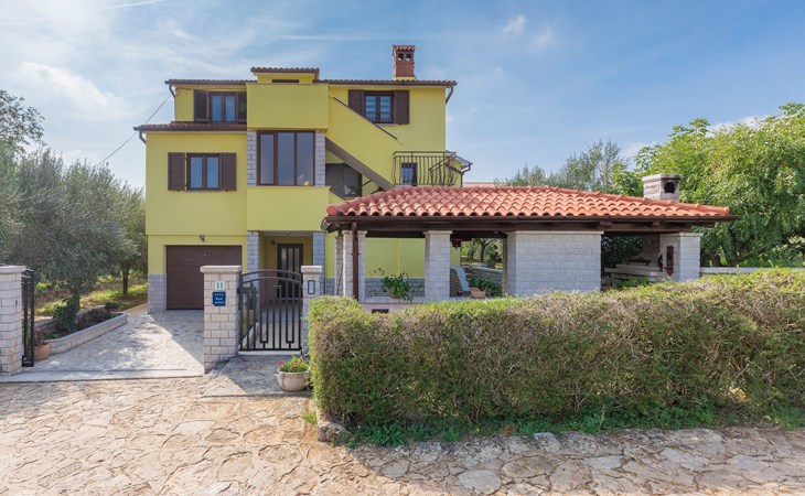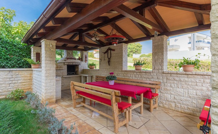 Galižana 5 km from Pula: Beautiful 2-family house "Meden". 500 m from the centre of Galižana, 5 km from the sea. For shared use: property 1'000 m2 (fenced), beautiful garden with lawn and plants. Terrace (20 m2), garden furniture, barbecue. In the house: internet access, trampoline. Parking at the house on the premises. Shop 400 m, supermarket 3 km, restaurant 3 km, bus stop 400 m, pebble beach 5 km, rocky beach 5 km.