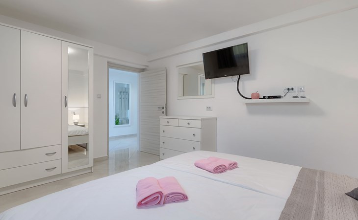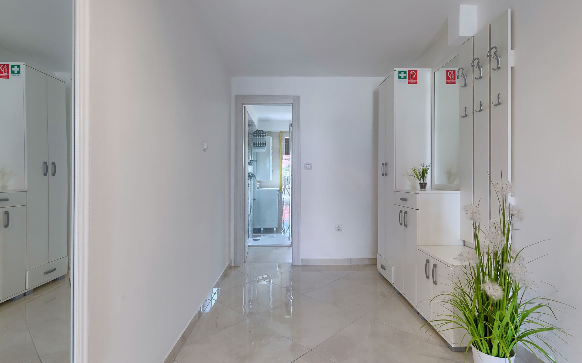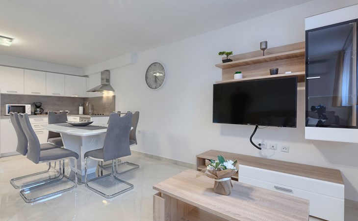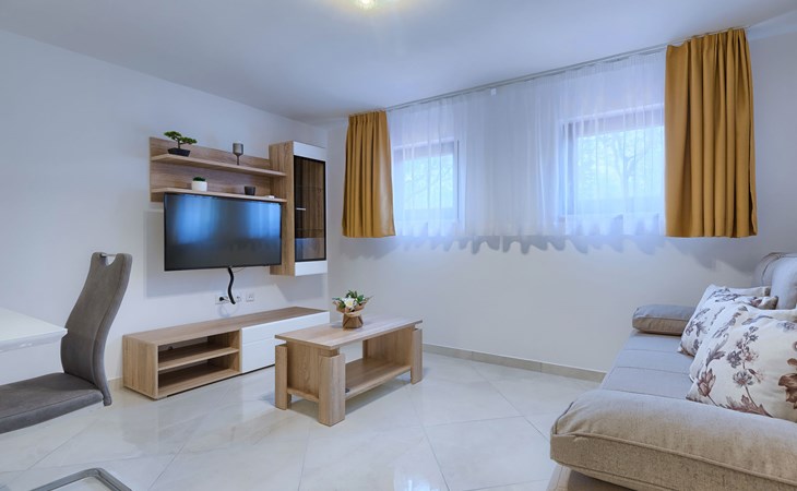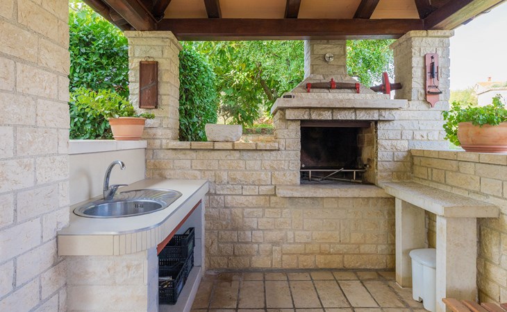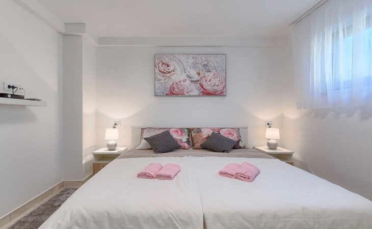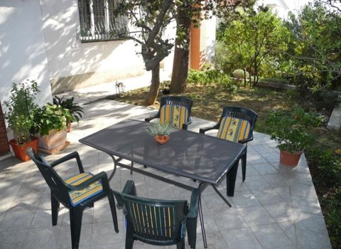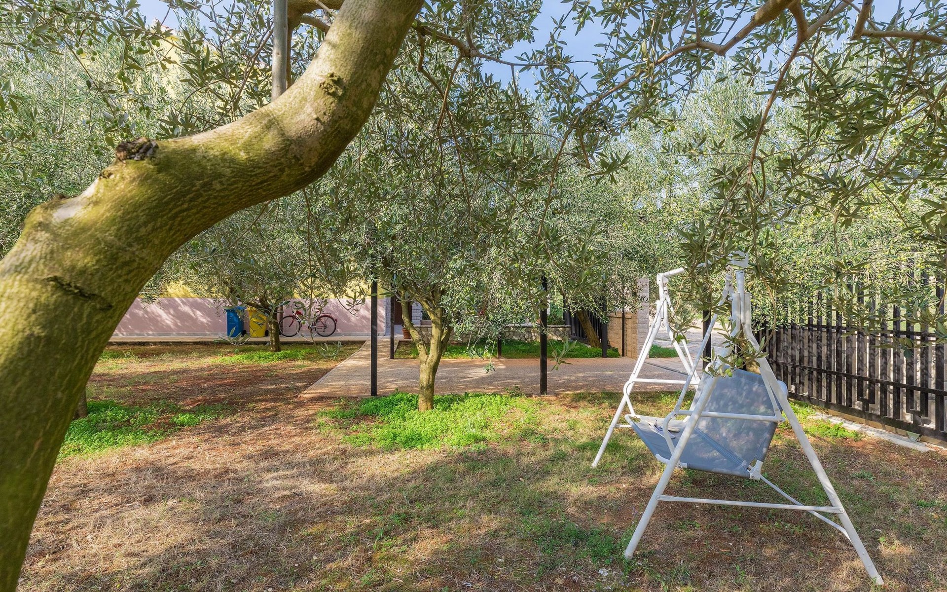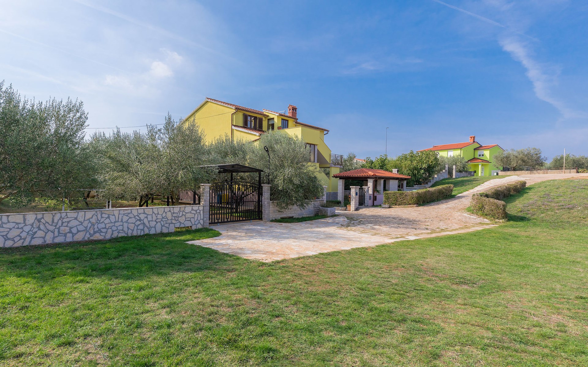Galižana 5 km from Pula: Beautiful 2-family house "Meden". 500 m from the centre of Galižana, 5 km from the sea. For shared use: property 1'000 m2 (fenced), beautiful garden with lawn and plants. Terrace (20 m2), garden furniture, barbecue. In the house: internet access, trampoline. Parking at the house on the premises. Shop 400 m, supermarket 3 km, restaurant 3 km, bus stop 400 m, pebble beach 5 km, rocky beach 5 km.