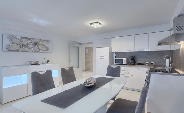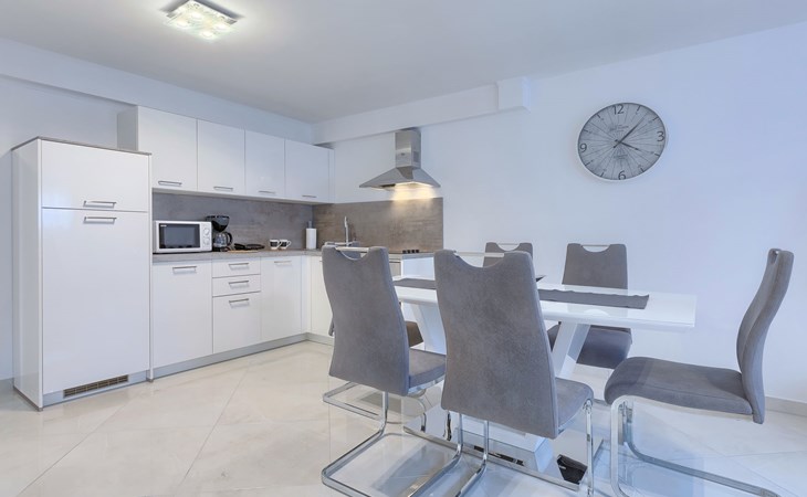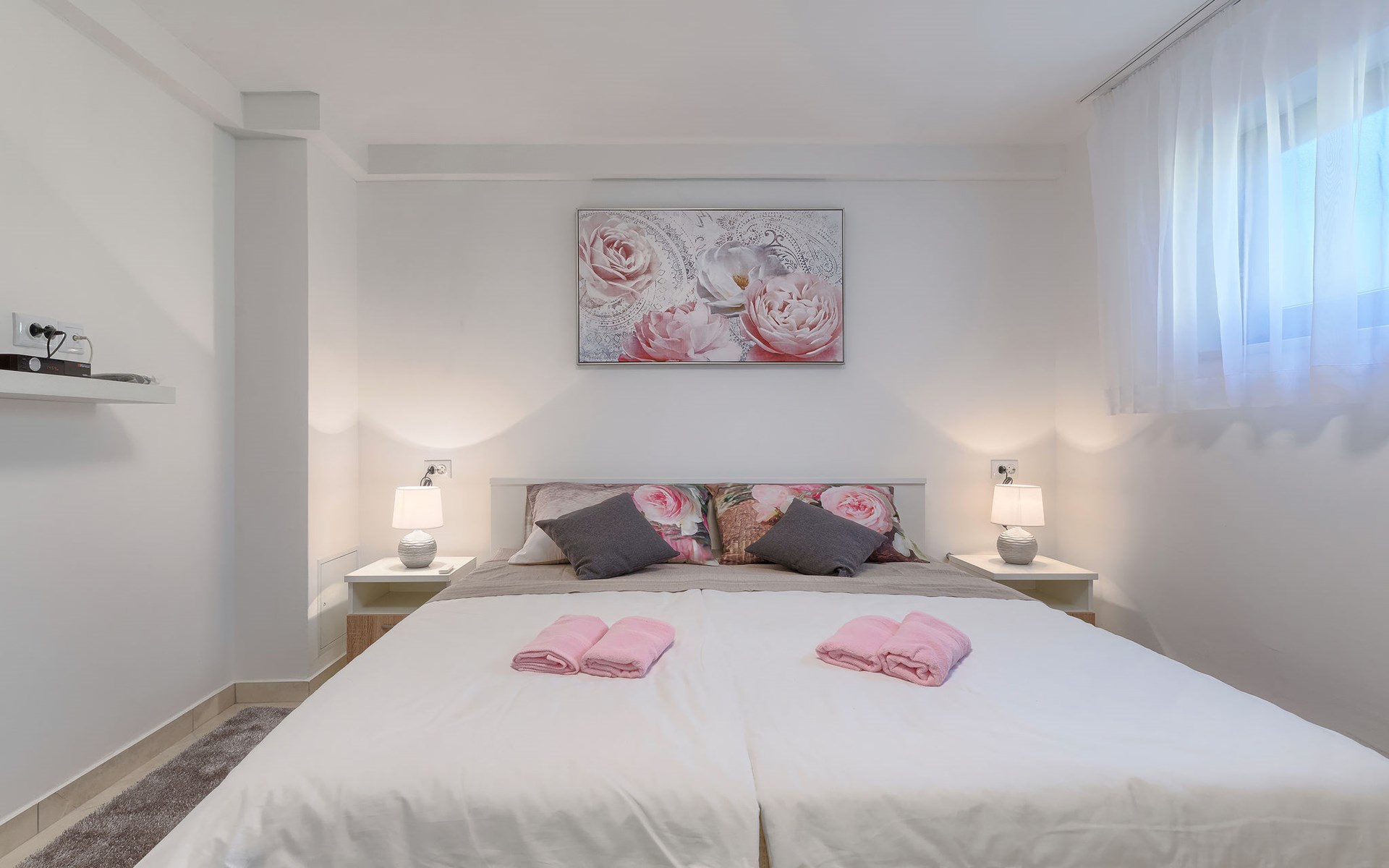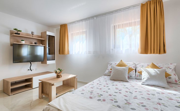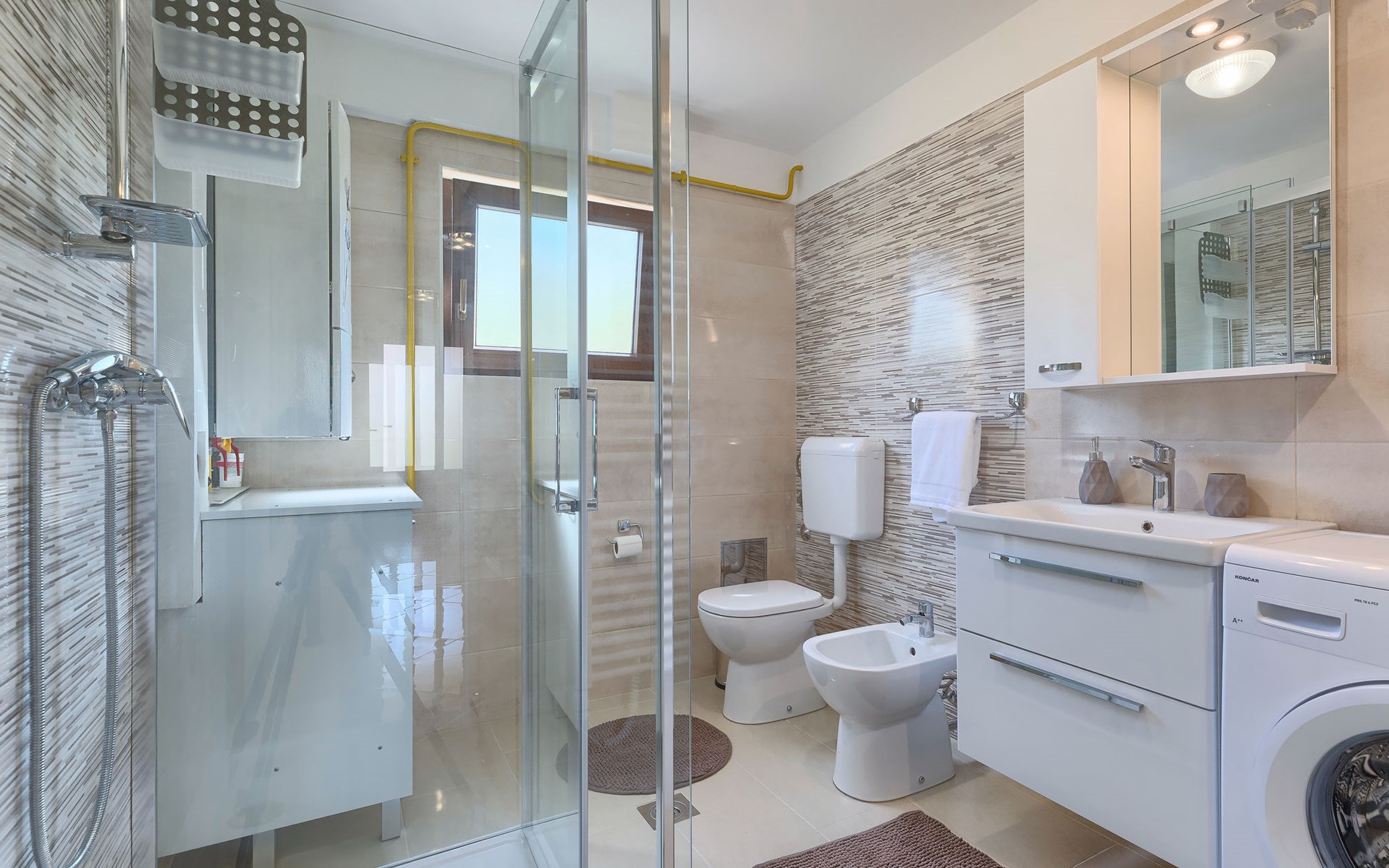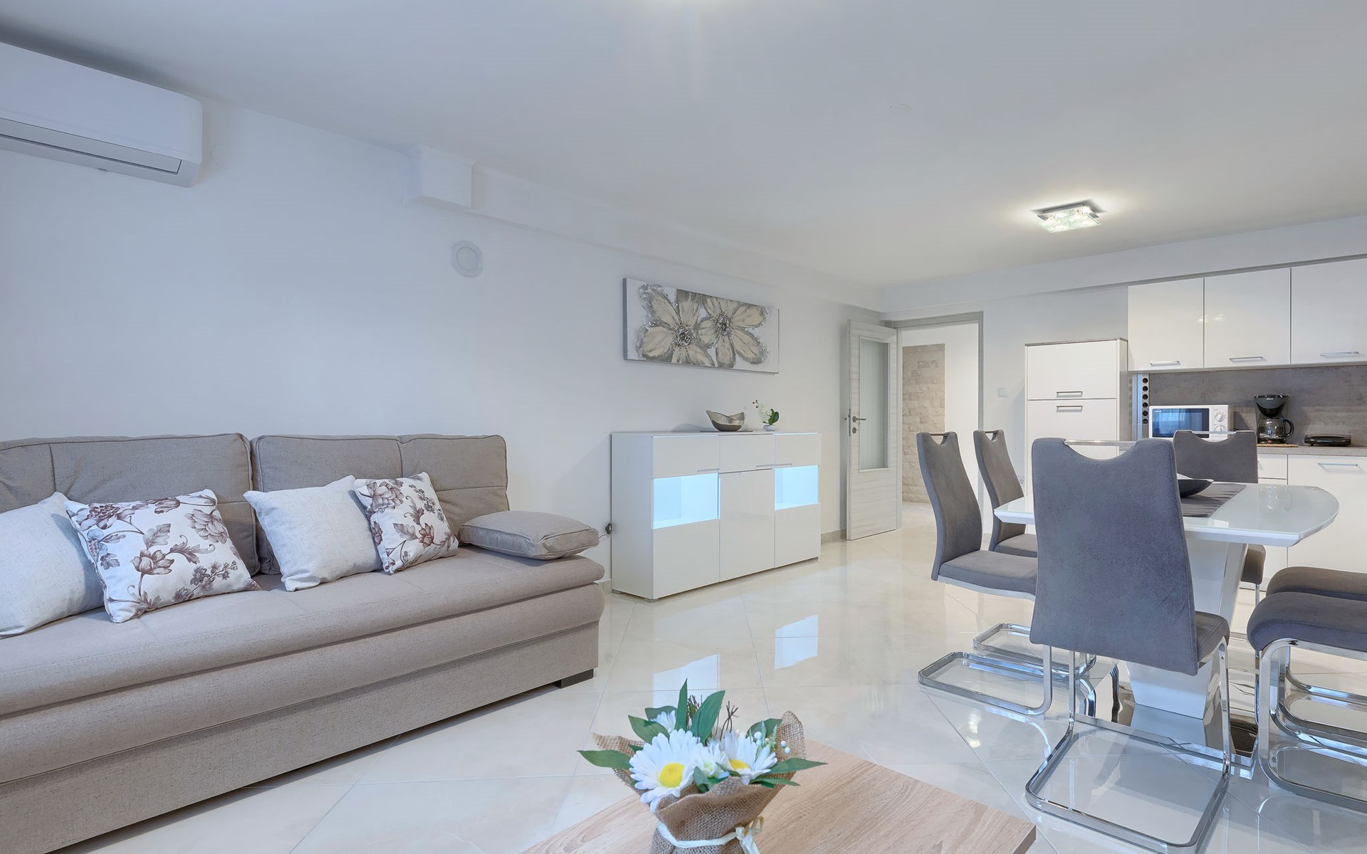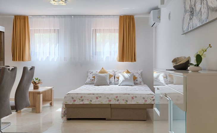 Galižana 5 km from Pula: Beautiful 2-family house "Meden". 500 m from the centre of Galižana, 5 km from the sea. For shared use: property 1'000 m2 (fenced), beautiful garden with lawn and plants. Terrace (20 m2), garden furniture, barbecue. In the house: internet access, trampoline. Parking at the house on the premises. Shop 400 m, supermarket 3 km, restaurant 3 km, bus stop 400 m, pebble beach 5 km, rocky beach 5 km.