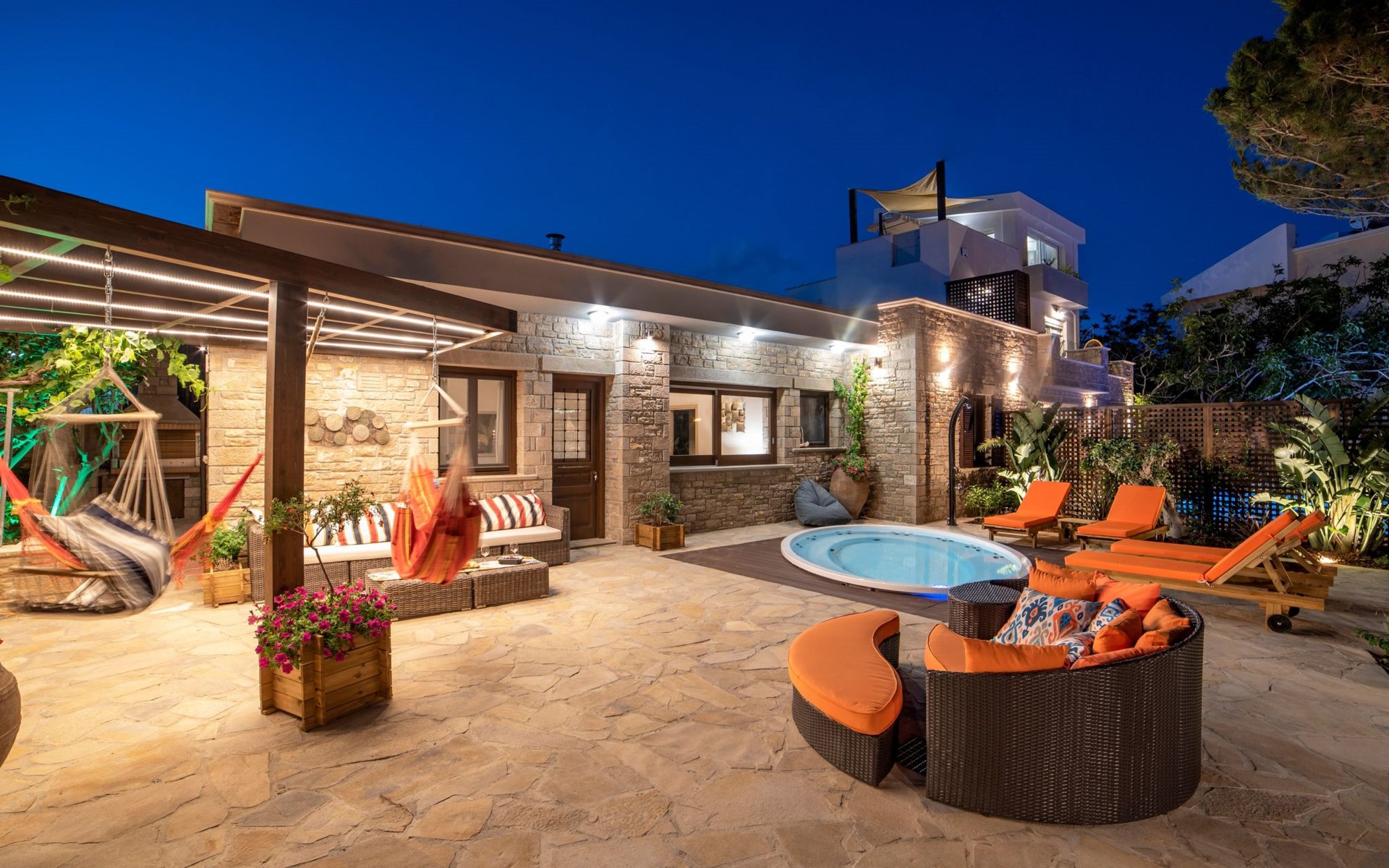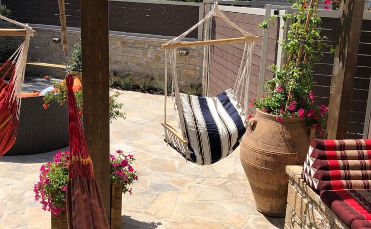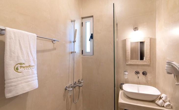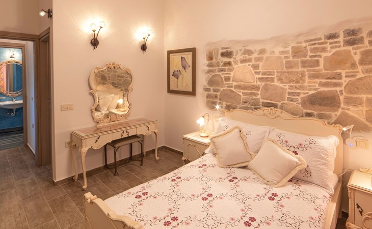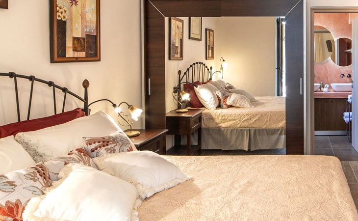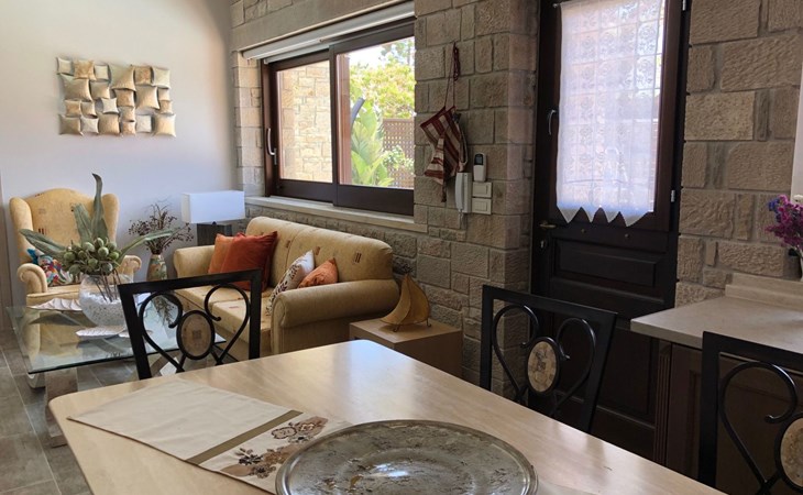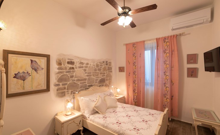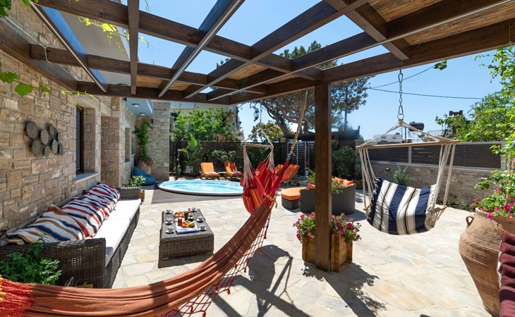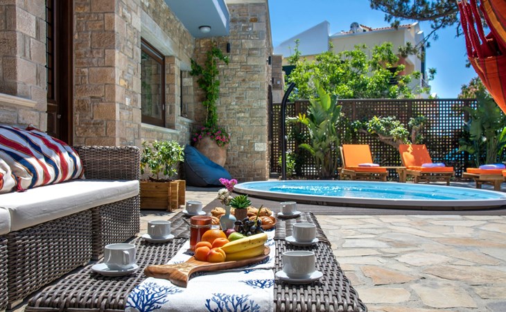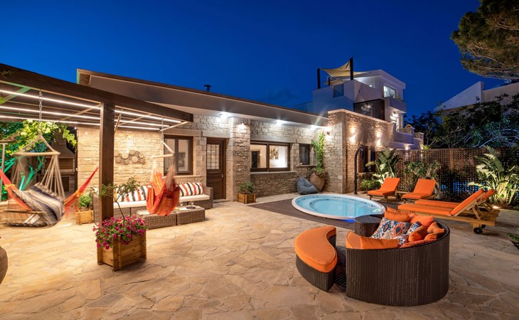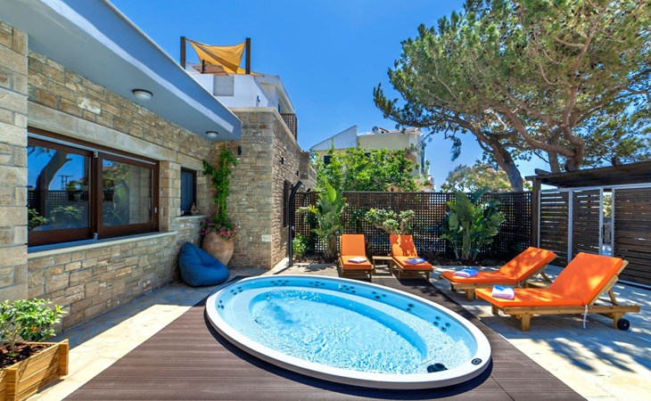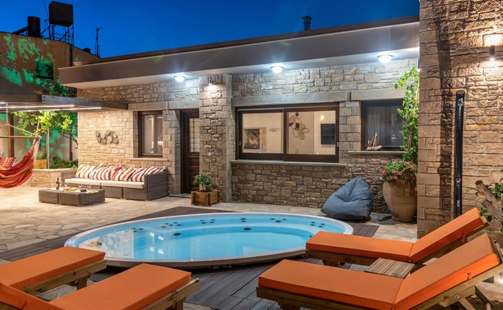 Built in 1935, Lemonia has been fully renovated to nicely blend contemporary and traditional accents. Inspired by the beauty of the Cretan land, natural elements and modernity blends in perfect harmony with a sense of unparalleled comfort. Lemonia (= Lemon tree) features 2 separate master suites with en-suite bathrooms, a comfy sitting area with fireplace, a stone dining table that fits 8, modern bathrooms with walk-in shower cabin and/or spa tub, and a large private patio with view to the garden and to the Zen huge outdoor spa tub. A third large bedroom with 3 single beds, one of which is for special needs. There is also a chair bed that can sleep a 4th child.