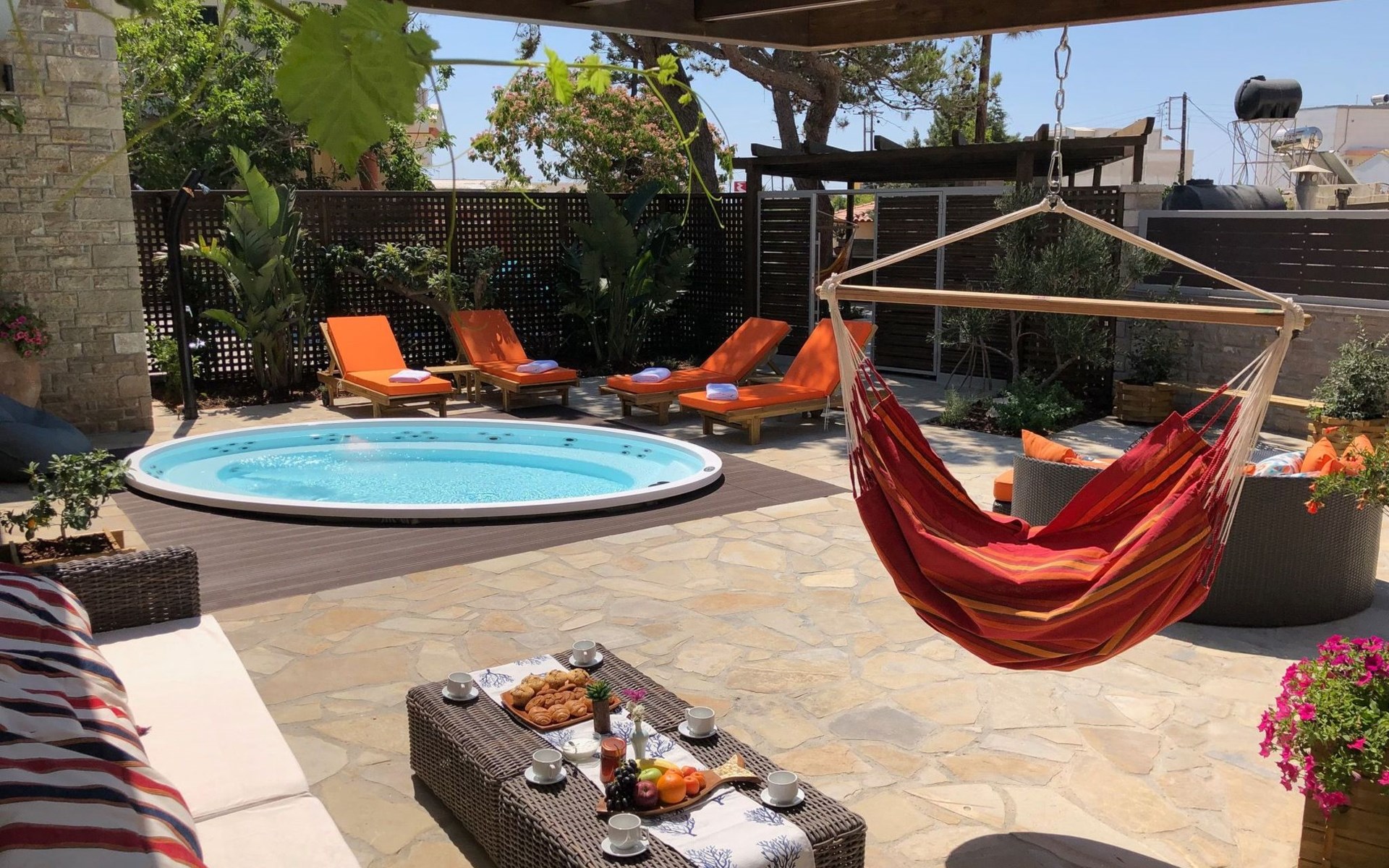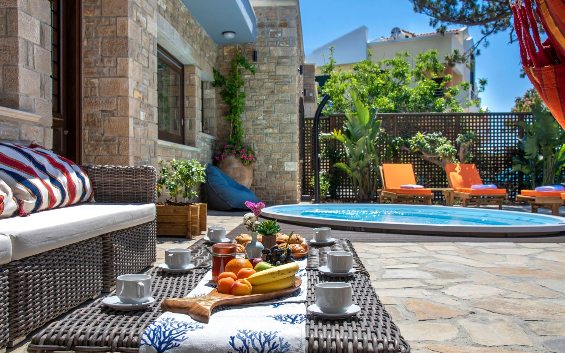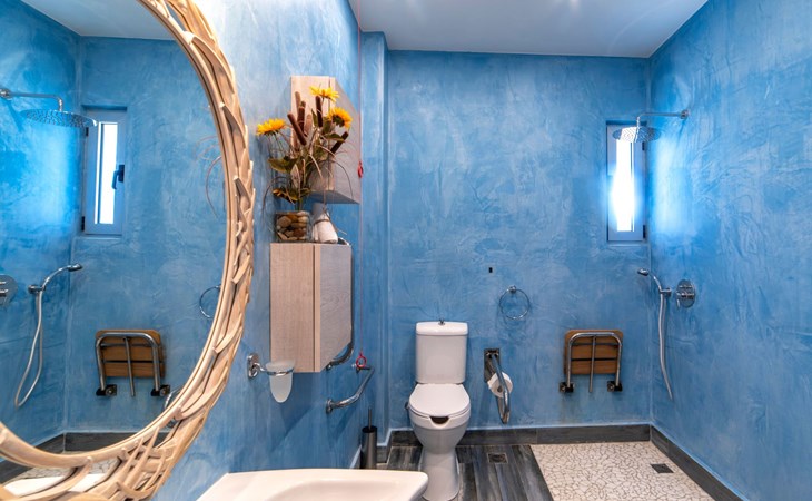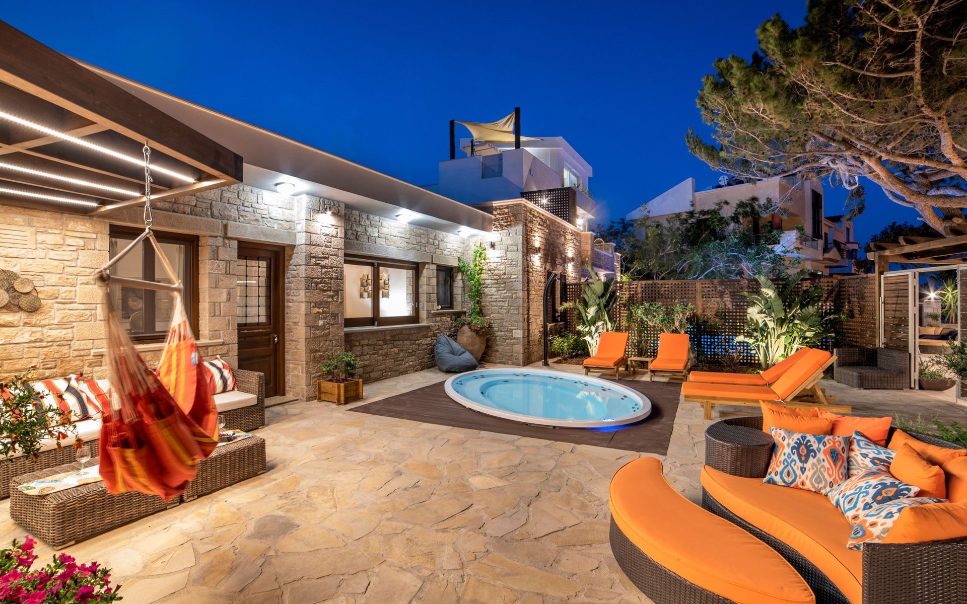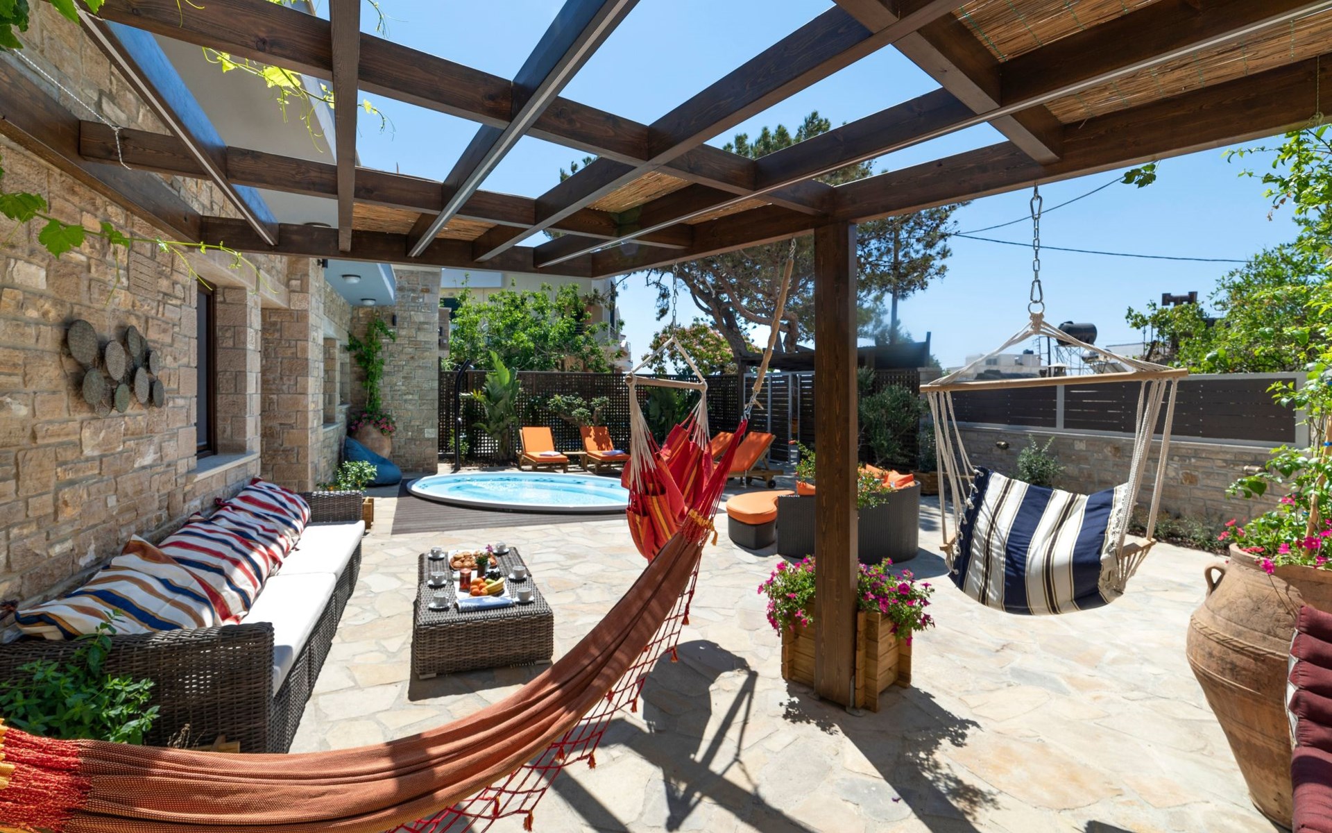 Built in 1935, Lemonia has been fully renovated to nicely blend contemporary and traditional accents. Inspired by the beauty of the Cretan land, natural elements and modernity blends in perfect harmony with a sense of unparalleled comfort. Lemonia (= Lemon tree) features 2 separate master suites with en-suite bathrooms, a comfy sitting area with fireplace, a stone dining table that fits 8, modern bathrooms with walk-in shower cabin and/or spa tub, and a large private patio with view to the garden and to the Zen huge outdoor spa tub. A third large bedroom with 3 single beds, one of which is for special needs. There is also a chair bed that can sleep a 4th child.
