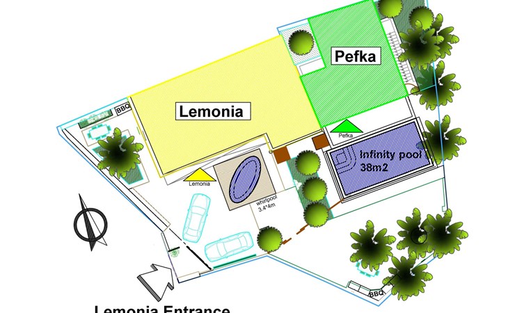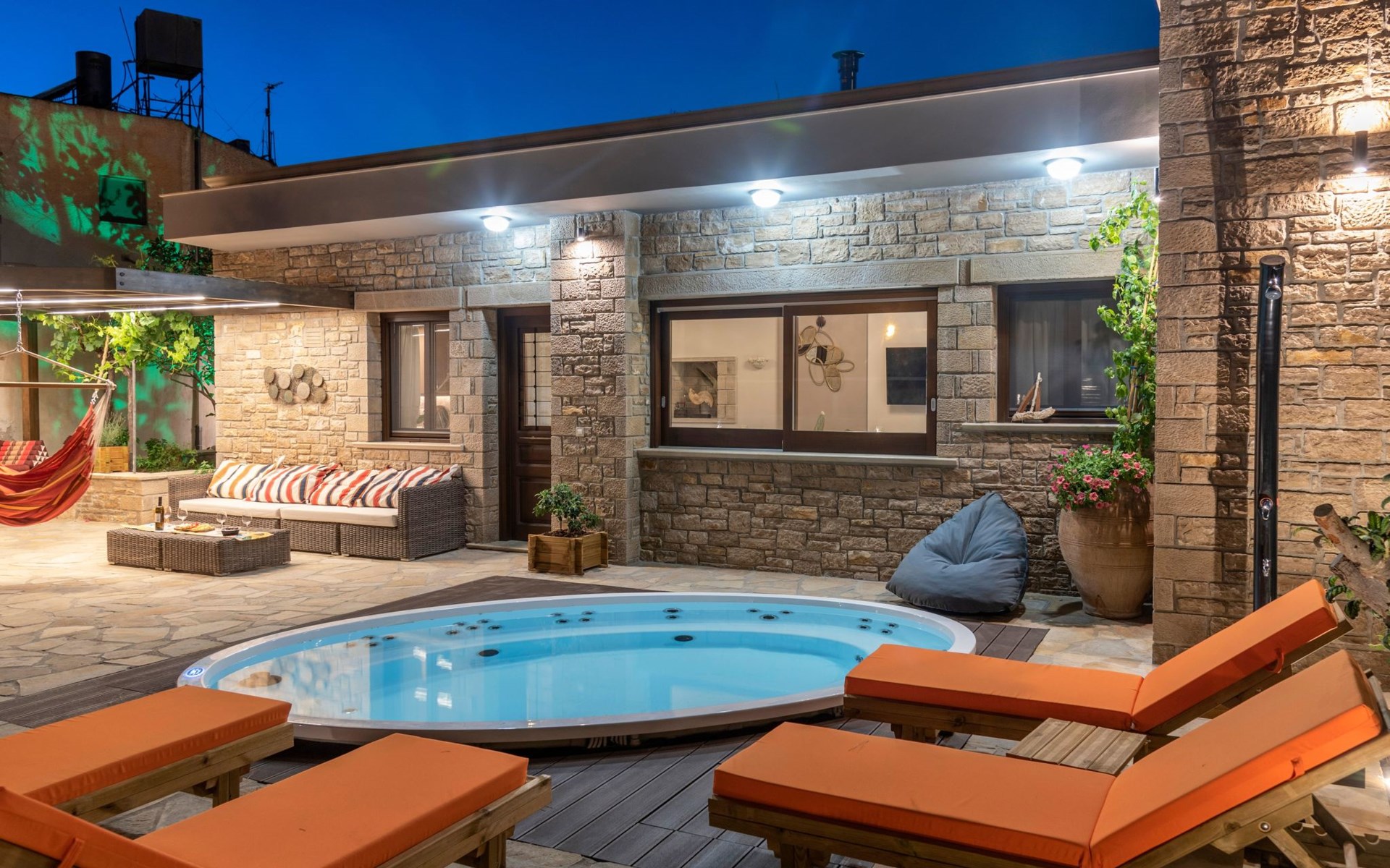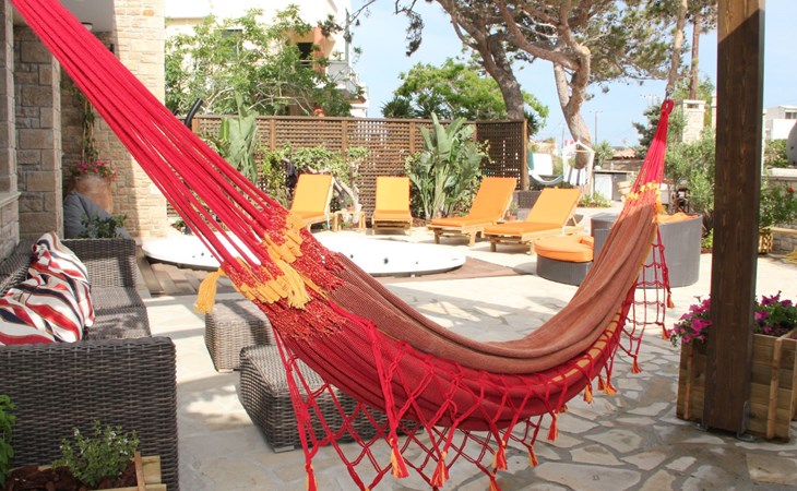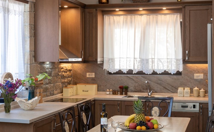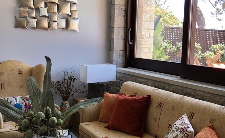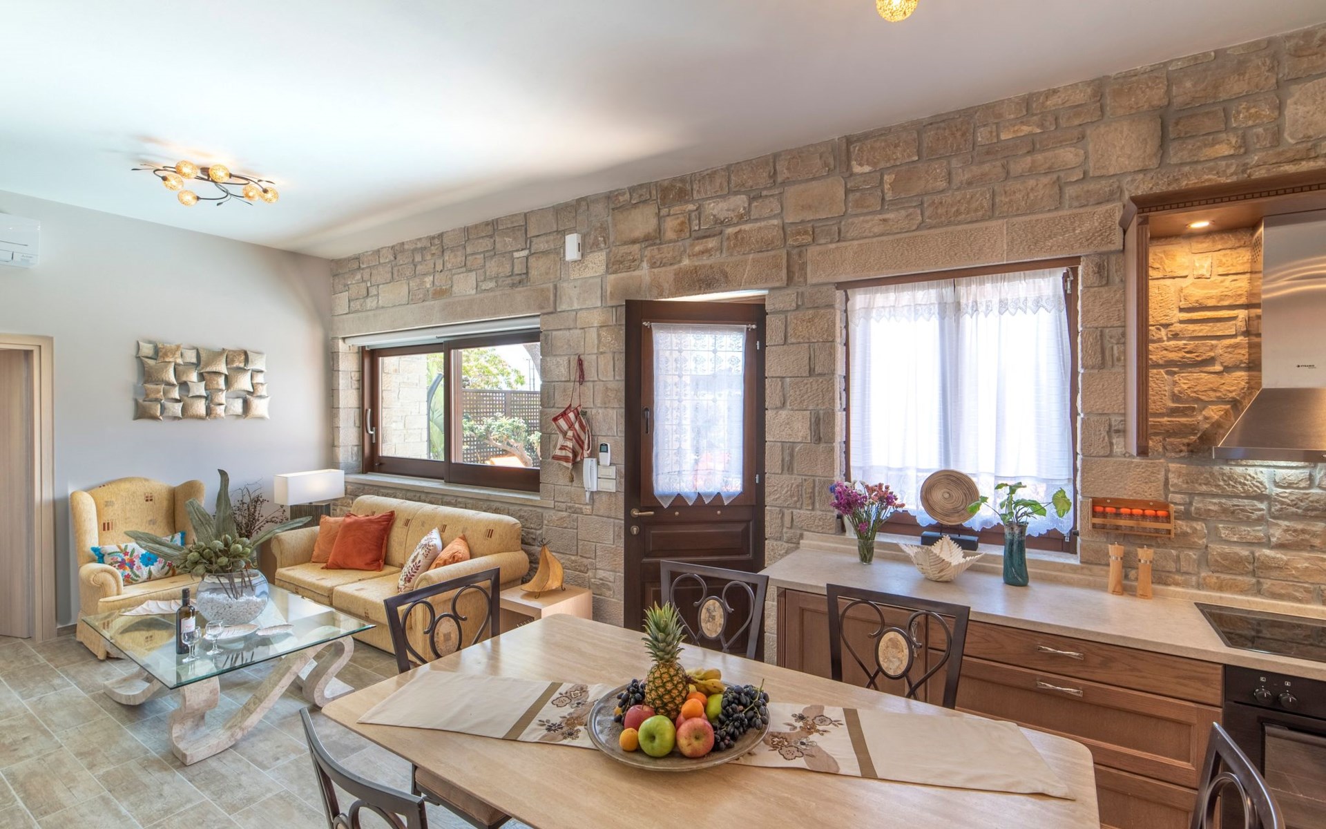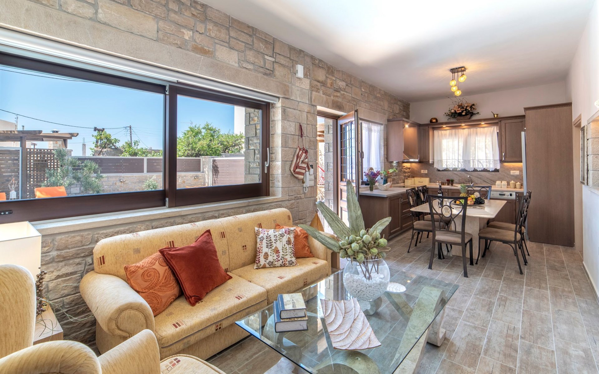 Built in 1935, Lemonia has been fully renovated to nicely blend contemporary and traditional accents. Inspired by the beauty of the Cretan land, natural elements and modernity blends in perfect harmony with a sense of unparalleled comfort. Lemonia (= Lemon tree) features 2 separate master suites with en-suite bathrooms, a comfy sitting area with fireplace, a stone dining table that fits 8, modern bathrooms with walk-in shower cabin and/or spa tub, and a large private patio with view to the garden and to the Zen huge outdoor spa tub. A third large bedroom with 3 single beds, one of which is for special needs. There is also a chair bed that can sleep a 4th child.