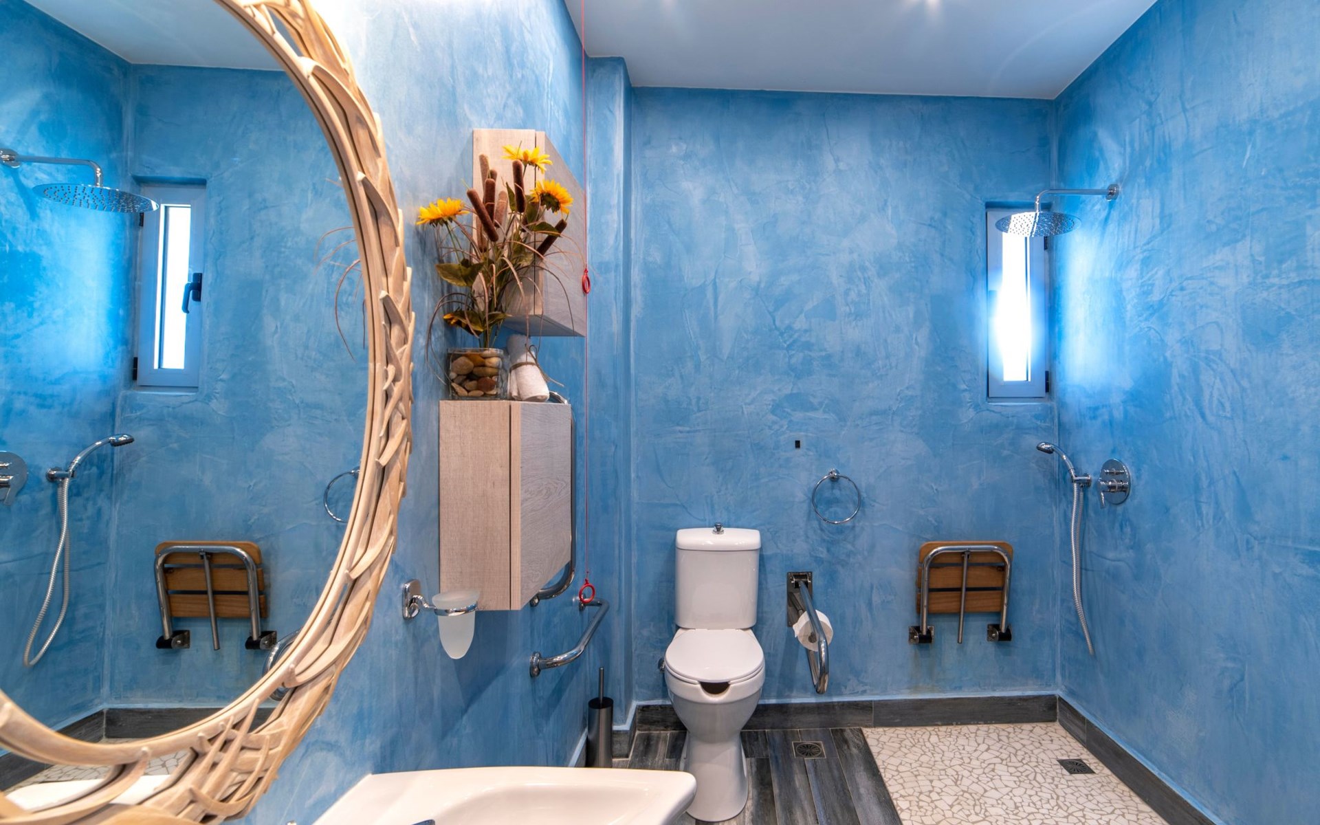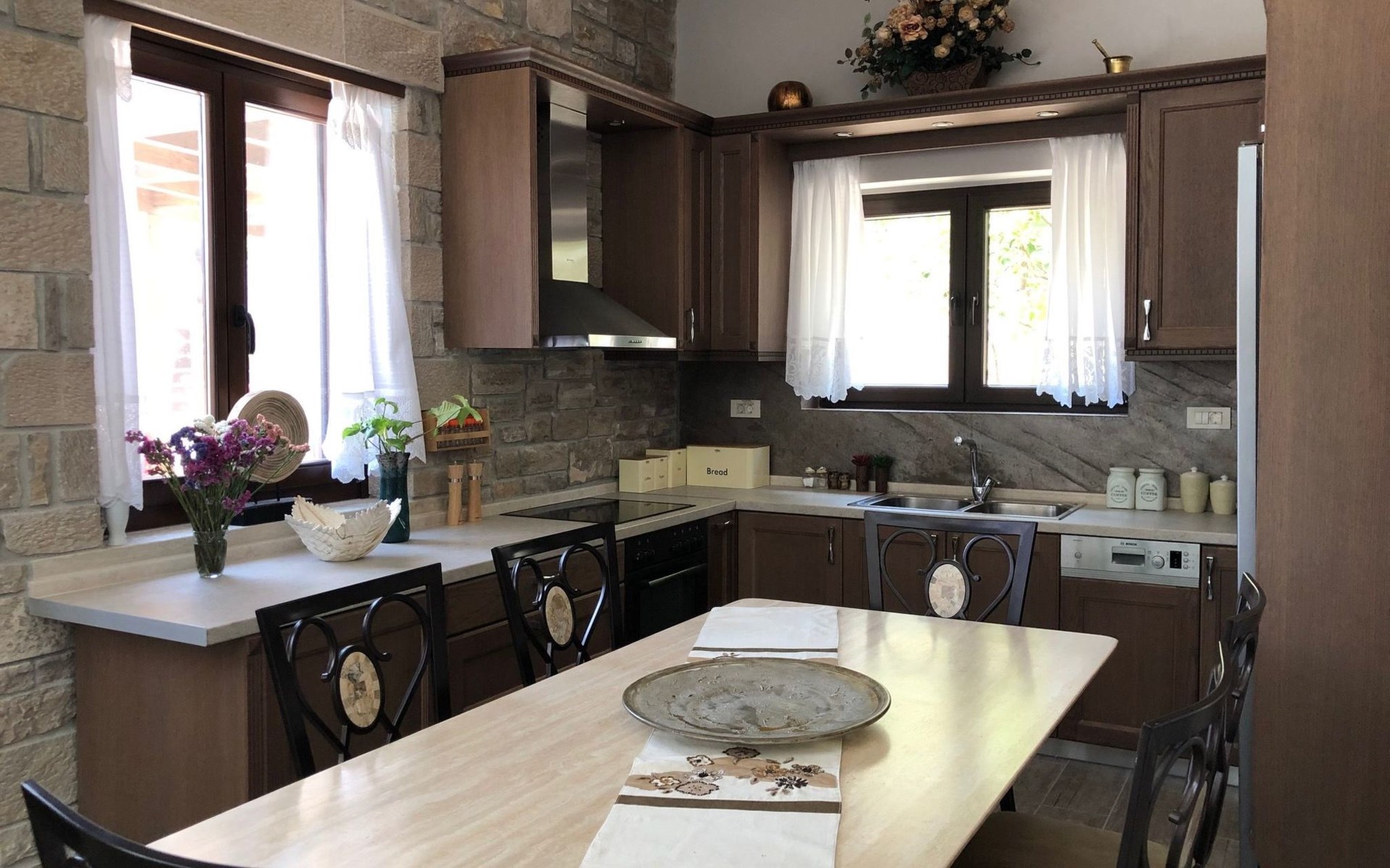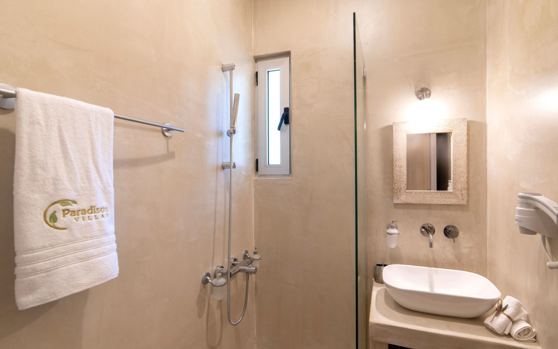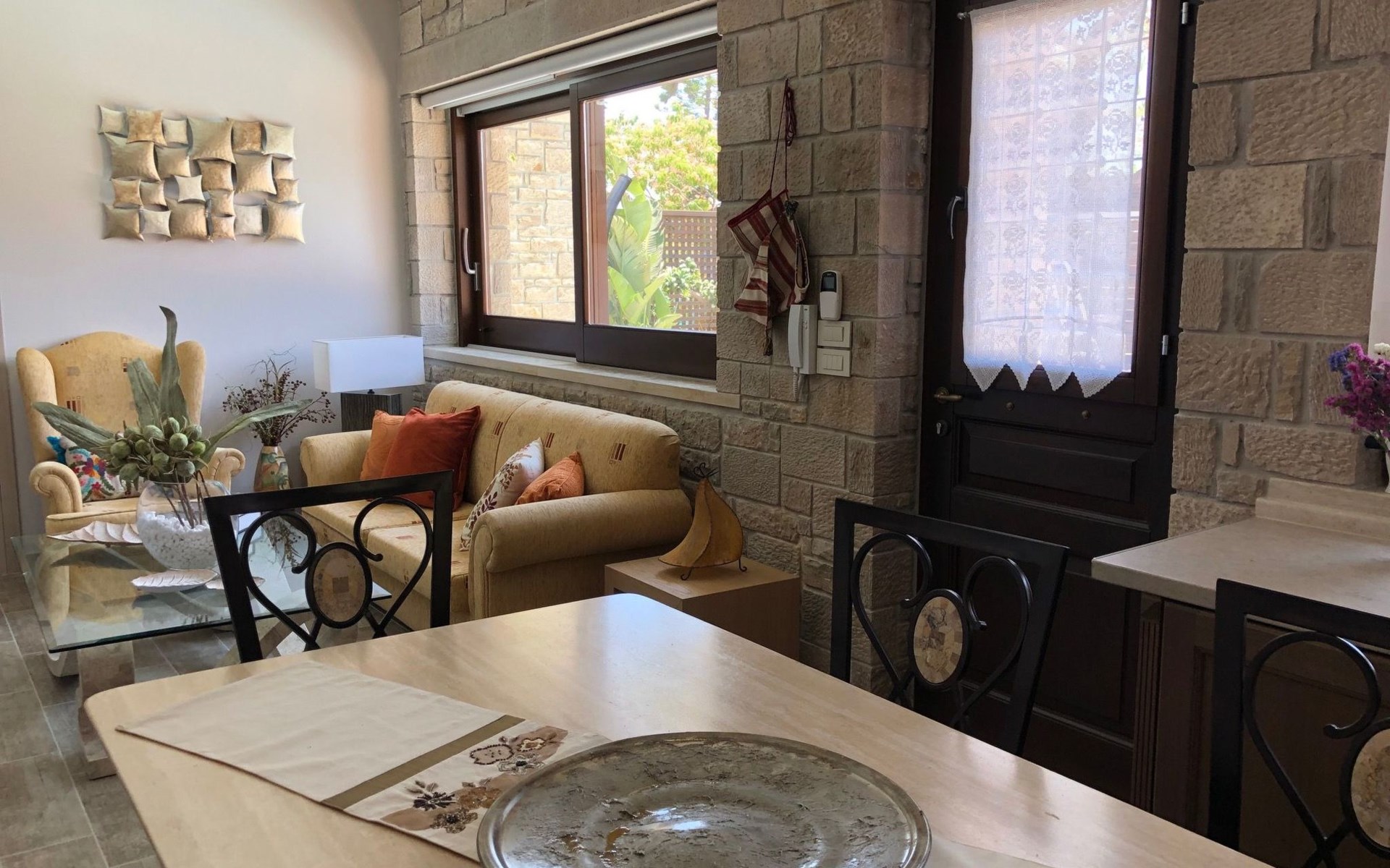 Built in 1935, Lemonia has been fully renovated to nicely blend contemporary and traditional accents. Inspired by the beauty of the Cretan land, natural elements and modernity blends in perfect harmony with a sense of unparalleled comfort. Lemonia (= Lemon tree) features 2 separate master suites with en-suite bathrooms, a comfy sitting area with fireplace, a stone dining table that fits 8, modern bathrooms with walk-in shower cabin and/or spa tub, and a large private patio with view to the garden and to the Zen huge outdoor spa tub. A third large bedroom with 3 single beds, one of which is for special needs. There is also a chair bed that can sleep a 4th child.
