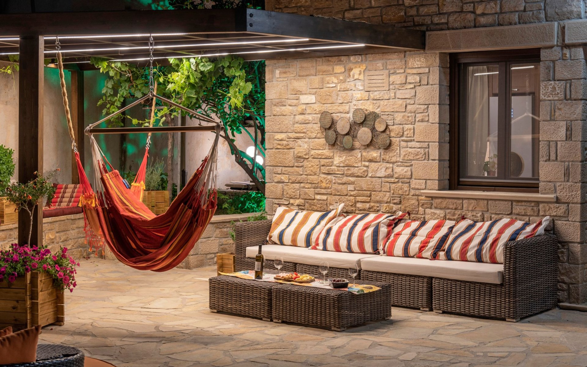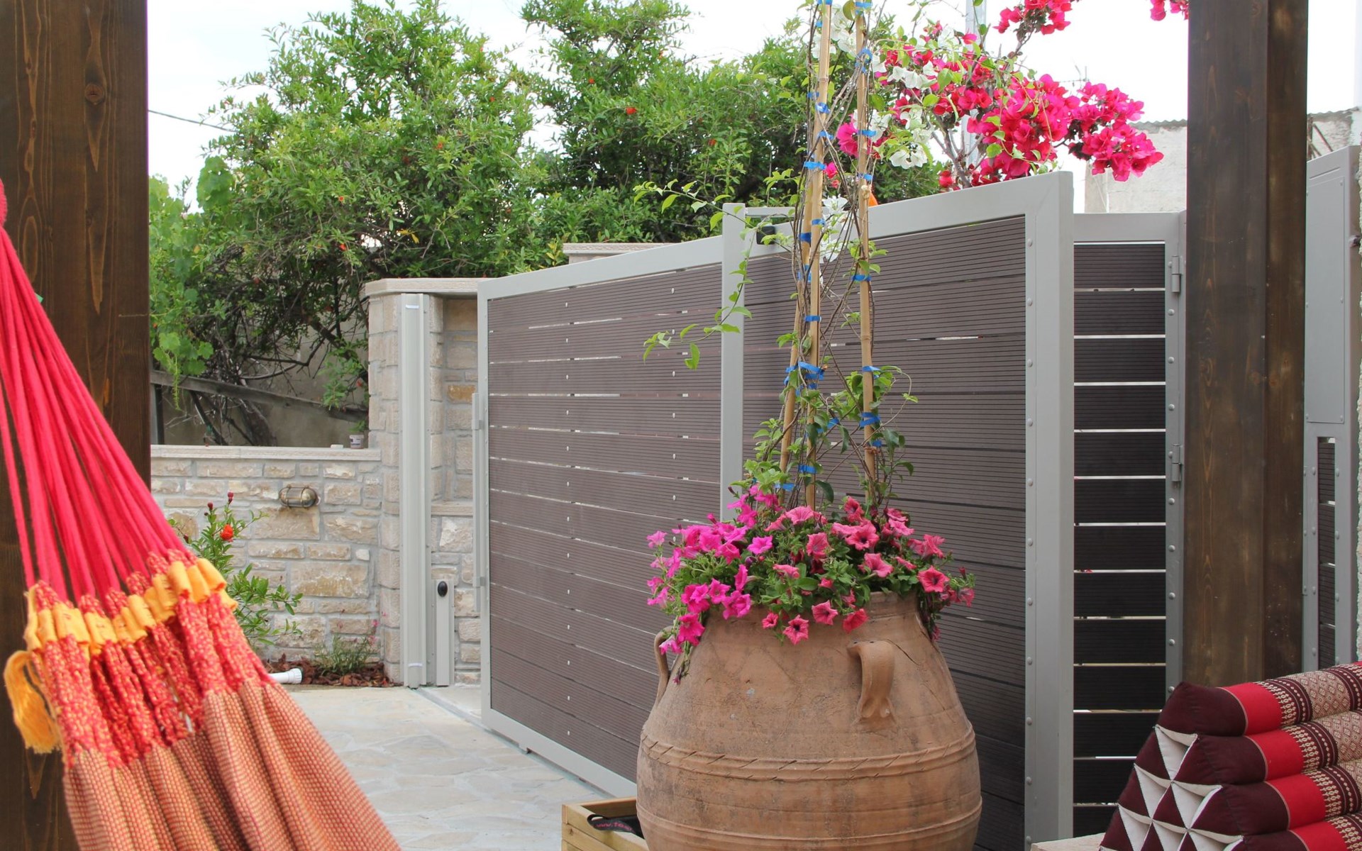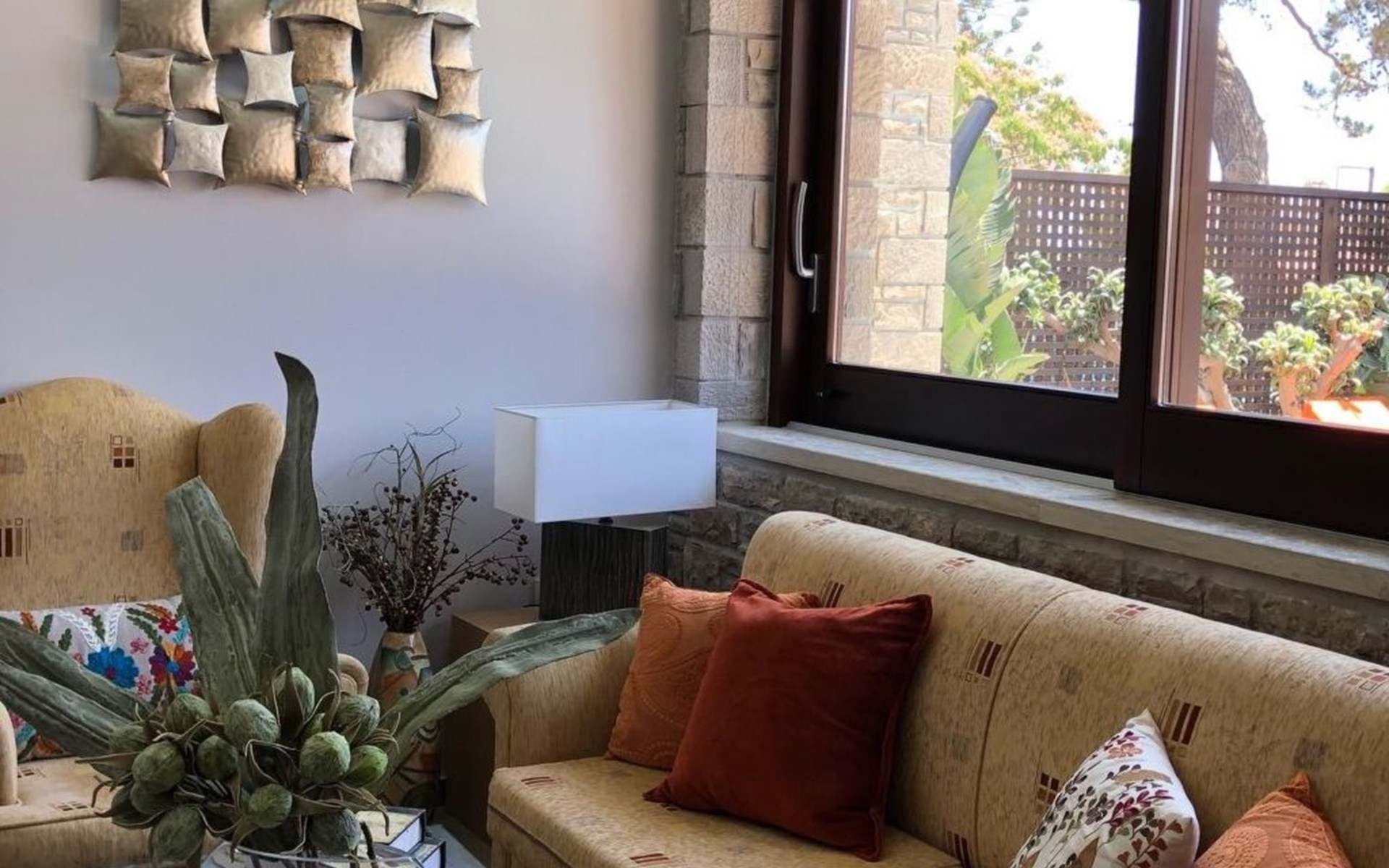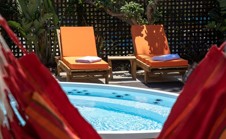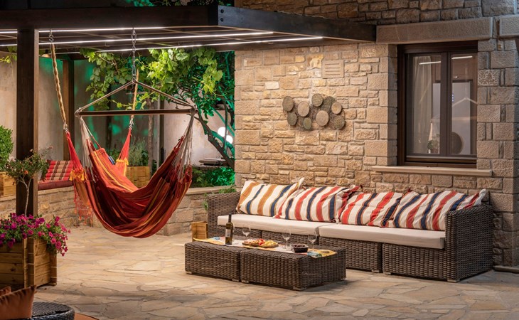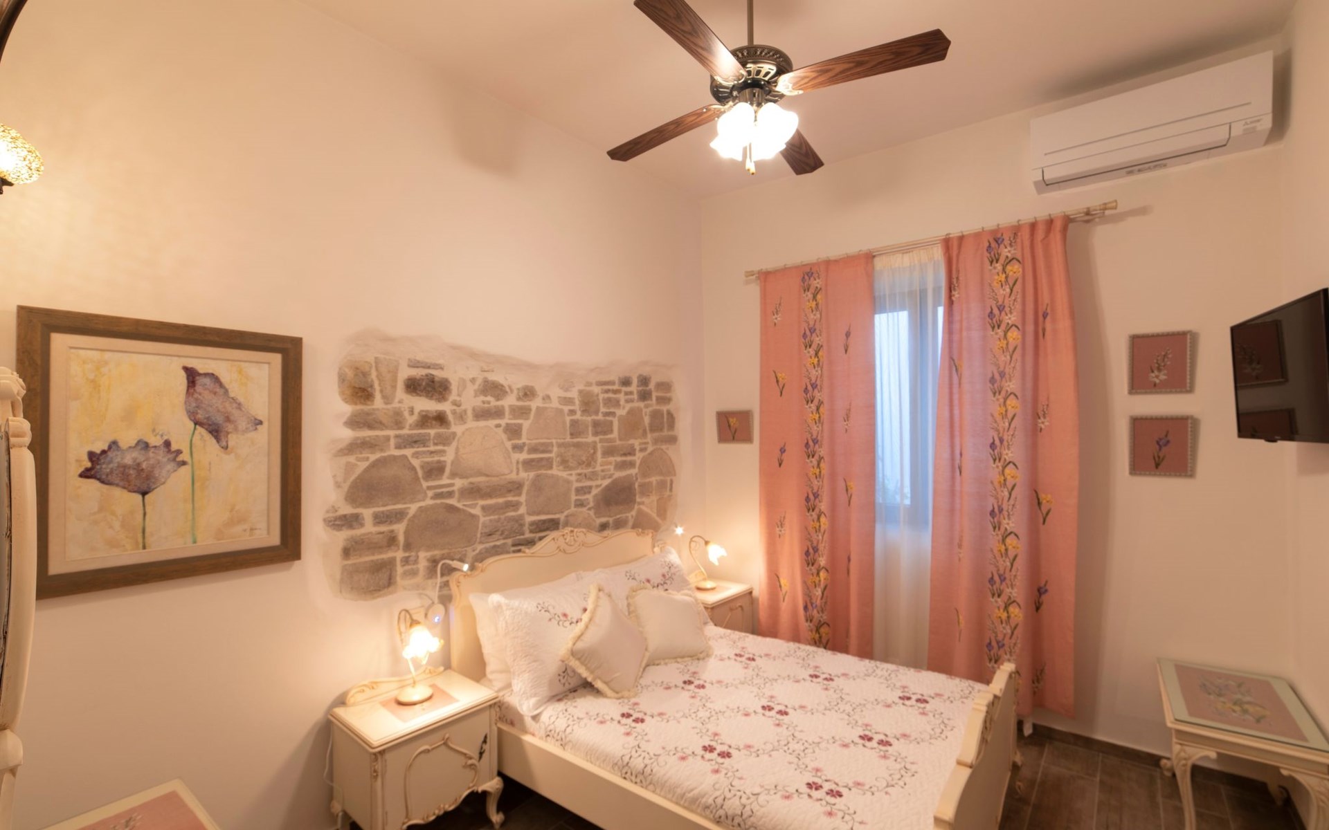 Built in 1935, Lemonia has been fully renovated to nicely blend contemporary and traditional accents. Inspired by the beauty of the Cretan land, natural elements and modernity blends in perfect harmony with a sense of unparalleled comfort. Lemonia (= Lemon tree) features 2 separate master suites with en-suite bathrooms, a comfy sitting area with fireplace, a stone dining table that fits 8, modern bathrooms with walk-in shower cabin and/or spa tub, and a large private patio with view to the garden and to the Zen huge outdoor spa tub. A third large bedroom with 3 single beds, one of which is for special needs. There is also a chair bed that can sleep a 4th child.