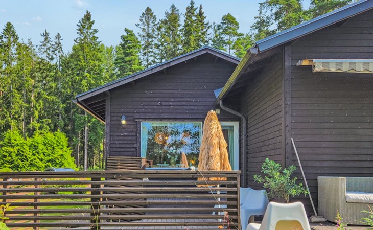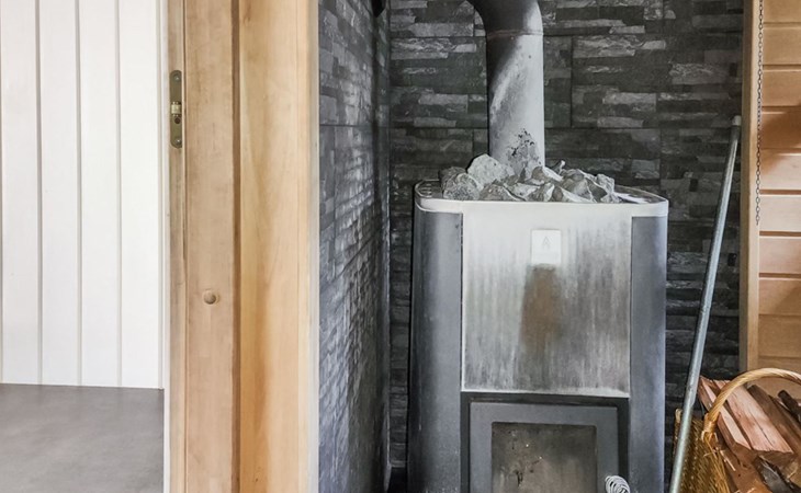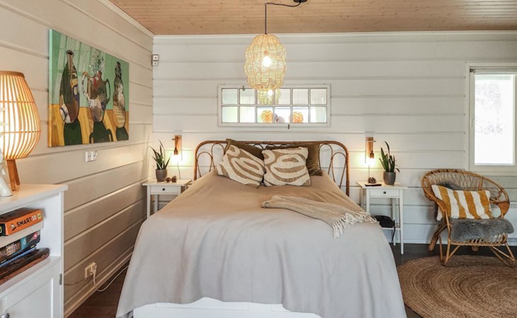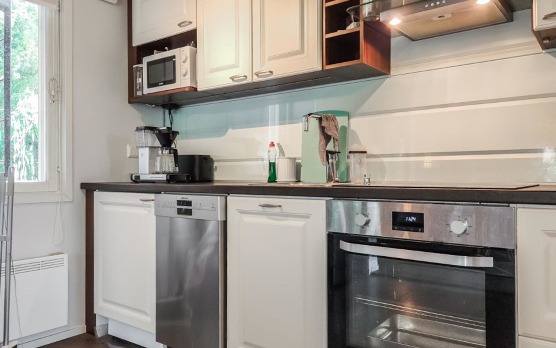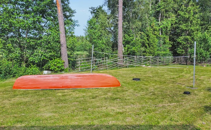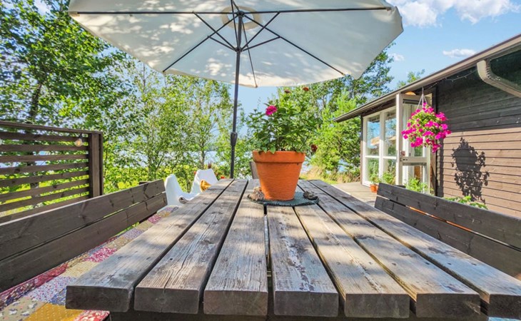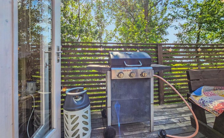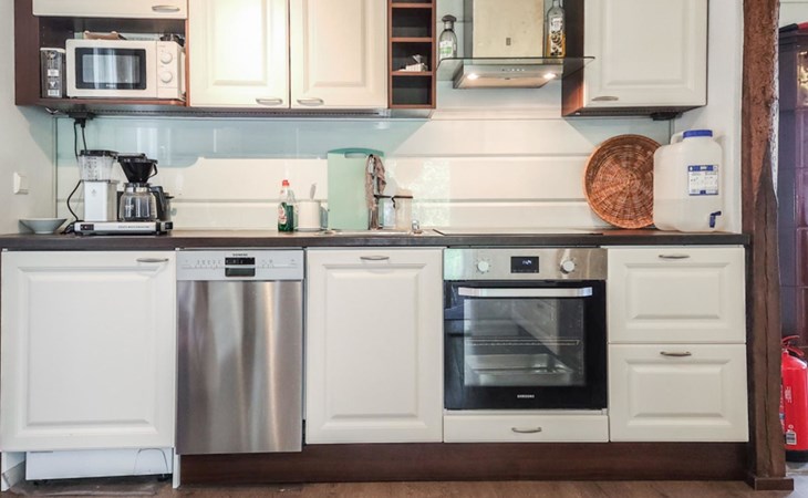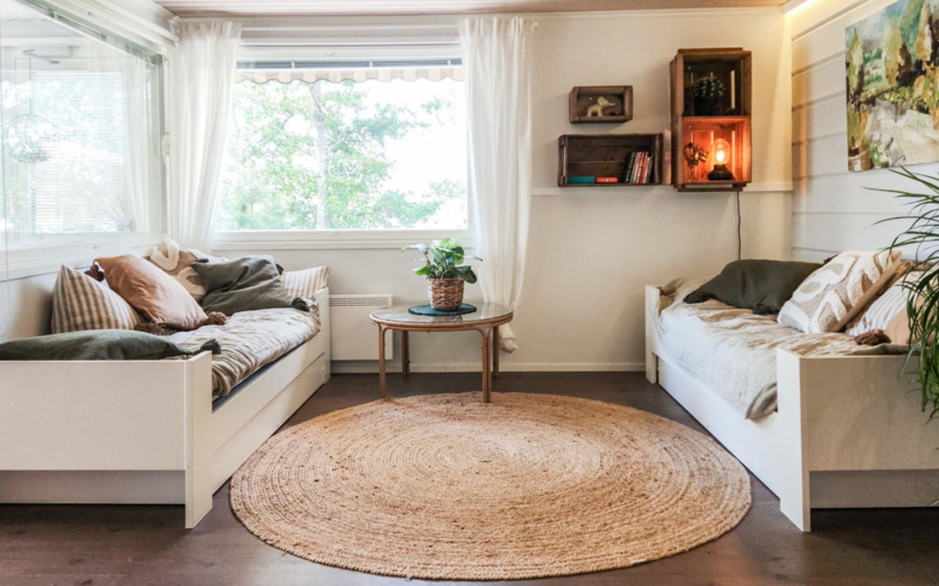 The holiday home accommodates four people. The combined dining and living area features a 160 cm wide double bed, and the kitchen area has two separate 80 cm wide beds.
