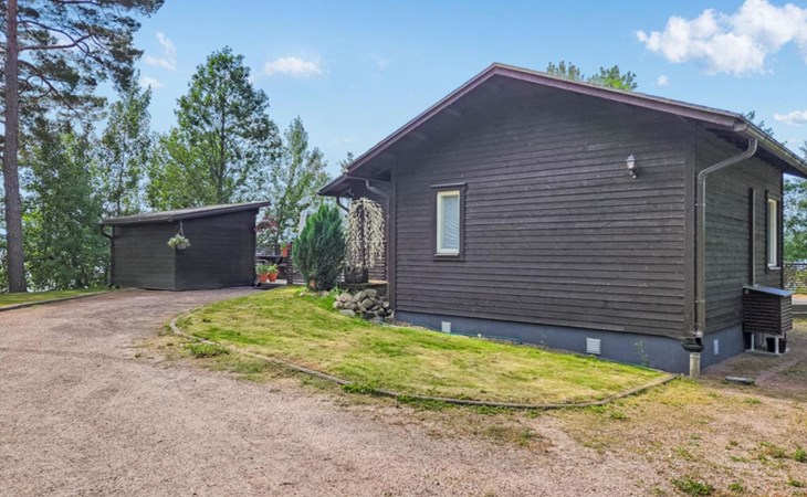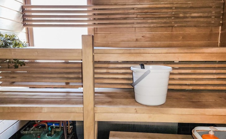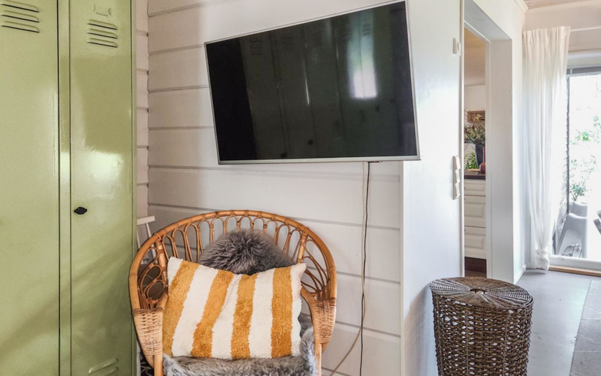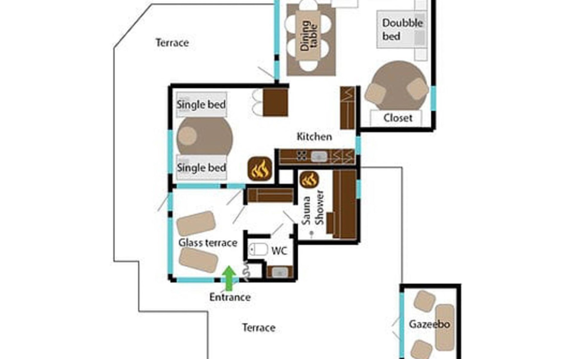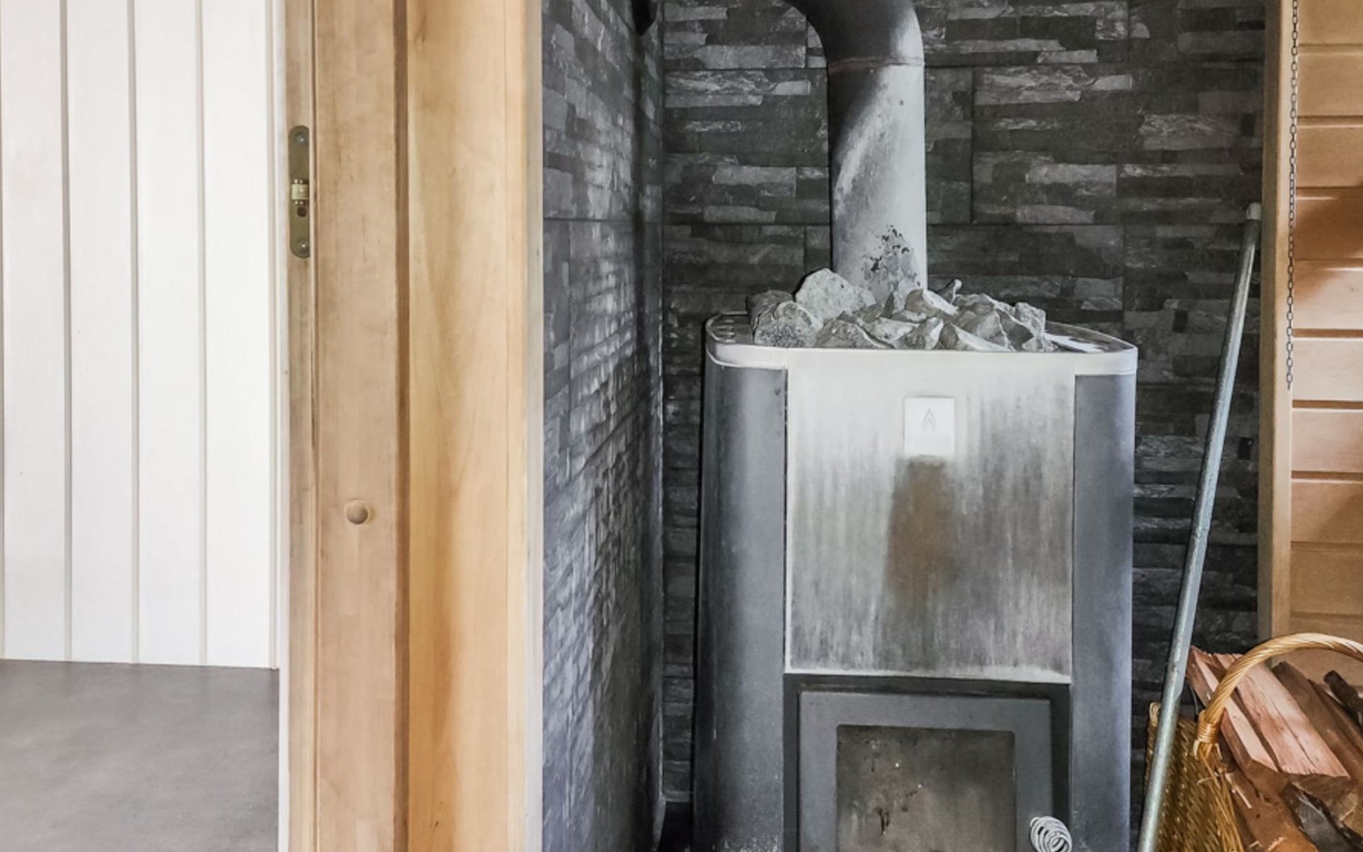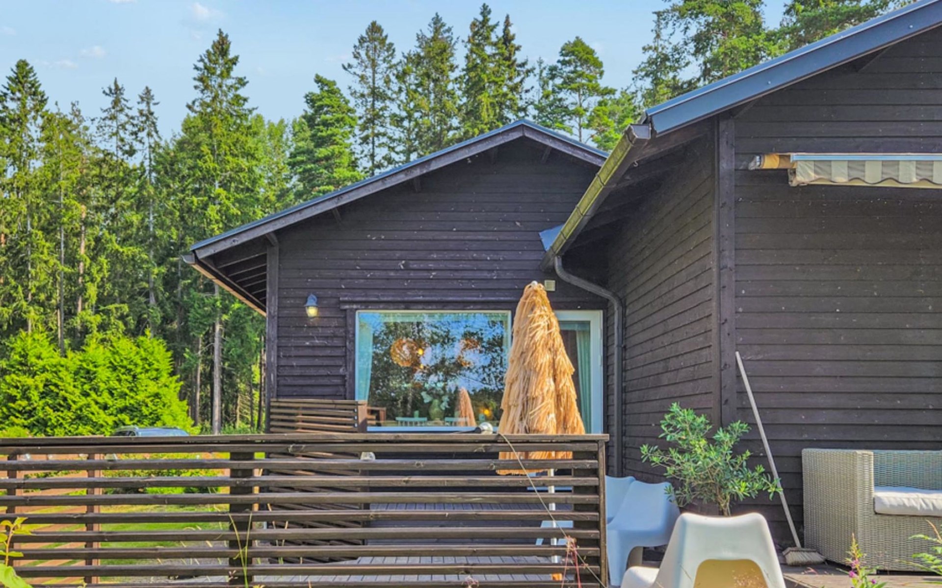The holiday home accommodates four people. The combined dining and living area features a 160 cm wide double bed, and the kitchen area has two separate 80 cm wide beds.