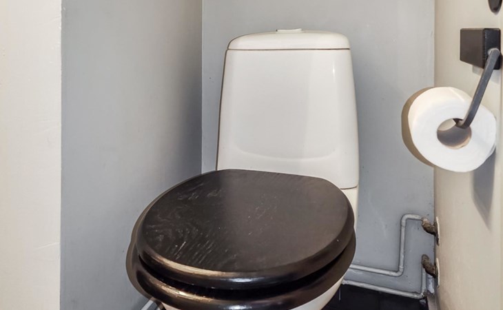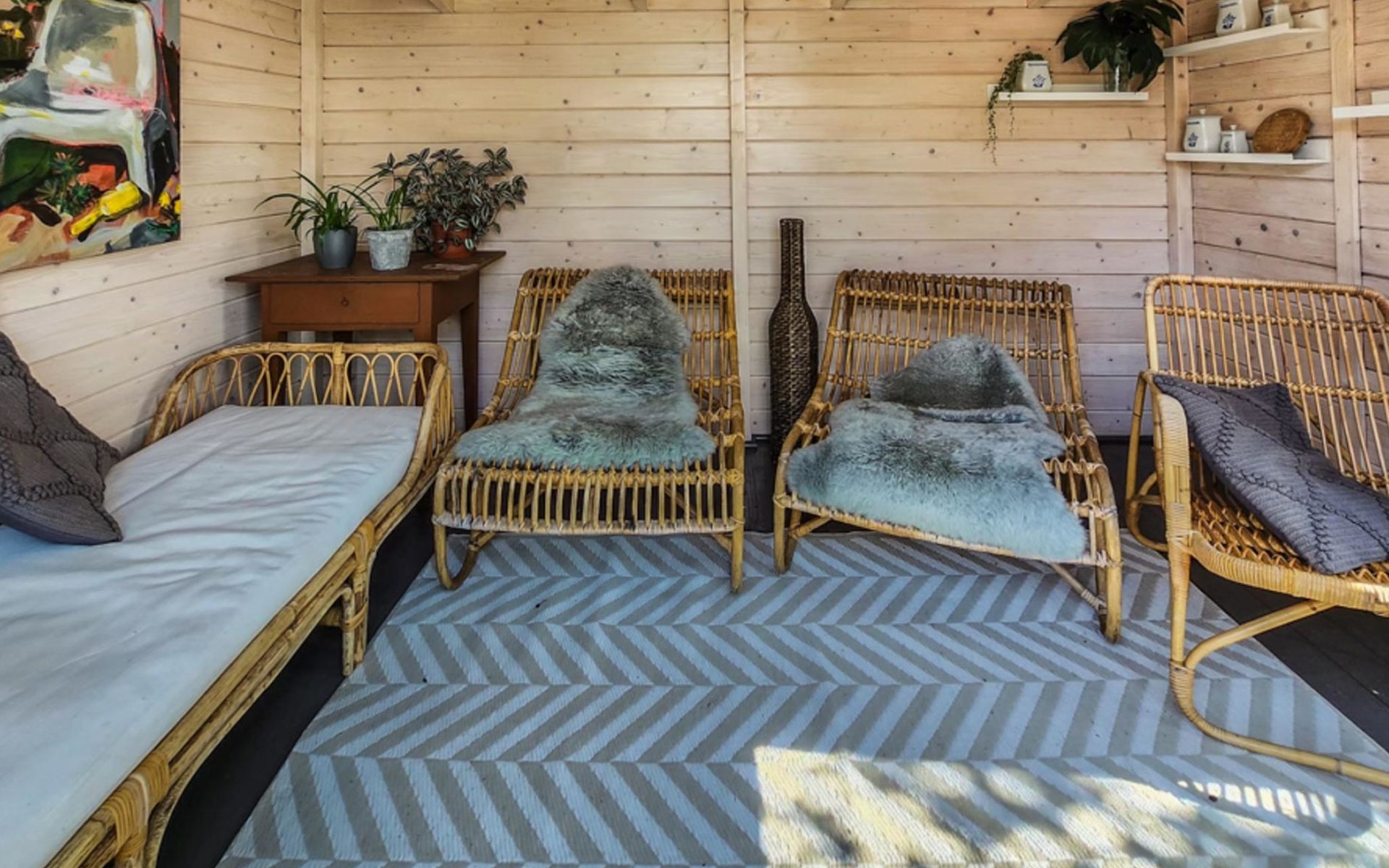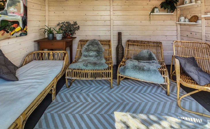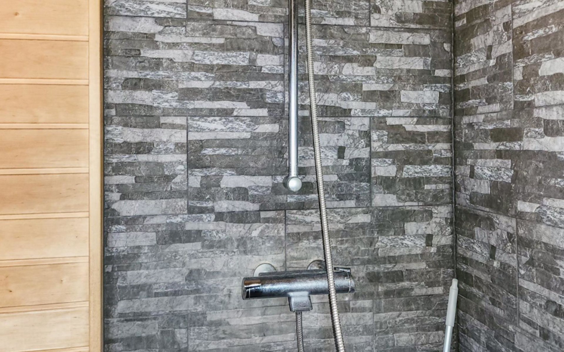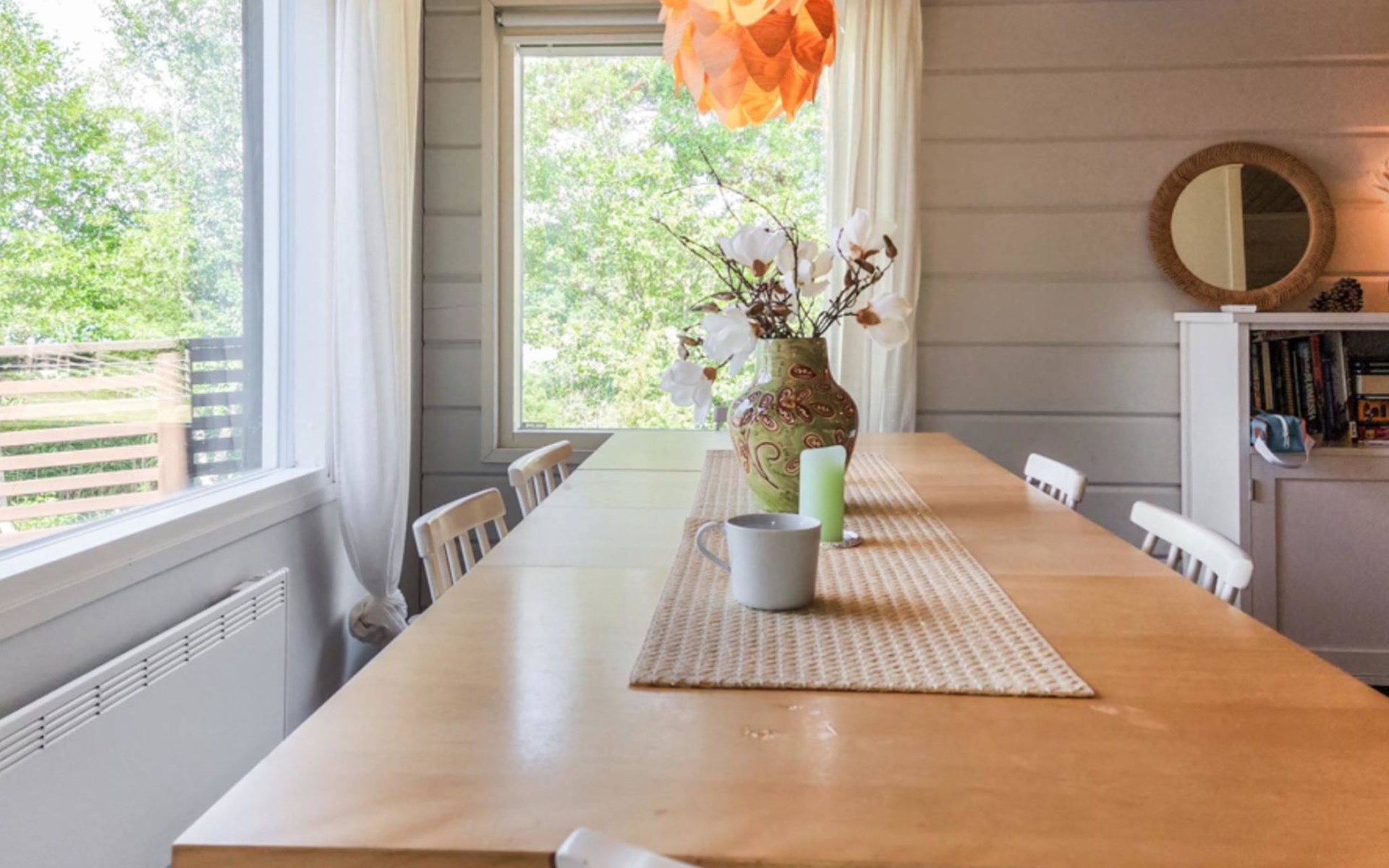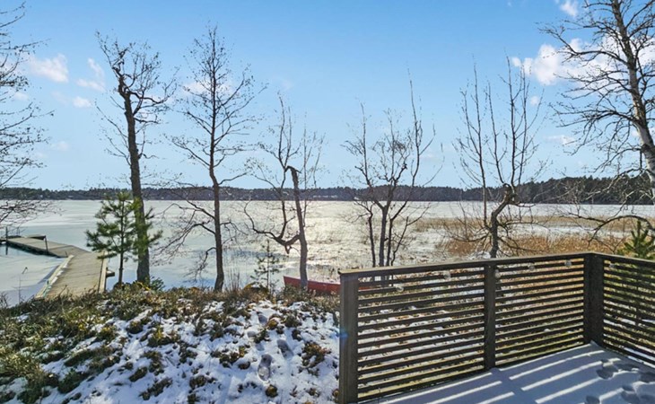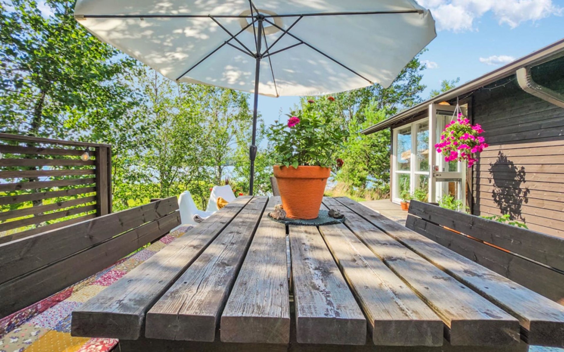 The holiday home accommodates four people. The combined dining and living area features a 160 cm wide double bed, and the kitchen area has two separate 80 cm wide beds.