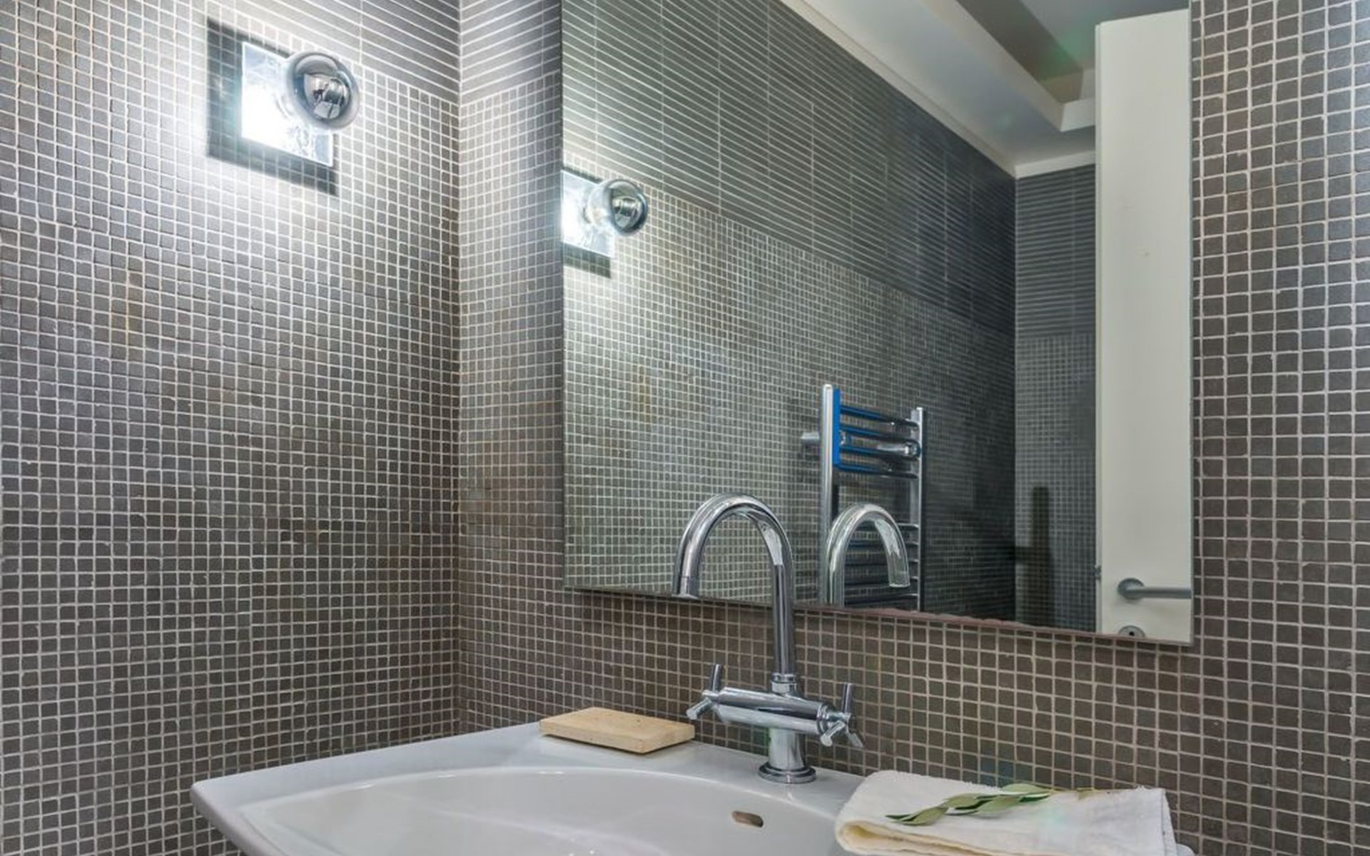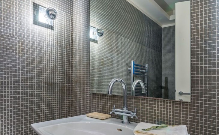 The villa itself spans an impressive 315 sq.m. across three exquisitely designed levels. The basement serves as the primary entrance, welcoming you into a spacious living room that opens onto the main balcony. The left side presents a cozy sitting area equipped with two couches and a TV, while to the right, you'll find a stunning open-plan kitchen, fully equipped for all your culinary needs, and a dining area capable of seating 8 people comfortably. For those who prefer dining alfresco, the veranda offers another dining setup with immediate access to the enchanting garden.