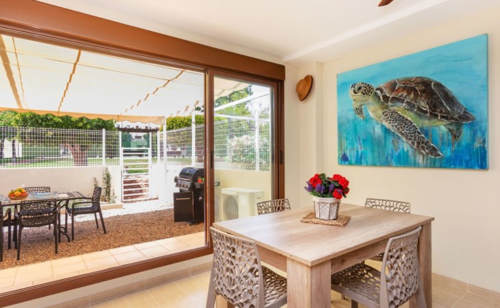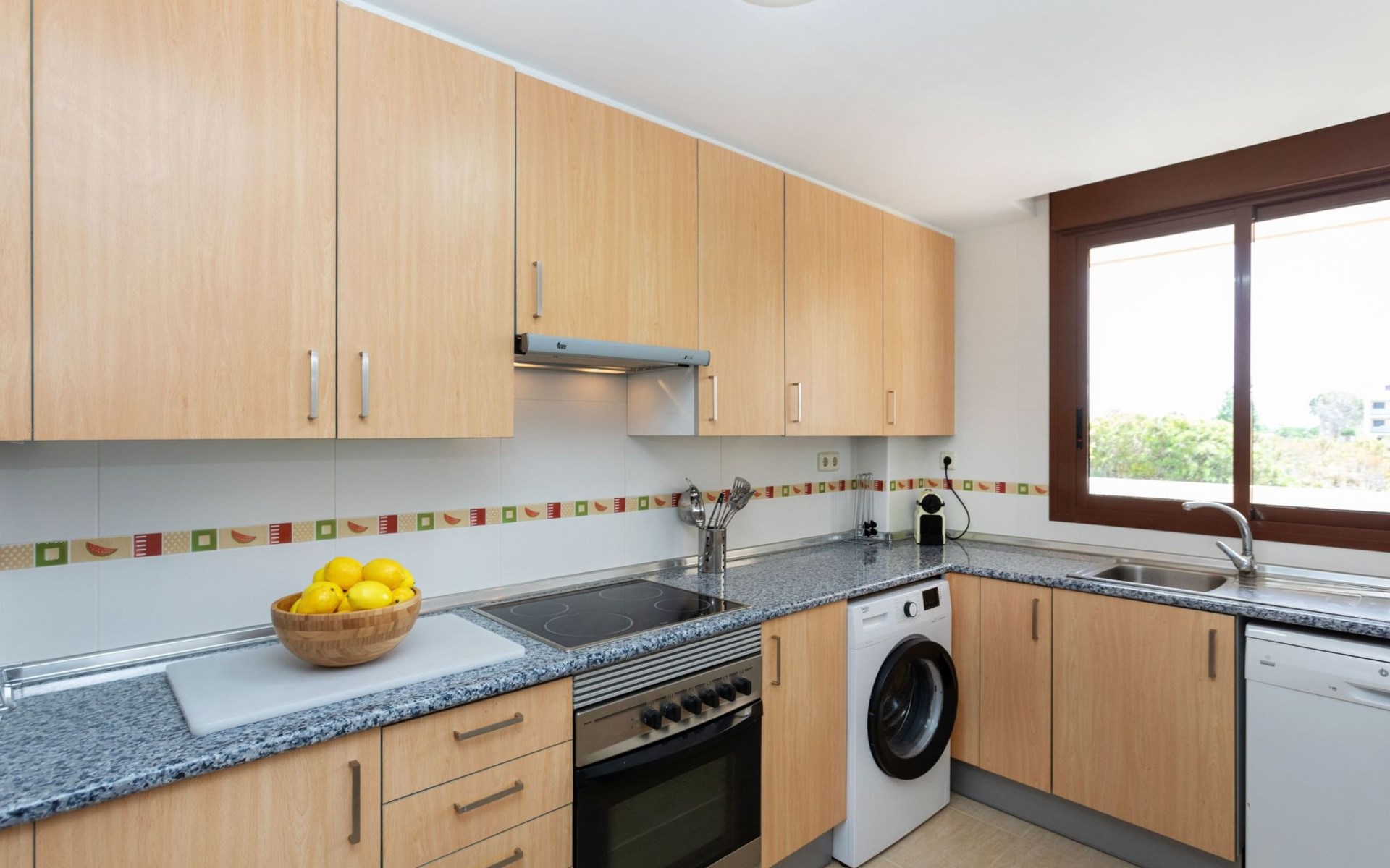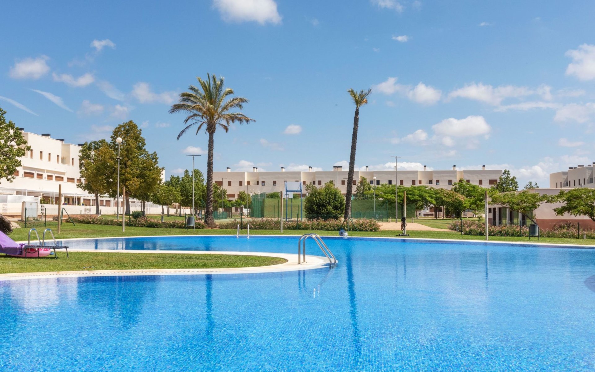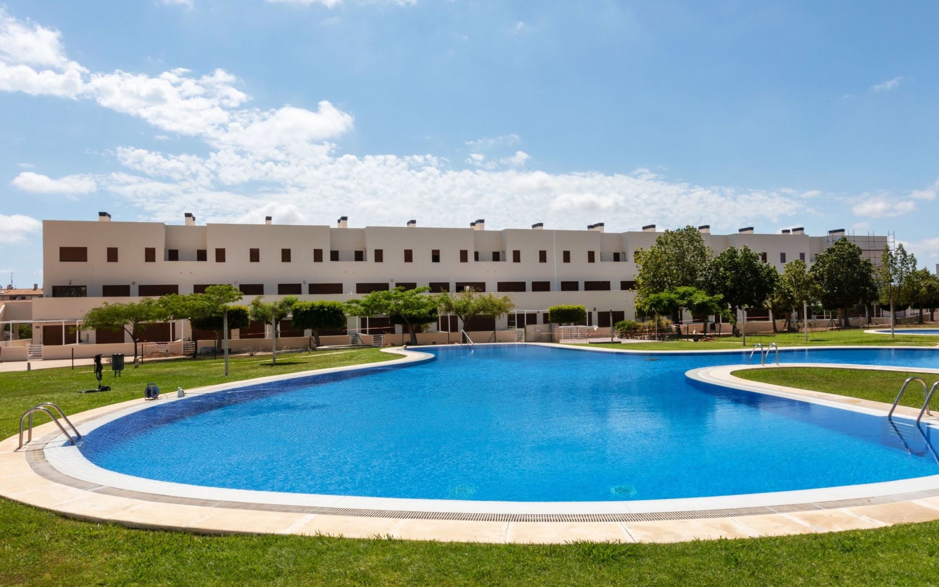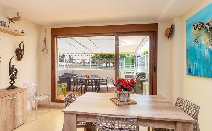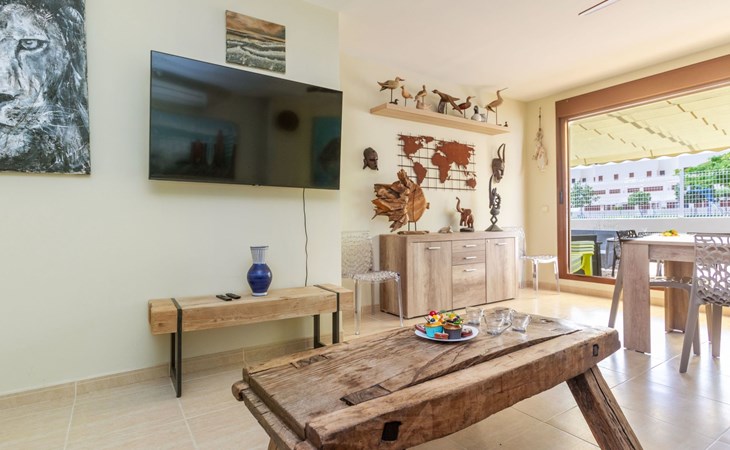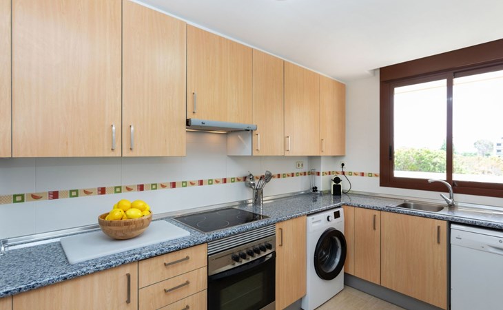 Panorámica Golf 18 km from Vinaròs: Cosy apartment block "Detinsa", 2 storeys, surrounded by fields. 165 apartments in the residence. In a quiet position, 18 km from the sea, 18 km from the beach, on the golf course. For shared use: natural state property (fenced), beautiful garden to relax, swimming pool (depth 250 cm, seasonal availability: 15.Jun. - 30.Sep. pool opening hours: 10:00-21:00) with internal staircase. Unconventional pool shape. Children's pool, outdoor shower, tennis, table tennis, basketball. In the complex: restaurant, bar, fitness room, table tennis, washing machine. Supermarket 3 km, shopping centre 15 km, restaurant 2 km, bar 2 km, bus stop "Panorámica Golf" 1.5 km, railway station "Vinaròs" 18 km, sandy beach "Playa Norte" 18 km. Golf course (18 hole) 500 m, walking paths from the house 100 m. Nearby attractions: Peñiscola 40 km, Ermita de Vinaròs 25 km, Parque Natural del Delta del Ebre 60 km, La Cuitat de les Arts y les Ciencies 160 km, Port Aventura 100 km. Well-known lakes can easily be reached: Pantano de la Senia 35 km. Hiking paths: Parque Natural Sierra de Irta 45 km, La Foradada Sant Carles de la Rapita 30 km. Please note: car recommended. Object suitable for 4 adults. The owner does not accept any youth groups. Guarded residence. Additional accommodations can be booked. Property ref. ES9600.307.2 is situated on the same property. All houses/apartments are individually designed/furnished. Neighbourhood highly sensitive to noise. Quietness and good behaviour expected.