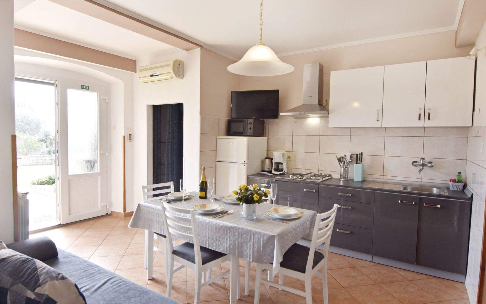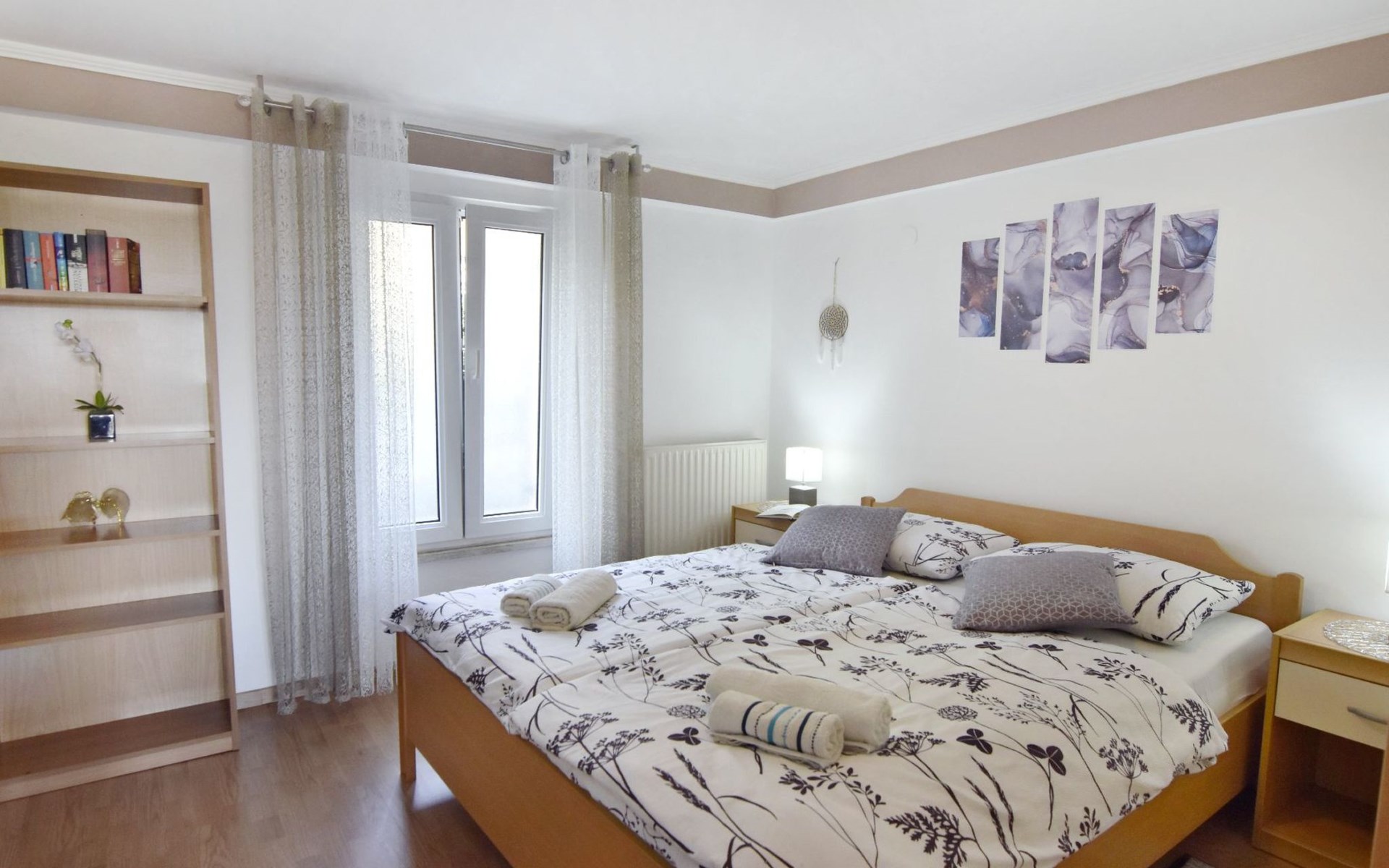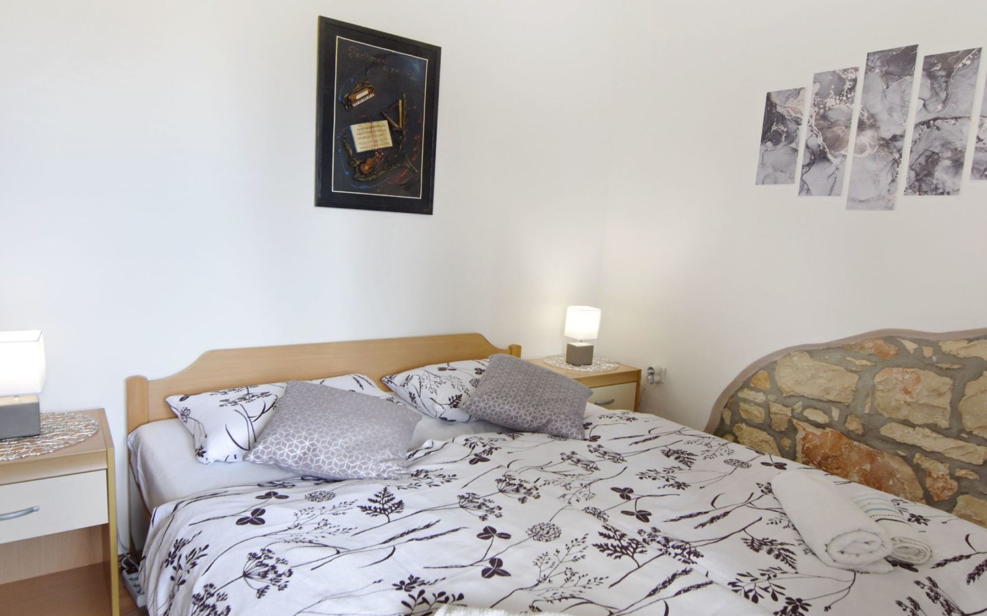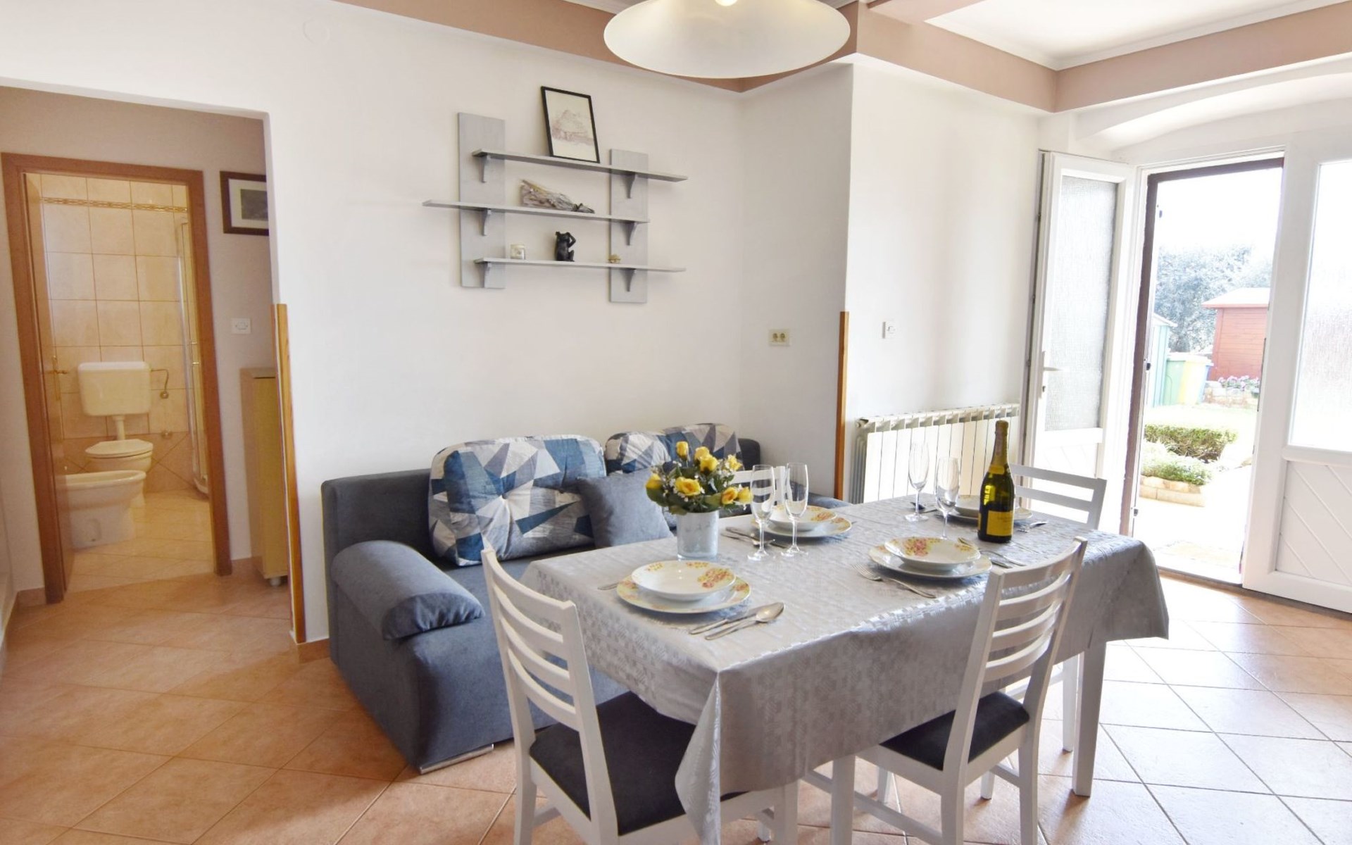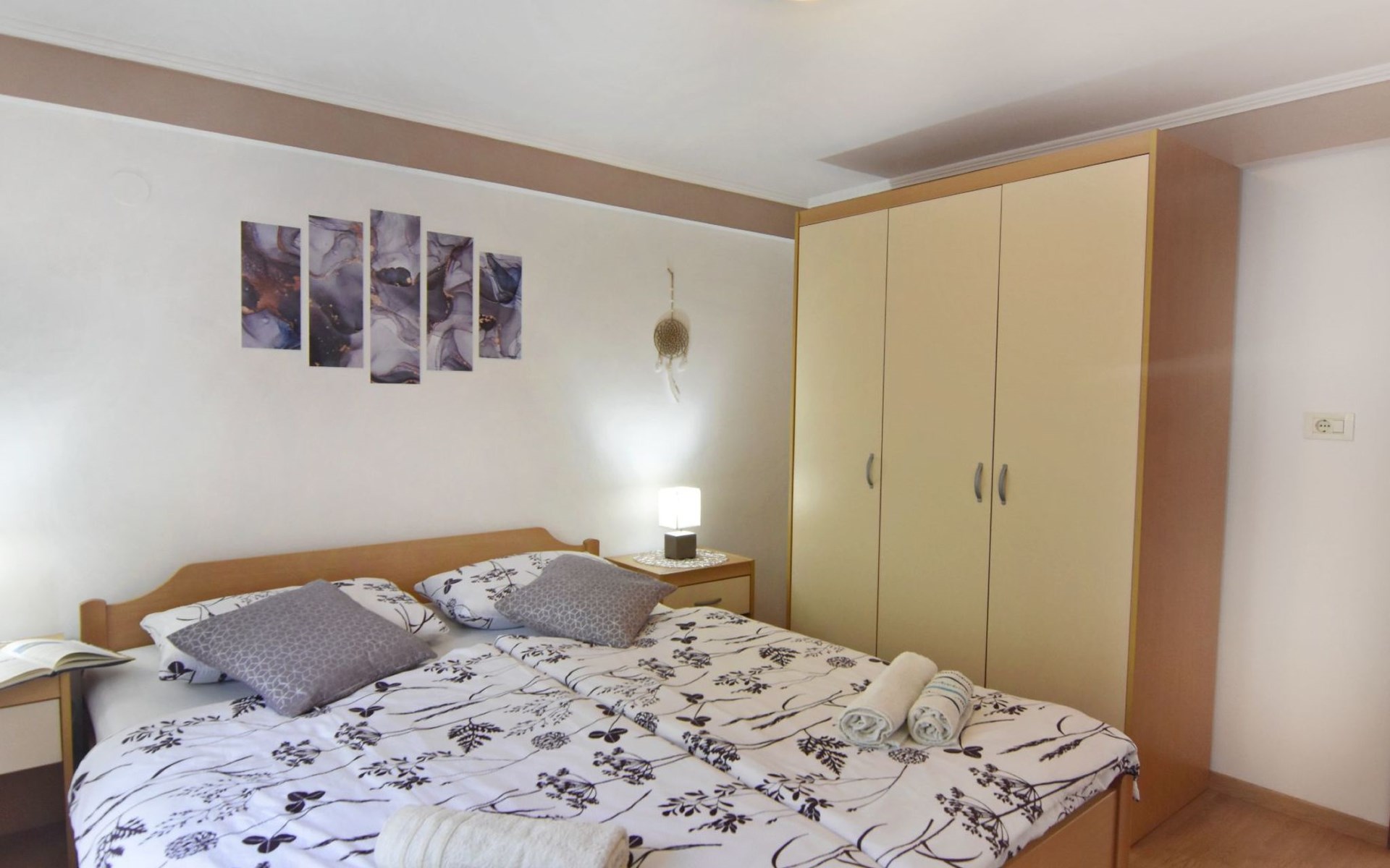 Comfortable 44 sqm apartment located on the ground floor of a family villa with a beautiful large enclosed garden for shared use. The location is perfect for families with children due to the proximity of the beaches. The bathing facilities are easily reachable on foot in a few minutes. The location is quiet, sunny surrounded by greenery, but still central.The house offers a beautiful fenced and well-kept garden, a small olive grove and two apartments for rent.The 47 sqm apartment located on the ground floor of a family house with a large garden and sea view. Located in the tourist area of Umag most loved by tourists for the variety of beaches, it will make your holiday unforgettable. The accommodation is ideal for families or small groups looking for comfort and tranquility. The comfortable apartment has two bedrooms, each with double bed (160x200), bed linen provided (changed weekly), two bedside tables with night lamps and wardrobe. The full bathroom has a shower, washing machine, sink with cabinet and mirror, hairdryer, two bath towels per person provided (changed weekly). The living area has a kitchen equipped with a stove with two gas and two electric burners, smoke extractor hood, oven, refrigerator, kettle, coffee machine, toaster, plates, cutlery, glasses and kitchen utensils. The living area has a sofa, dining table with 4 chairs, flat screen satellite TV, air conditioner and free Wi-Fi internet connection. At the entrance of the apartment there is a large covered terrace equipped with garden furniture with a wonderful sea view and garden decorated with flowers and plants. In the courtyard available for shared use the garden swing and the barbeque area with stone table and benches to spend summer evenings in the company of the outdoors.The area is quiet surrounded by greenery, the beach can be reached on foot in a few minutes. The nearby beaches are varied to satisfy every need, sandy, rocky, pebbly, equipped, with the possibility of renting deck chairs and umbrellas. These beaches make unique the wonderful Mediterranean vegetation along the coast that allows you to shelter from the sun during the hottest hours of the day. To find the beach you prefer, just move a few hundred meters, as the structure of the beaches changes. For those who love the gym, outdoor gym equipment is available for free on the seafront.The nearest beach at 600 m, the grocery store at 800 m, the restaurant at 250 m.In the vicinity of the apartment there are a couple of restaurants and pizzerias. Only 100 m away is the station of the tourist train which leaves from the tourist village of Katoro and along the coast arrives in the center of Umag and vice versa. The center of Umag can be reached on foot in 20 minutes or can be reached by tourist train. In the center of Umag to visit the museum, the aquarium, the cathedral, a walk along the famous Umag Dam is recommended, to explore the narrow and interesting alleys of the old town, or visit the stalls and to the delight of children the playground on the waterfront. To buy a larger quantity of food it is better to walk a few kilometers to the largest and most convenient supermarkets such as Lidl, Spar, Kaufland or Plodine.Nearby there are various leisure possibilities: tennis courts, the Adriatic Golf Club with 18 holes, horse riding, water sports, night clubs, adrenaline park, mini golf course, fishing. It is also possible to take various organized trips by boat or by bus. The area is full of renowned restaurants, simple restaurants, pizzerias, fast food restaurants, bars. We recommend visiting the Istrian hinterland for days off the beach or to spend the evenings. Very interesting is the artists' village Grožnjan, Motovun the typical medieval town located on a hill and known for the film festival which takes place every year at the end of July, the village of Livade very well known for its white truffle. For cave lovers to visit the Baredine cave. Don't miss the chance to visit Hum the smallest city in the world just 60 km from Umag. Also interesting are the places on the coast such as the NP Brijuni, Pula, Rovinj and Poreč. Organize various fish picnic boat trips during which you will have the opportunity to visit Rovinj and Poreč or Novigrad. The day trip by hydrofoil to Venice (if it is possible due to COVID). To visit the Istralandia water park 20 km from Umag to the delight of children and the Dinopark in Vrsar, fun is guaranteed there. For gourmets various possibilities of tasting wines, cheeses, olive oil, typical Istrian ham and much more. For organized trips we recommend the Trevitours agency which, after a telephone consultation or with the owner, also brings the tickets to your home* Registration only on the first day, to be paid on arrival in cash* Guests are kindly requested to use the appliances with care.* It is forbidden to smoke indoors but you can smoke on the terrace.* For any damage caused, guests are kindly requested to inform the owner or the agency that after a careful assessment of the damage, the cost of the damage will be charged on the spot.Short descriptionOther : Non-smoking houseShort description 1Number of kitchens : 1SurroundingNearby sports facilities : Basketball, Bike tours, Diving, Fishing, Football area, Golf course, Hunting facilities, Mountainbiking, Riding possibilities, Sailing, Sport center, TennisRental Facilities : Bicycle rental service, Boat rental service, car rentalGarden and outdoorGarden facilities : Garden furniture provided, Grill