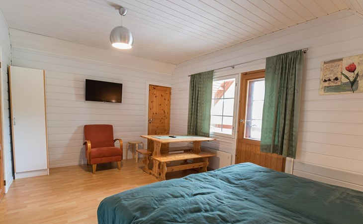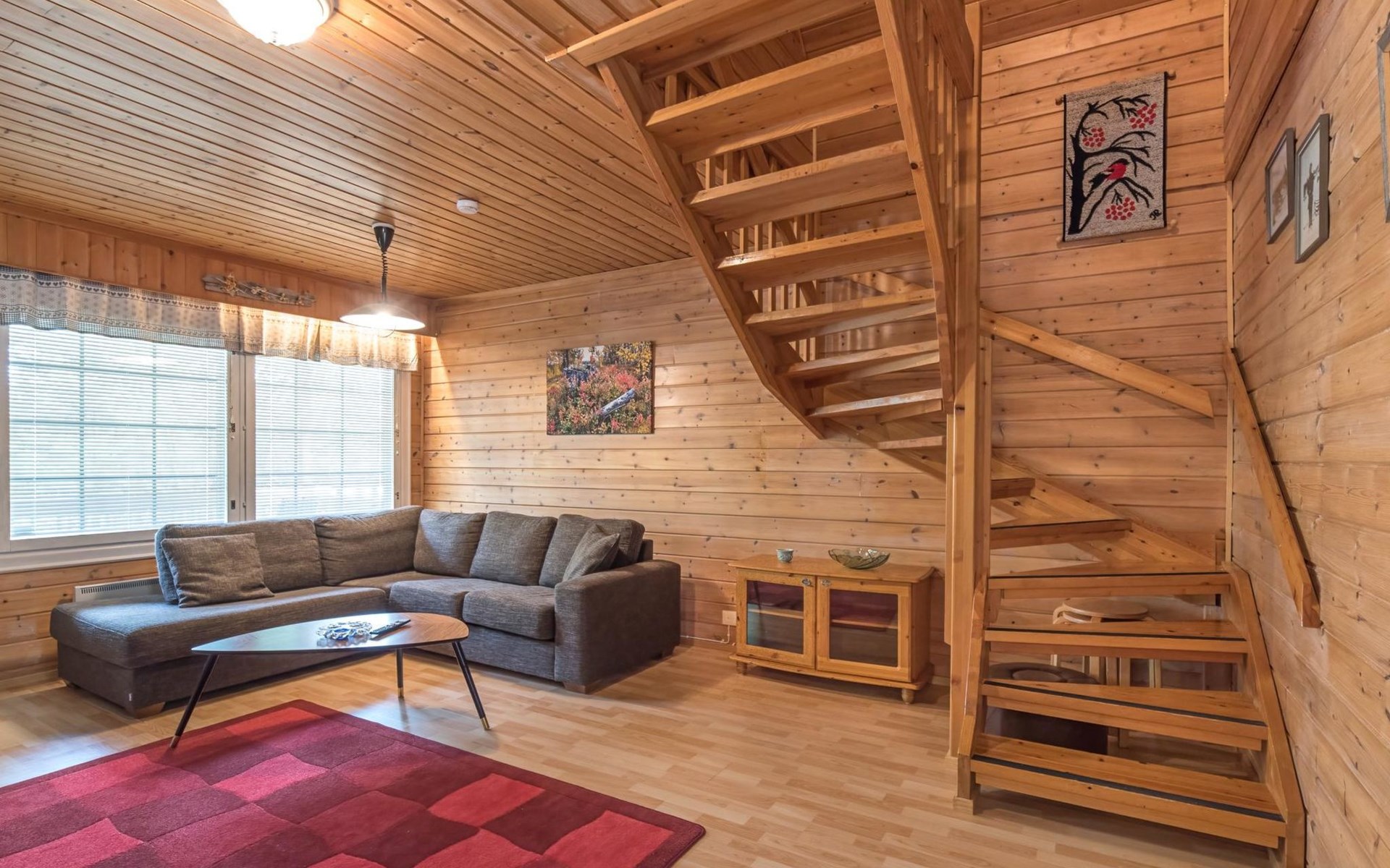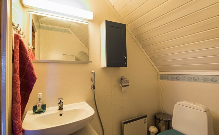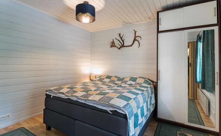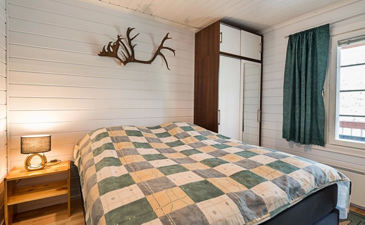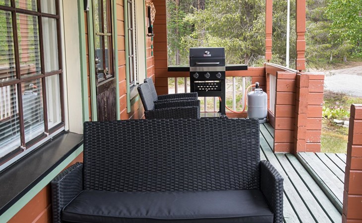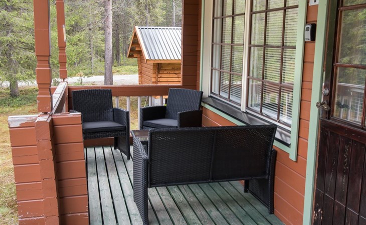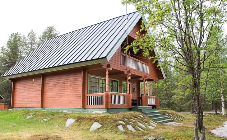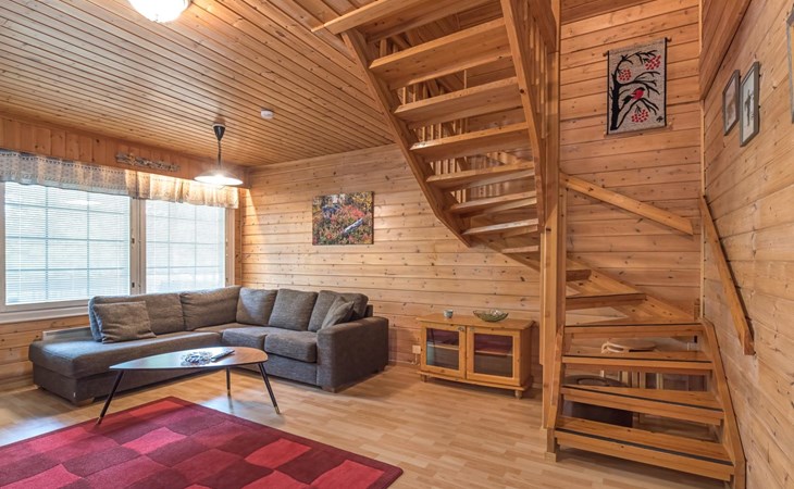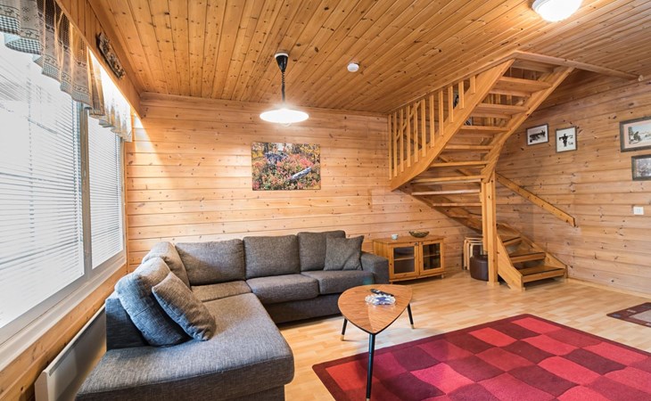 Log cabin on the edge of the three cabin community, built in 1990. Facilities on two floors, downstairs living room, kitchen, bedroom with a double bed, separate toilet and covered terrace.