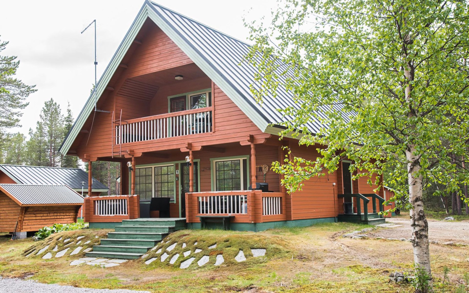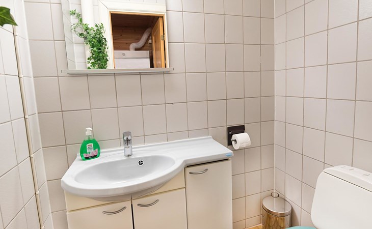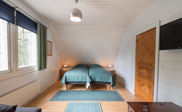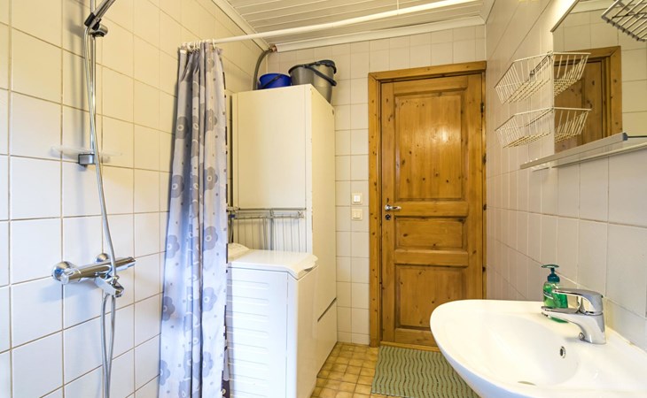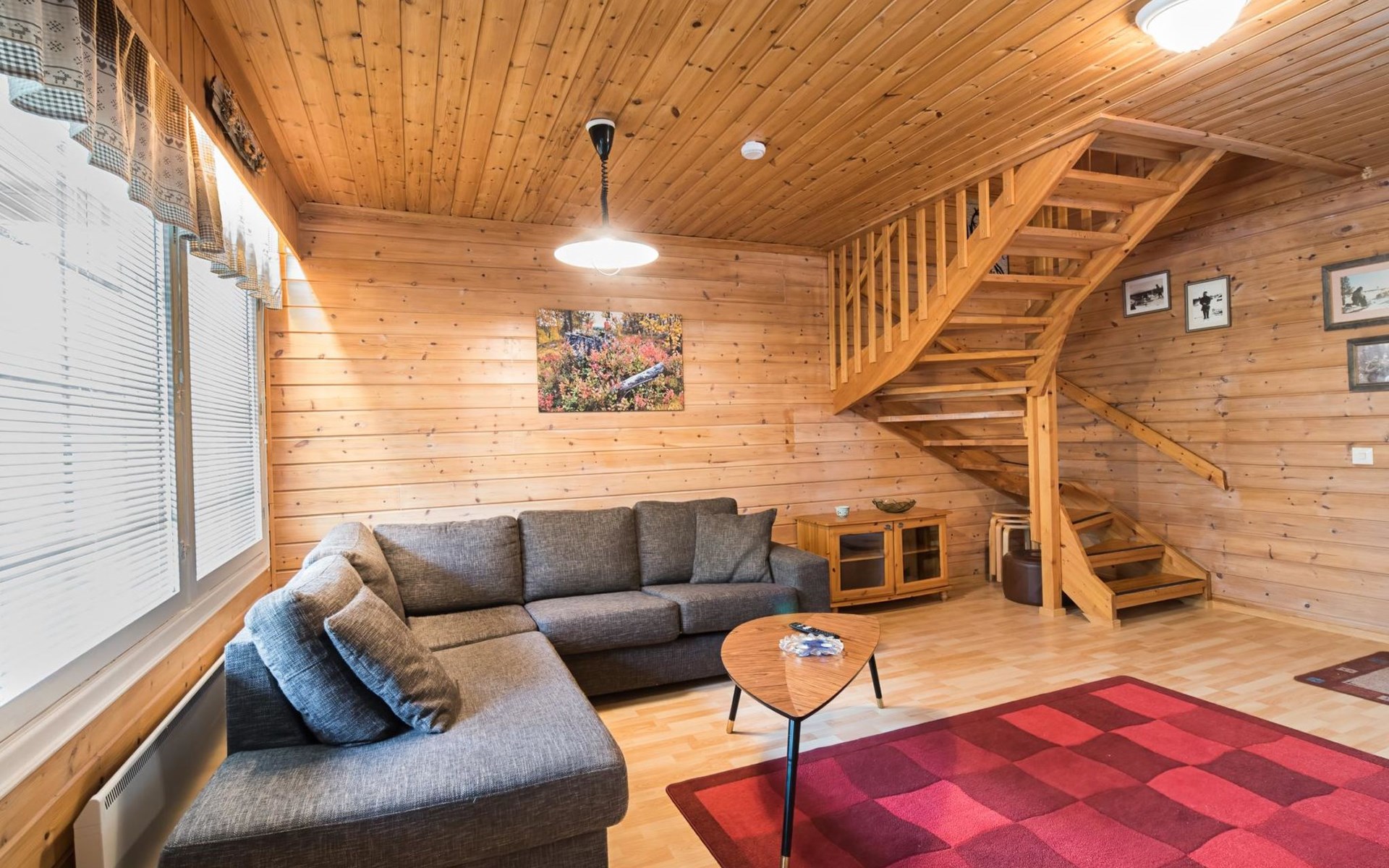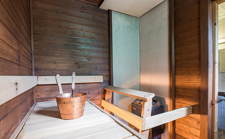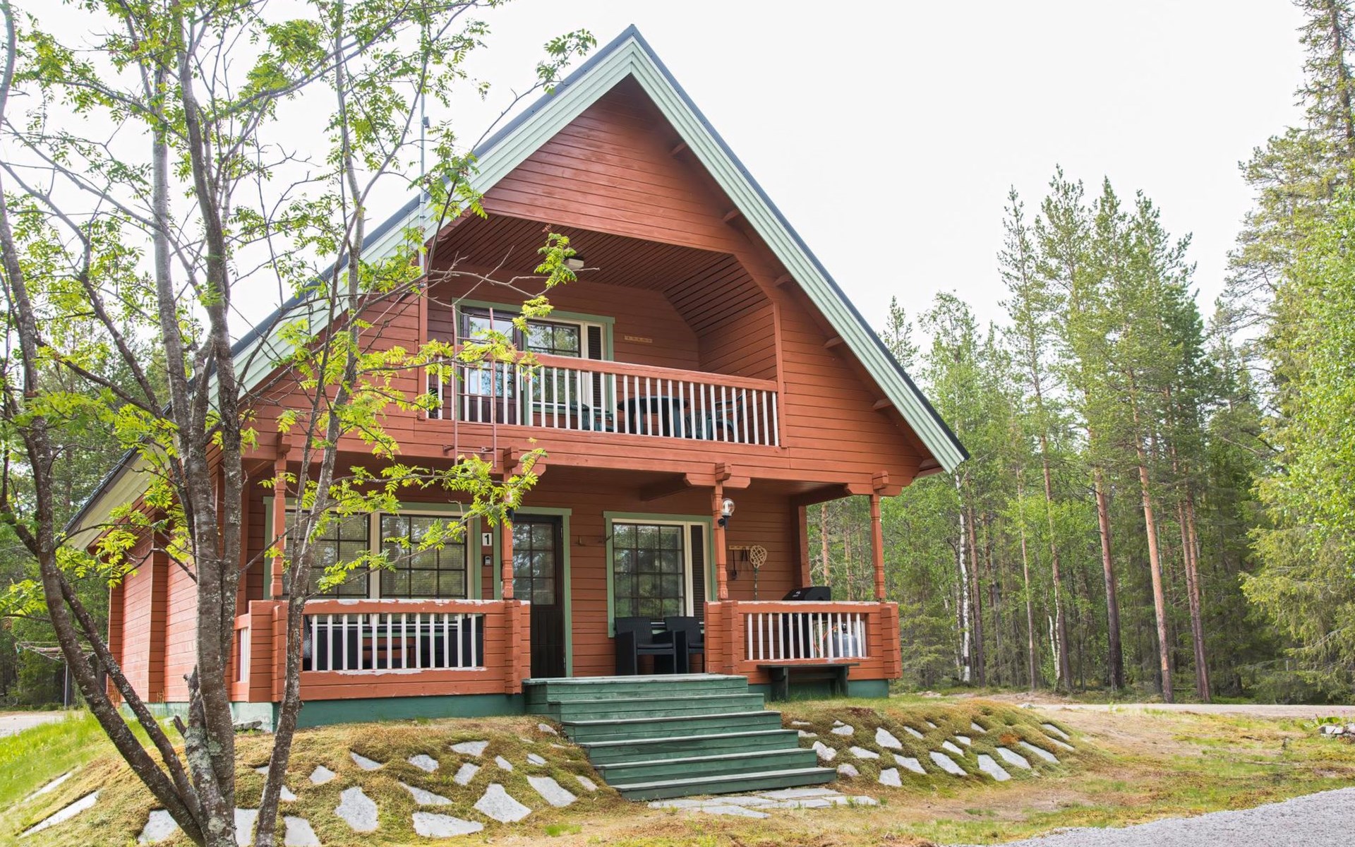 Log cabin on the edge of the three cabin community, built in 1990. Facilities on two floors, downstairs living room, kitchen, bedroom with a double bed, separate toilet and covered terrace.