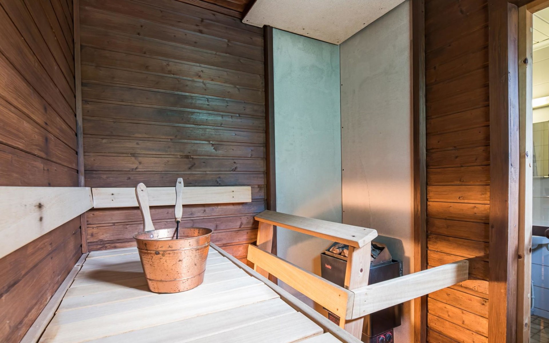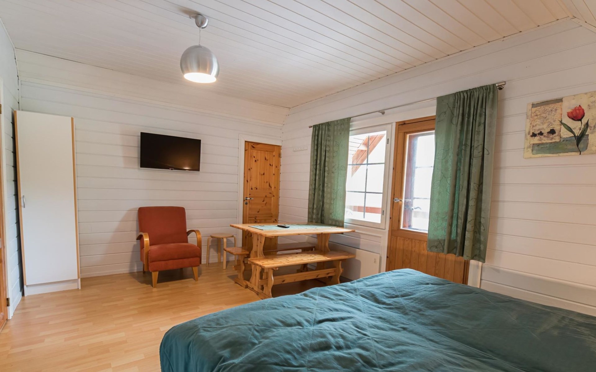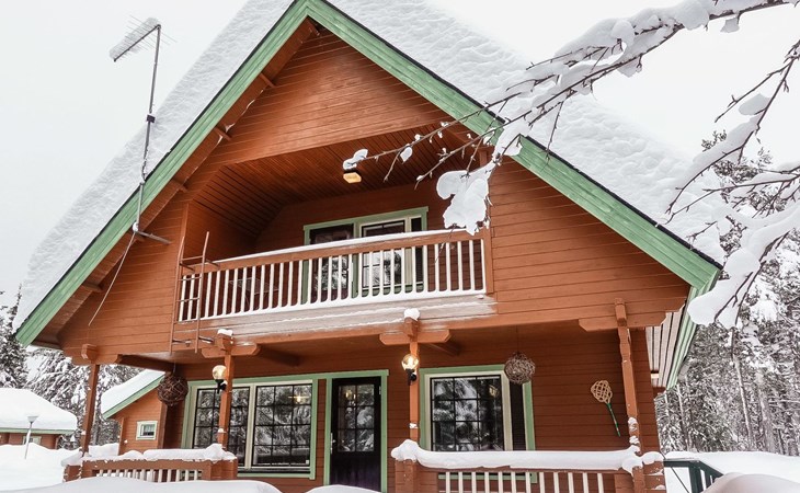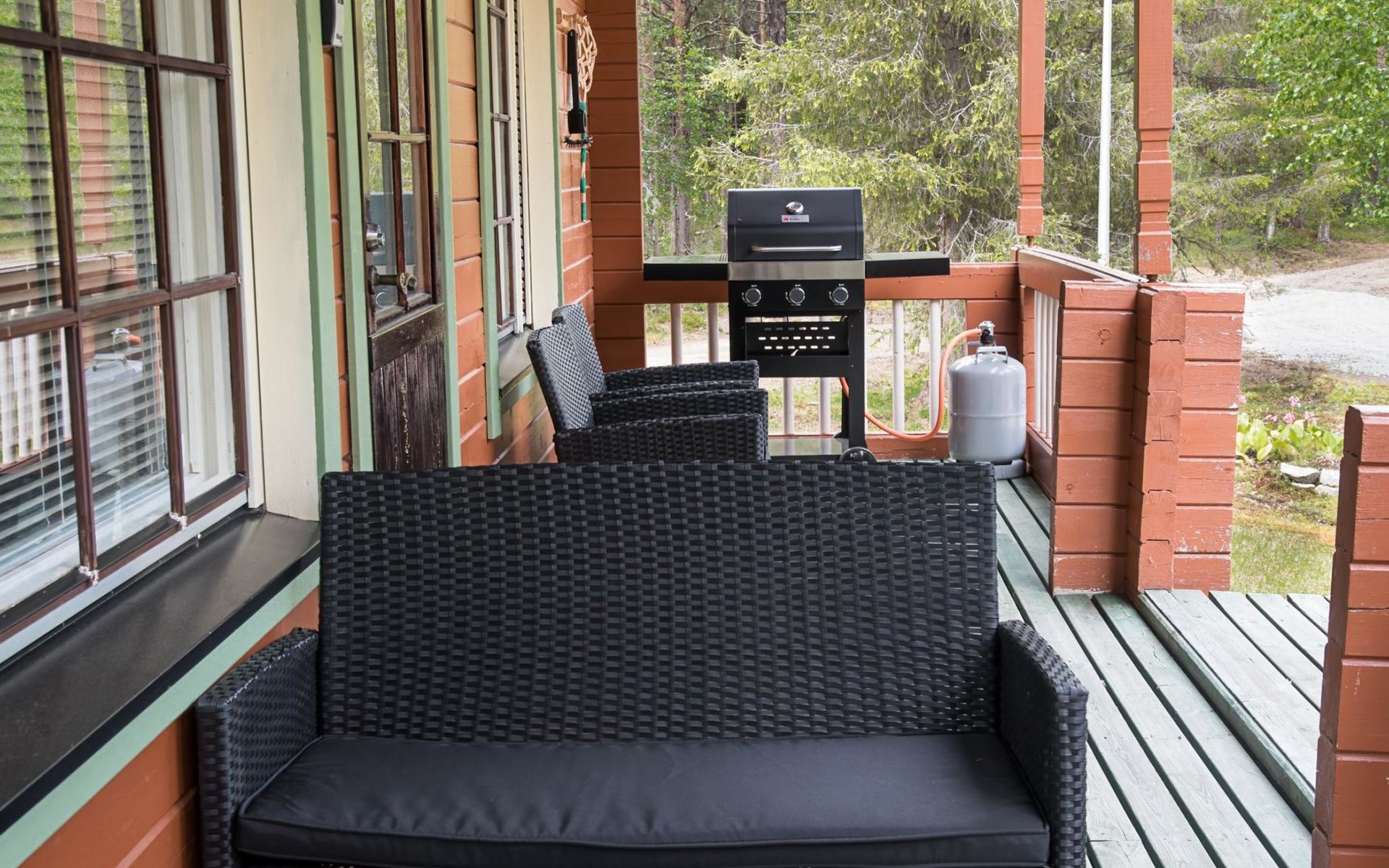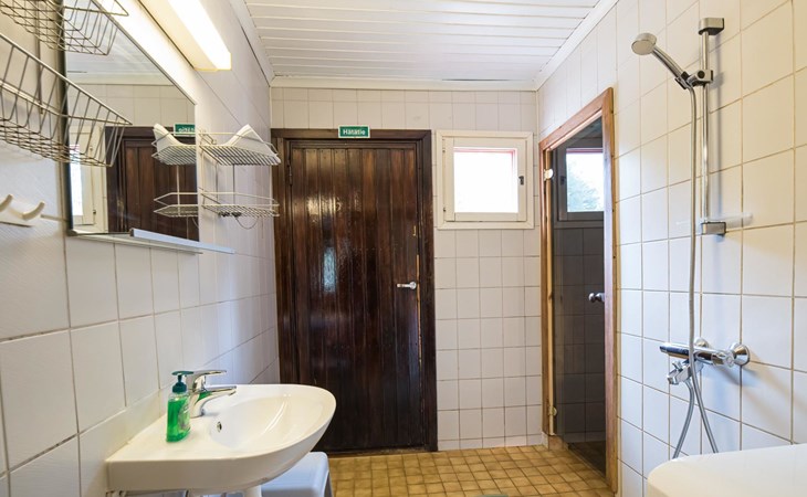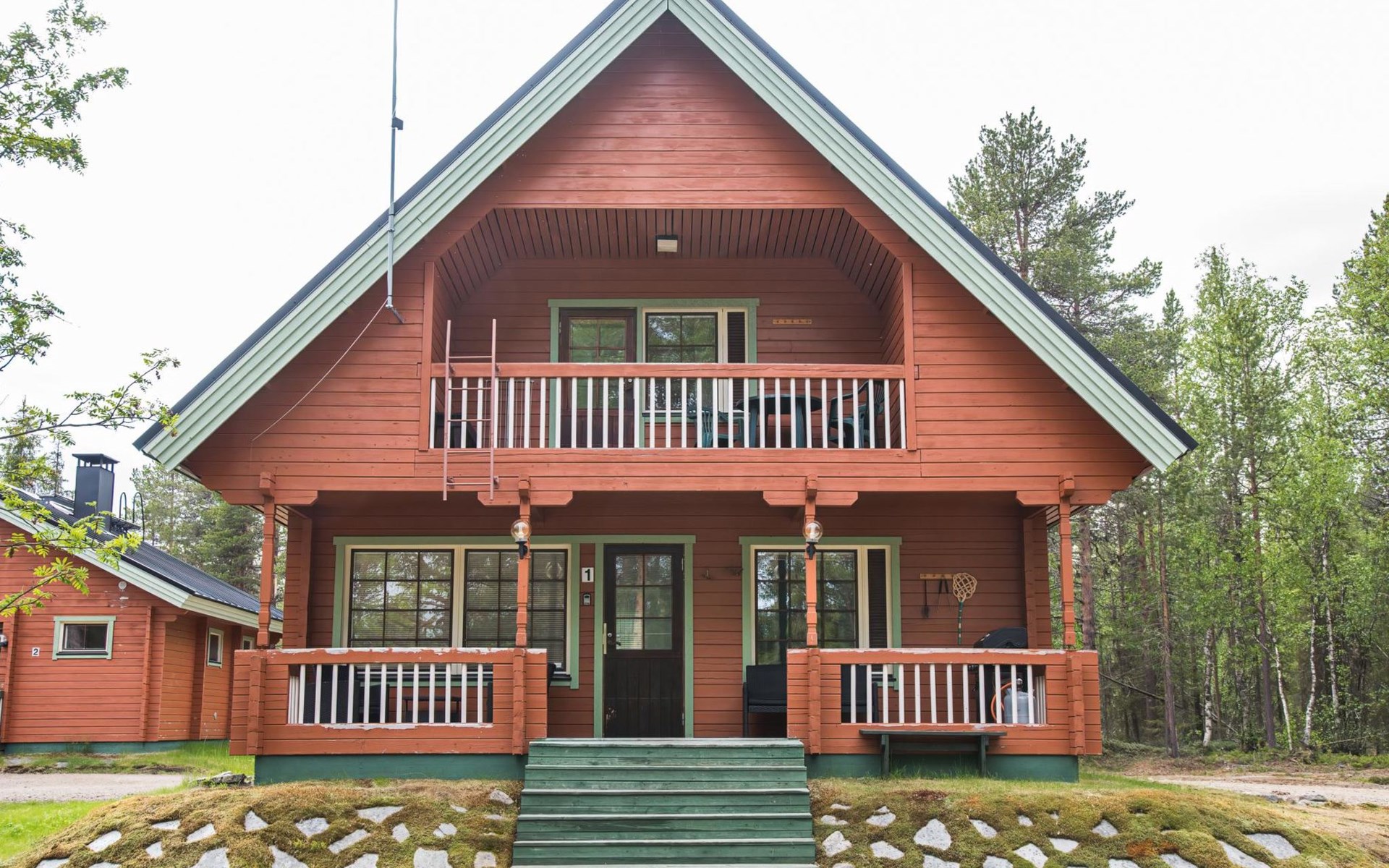 Log cabin on the edge of the three cabin community, built in 1990. Facilities on two floors, downstairs living room, kitchen, bedroom with a double bed, separate toilet and covered terrace.