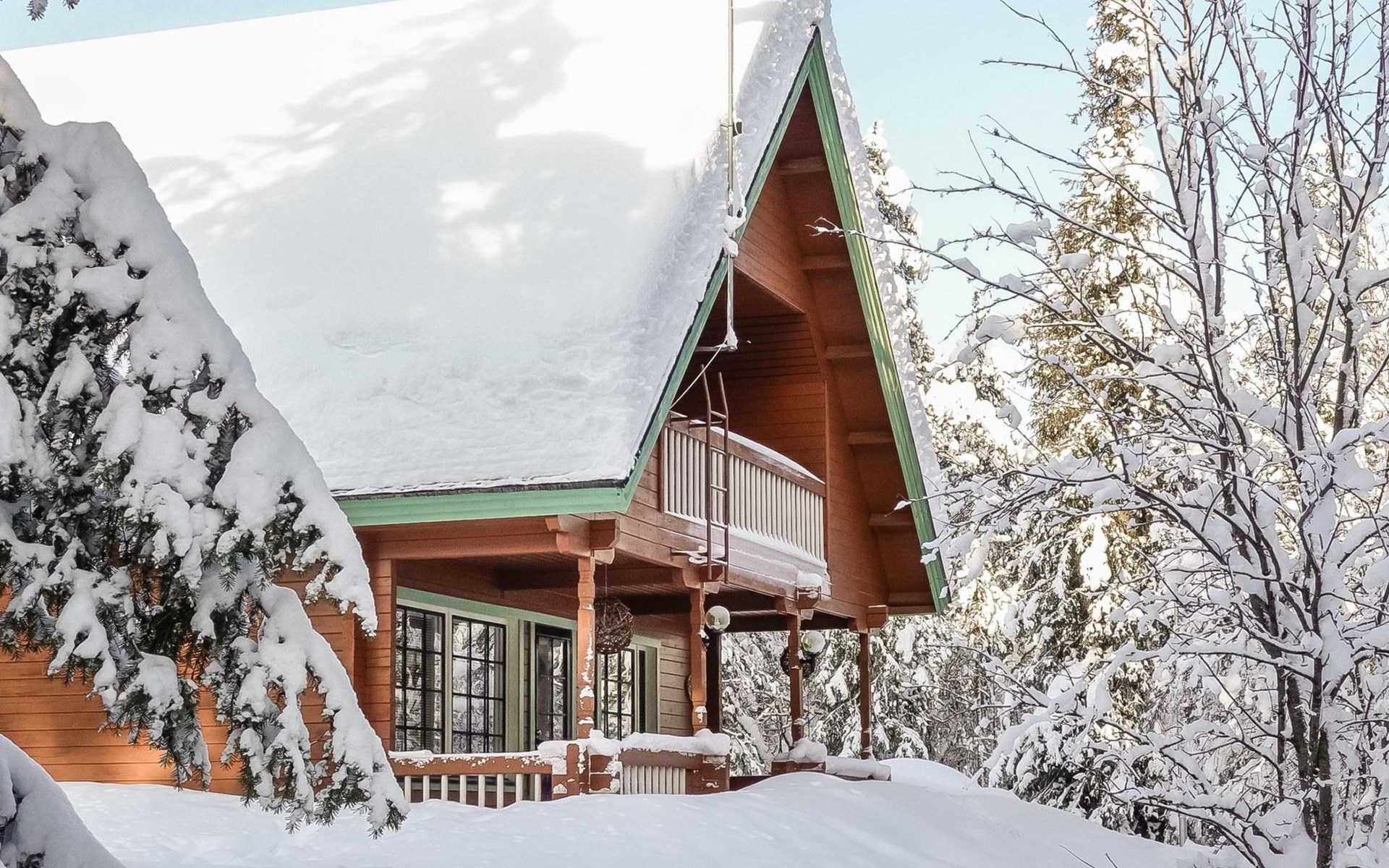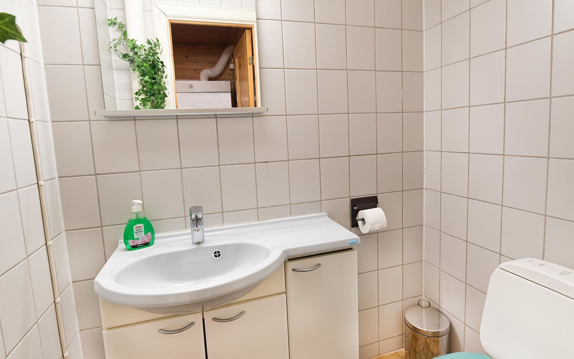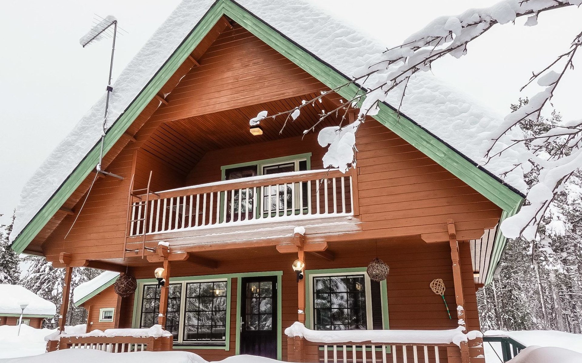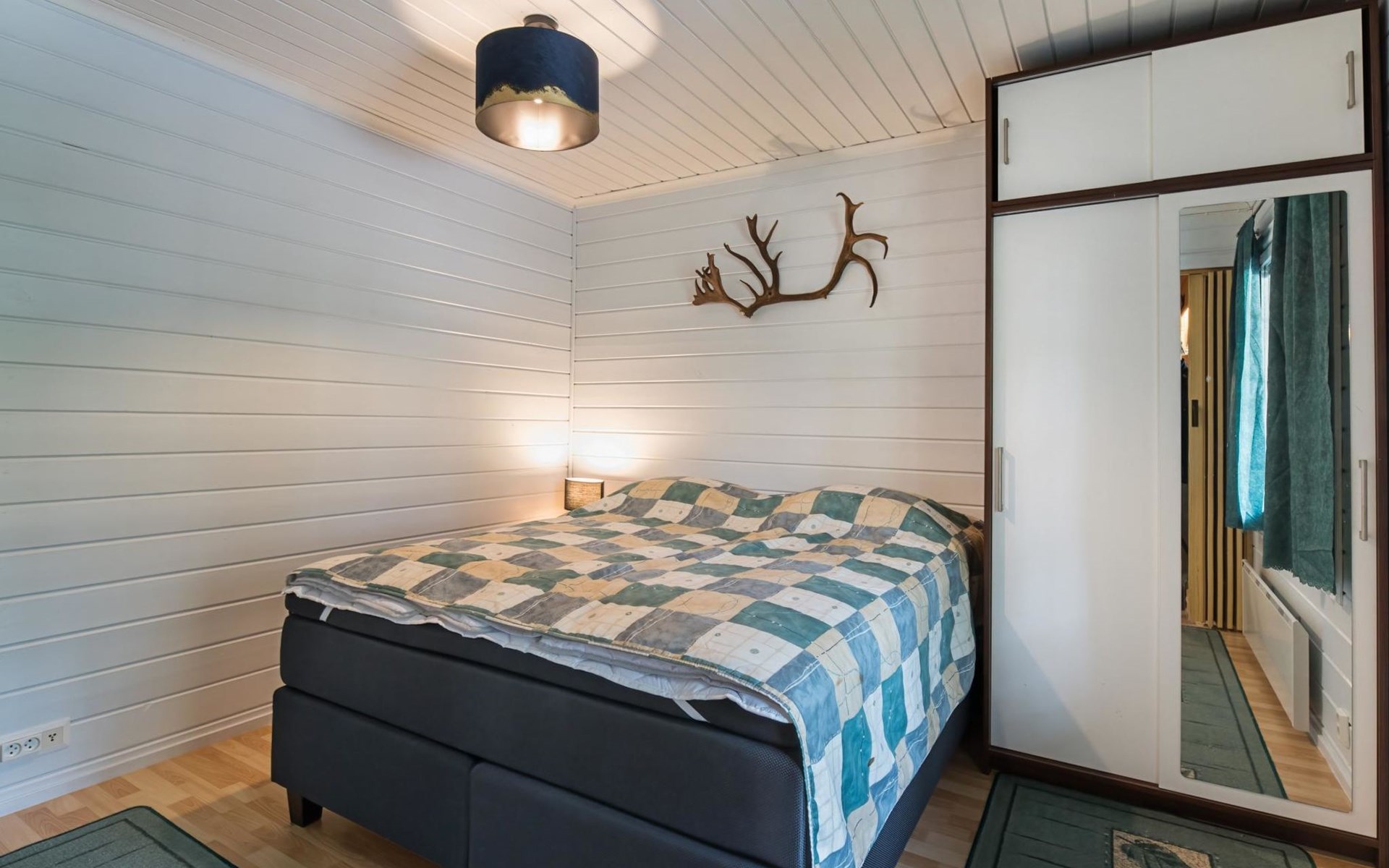 Log cabin on the edge of the three cabin community, built in 1990. Facilities on two floors, downstairs living room, kitchen, bedroom with a double bed, separate toilet and covered terrace.