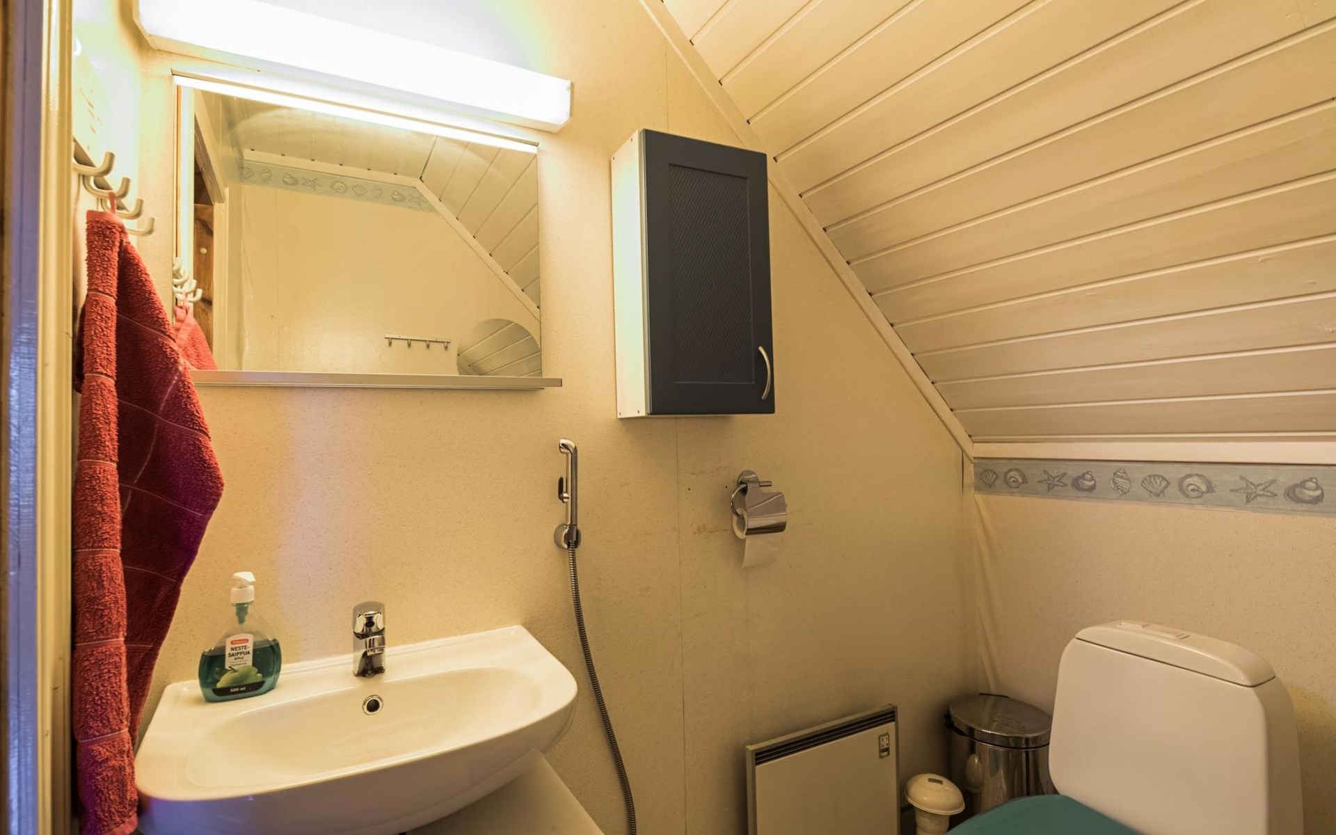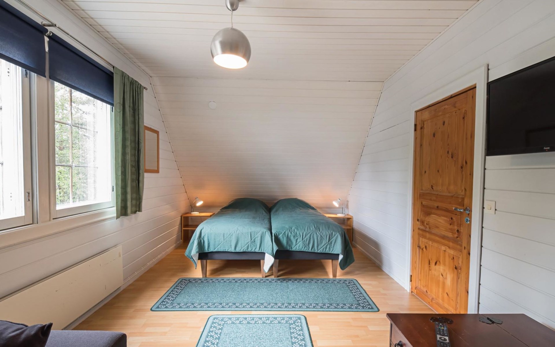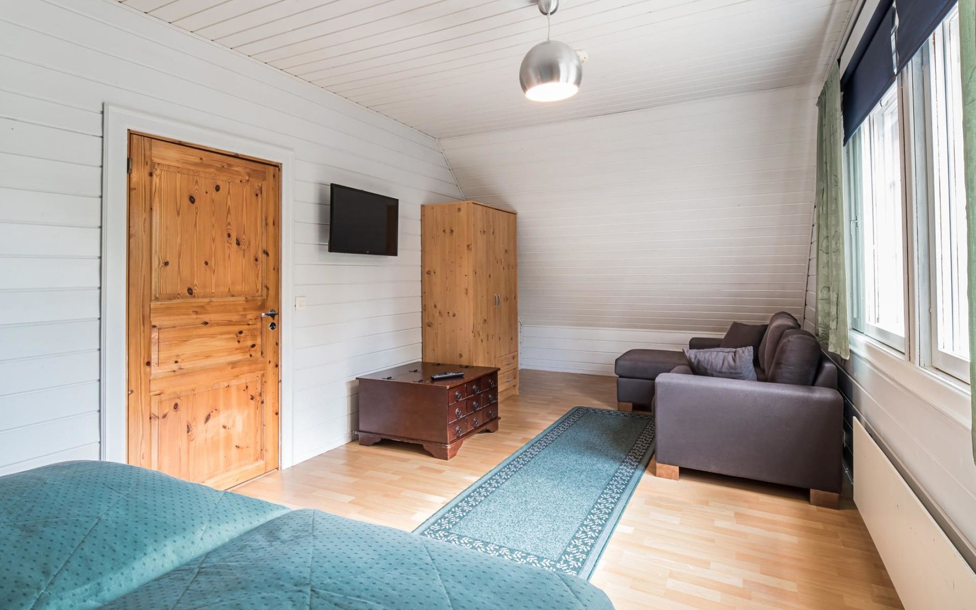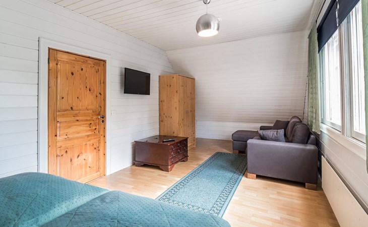 Upstairs bedroom with double bed, upstairs in the second bedroom 2 beds and a sofa, toilet. Access to balcony from the bedroom.