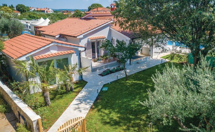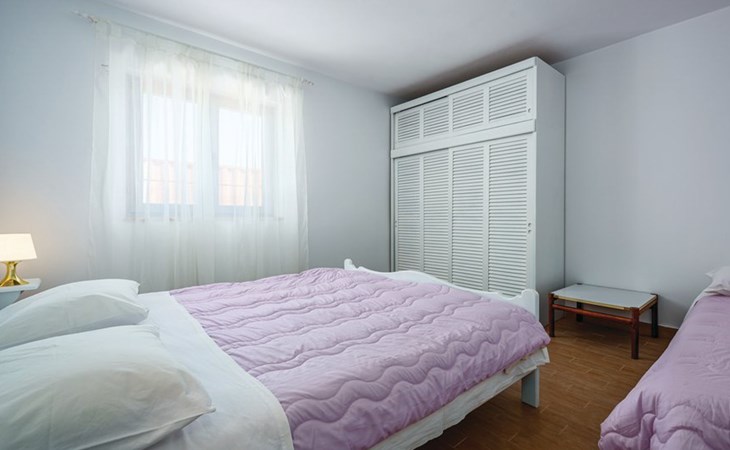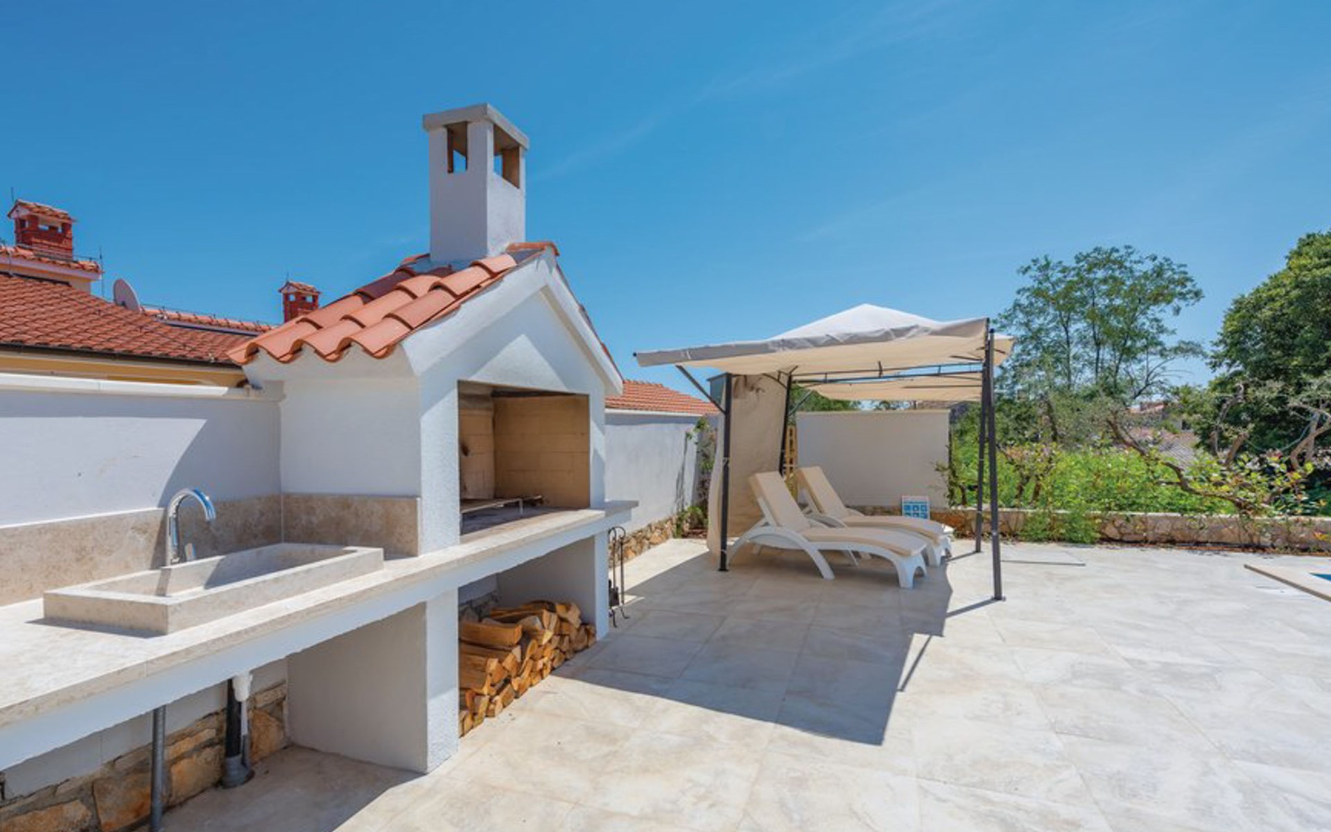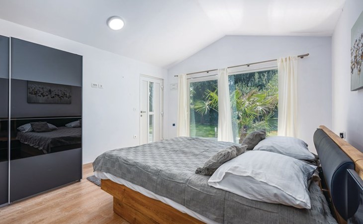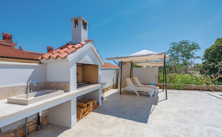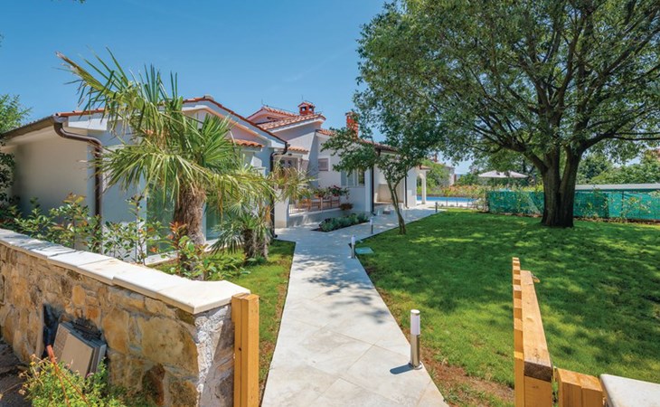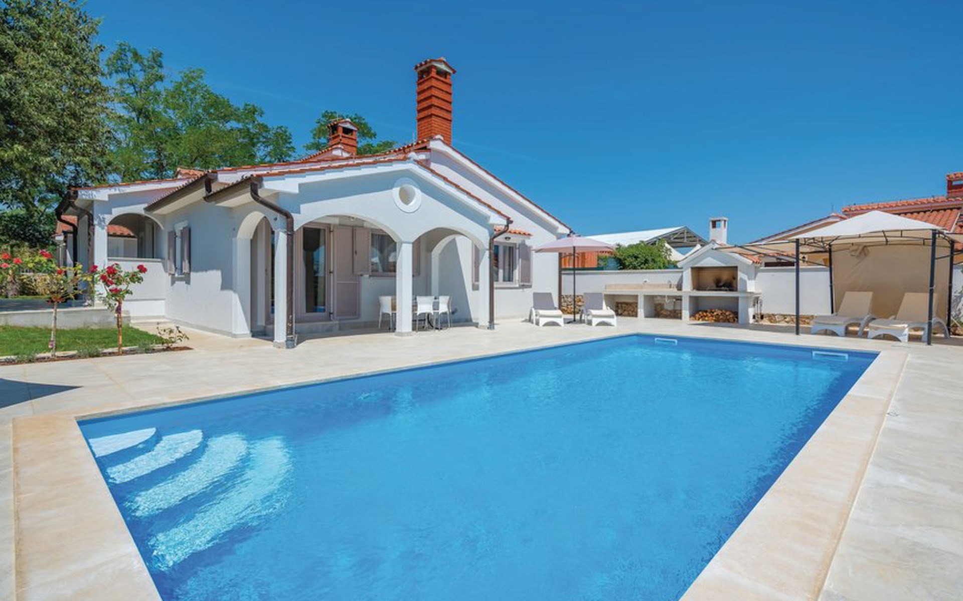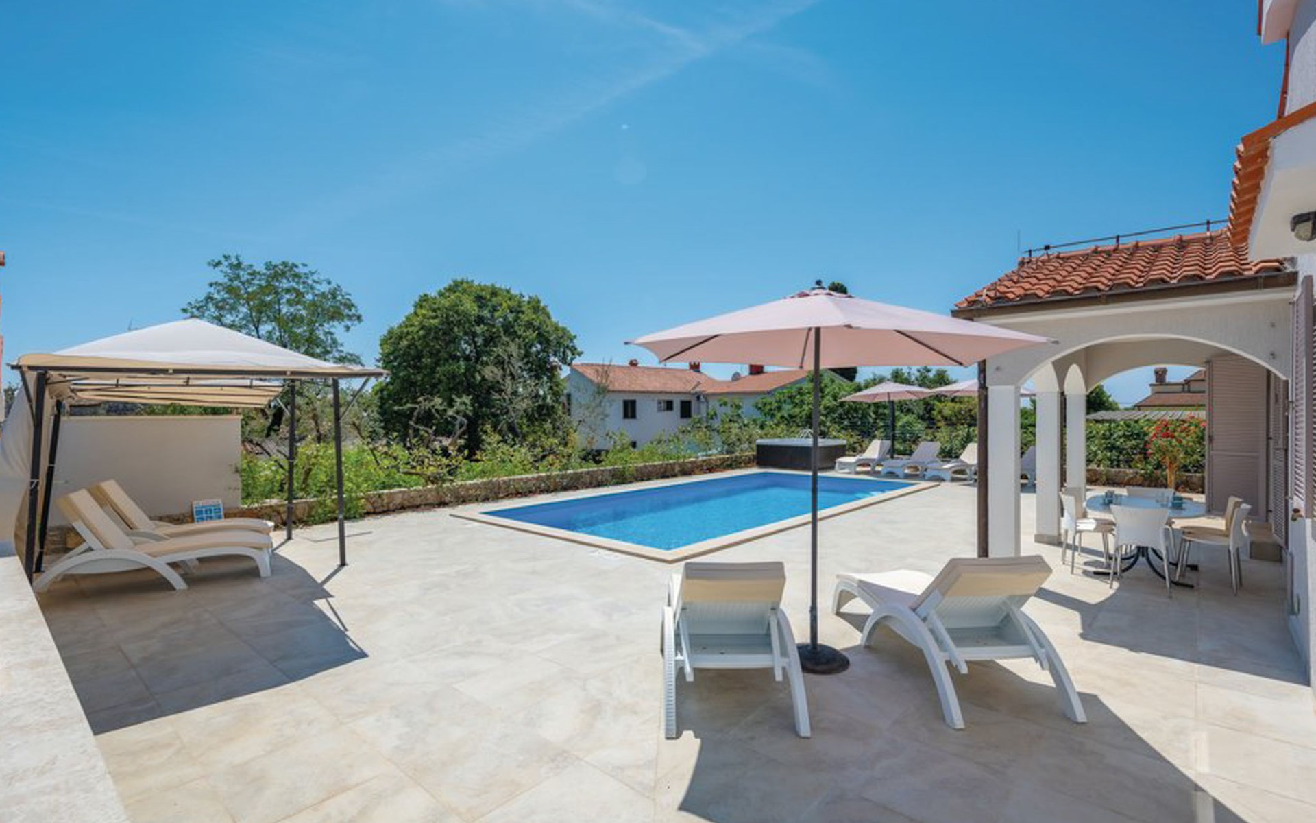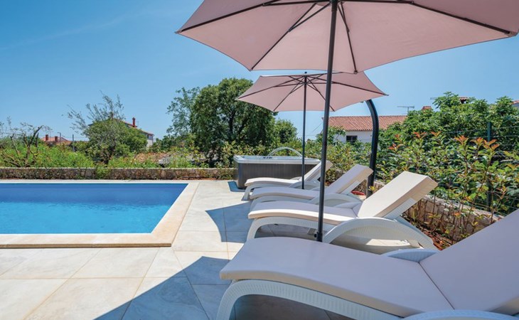 Tar 7 km from Poreč: Single-family house "Alice". In the hamlet Vabriga 1 km from the centre of Tar, in a quiet position, 4 km from the sea, 4 km from the beach, in a cul-de-sac. Private: property 800 m2 (fenced), lawn 200 m2 flowers, natural garden, swimming pool angular (4 x 8 m, depth 135 cm, seasonal availability: 01.May. - 30.Sep.) with internal staircase. Outdoor shower, hot tub, garden furniture, barbecue. In the house: internet access, washing machine. Parking at the house on the premises. Shop 50 m, supermarket 100 m, restaurant 50 m, pedestrian zone 100 m, bus stop 1 km, pebble beach 4 km, shingle beach 4 km, rocky beach 4 km. Please note: suitable for families. The owner does not accept any groups.