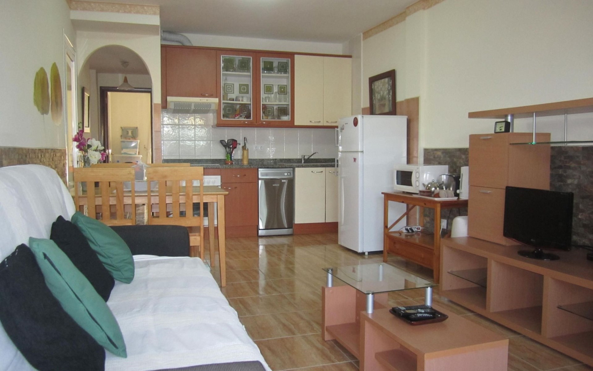 This functional flat is designed with your comfort in mind, providing everything you need for a pleasant stay. It has two bedrooms, one of which has a cot for the little ones, ensuring a restful night's sleep for the whole family. Complementing the accommodation is a practical kitchen-dining room equipped with a dishwasher and coffee machine, ensuring that holiday meals are as comfortable as they are at home. For added convenience, you'll find a washing machine for exclusive use, ideal for long stays or for quickly cleaning beach equipment. In addition, a fan provides relief on the hottest days.
