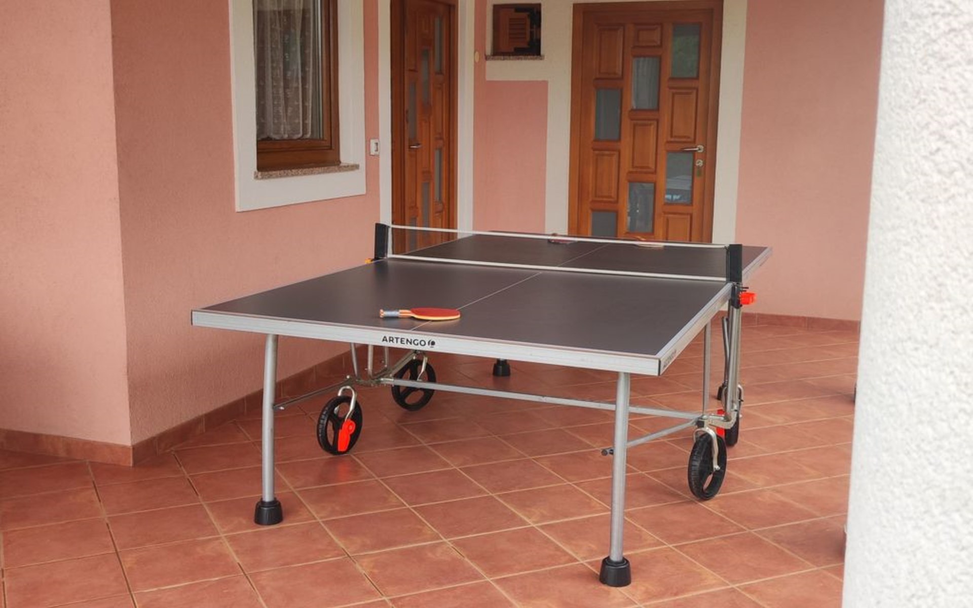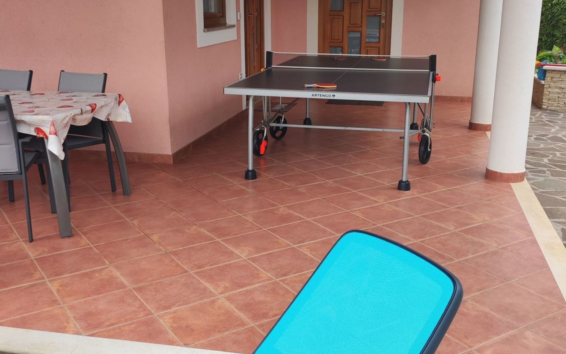 The ground floor house has a covered terrace of 40 m2, with dining table and table tennis for entertaining, right next to the kitchen, overlooking the pool.