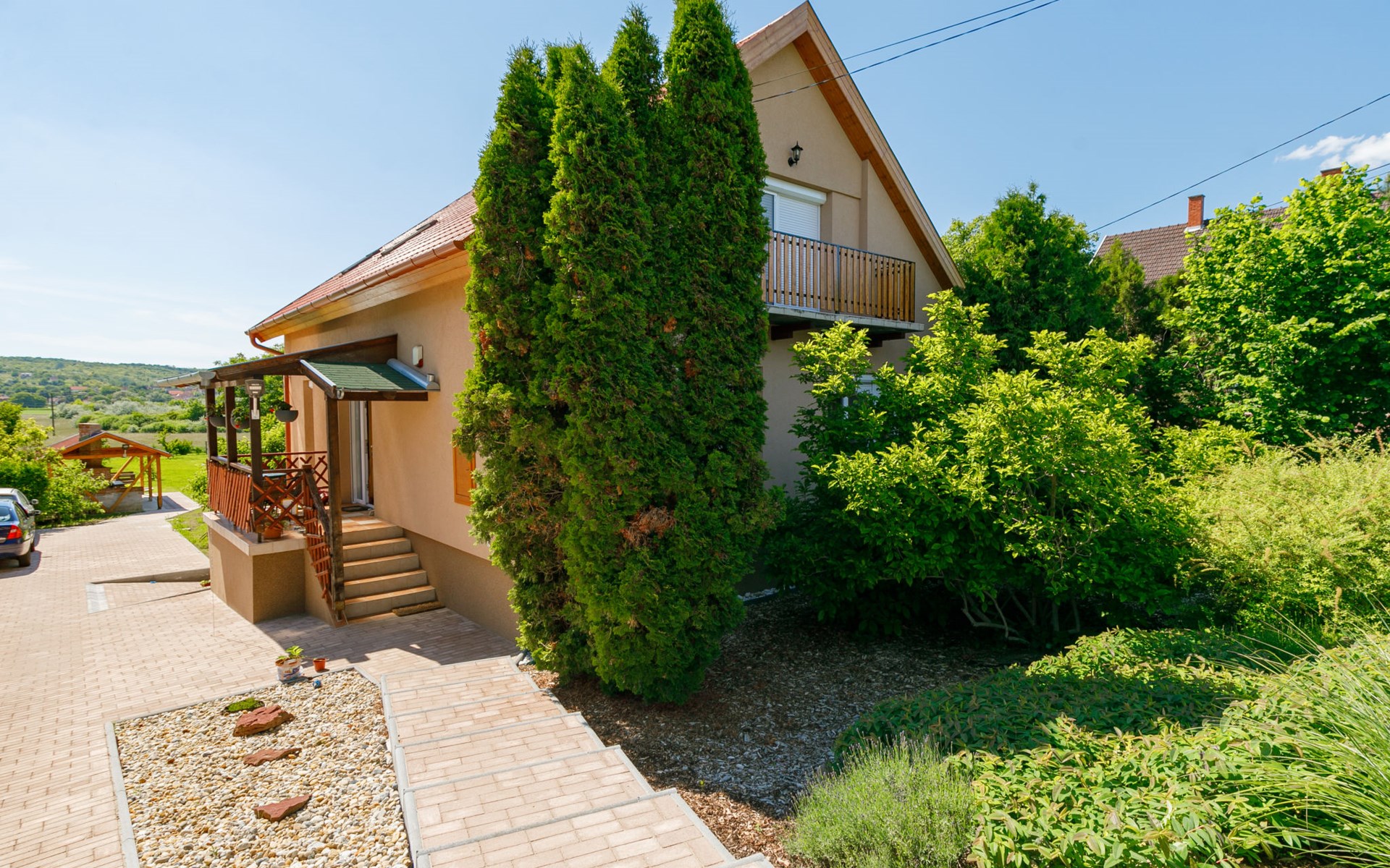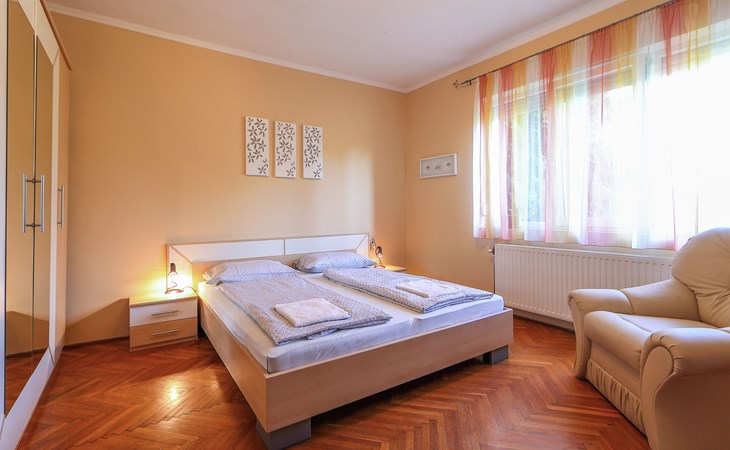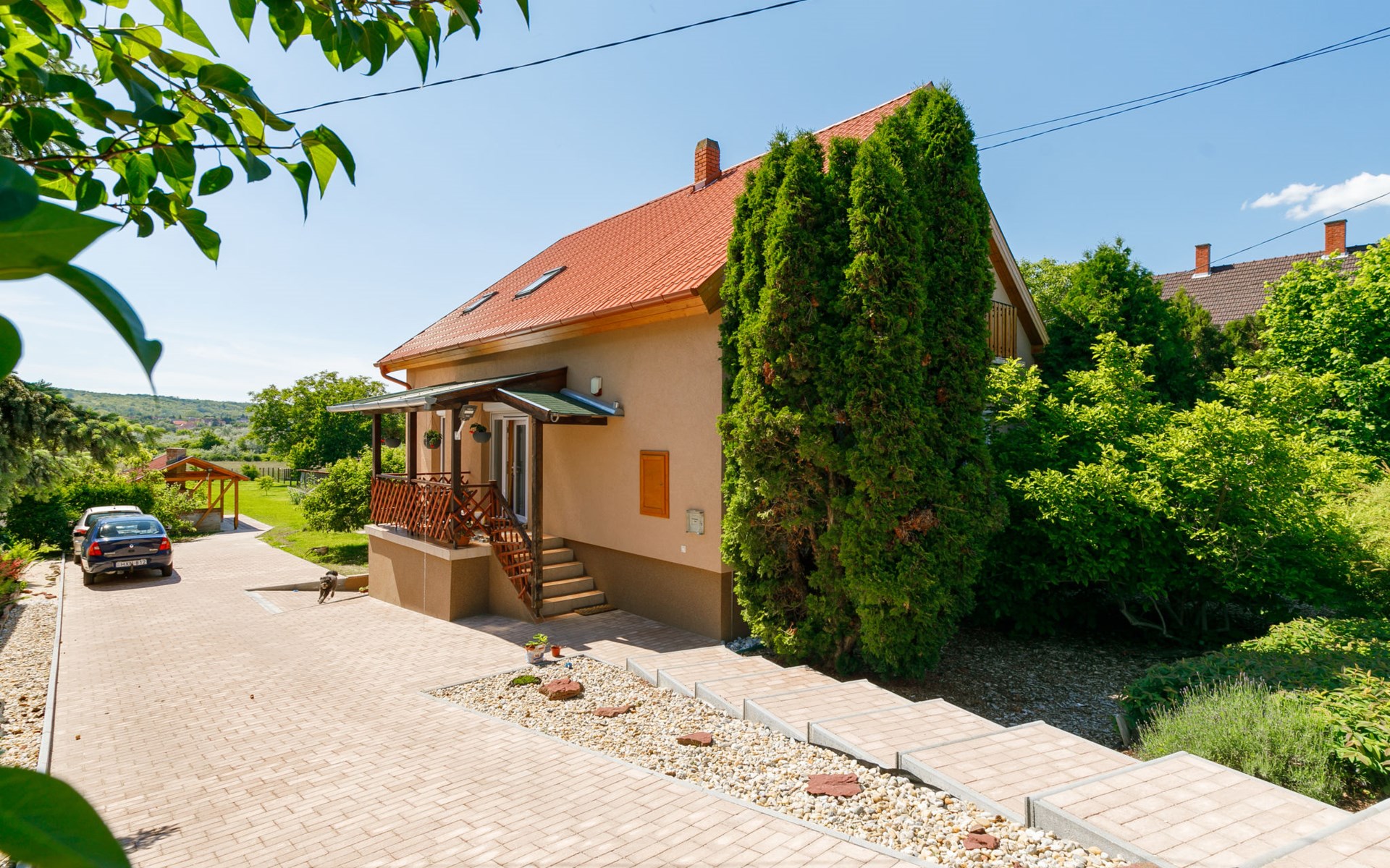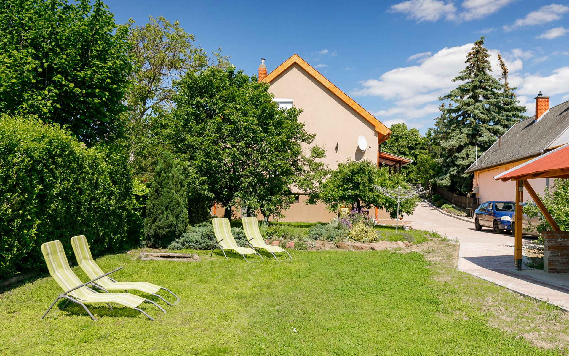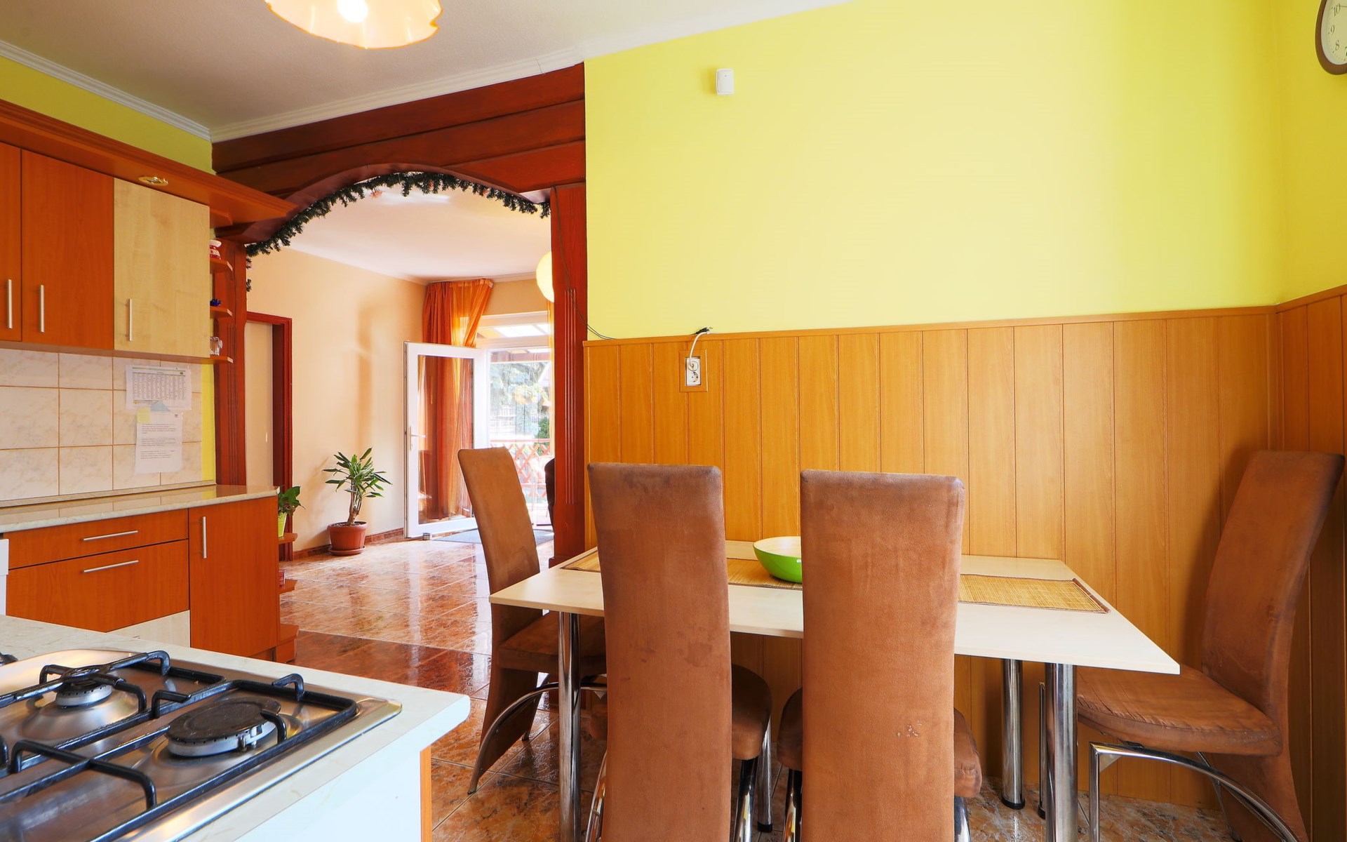 Kőröshegy 3 km from Balatonföldvár: Cosy single-family house "Beata", 2 storeys, renovated in 2020. In the resort, 3.5 km from the lake, 3.2 km from the beach. Private: large garden (fenced) with lawn and trees, orchard. Patio, barbecue (sandbox). In the house: WiFi, air conditioning, washing machine. Parking (for 3 cars) at the house. Grocery 1 km, supermarket 2.3 km, shopping centre 2.3 km, restaurant 1 km, café 2.5 km, bus stop "Szántód" 2.3 km, railway station "Szántód-Kőröshegy" 2.5 km, ferry "Szántód-Tihany" 4.5 km, grass beach "Balatonföldvár" 3.4 km, thermal baths "Igal Thermal Bath" 36 km. Marina 3.8 km, sailing school 4 km, tennis 4.8 km, cycle lane 2.5 km, children's playground 3.4 km. Nearby attractions: Kőröshegy Lavender Farm 2.6 km, Balatonföldvár Look-out Tower 5 km, Shipping History Exibition 5 km, Balaton Sound Festival 6.4 km. Please note: baby equipment on request (included).