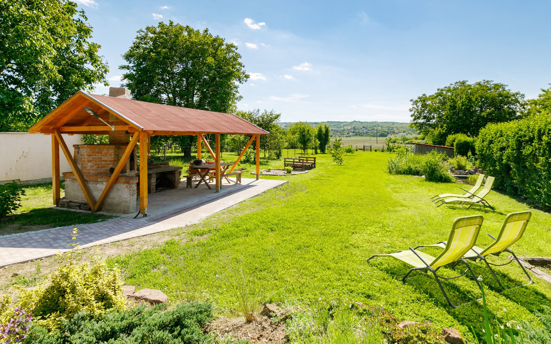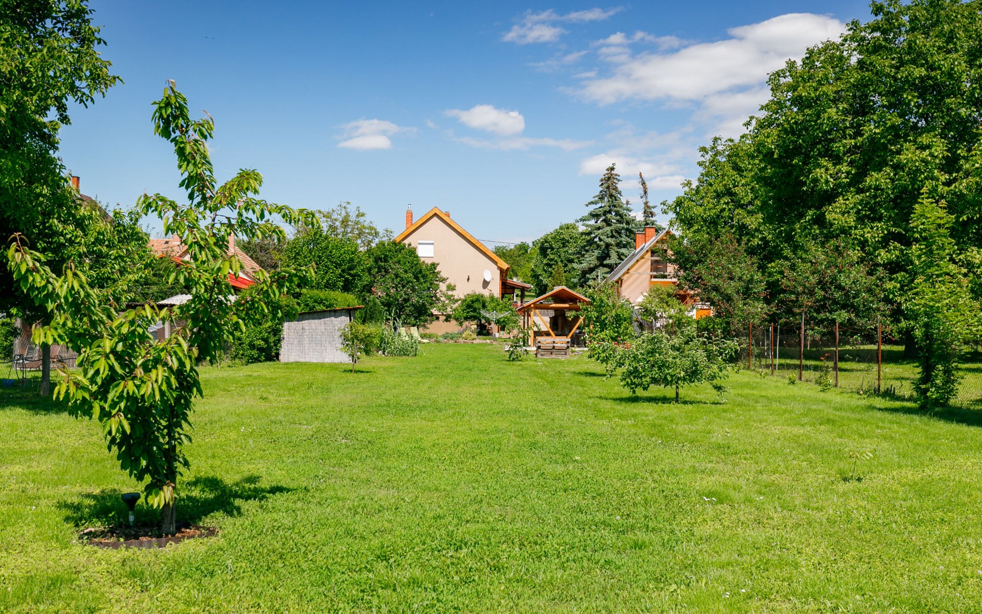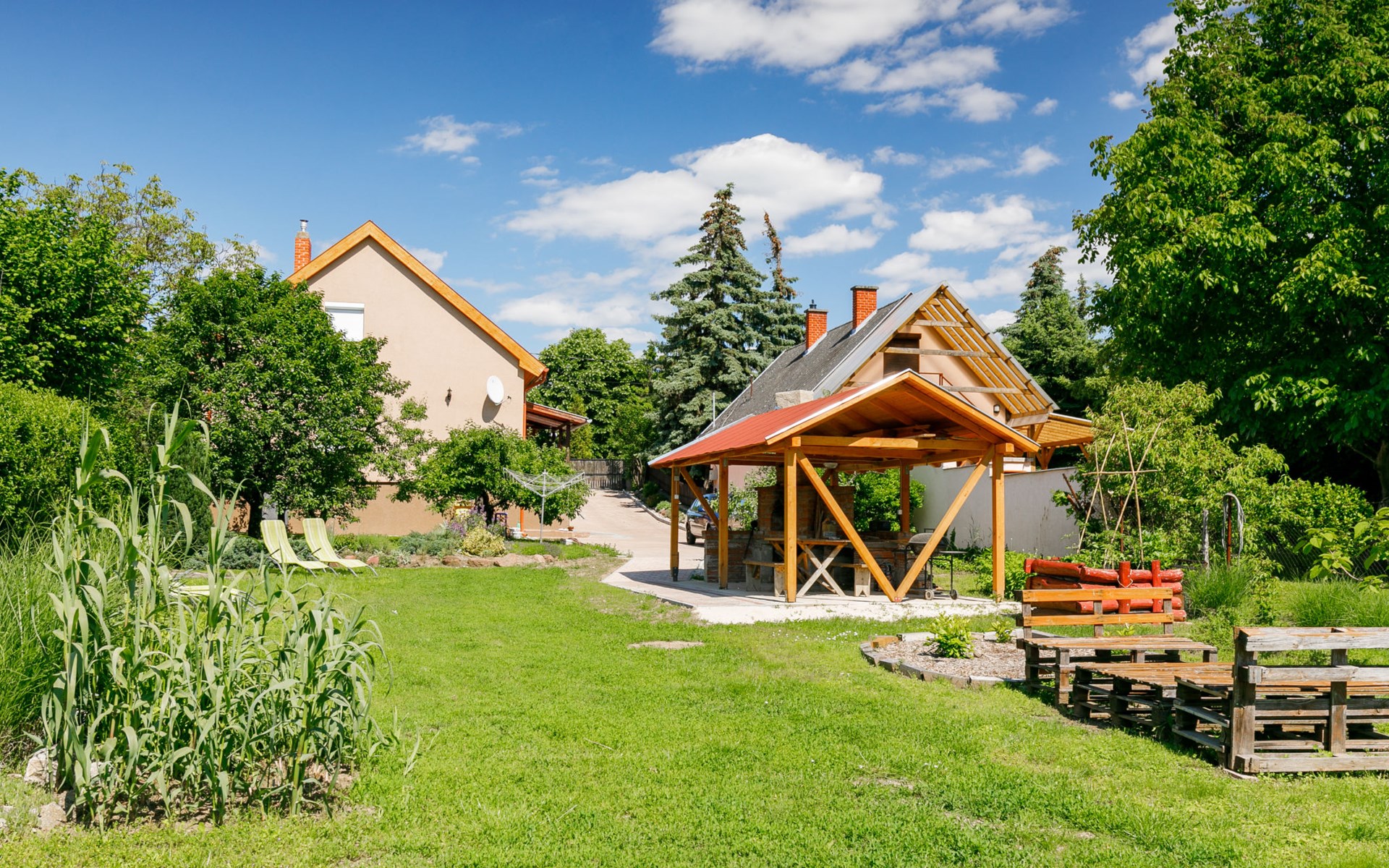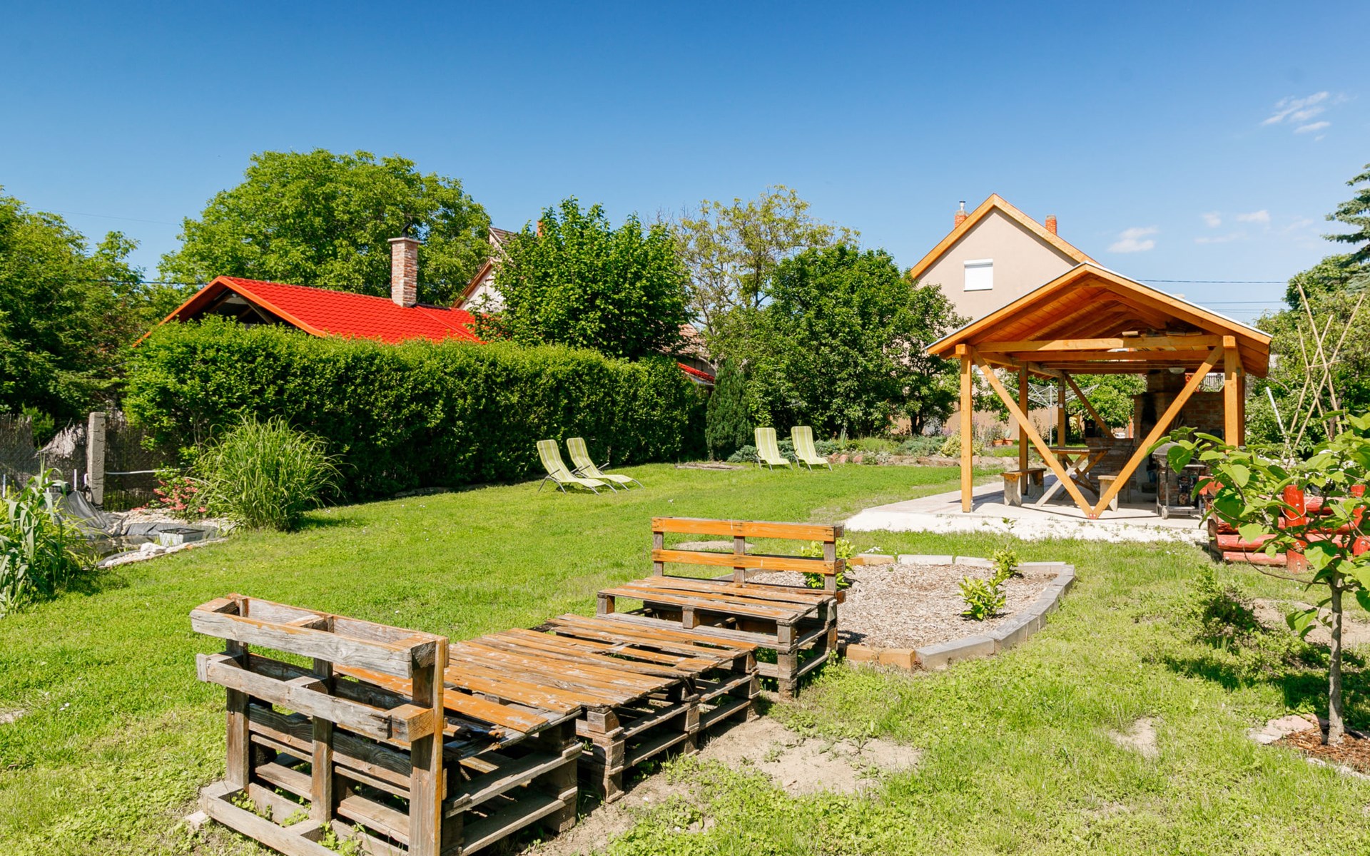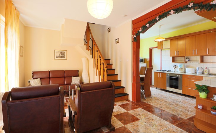 Kőröshegy 3 km from Balatonföldvár: Cosy single-family house "Beata", 2 storeys, renovated in 2020. In the resort, 3.5 km from the lake, 3.2 km from the beach. Private: large garden (fenced) with lawn and trees, orchard. Patio, barbecue (sandbox). In the house: WiFi, air conditioning, washing machine. Parking (for 3 cars) at the house. Grocery 1 km, supermarket 2.3 km, shopping centre 2.3 km, restaurant 1 km, café 2.5 km, bus stop "Szántód" 2.3 km, railway station "Szántód-Kőröshegy" 2.5 km, ferry "Szántód-Tihany" 4.5 km, grass beach "Balatonföldvár" 3.4 km, thermal baths "Igal Thermal Bath" 36 km. Marina 3.8 km, sailing school 4 km, tennis 4.8 km, cycle lane 2.5 km, children's playground 3.4 km. Nearby attractions: Kőröshegy Lavender Farm 2.6 km, Balatonföldvár Look-out Tower 5 km, Shipping History Exibition 5 km, Balaton Sound Festival 6.4 km. Please note: baby equipment on request (included).