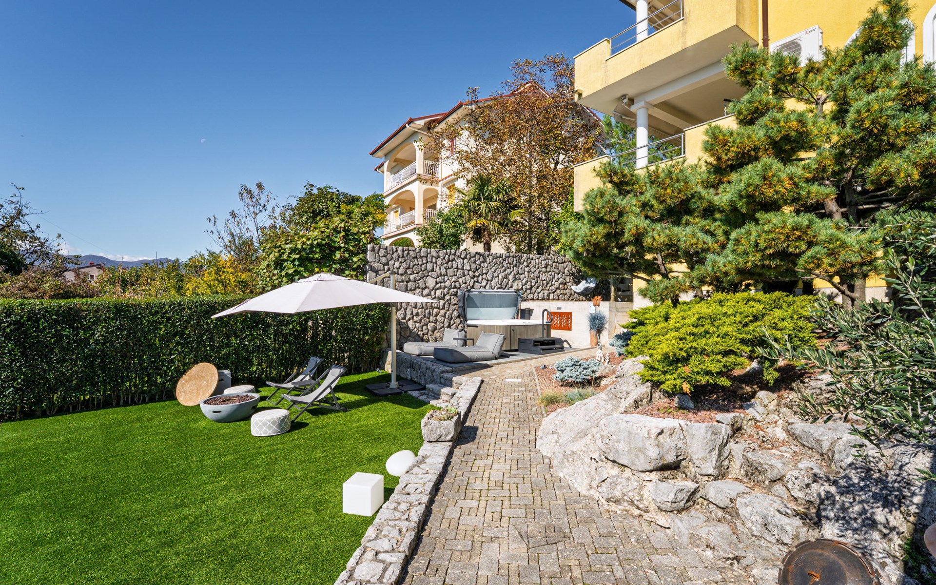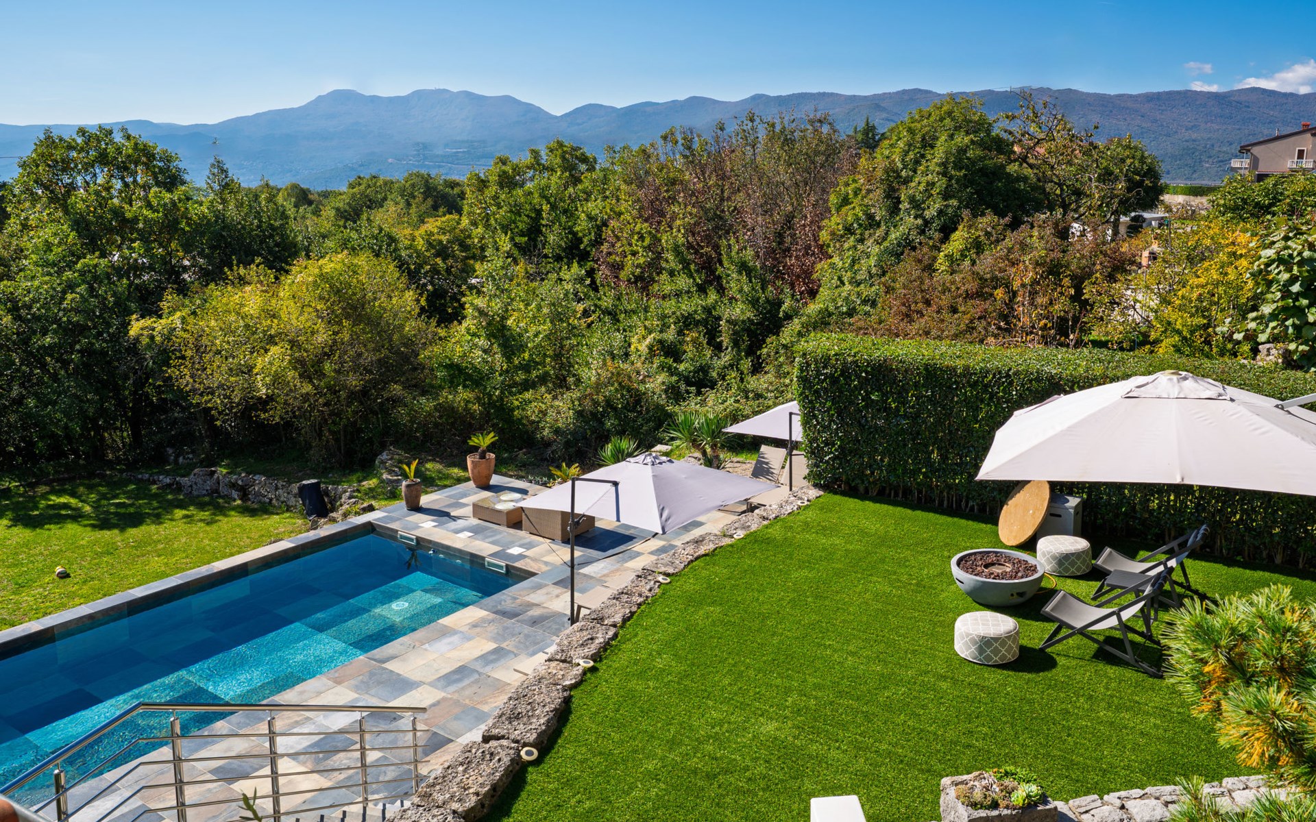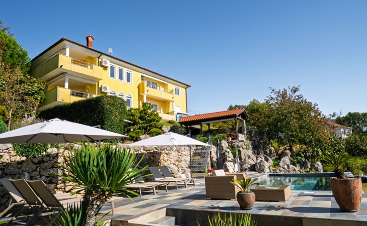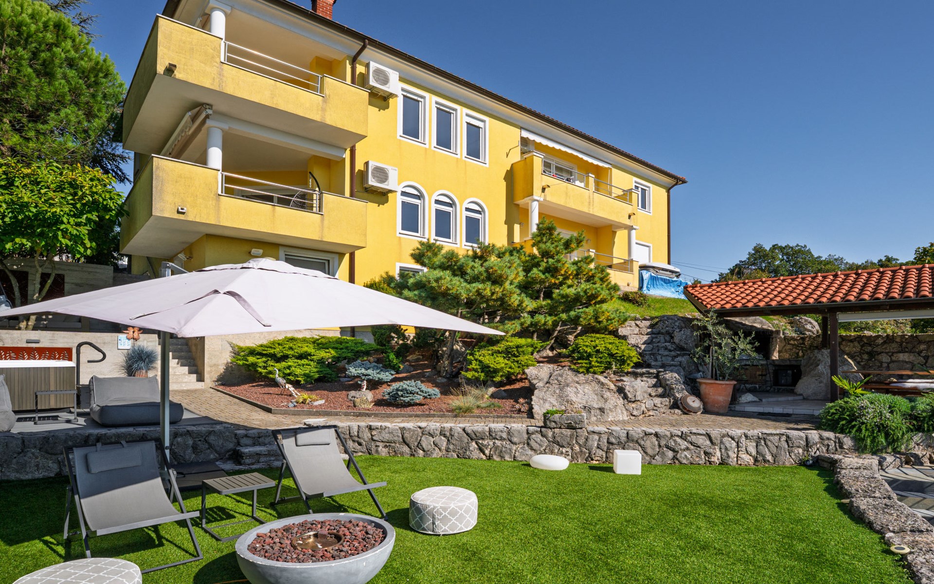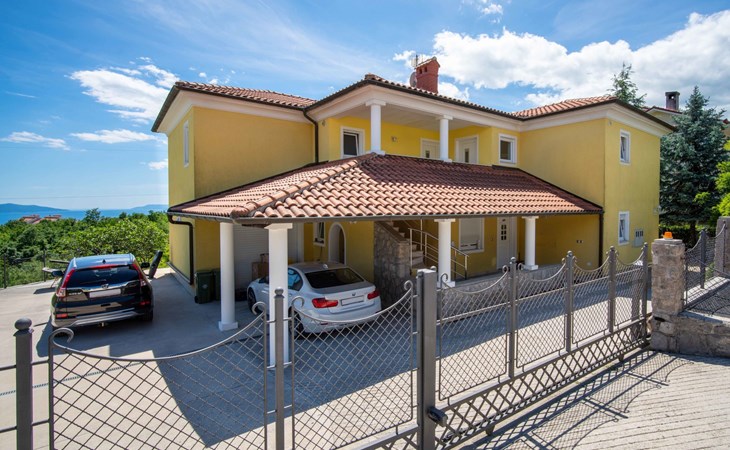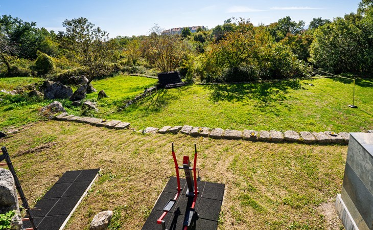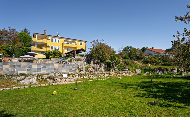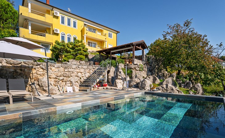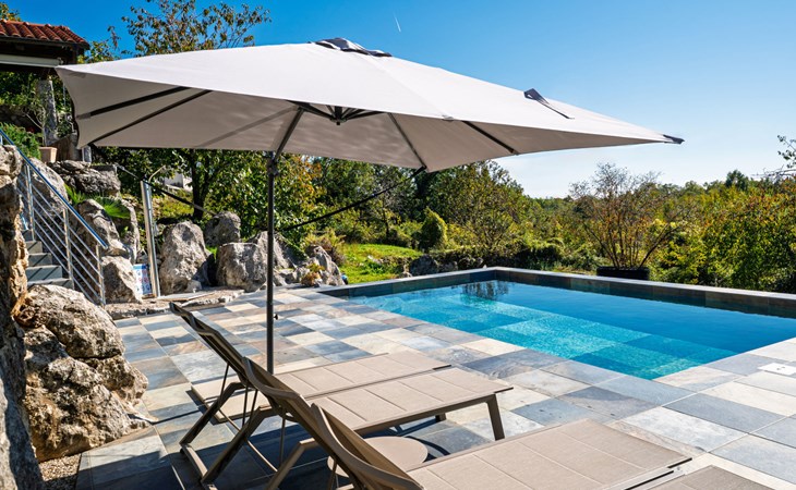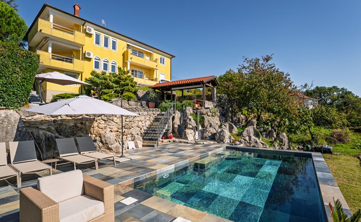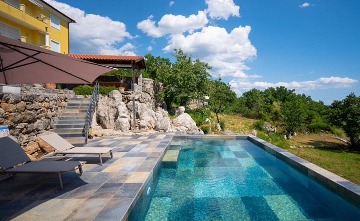 Kastav 7 km from Opatija: 3-family house "Kvarner house". 850 m from the centre of Kastav, 9.5 km from the centre of Rijeka, in a quiet, sunny, elevated position, 5.5 km from the sea. For shared use: property 2'000 m2 with lawn and plants, swimming pool angular (7 x 4 m, depth 150 cm, seasonal availability: 01.May. - 01.Oct.) with internal staircase and salt-electrolysis pool-cleaning system. Outdoor shower, hot tub, terrace (30 m2), garden furniture, barbecue. In the house: internet access. Parking at the house on the premises. Shop, supermarket 650 m, restaurant 850 m, bus stop 500 m, pebble beach 5.5 km, concrete beach 5.5 km. ,The hot tub can be used all year round.