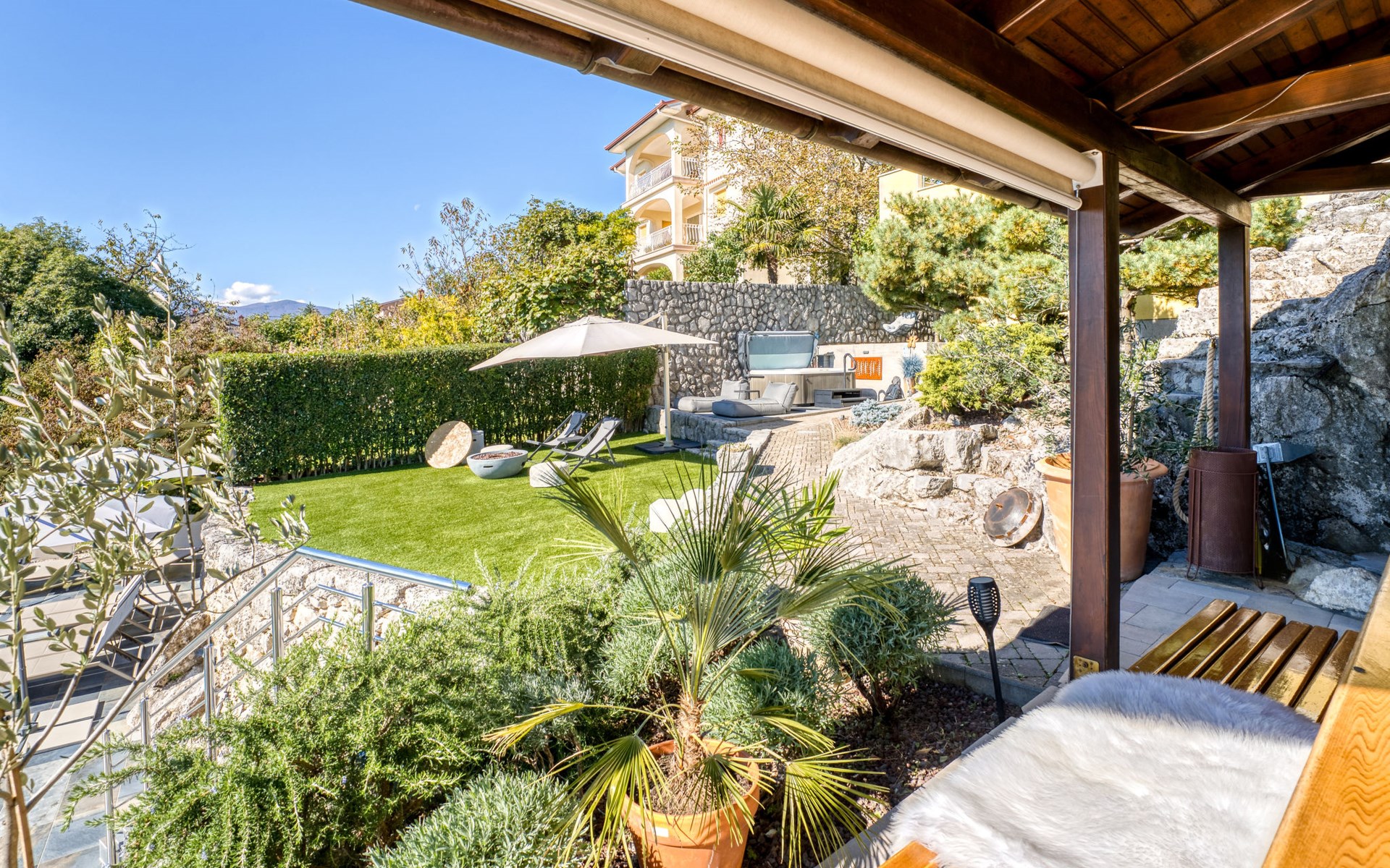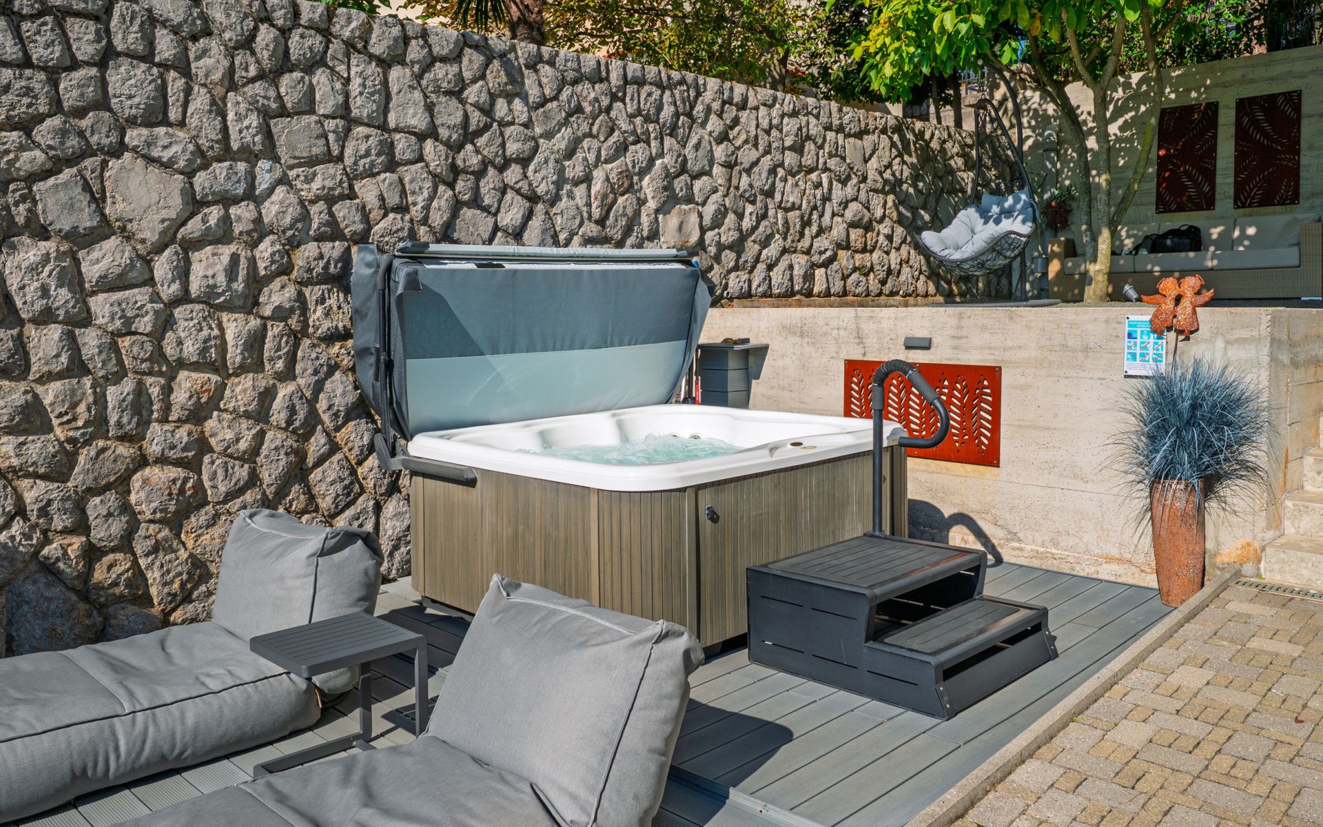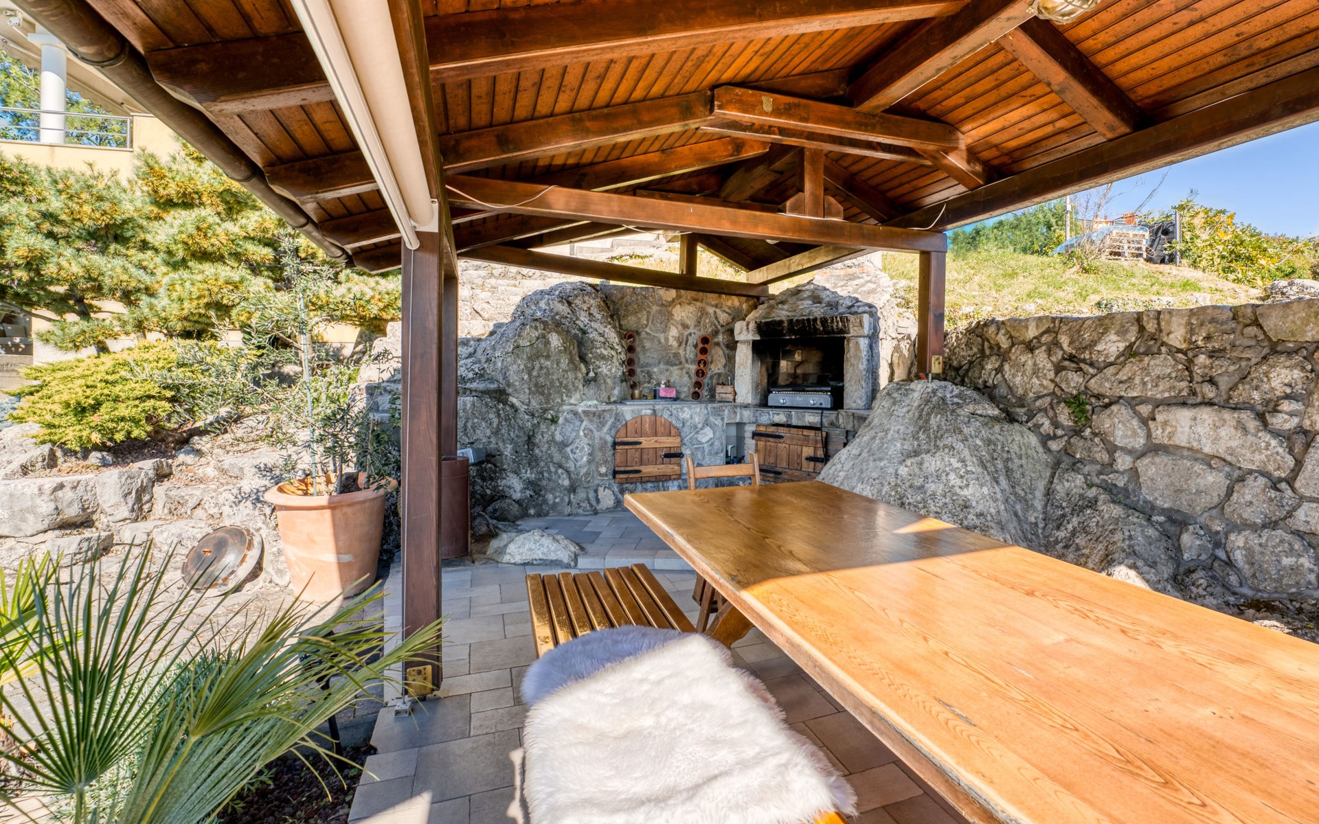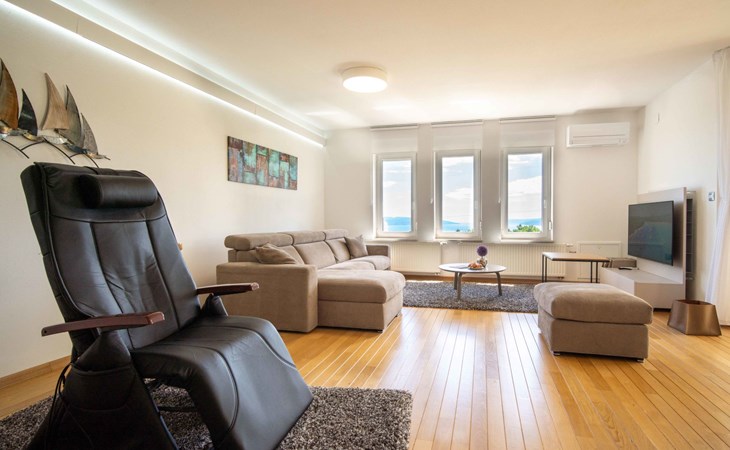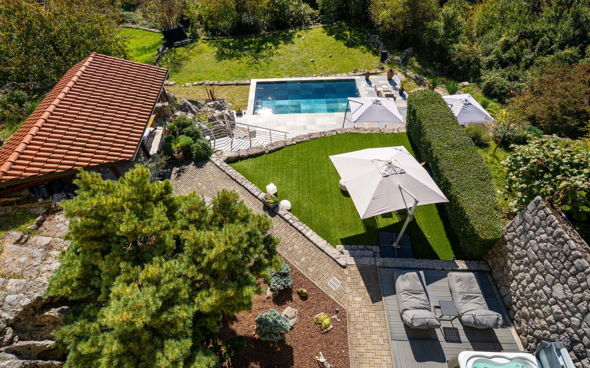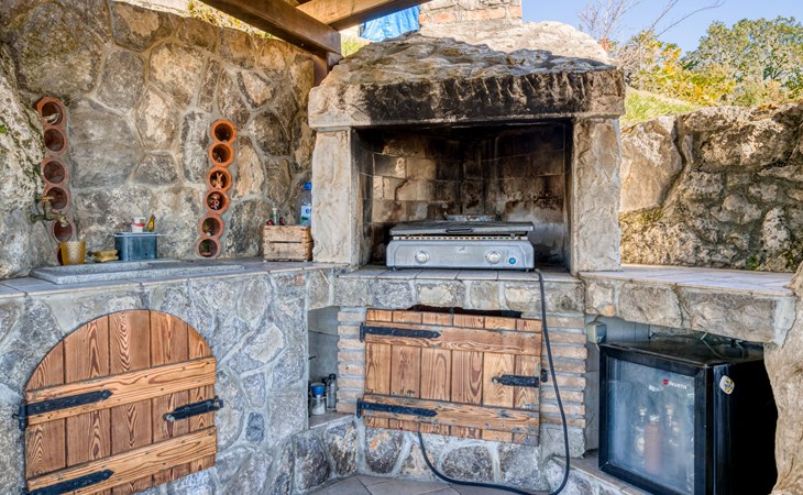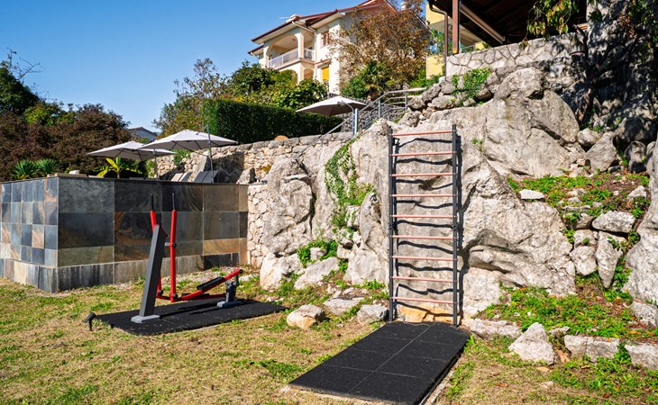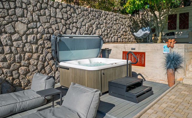 Kastav 7 km from Opatija: 3-family house "Kvarner house". 850 m from the centre of Kastav, 9.5 km from the centre of Rijeka, in a quiet, sunny, elevated position, 5.5 km from the sea. For shared use: property 2'000 m2 with lawn and plants, swimming pool angular (7 x 4 m, depth 150 cm, seasonal availability: 01.May. - 01.Oct.) with internal staircase and salt-electrolysis pool-cleaning system. Outdoor shower, hot tub, terrace (30 m2), garden furniture, barbecue. In the house: internet access. Parking at the house on the premises. Shop, supermarket 650 m, restaurant 850 m, bus stop 500 m, pebble beach 5.5 km, concrete beach 5.5 km. ,The hot tub can be used all year round.