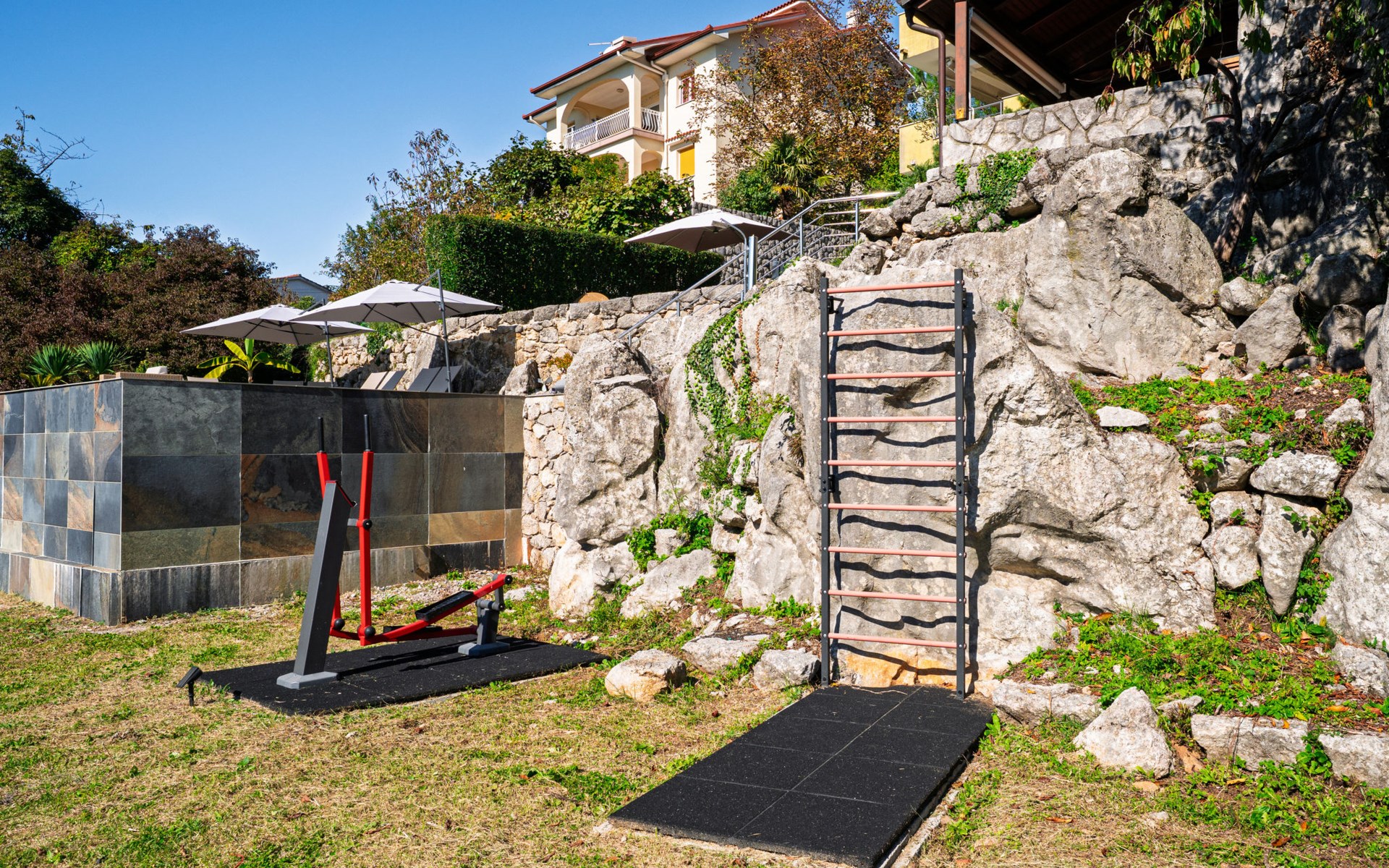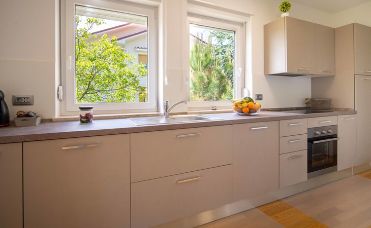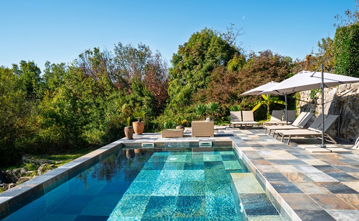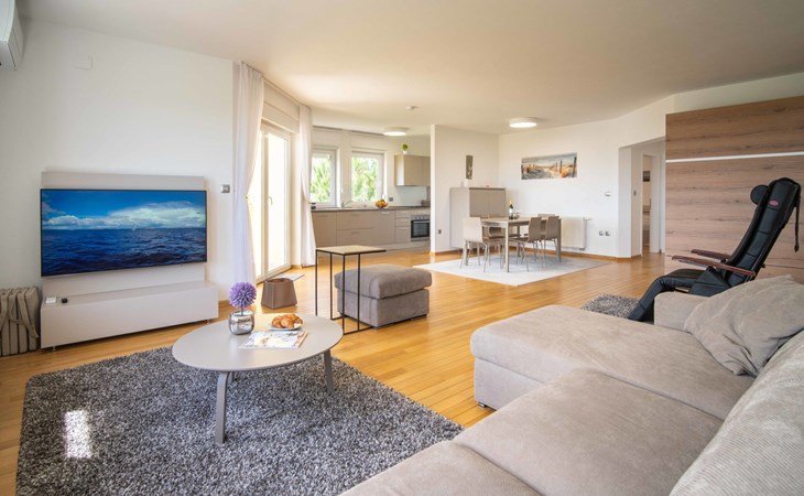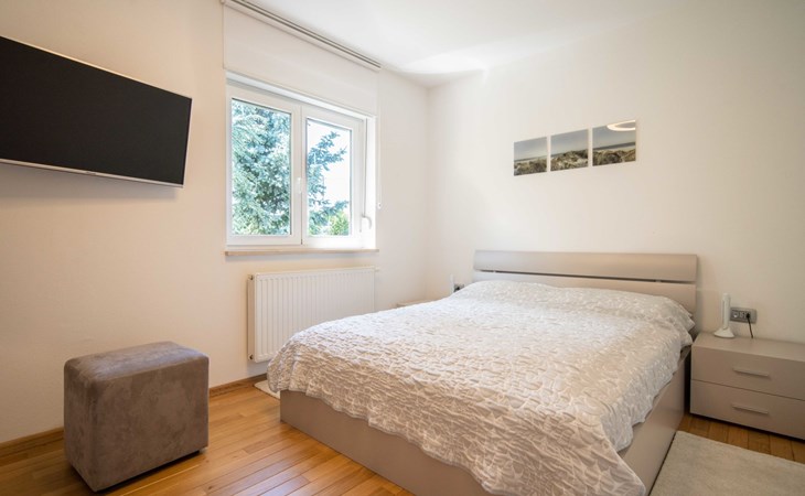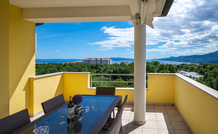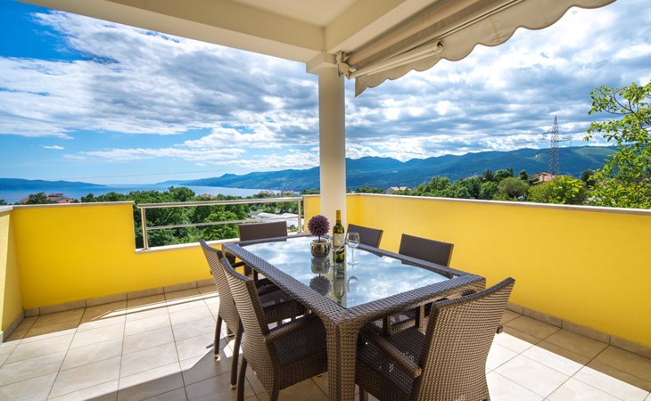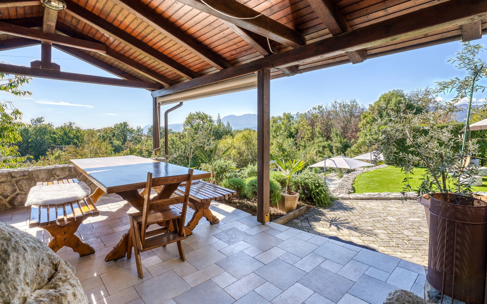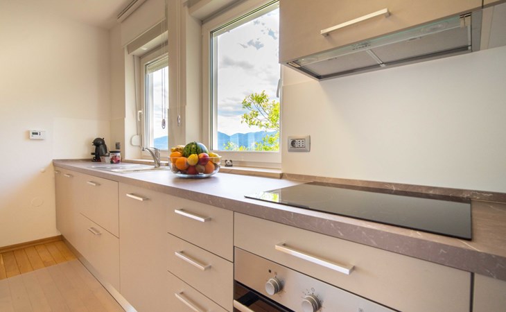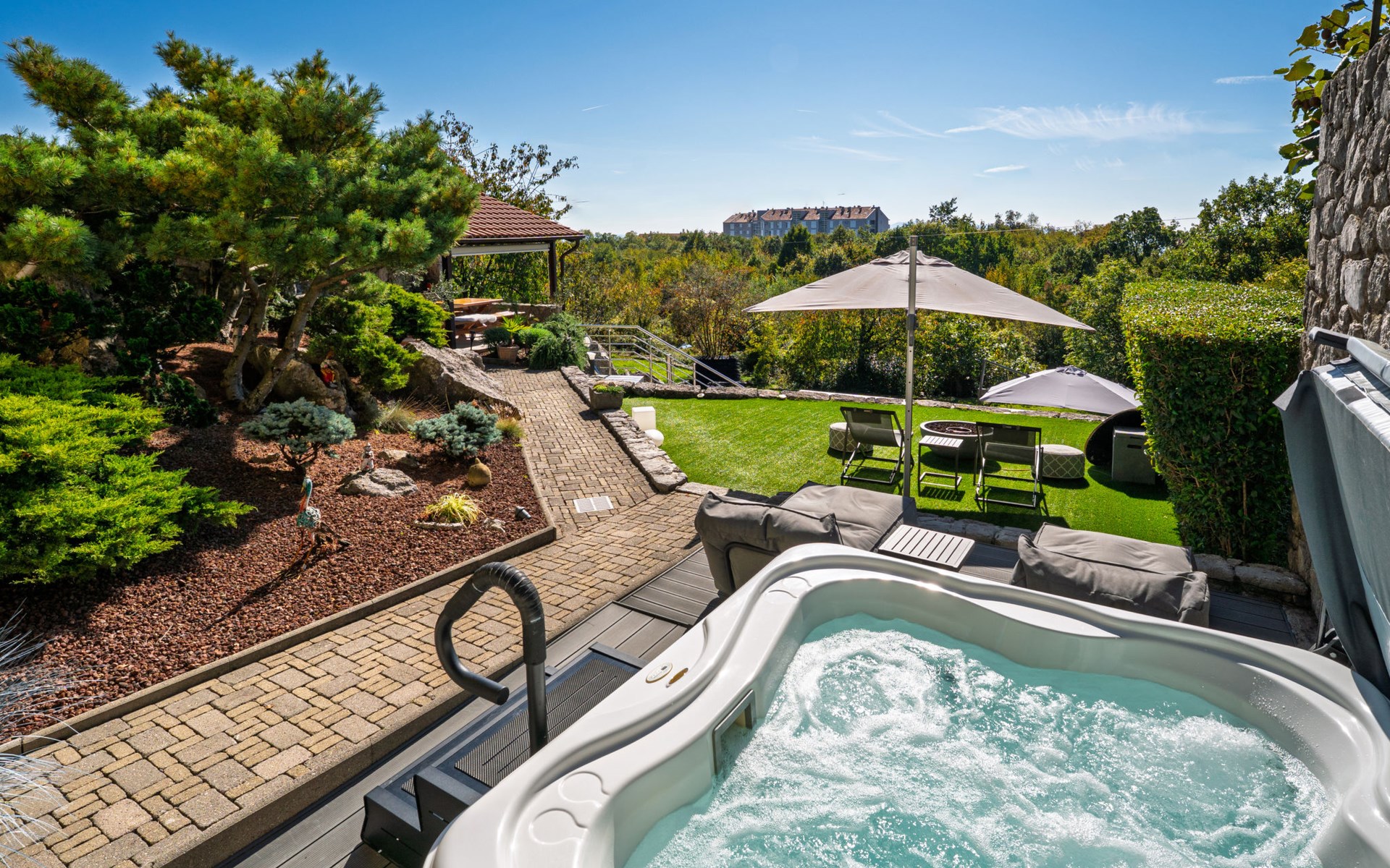 Kastav 7 km from Opatija: 3-family house "Kvarner house". 850 m from the centre of Kastav, 9.5 km from the centre of Rijeka, in a quiet, sunny, elevated position, 5.5 km from the sea. For shared use: property 2'000 m2 with lawn and plants, swimming pool angular (7 x 4 m, depth 150 cm, seasonal availability: 01.May. - 01.Oct.) with internal staircase and salt-electrolysis pool-cleaning system. Outdoor shower, hot tub, terrace (30 m2), garden furniture, barbecue. In the house: internet access. Parking at the house on the premises. Shop, supermarket 650 m, restaurant 850 m, bus stop 500 m, pebble beach 5.5 km, concrete beach 5.5 km. ,The hot tub can be used all year round.