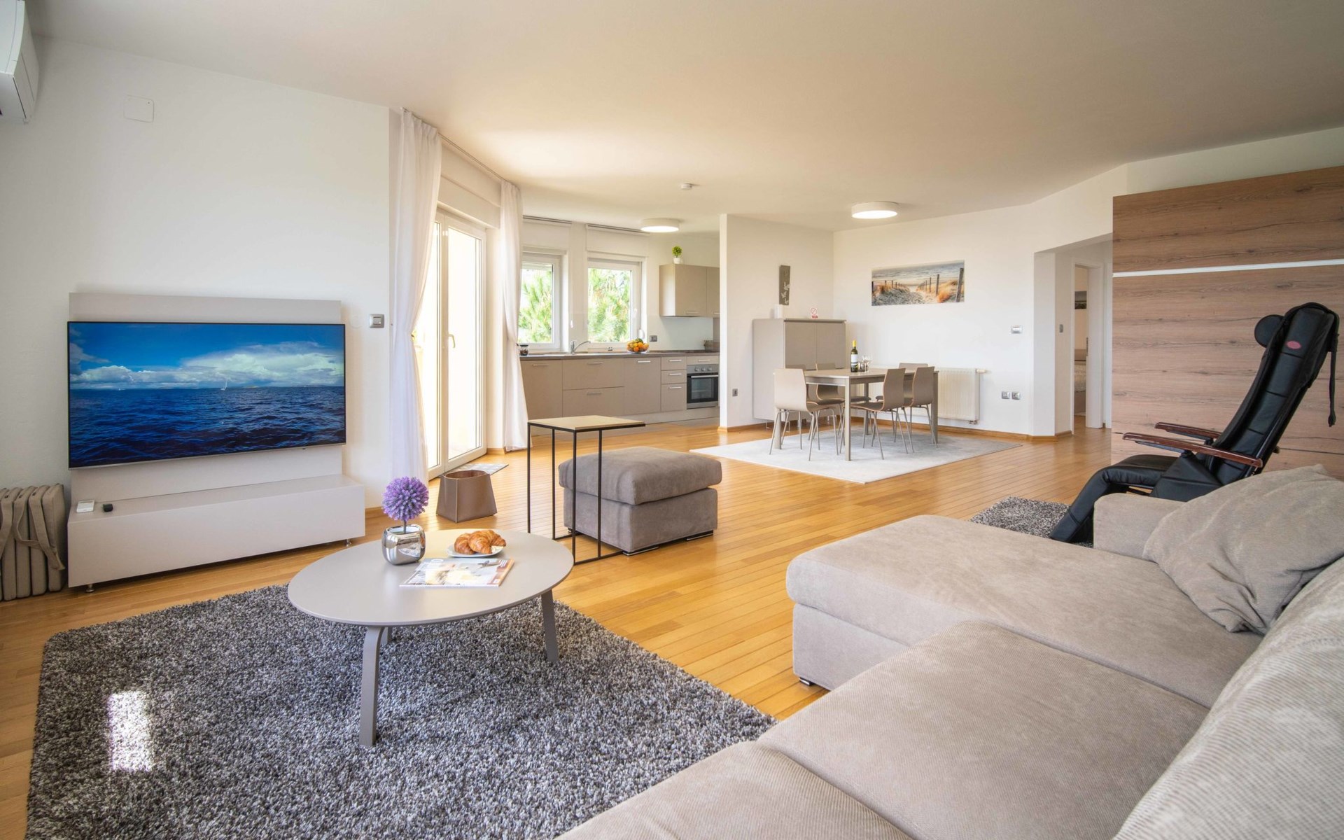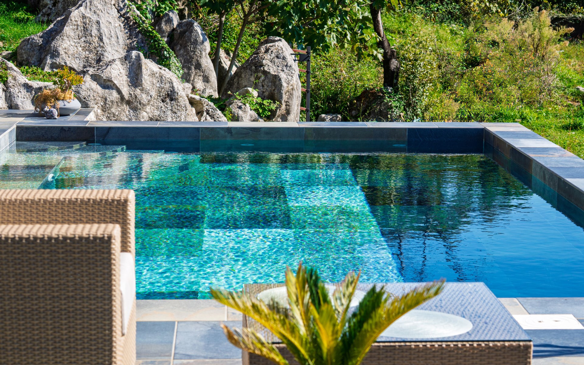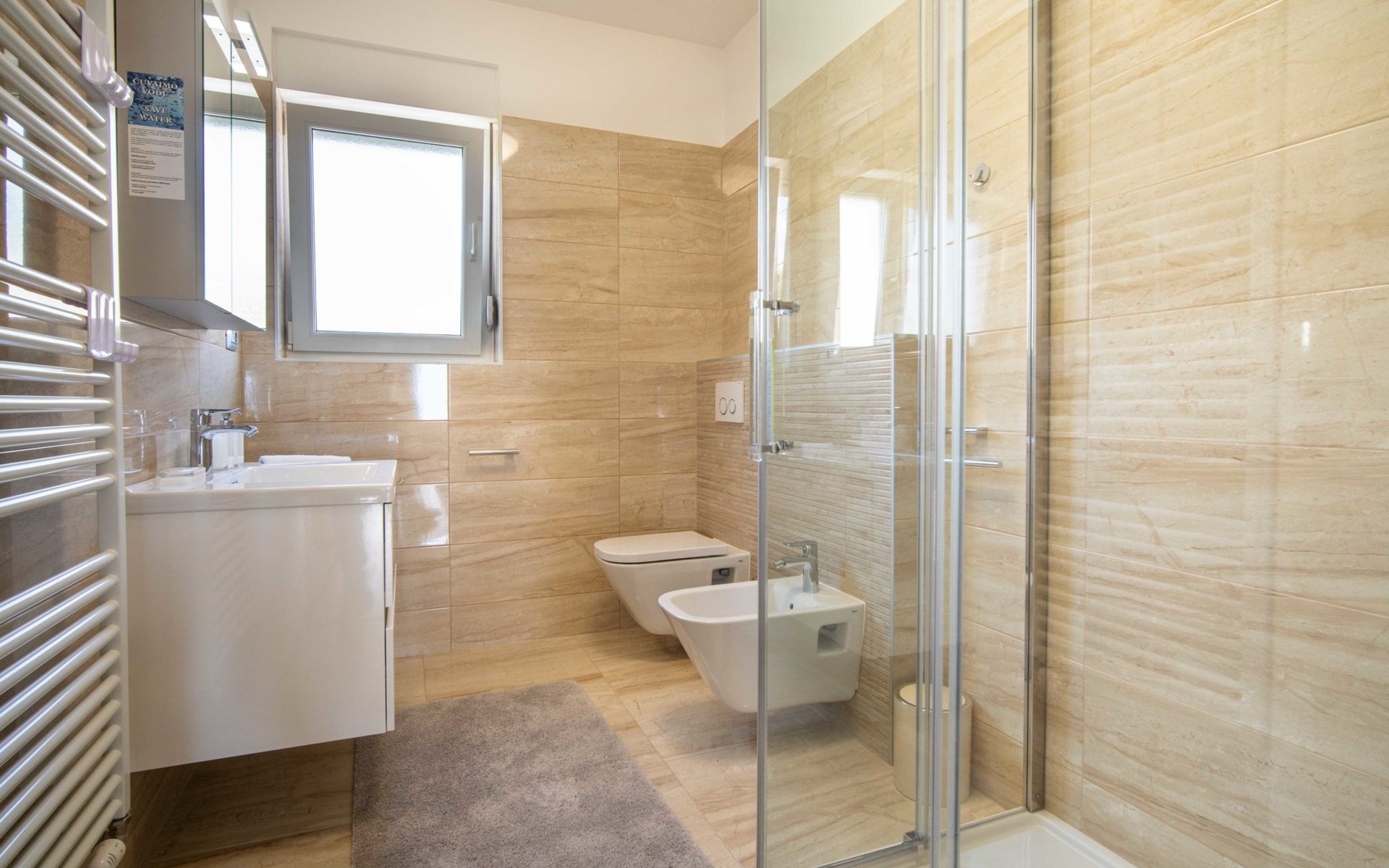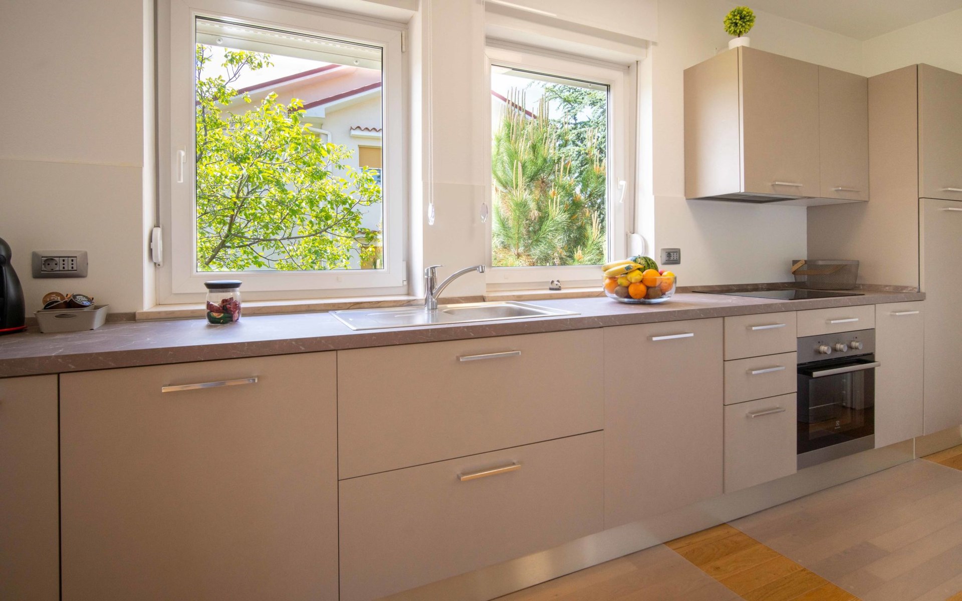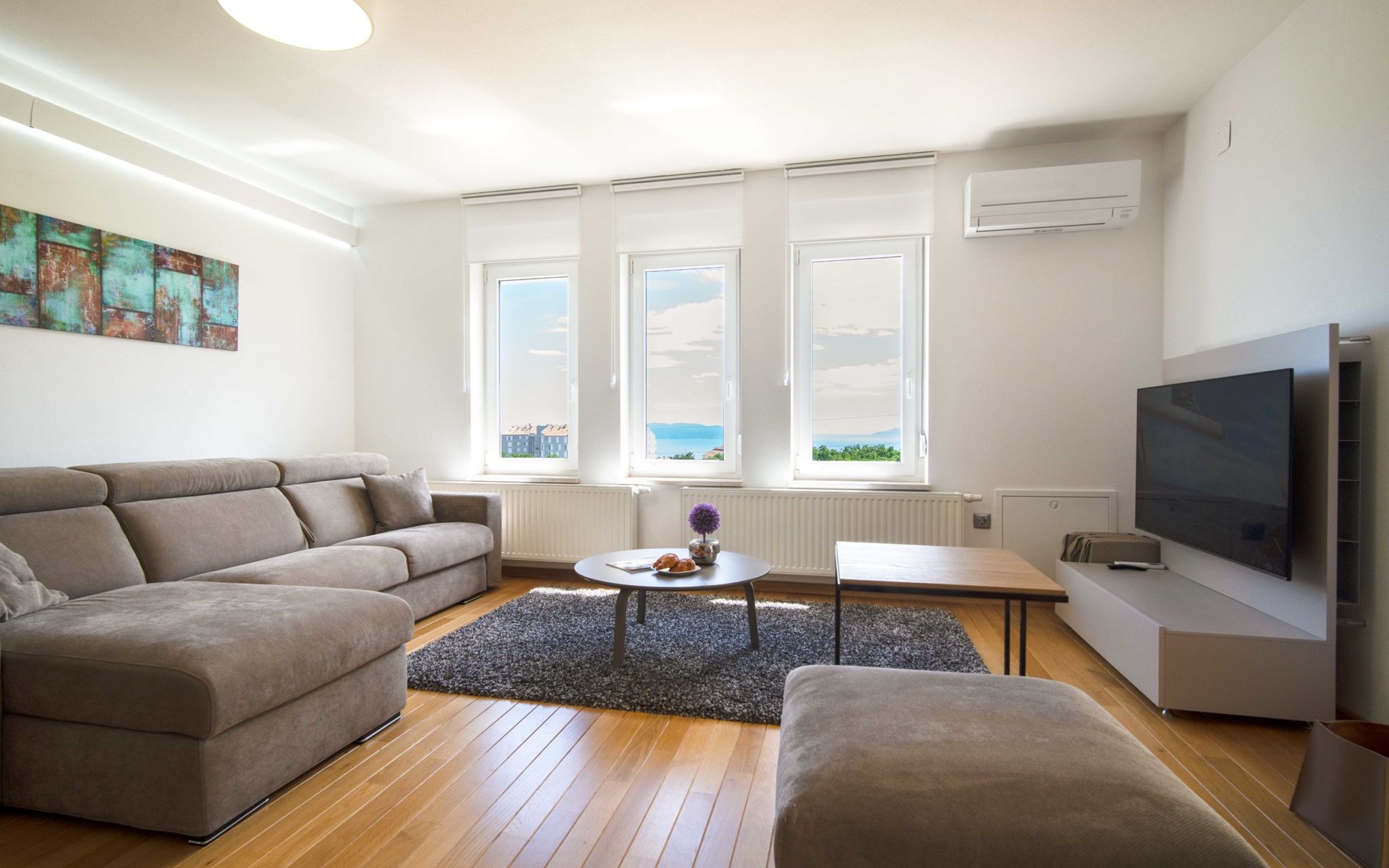 Kastav 7 km from Opatija: 3-family house "Kvarner house". 850 m from the centre of Kastav, 9.5 km from the centre of Rijeka, in a quiet, sunny, elevated position, 5.5 km from the sea. For shared use: property 2'000 m2 with lawn and plants, swimming pool angular (7 x 4 m, depth 150 cm, seasonal availability: 01.May. - 01.Oct.) with internal staircase and salt-electrolysis pool-cleaning system. Outdoor shower, hot tub, terrace (30 m2), garden furniture, barbecue. In the house: internet access. Parking at the house on the premises. Shop, supermarket 650 m, restaurant 850 m, bus stop 500 m, pebble beach 5.5 km, concrete beach 5.5 km. ,The hot tub can be used all year round.