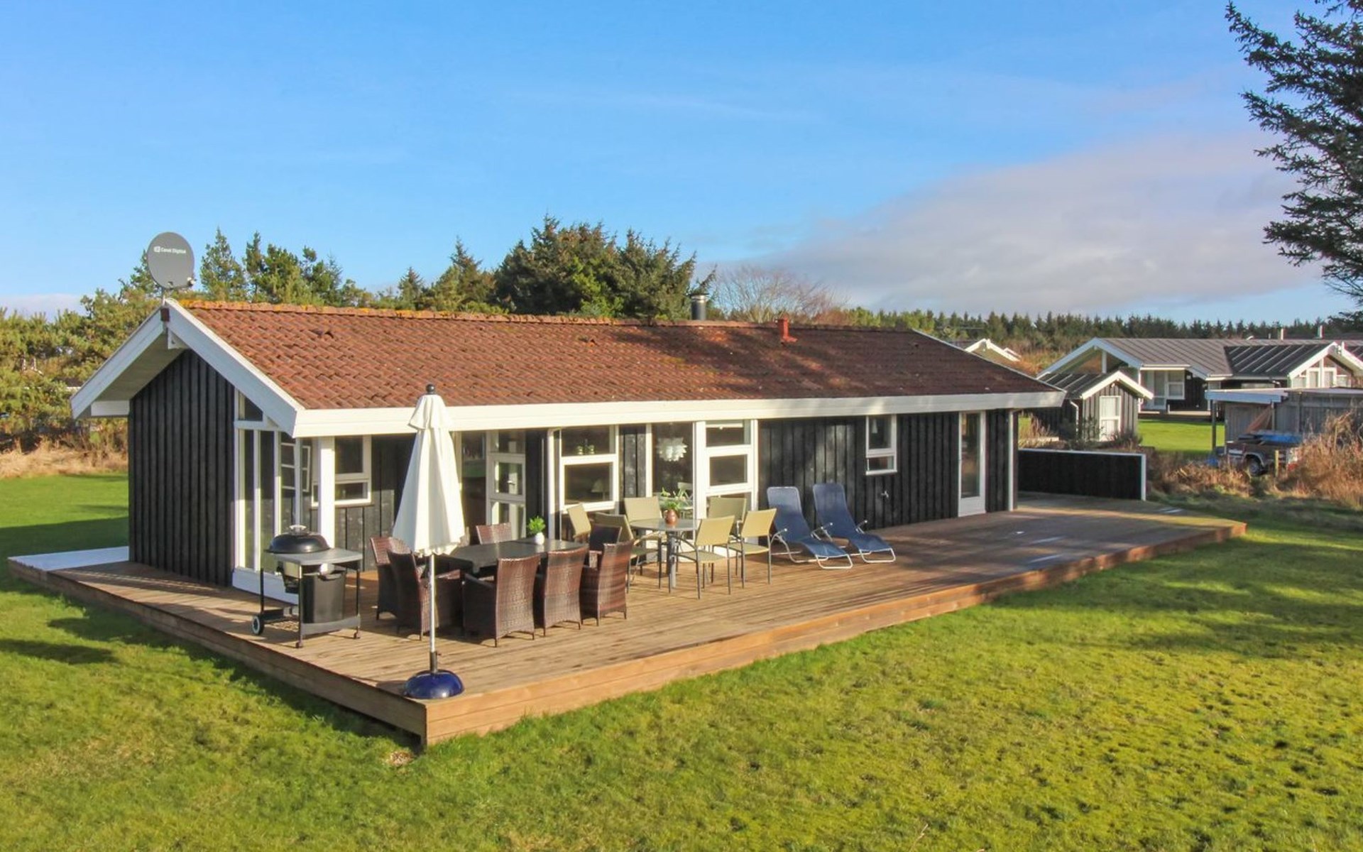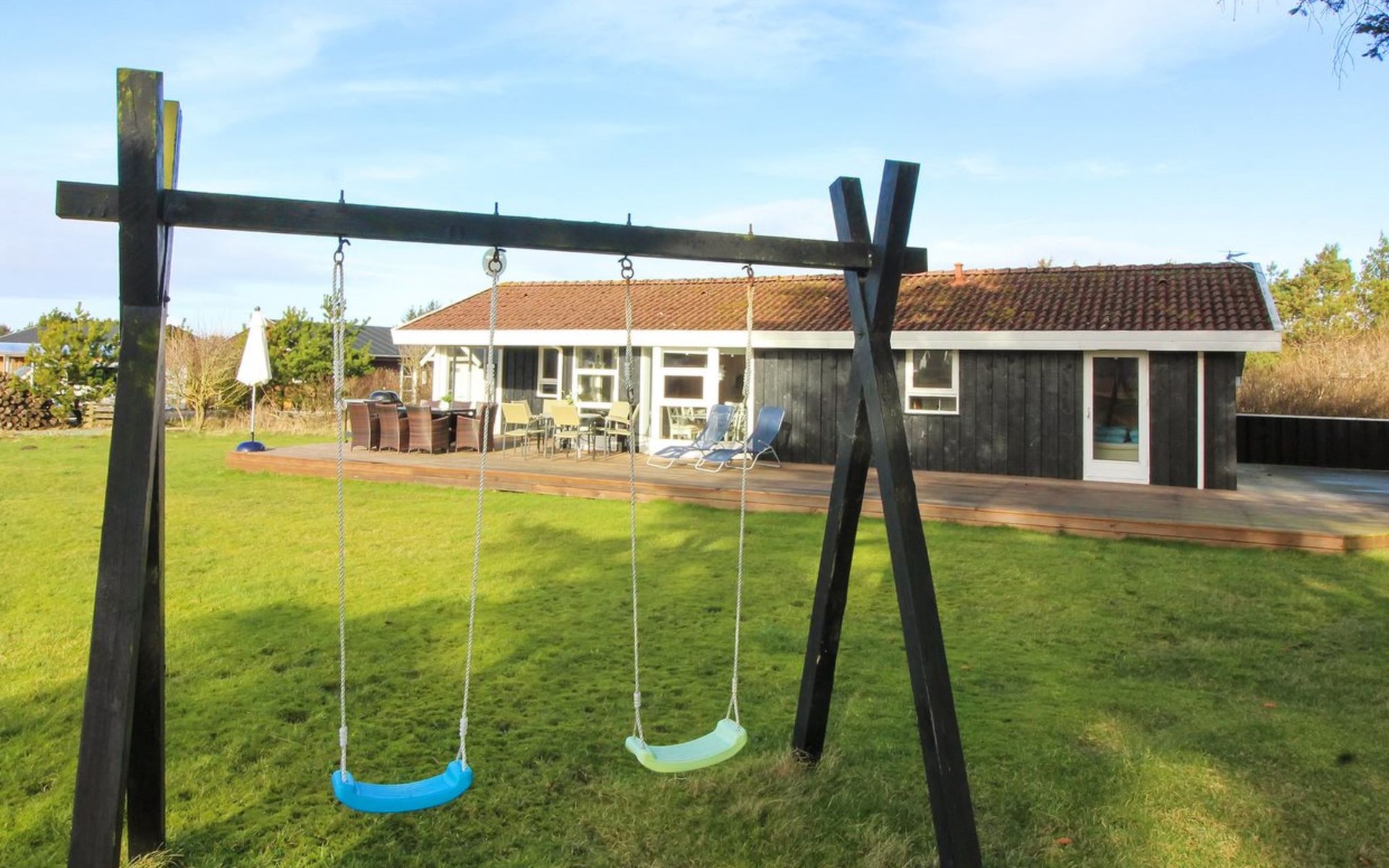 Single-family house, built in 1987. 900 m from the sea. Private: natural state property 1'860 m2. Terrace (132 m2), children's playground (swing). In the house: washing machine. Grocery 600 m. The owner does not accept any youth groups.