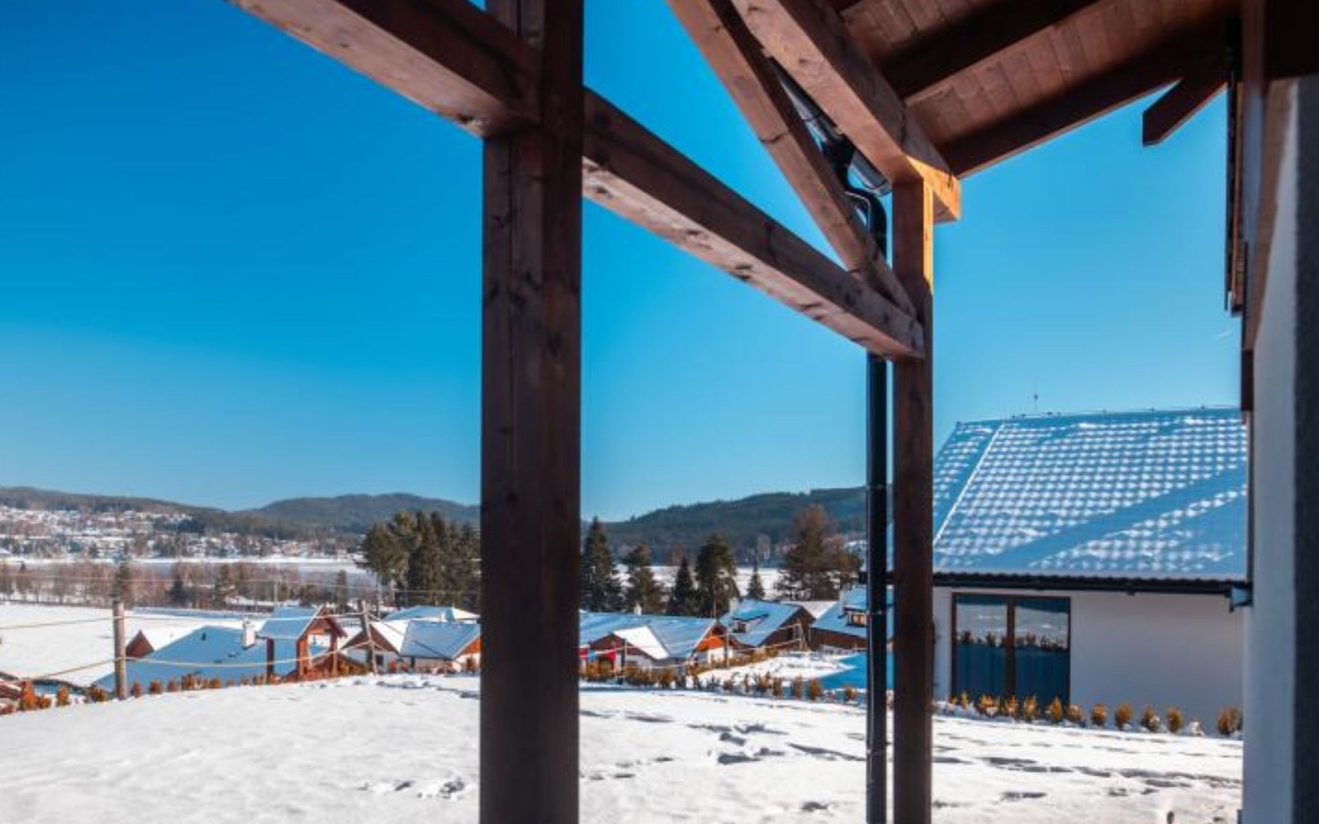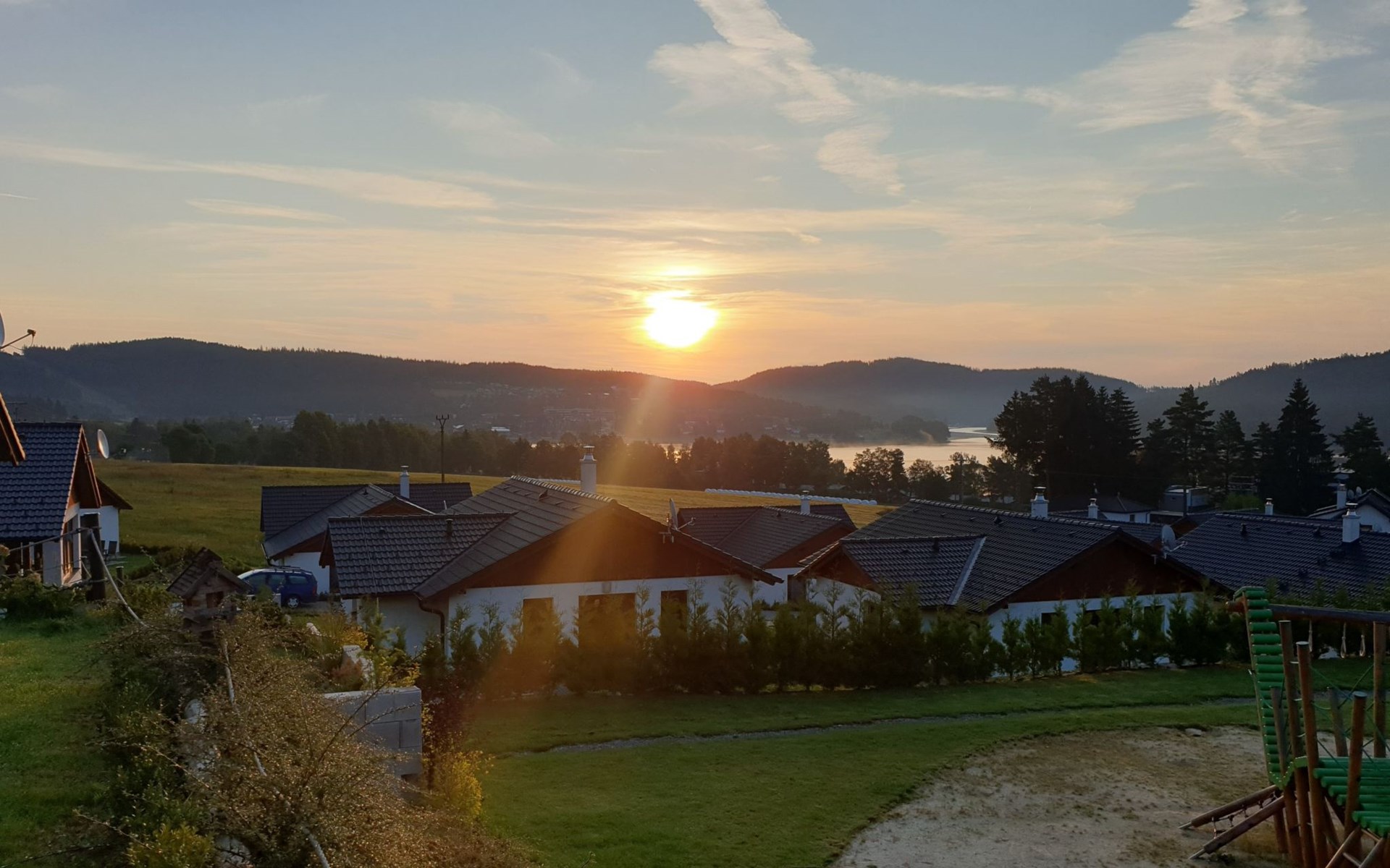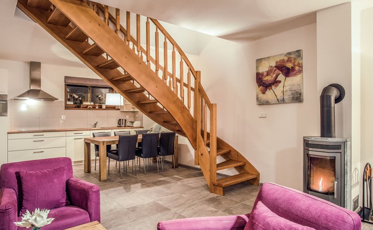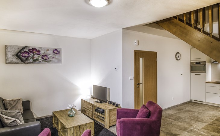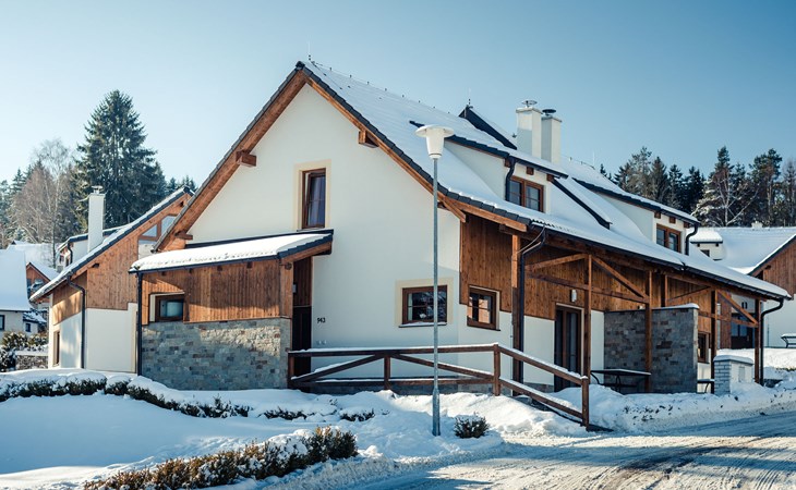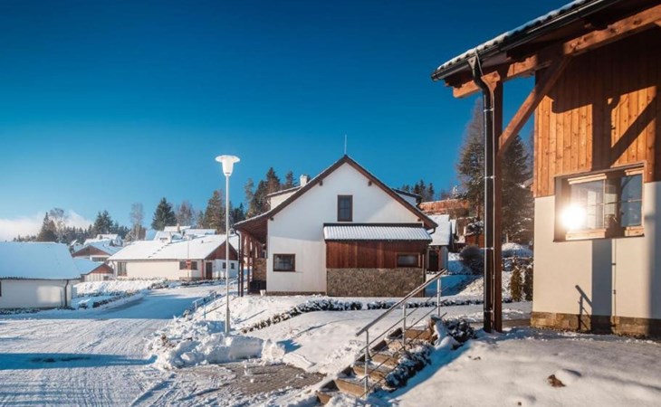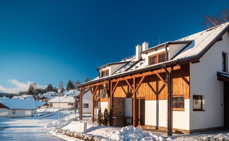 Child friendly, modern holiday village "Residence Lipno". 40 houses in the resort. On the outskirts, 1.5 km from the centre of Lipno nad Vltavou, in a sunny, elevated position, 250 m from the lake, 2 km from the skiing area. For shared use: property. Children's playground (slide, swing). Private: garden. Terrace, garden furniture. In the complex: reception, storage room for bicycles, washing machine, tumble dryer (for shared use, extra). Parking at the house. Grocery 1.2 km, restaurant 200 m, bus stop "Lipno nad Vltavou, Kobylnice" 200 m, grass beach 250 m, indoor swimming pool 2 km. Sports harbour 1.5 km, walking paths from the house 10 m, cycle lane, chair lift 2 km, skisport facilities 2 km, ski bus stop 200 m, ski school 2 km. Nearby attractions: Aquaworld Lipno 2 km, Hopsárium 2 km, Bobová dráha 2.5 km, Stezka korunami stromů 3.5 km, Království Lesa 3.5 km. Well-known ski regions can easily be reached: Skiareál Lipno 2 km. All houses/apartments are individually designed/furnished. Marina Lipno (1,5 km) with a yacht harbor and a indoor water park (not in operation from 1.11.- 30.11.). Golf course and ski lift to Kramolin 1 km (5 ski slopes, snowboard park, 50 km cross-country skiing). Yacht, ski and bicycle rental.