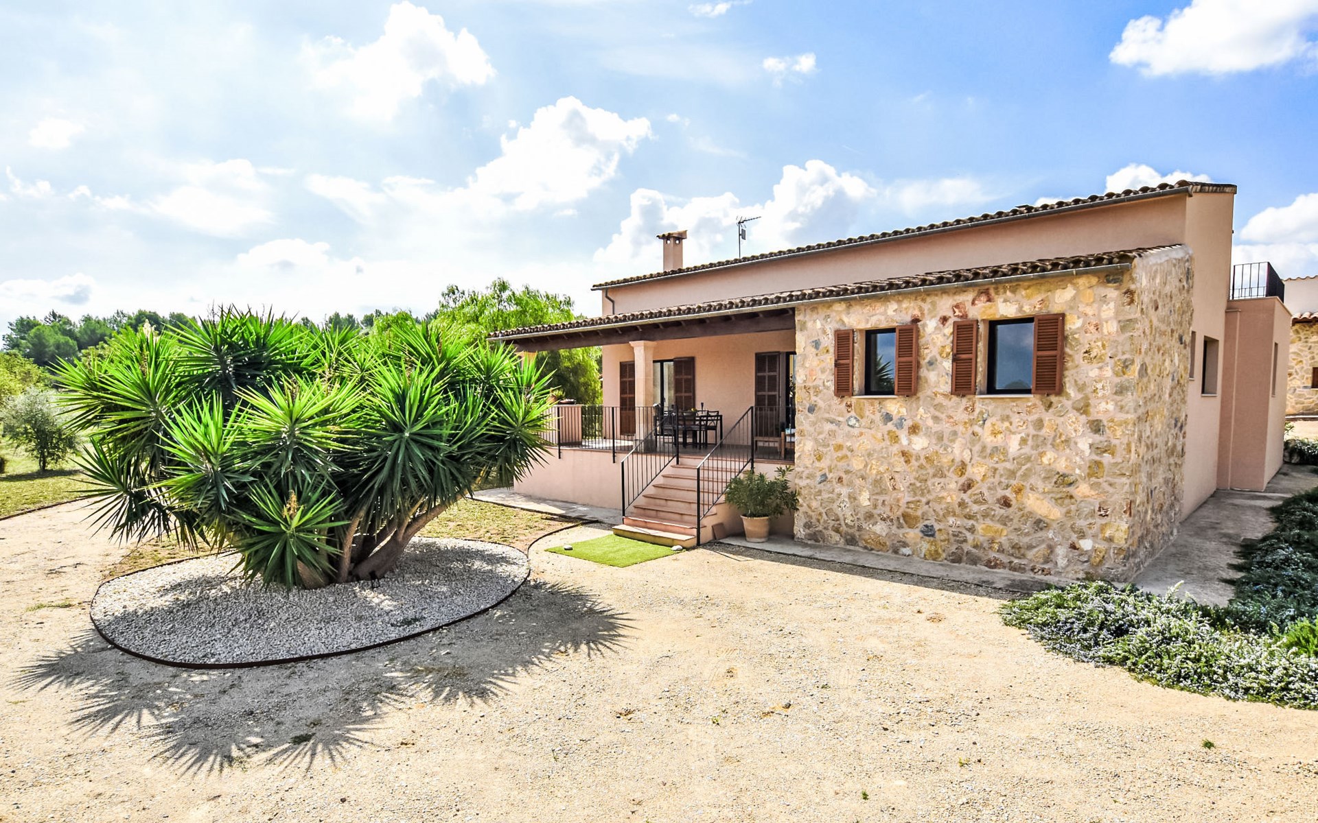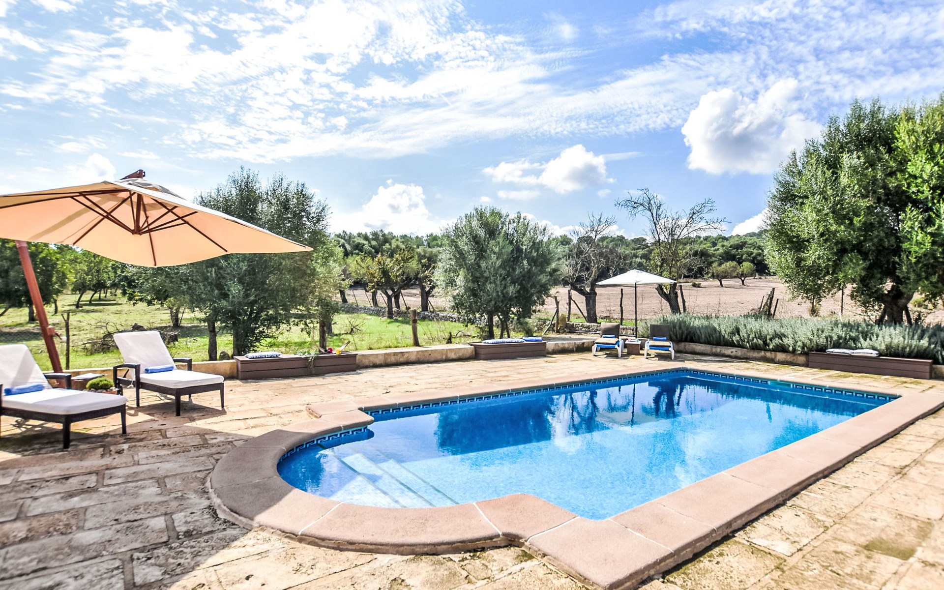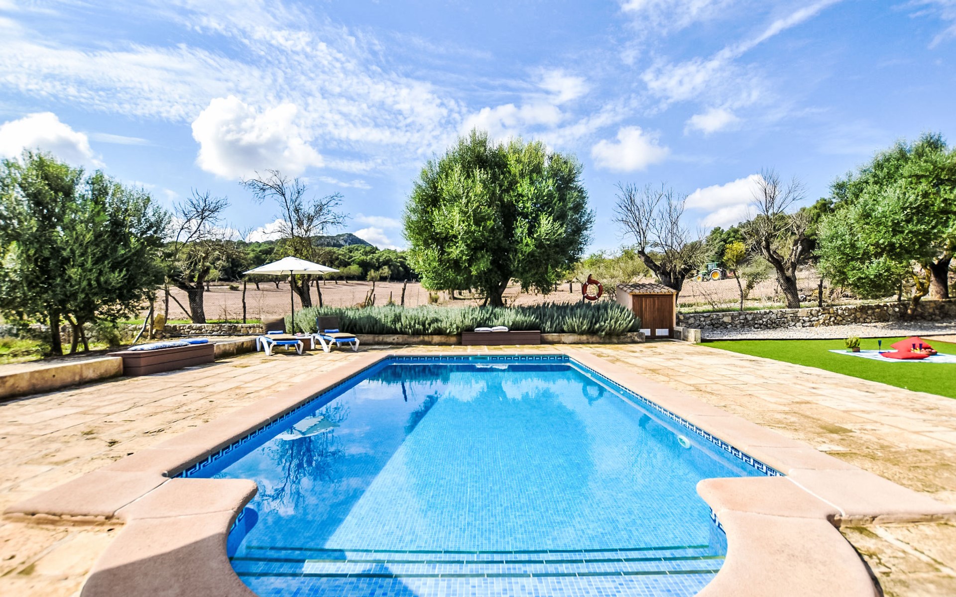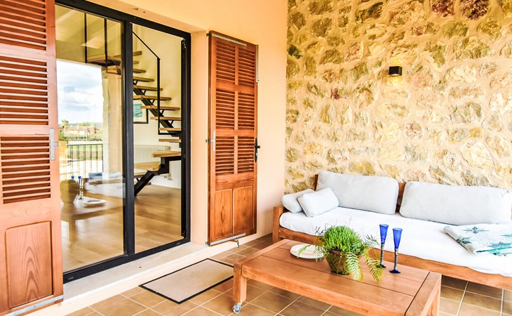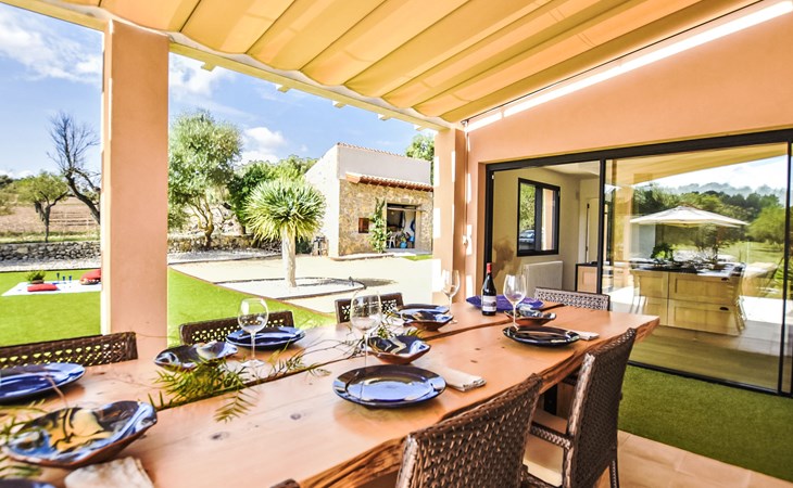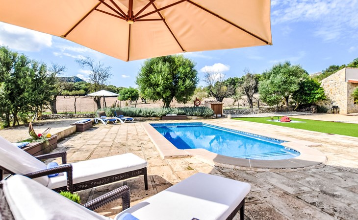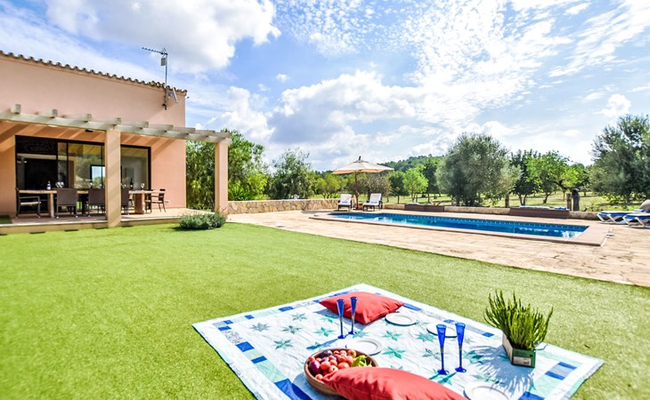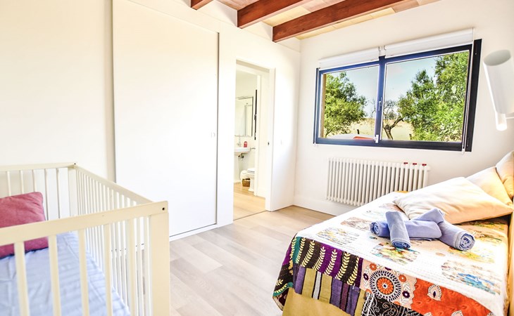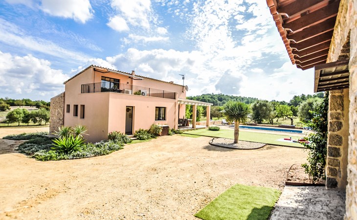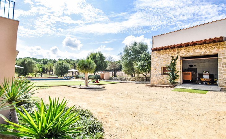 4 km from Sineu: It is an ecological and self-sufficient house, that means that you can not make a misuse of water, heating and electricity to avoid deficiencies in these services. No parties or events are allowed on the farm. Very beautiful, comfortable farm estate "Son Tey", 2 storeys, built in 2017, surrounded by fields. Outside the resort, 4.5 km from the centre of Sineu, in a quiet, sunny position, 1 km from the edge of the forest, 27 km from the sea, 27 km from the beach. Private: garden with lawn and wildlife garden, swimming pool angular (8 x 4 m, depth 120 - 170 cm, seasonal availability: 01.Jan. - 31.Dec.). Patio, arbour, pergola, garden furniture, barbecue. In the house: internet access, WiFi, central heating system, air conditioning, burglar alarm system, washing machine. Parking at the house on the premises. Shop 4.5 km, grocery 4.5 km, supermarket 4.5 km, restaurant 4.3 km, bar 4.3 km, bakery 4.5 km, café 4.2 km, bicycle rental 4.5 km, 50 minute walk to the centre, bus stop 4.5 km, railway station 4.5 km, sandy beach 27 km, rocky beach 27 km. Sports harbour 27 km, golf course (18 hole) 35 m, tennis 5.5 km, walking paths from the house 1 km, cycle lane 900 m. Nearby attractions: Local Market Sineu, Petra, Sineu, Sant Joan, Sencelles. Ruta Arqueológica de Costitx, Observatorio Astronómico de Mallorca. Ciudad de Inca. Hiking paths: Ermita de Bonany, Petra. Serra de Tramuntana. Please note: car recommended. Suitable for families, suitable for seniors. Object suitable for 6 adults groups of teenagers on request only. Loading and unloading of baggage is possible at the holiday house. Airfield 40 km from the property.