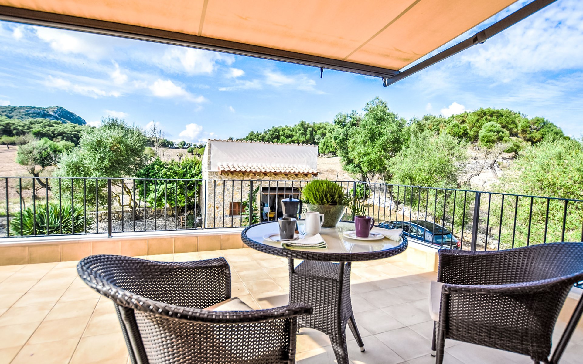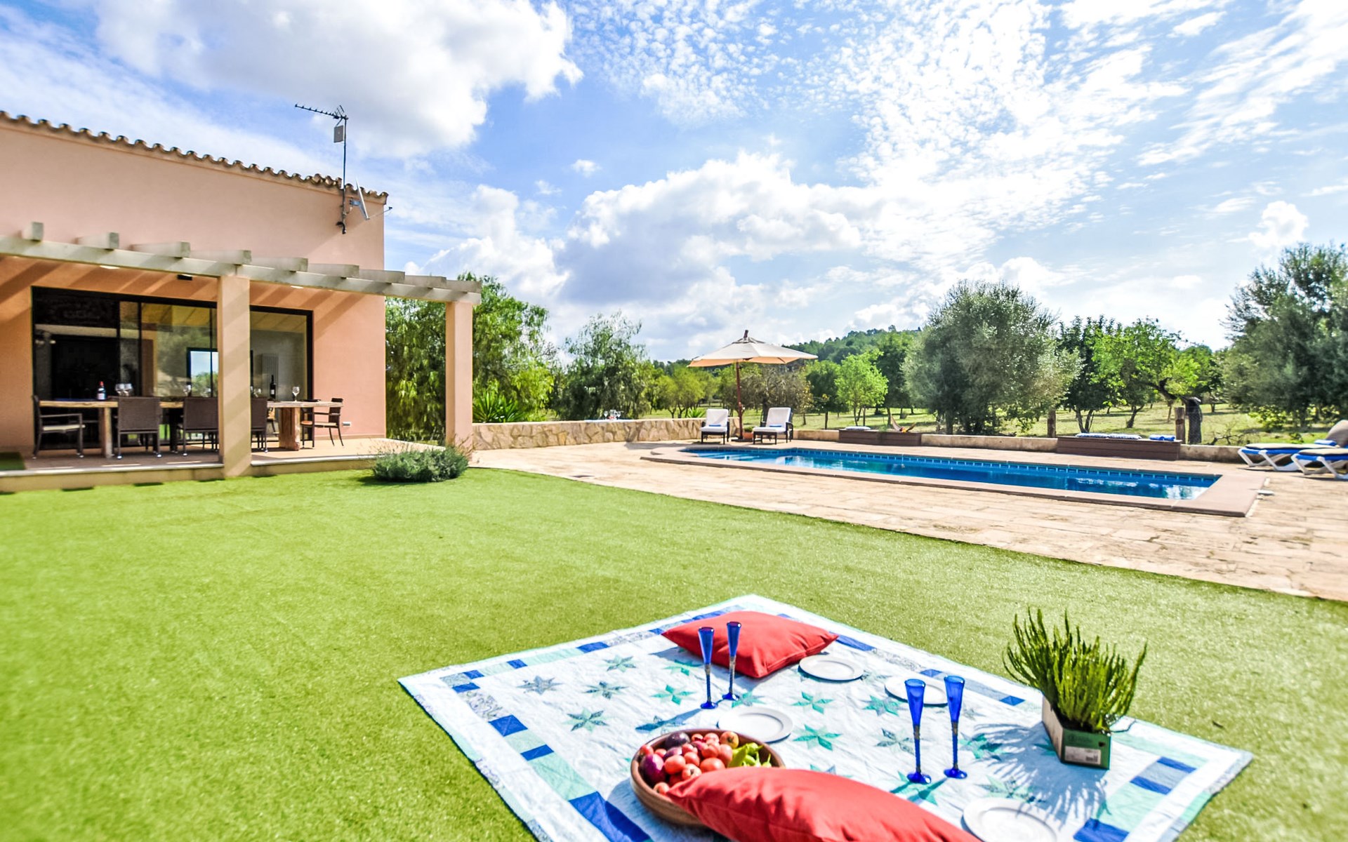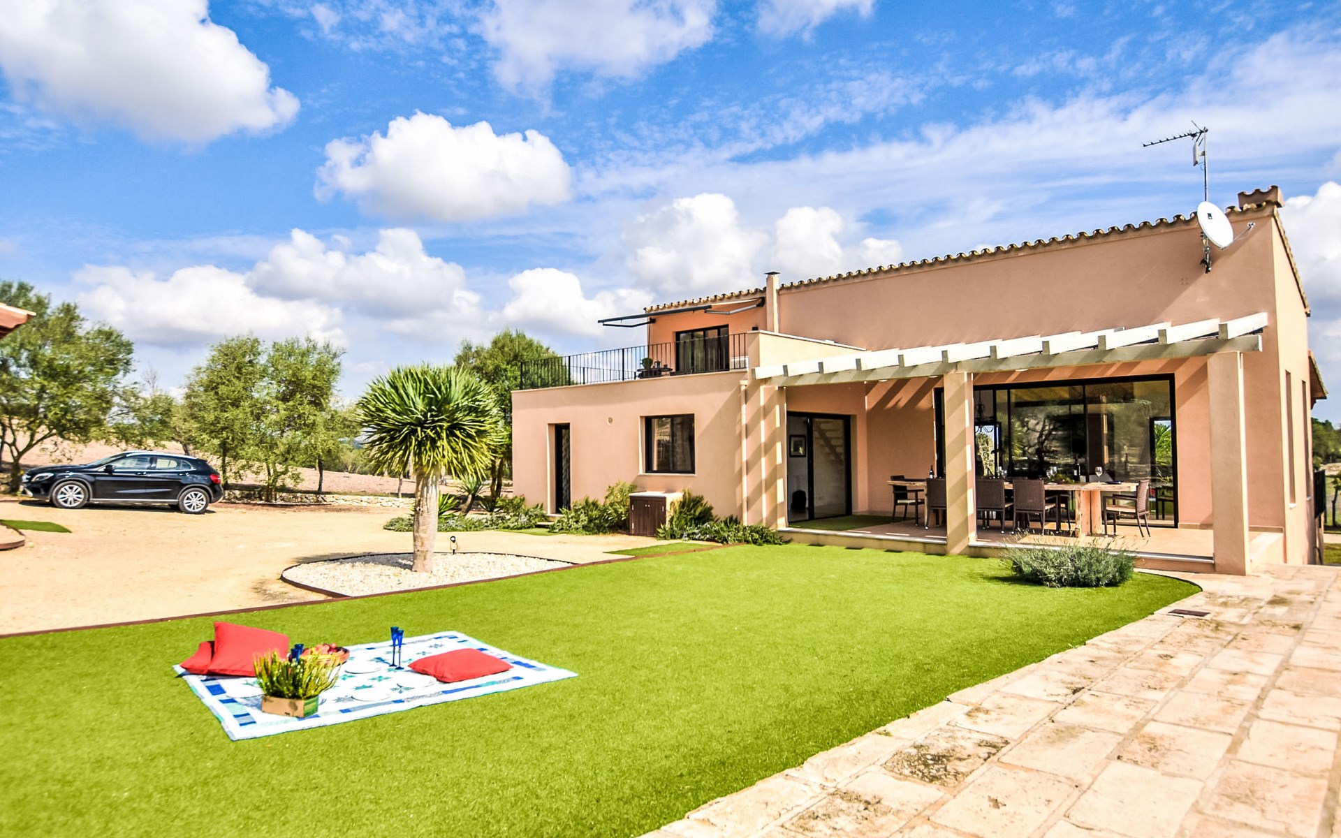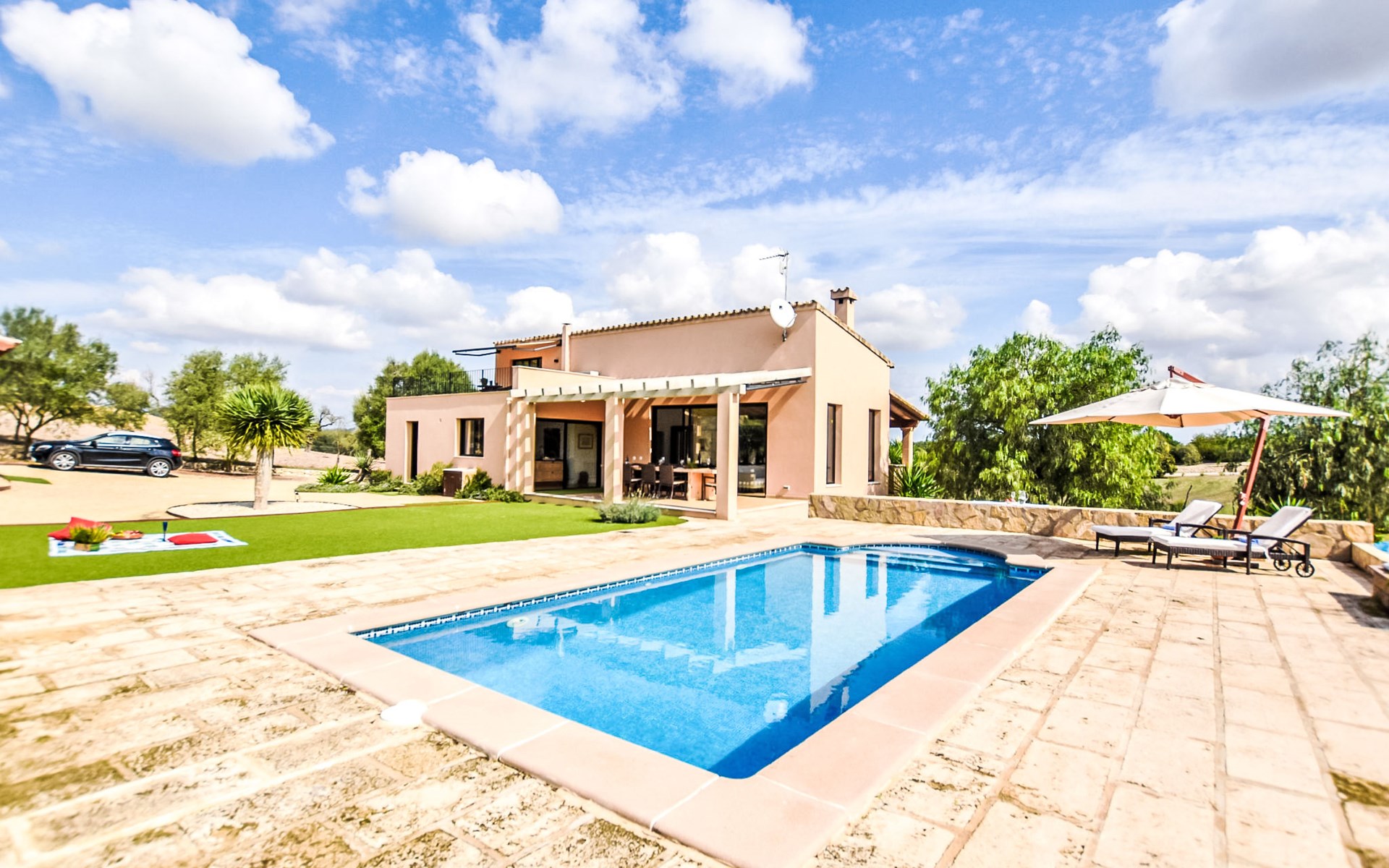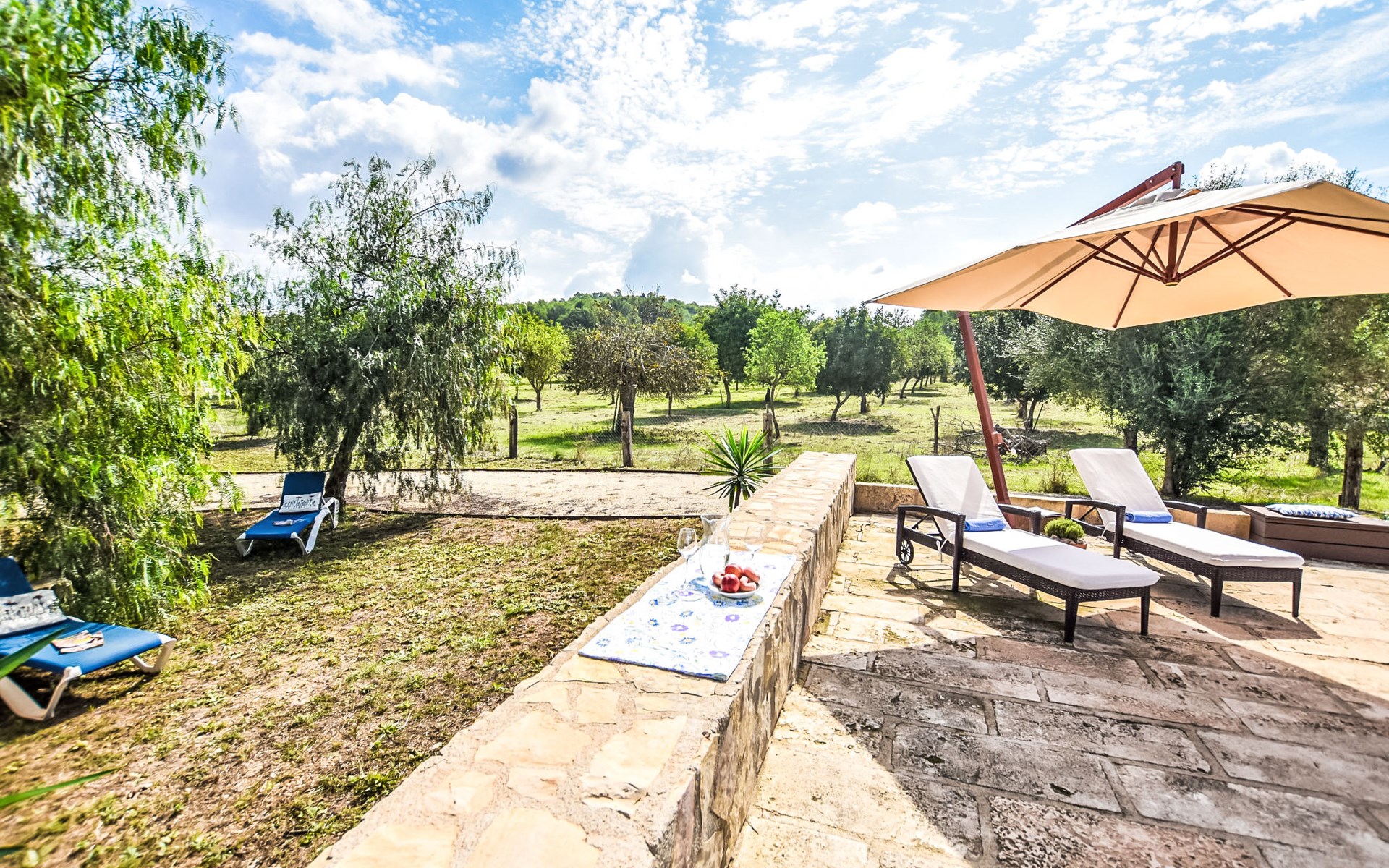 4 km from Sineu: It is an ecological and self-sufficient house, that means that you can not make a misuse of water, heating and electricity to avoid deficiencies in these services. No parties or events are allowed on the farm. Very beautiful, comfortable farm estate "Son Tey", 2 storeys, built in 2017, surrounded by fields. Outside the resort, 4.5 km from the centre of Sineu, in a quiet, sunny position, 1 km from the edge of the forest, 27 km from the sea, 27 km from the beach. Private: garden with lawn and wildlife garden, swimming pool angular (8 x 4 m, depth 120 - 170 cm, seasonal availability: 01.Jan. - 31.Dec.). Patio, arbour, pergola, garden furniture, barbecue. In the house: internet access, WiFi, central heating system, air conditioning, burglar alarm system, washing machine. Parking at the house on the premises. Shop 4.5 km, grocery 4.5 km, supermarket 4.5 km, restaurant 4.3 km, bar 4.3 km, bakery 4.5 km, café 4.2 km, bicycle rental 4.5 km, 50 minute walk to the centre, bus stop 4.5 km, railway station 4.5 km, sandy beach 27 km, rocky beach 27 km. Sports harbour 27 km, golf course (18 hole) 35 m, tennis 5.5 km, walking paths from the house 1 km, cycle lane 900 m. Nearby attractions: Local Market Sineu, Petra, Sineu, Sant Joan, Sencelles. Ruta Arqueológica de Costitx, Observatorio Astronómico de Mallorca. Ciudad de Inca. Hiking paths: Ermita de Bonany, Petra. Serra de Tramuntana. Please note: car recommended. Suitable for families, suitable for seniors. Object suitable for 6 adults groups of teenagers on request only. Loading and unloading of baggage is possible at the holiday house. Airfield 40 km from the property.
