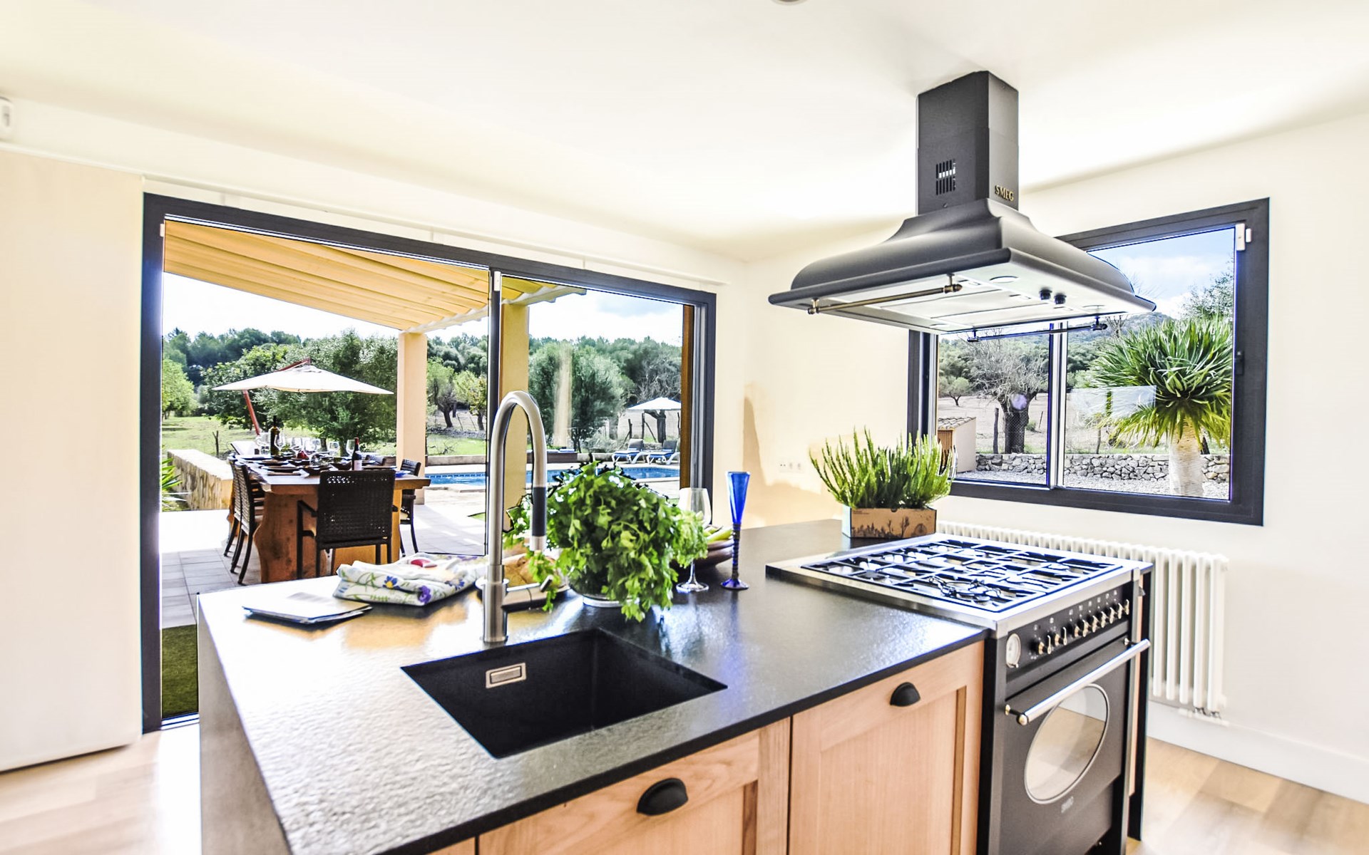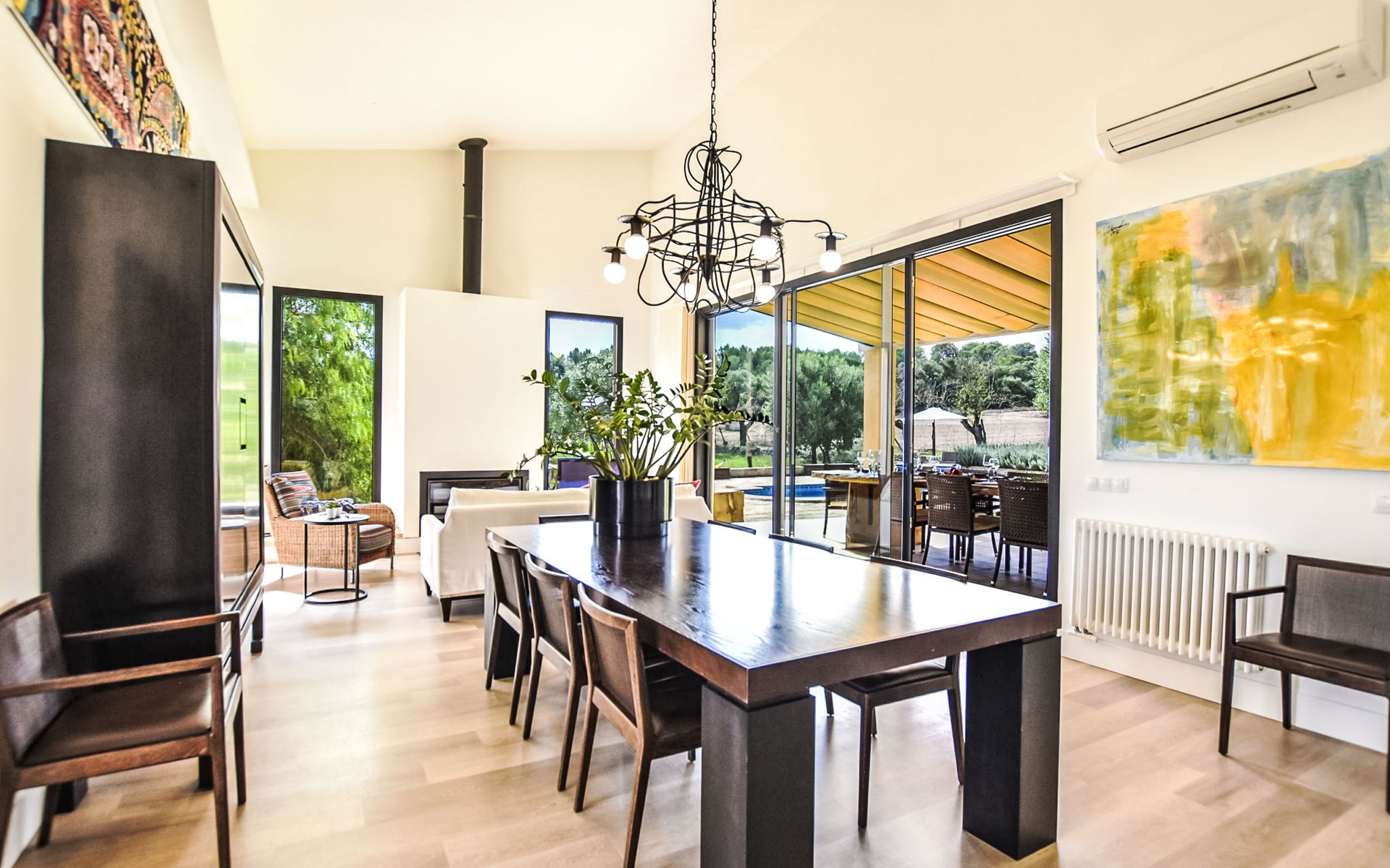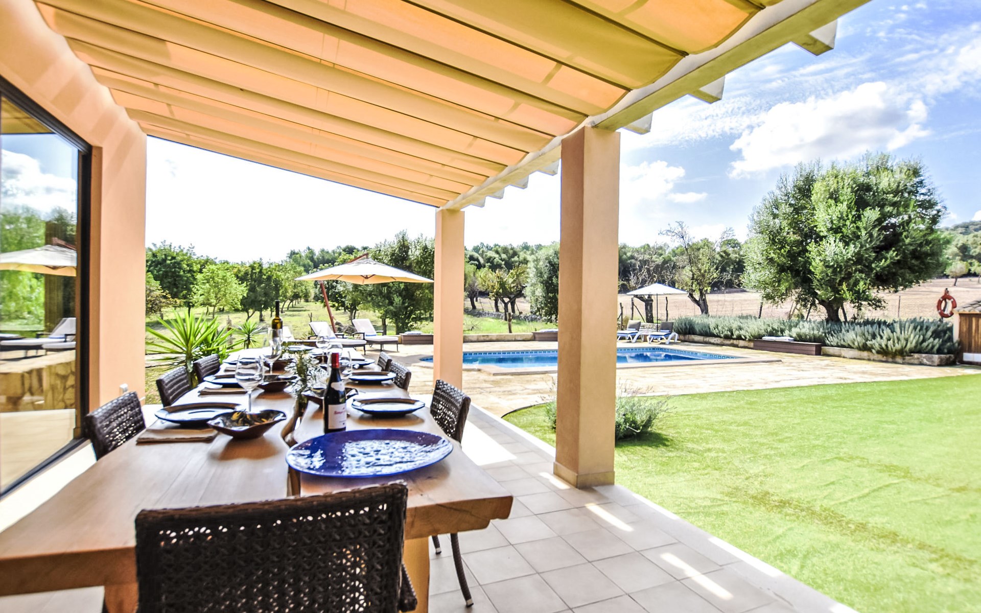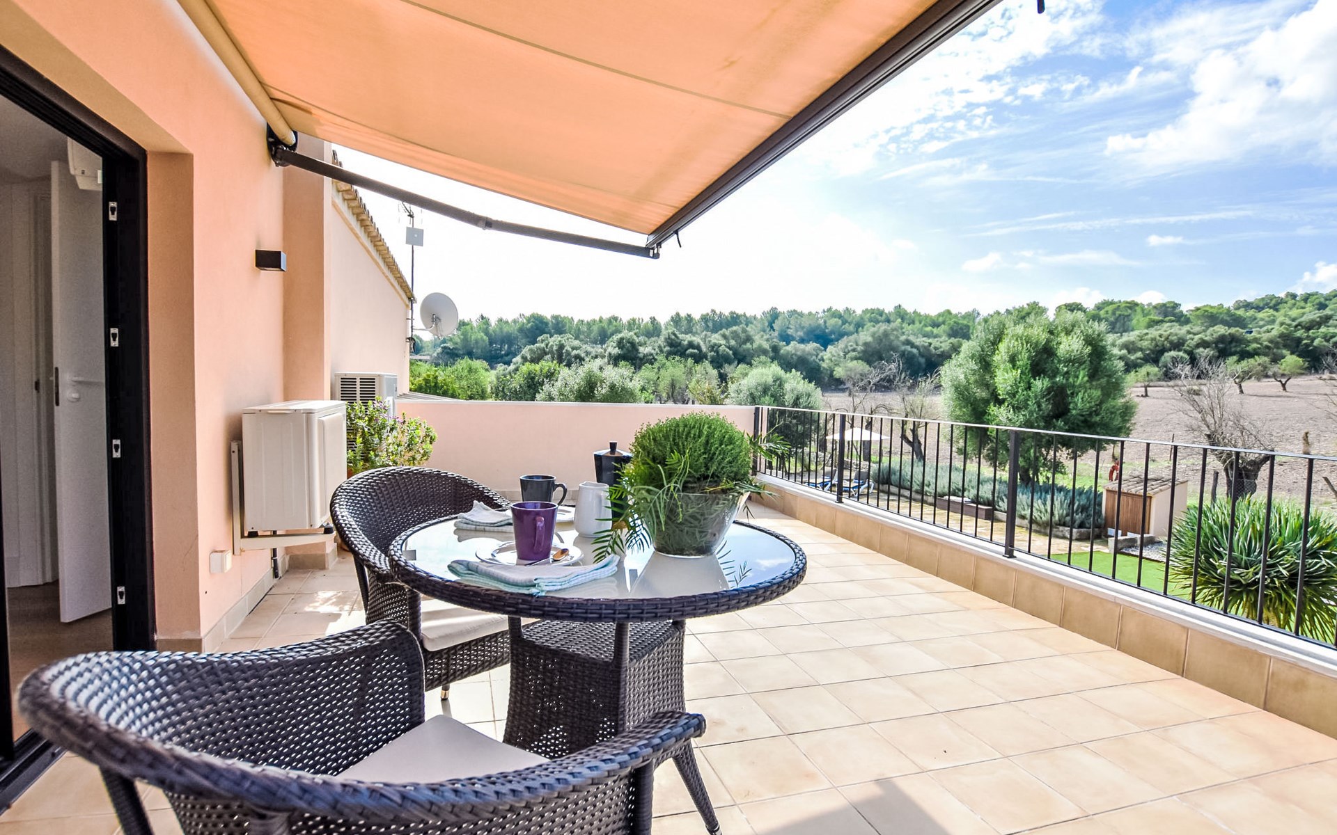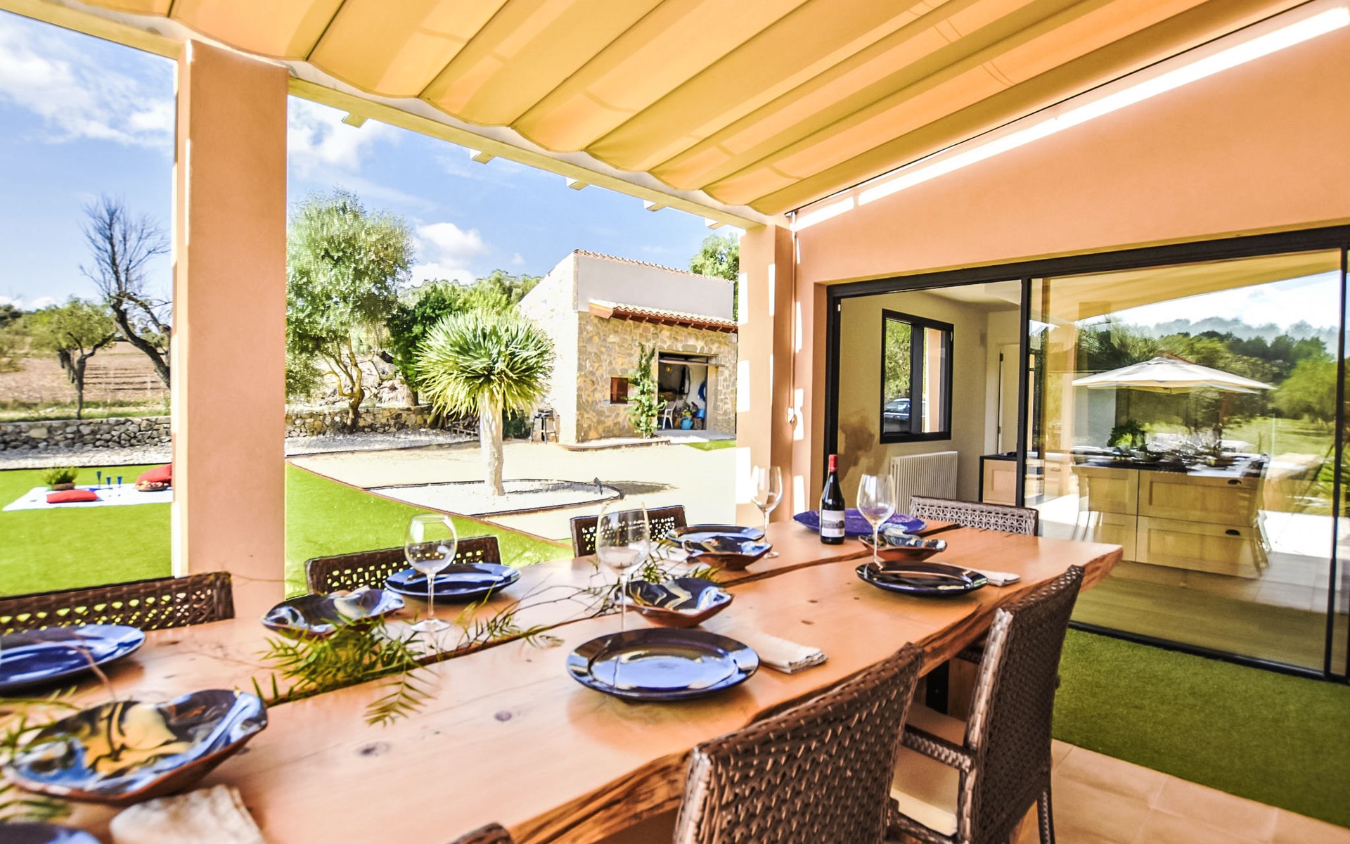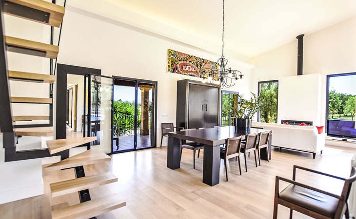 4 km from Sineu: It is an ecological and self-sufficient house, that means that you can not make a misuse of water, heating and electricity to avoid deficiencies in these services. No parties or events are allowed on the farm. Very beautiful, comfortable farm estate "Son Tey", 2 storeys, built in 2017, surrounded by fields. Outside the resort, 4.5 km from the centre of Sineu, in a quiet, sunny position, 1 km from the edge of the forest, 27 km from the sea, 27 km from the beach. Private: garden with lawn and wildlife garden, swimming pool angular (8 x 4 m, depth 120 - 170 cm, seasonal availability: 01.Jan. - 31.Dec.). Patio, arbour, pergola, garden furniture, barbecue. In the house: internet access, WiFi, central heating system, air conditioning, burglar alarm system, washing machine. Parking at the house on the premises. Shop 4.5 km, grocery 4.5 km, supermarket 4.5 km, restaurant 4.3 km, bar 4.3 km, bakery 4.5 km, café 4.2 km, bicycle rental 4.5 km, 50 minute walk to the centre, bus stop 4.5 km, railway station 4.5 km, sandy beach 27 km, rocky beach 27 km. Sports harbour 27 km, golf course (18 hole) 35 m, tennis 5.5 km, walking paths from the house 1 km, cycle lane 900 m. Nearby attractions: Local Market Sineu, Petra, Sineu, Sant Joan, Sencelles. Ruta Arqueológica de Costitx, Observatorio Astronómico de Mallorca. Ciudad de Inca. Hiking paths: Ermita de Bonany, Petra. Serra de Tramuntana. Please note: car recommended. Suitable for families, suitable for seniors. Object suitable for 6 adults groups of teenagers on request only. Loading and unloading of baggage is possible at the holiday house. Airfield 40 km from the property.