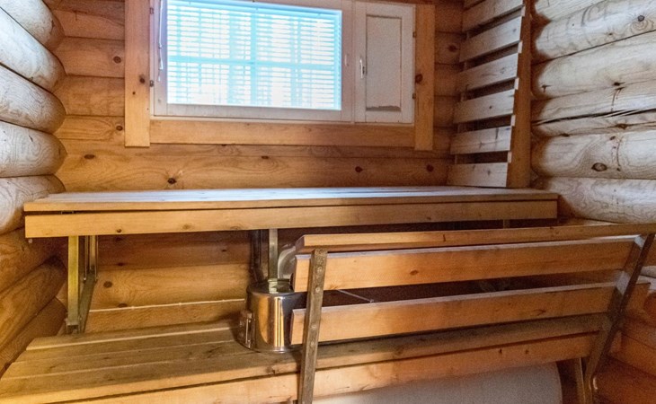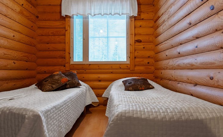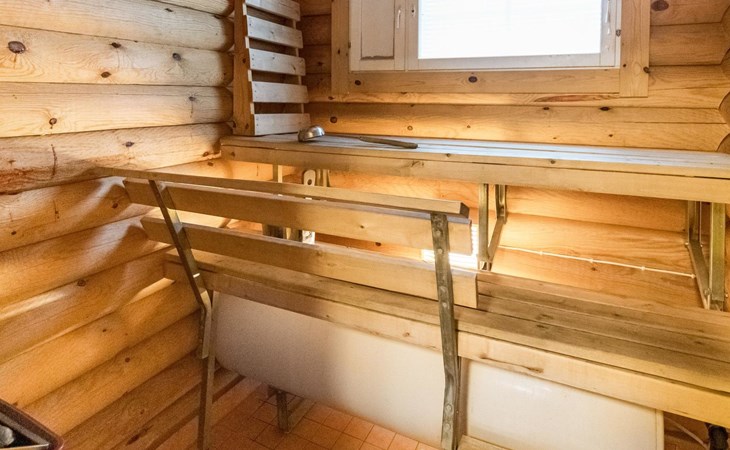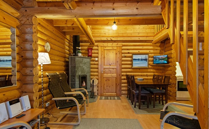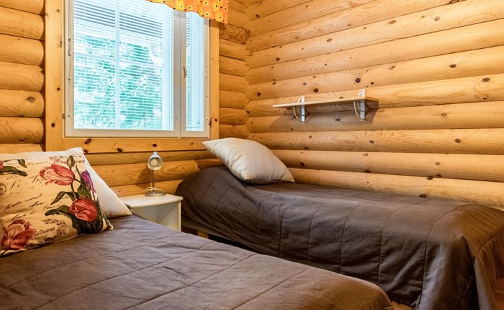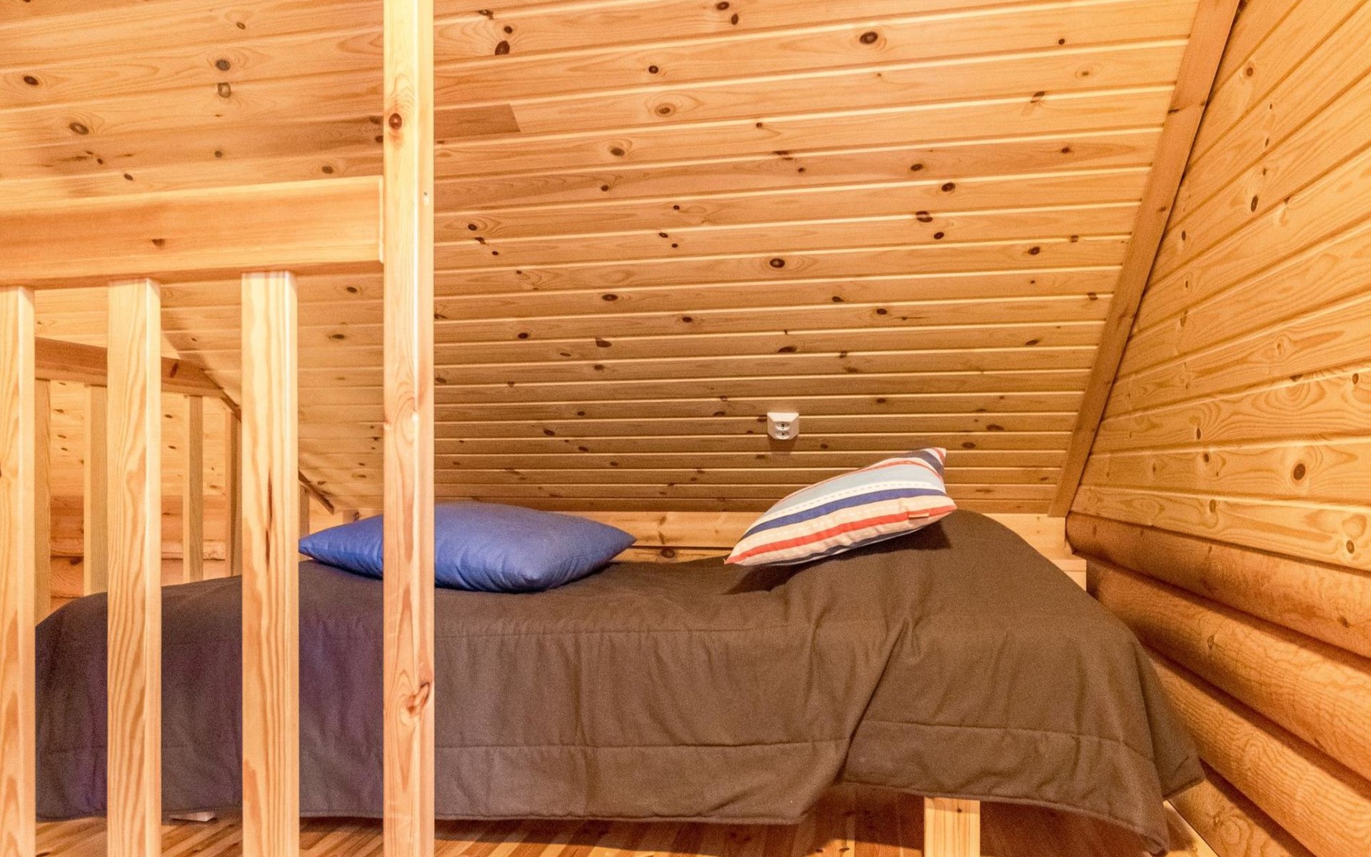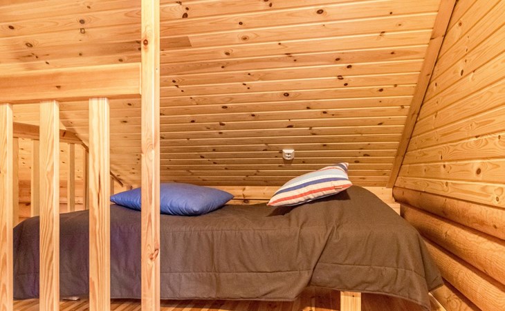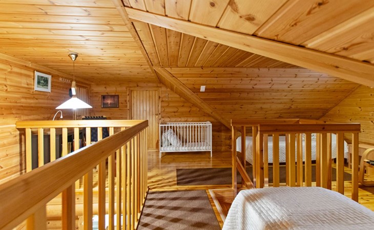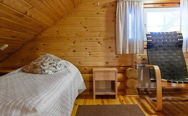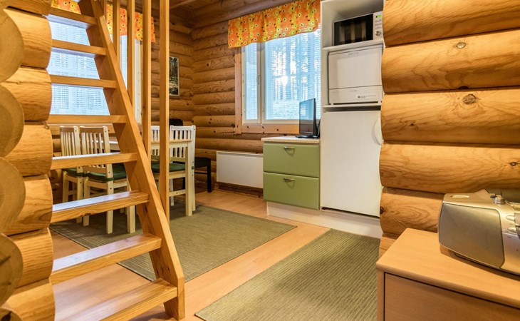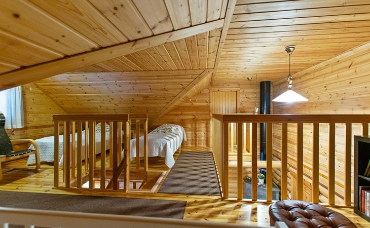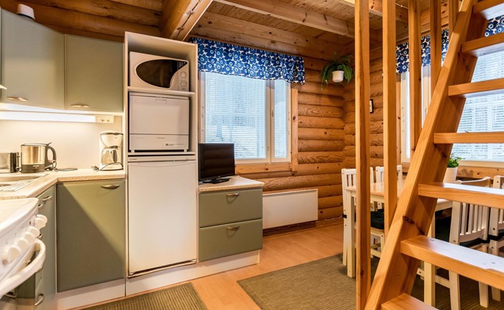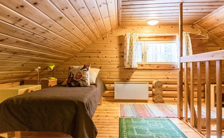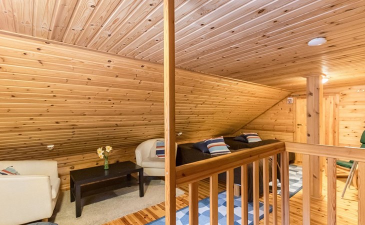 Orvokki apartment 78 m² (middle): a cozy apartment for 5 people on two levels. The ground floor has a living room with kitchen, bedroom, bathroom / toilet and sauna. The loft also has a living area and beds for three. The soapstone fireplace downstairs creates a cozy atmosphere. The downstairs bedroom has 2 beds, the loft has 3 beds and a cot.
